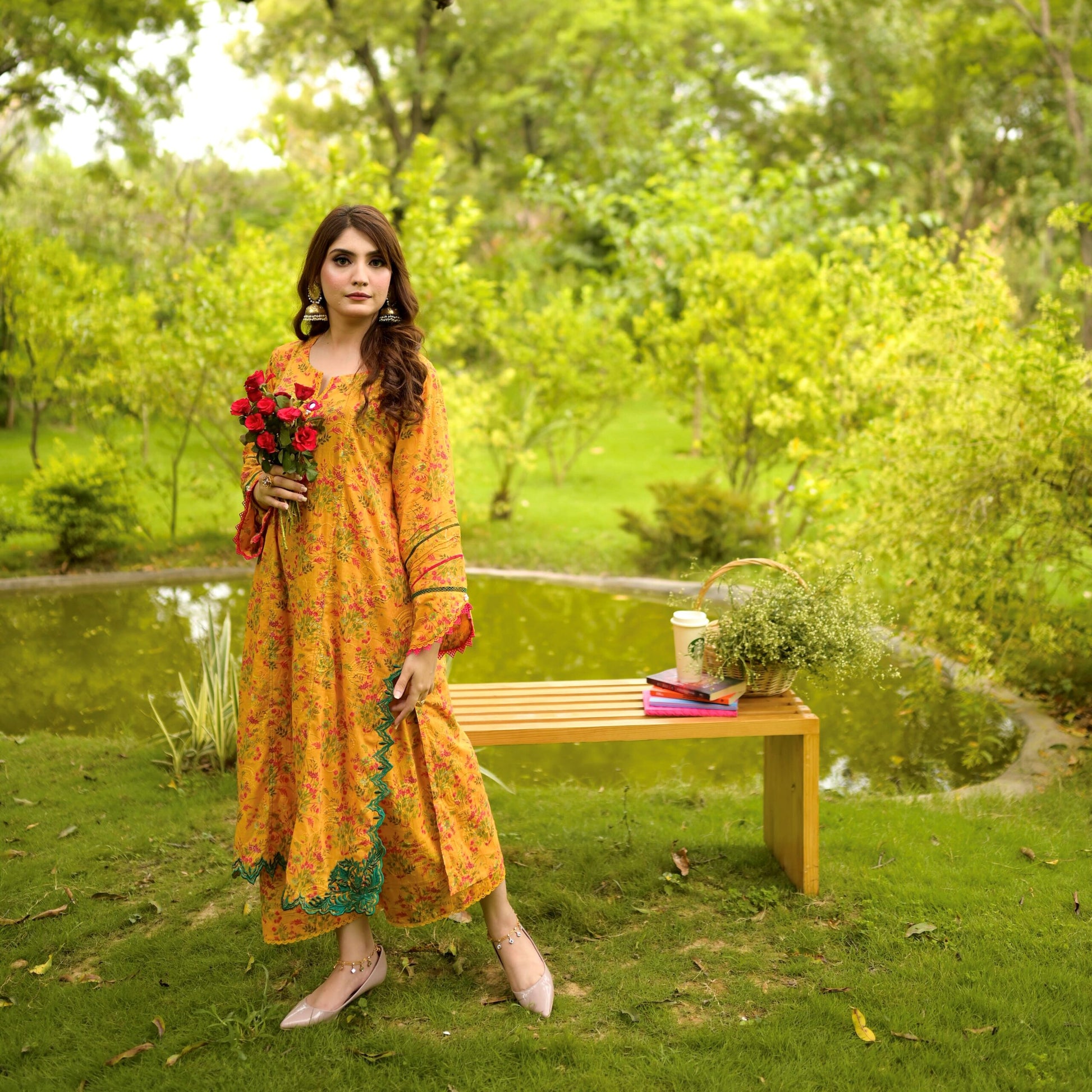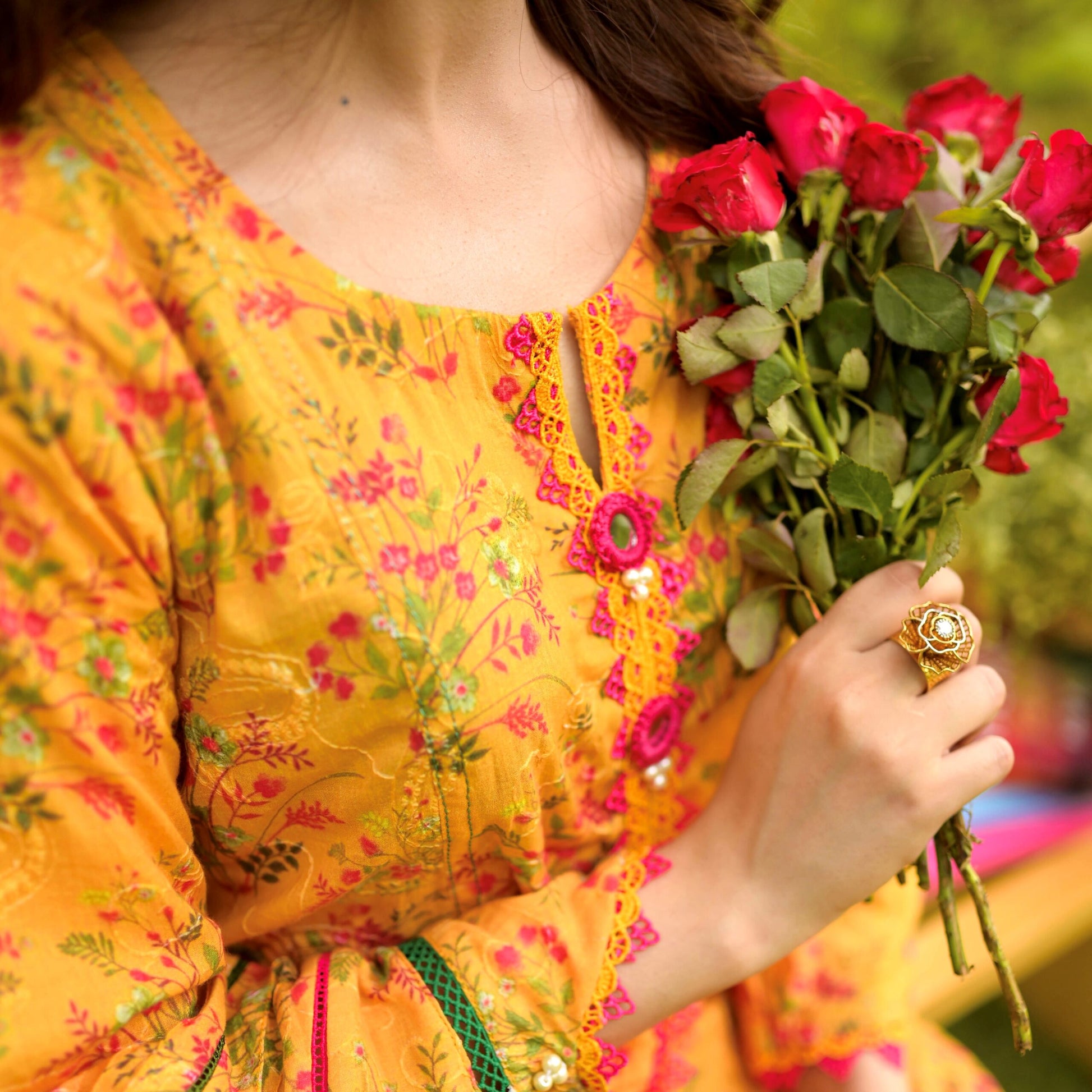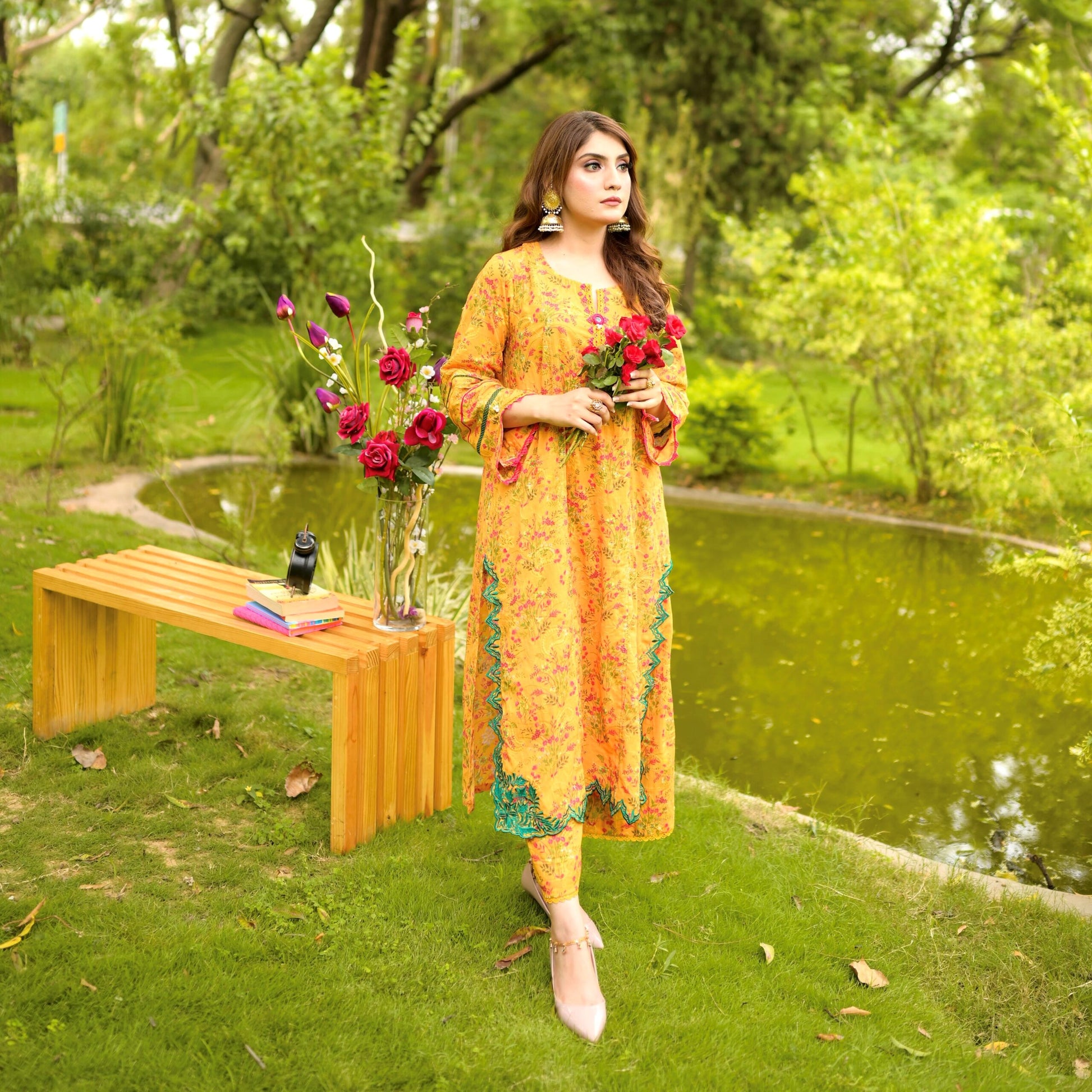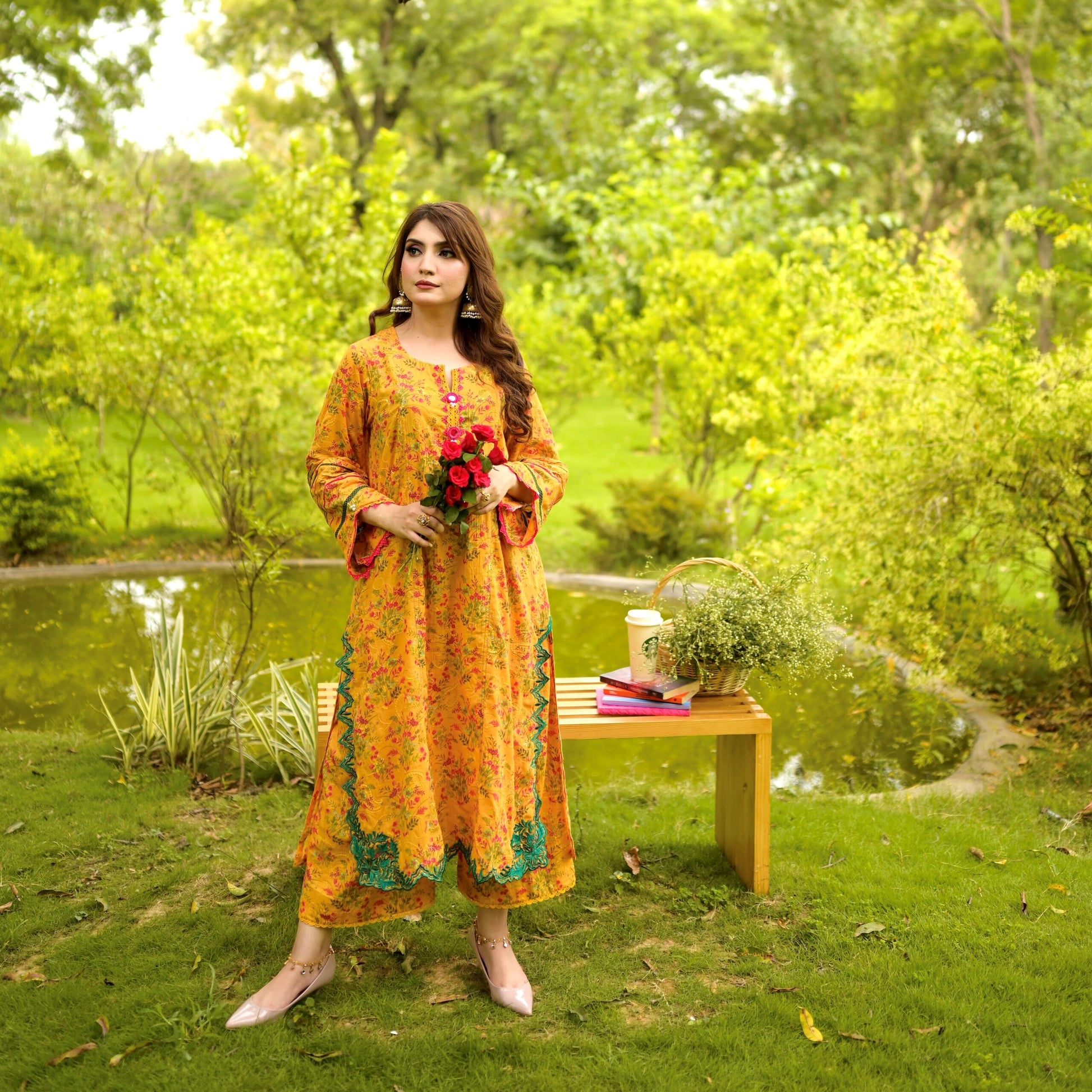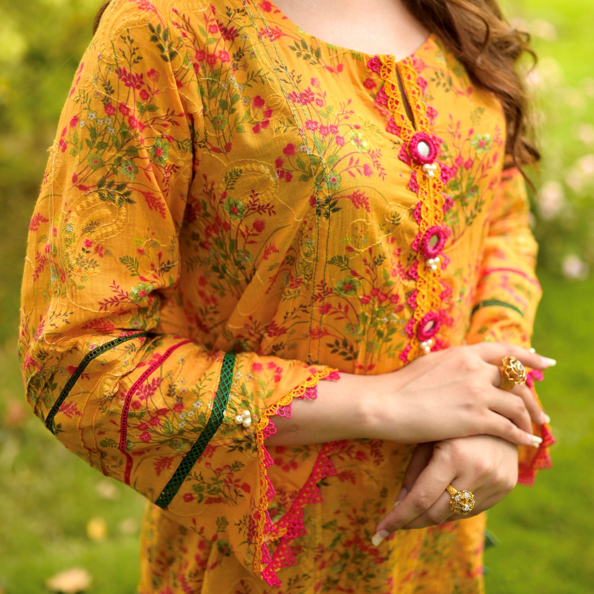 An elegant printed shirt with side panels beautifully adorned with floral embroidery at the front with laces and pearl detailing on neck and sleeves along with straight fit pants.