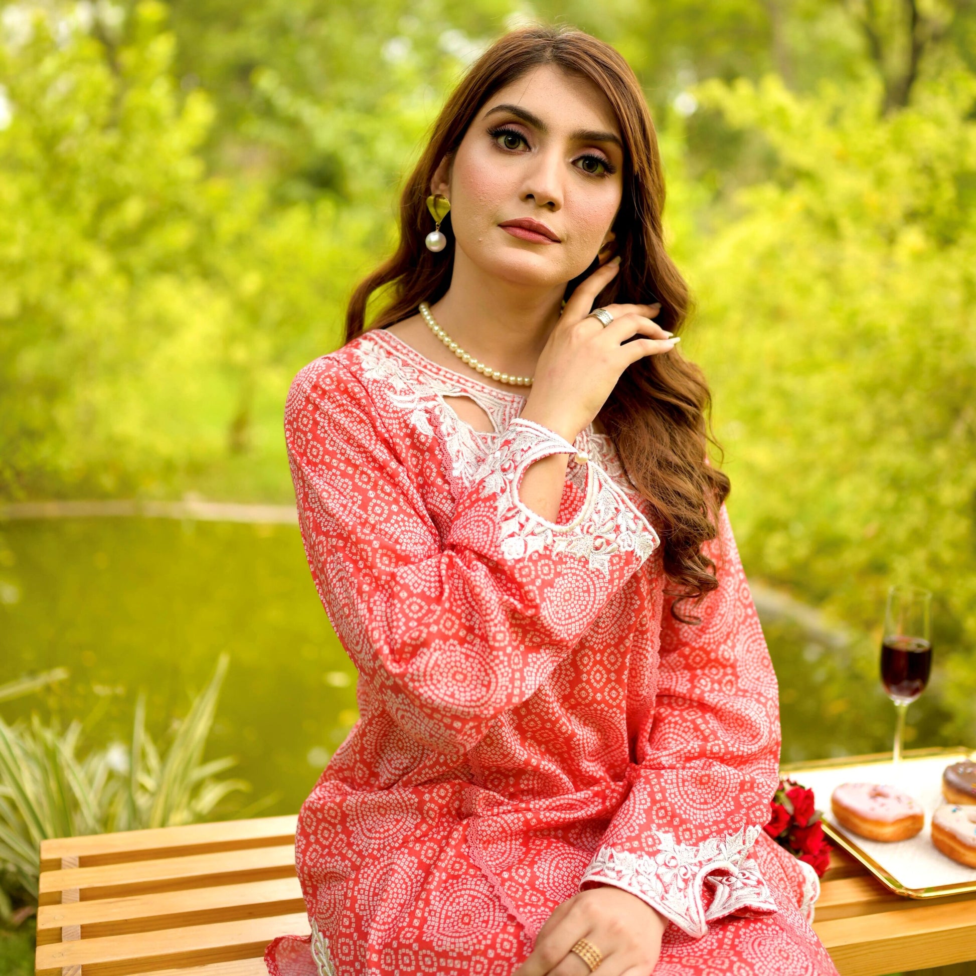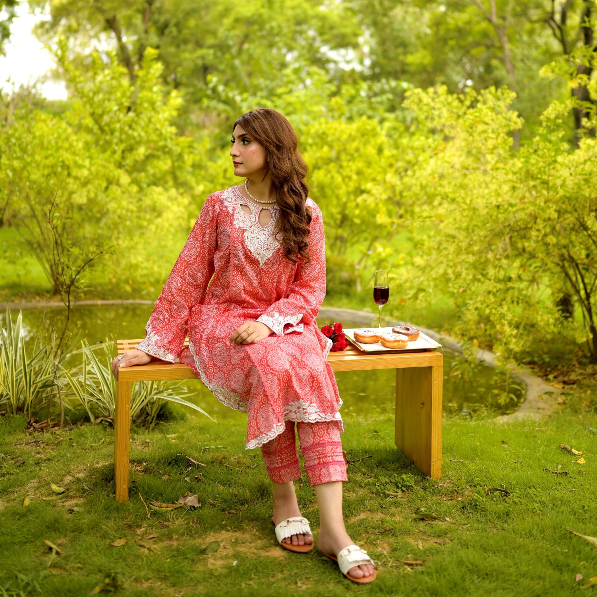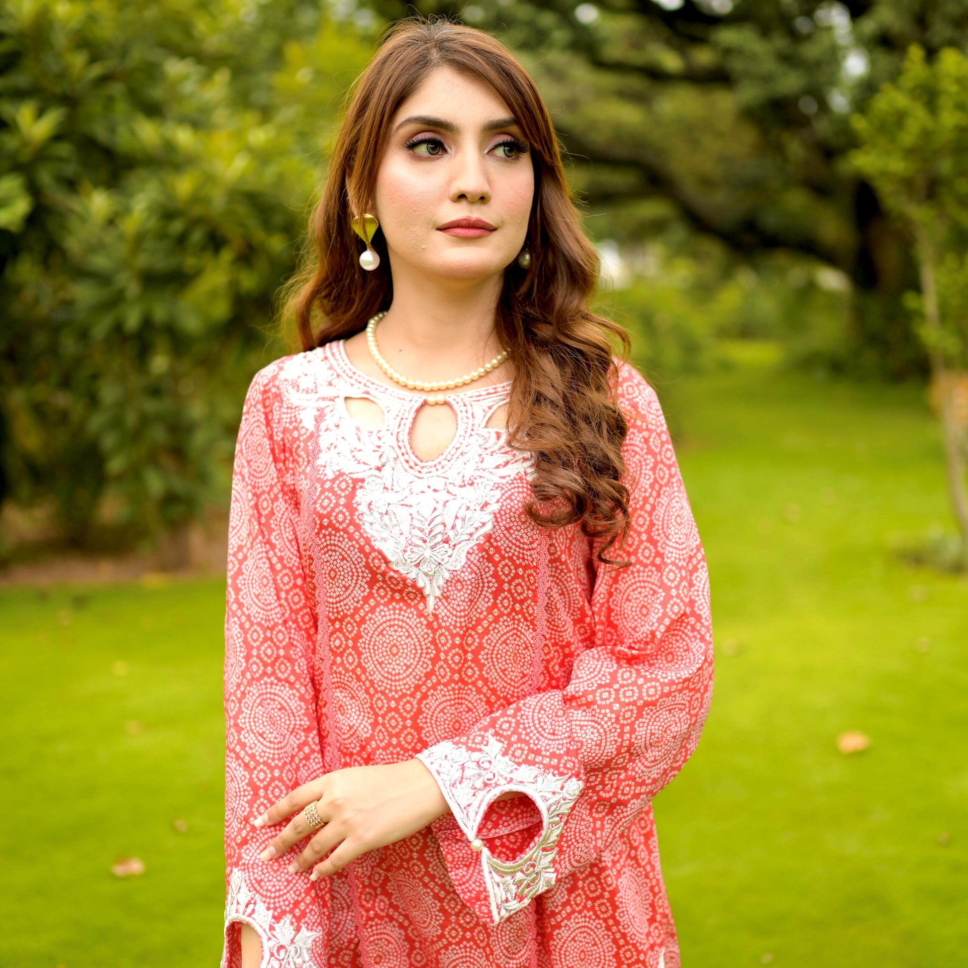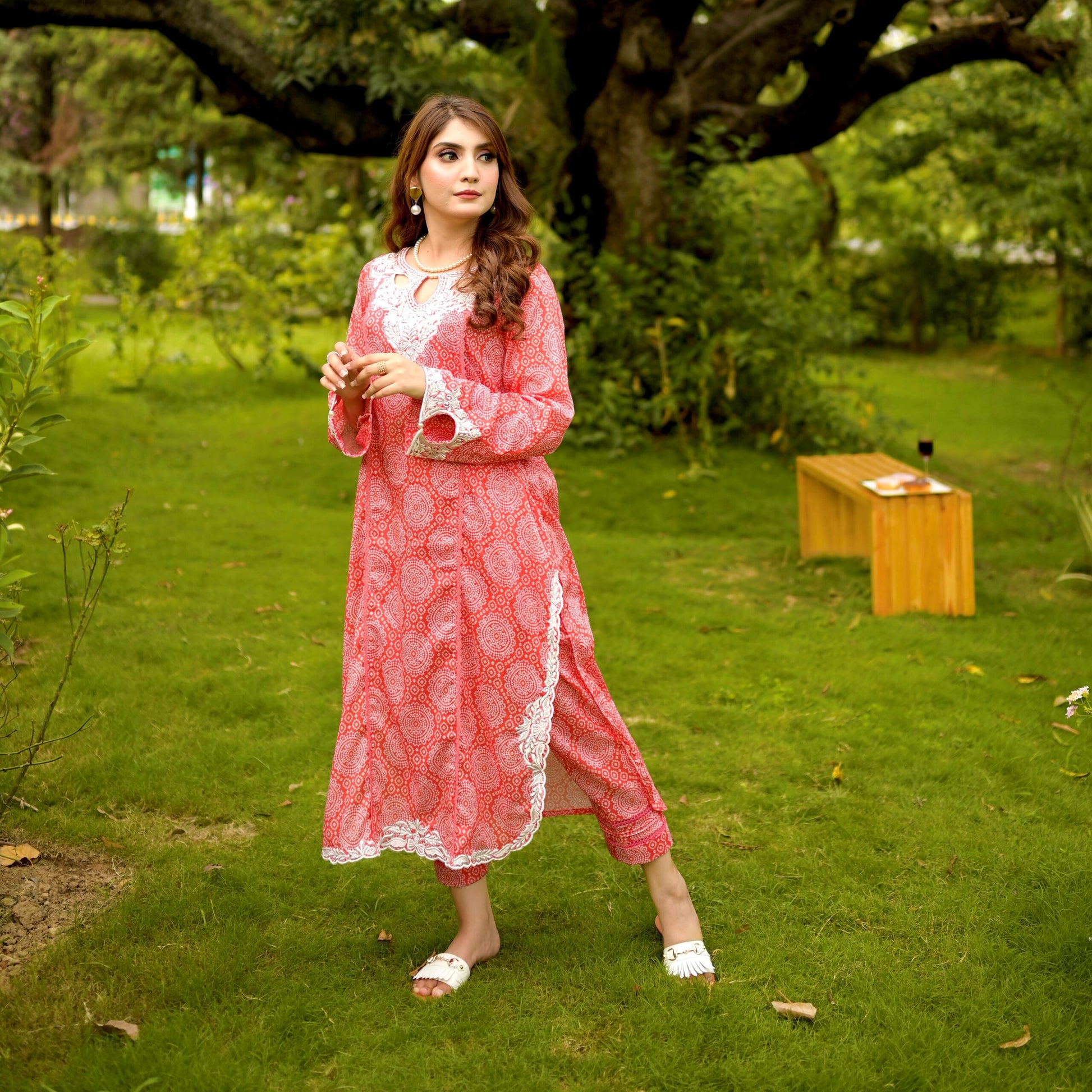 An elegant printed shirt with side panels beautifully adorned with floral embroidery at the front with laces and pearl detailing on neck and sleeves along with straight fit pants.