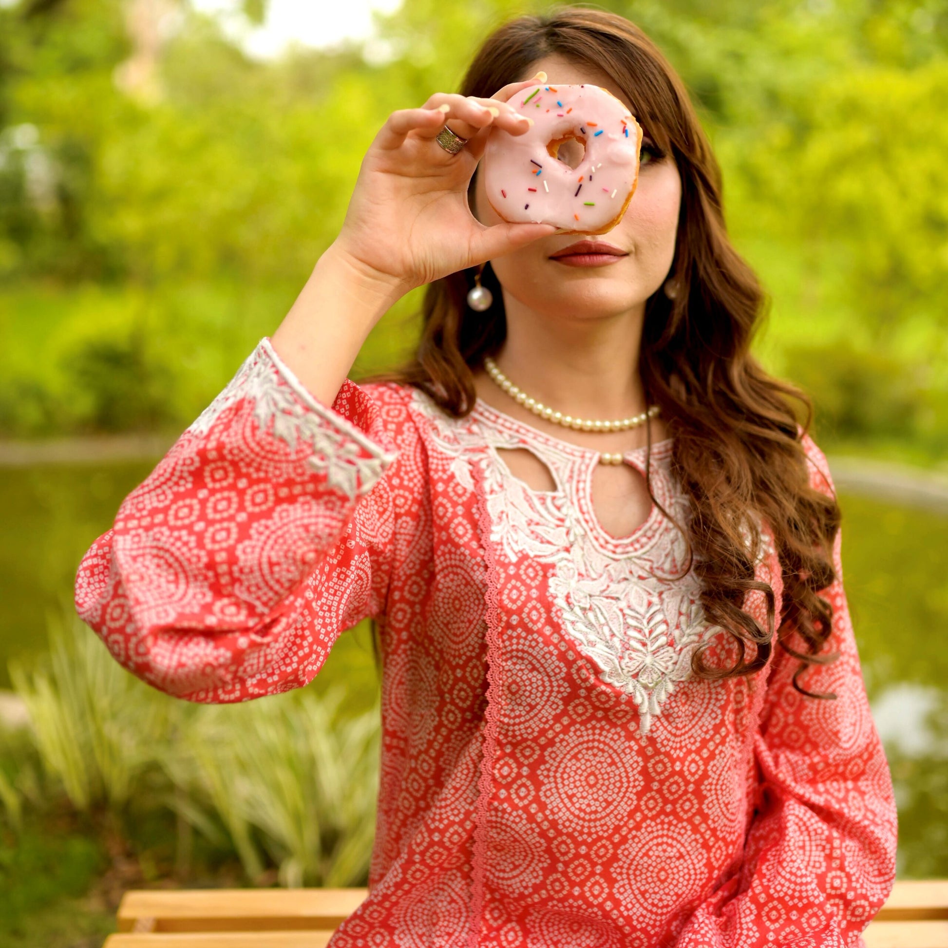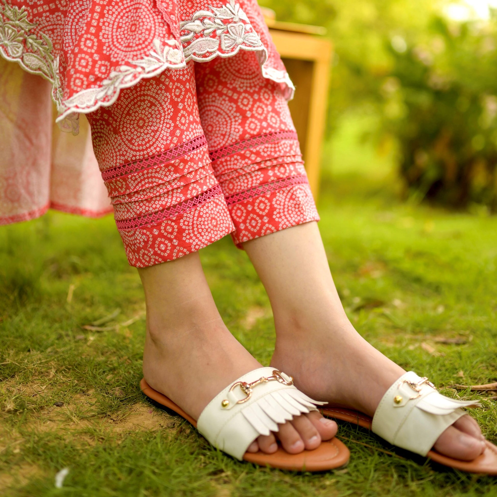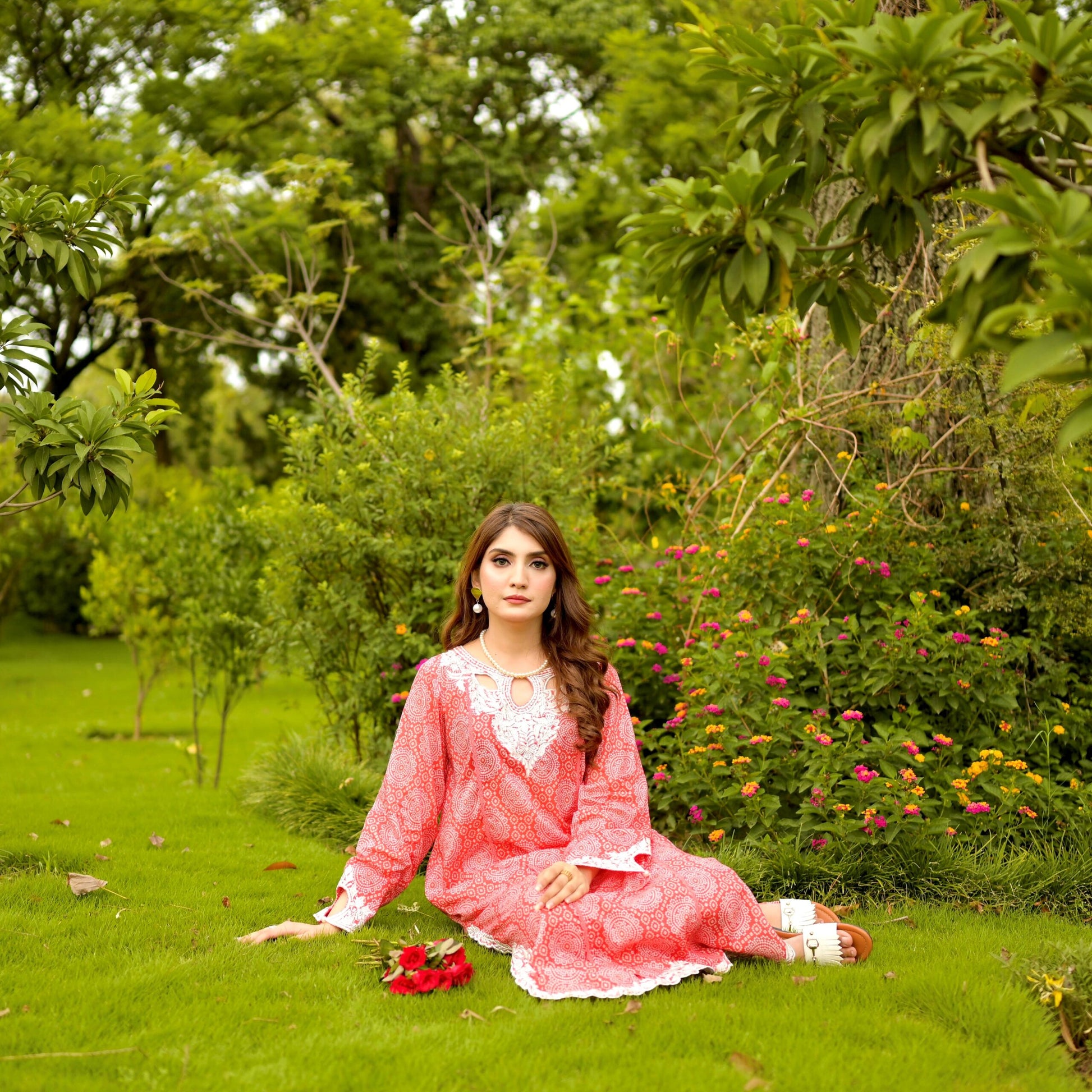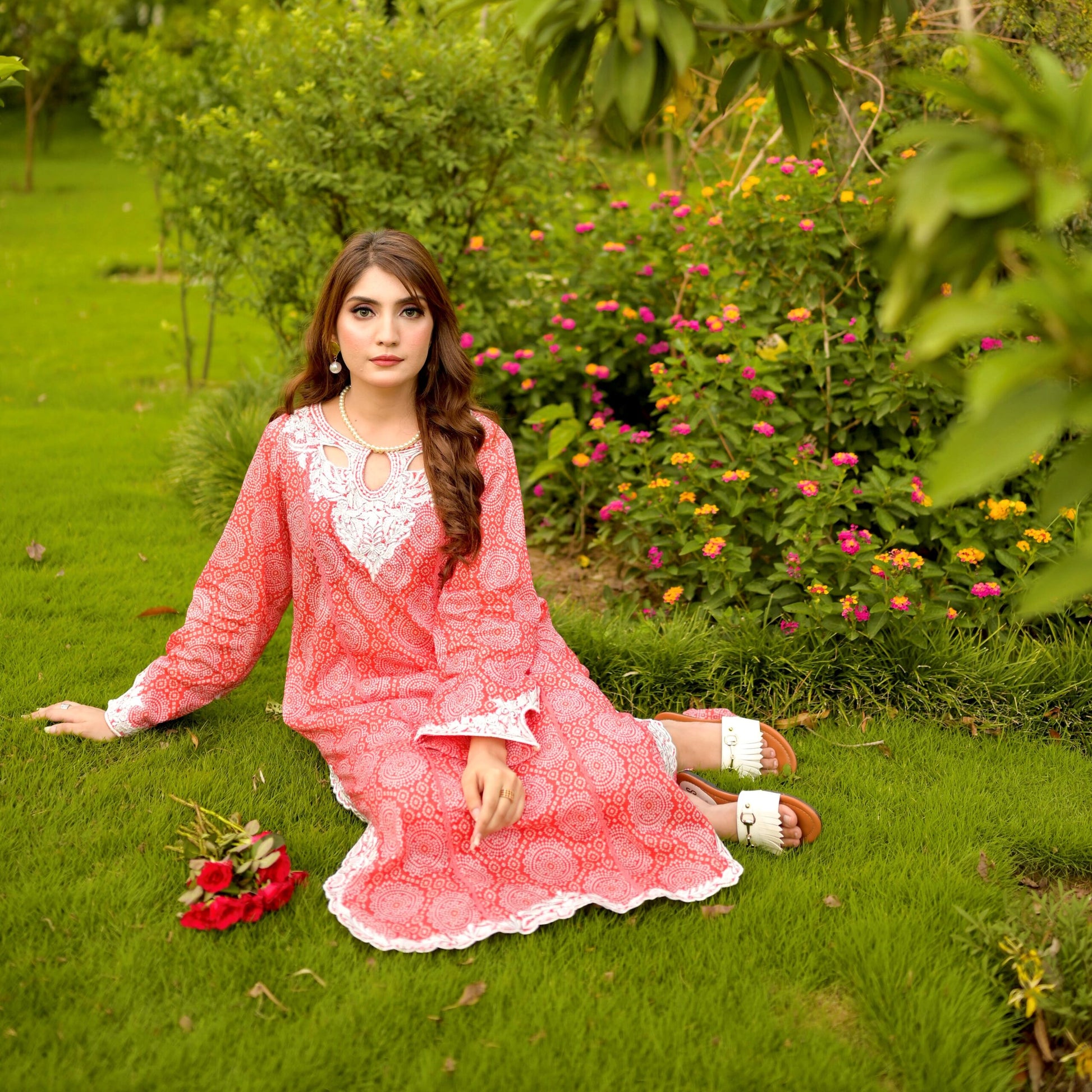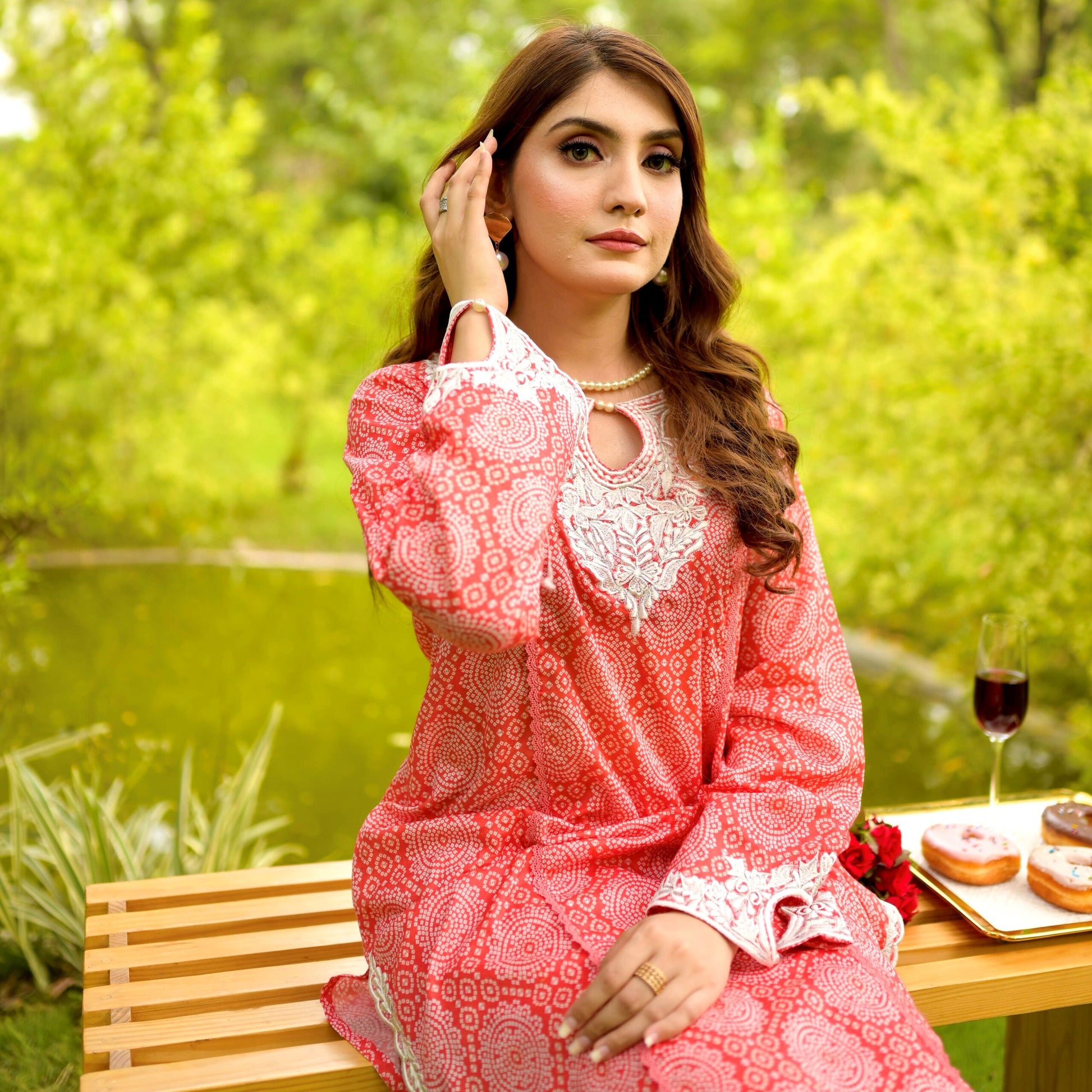 An elegant printed shirt with side panels beautifully adorned with floral embroidery at the front with laces and pearl detailing on neck and sleeves along with straight fit pants.