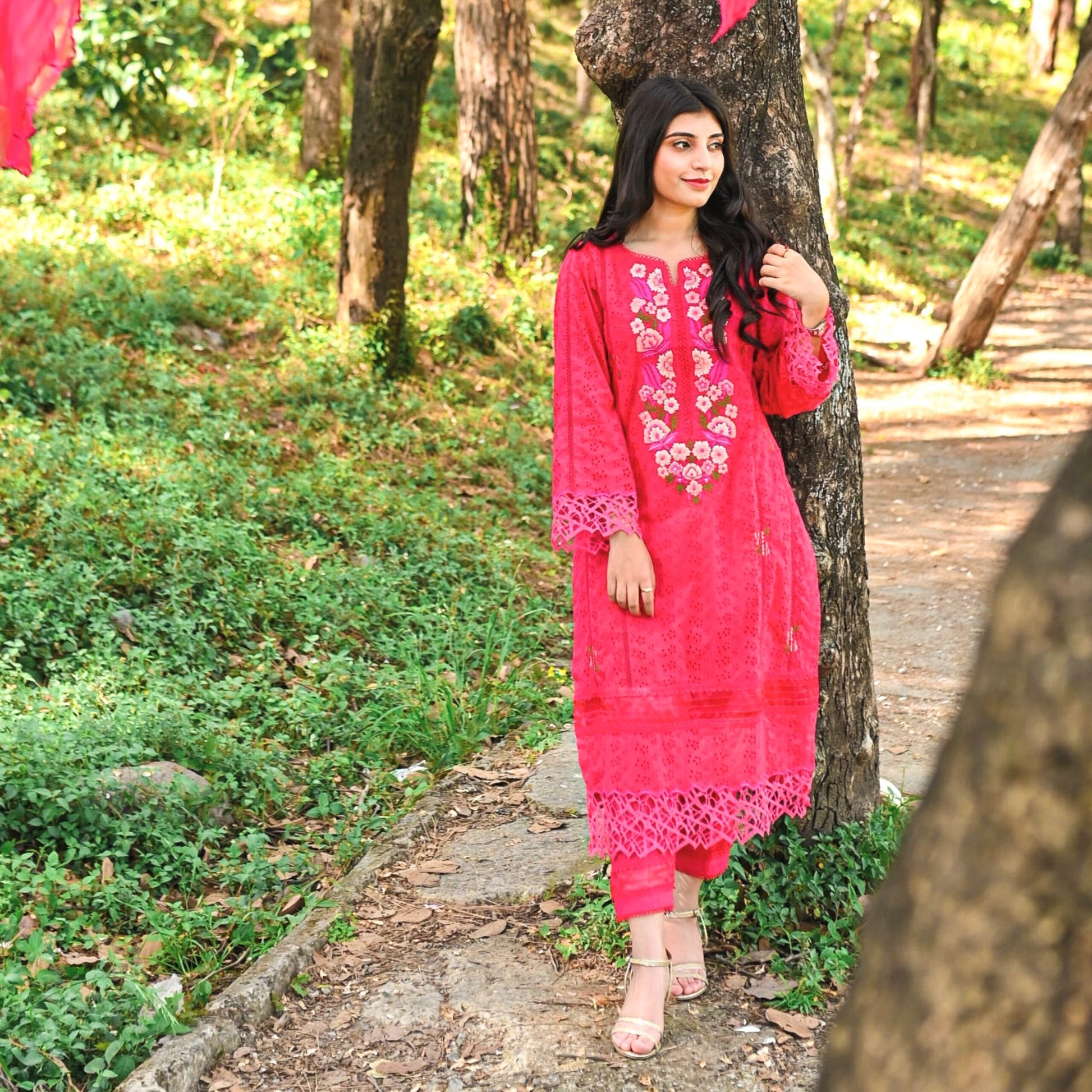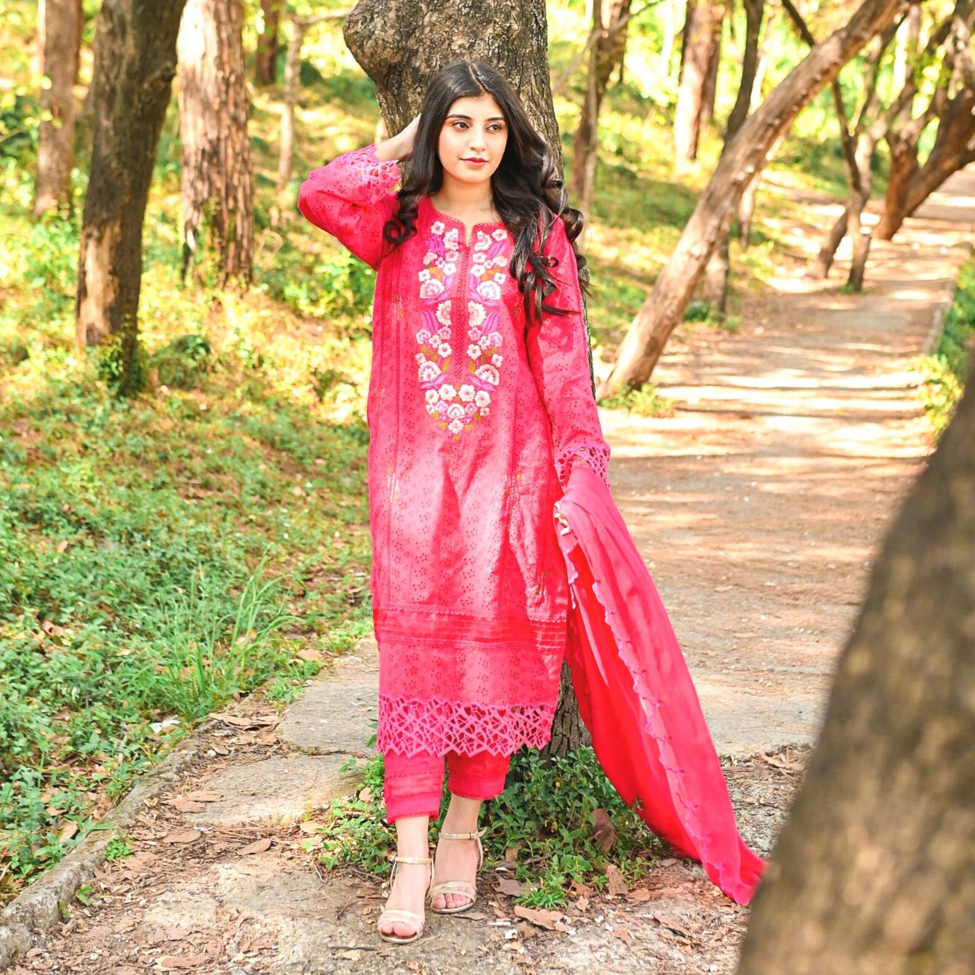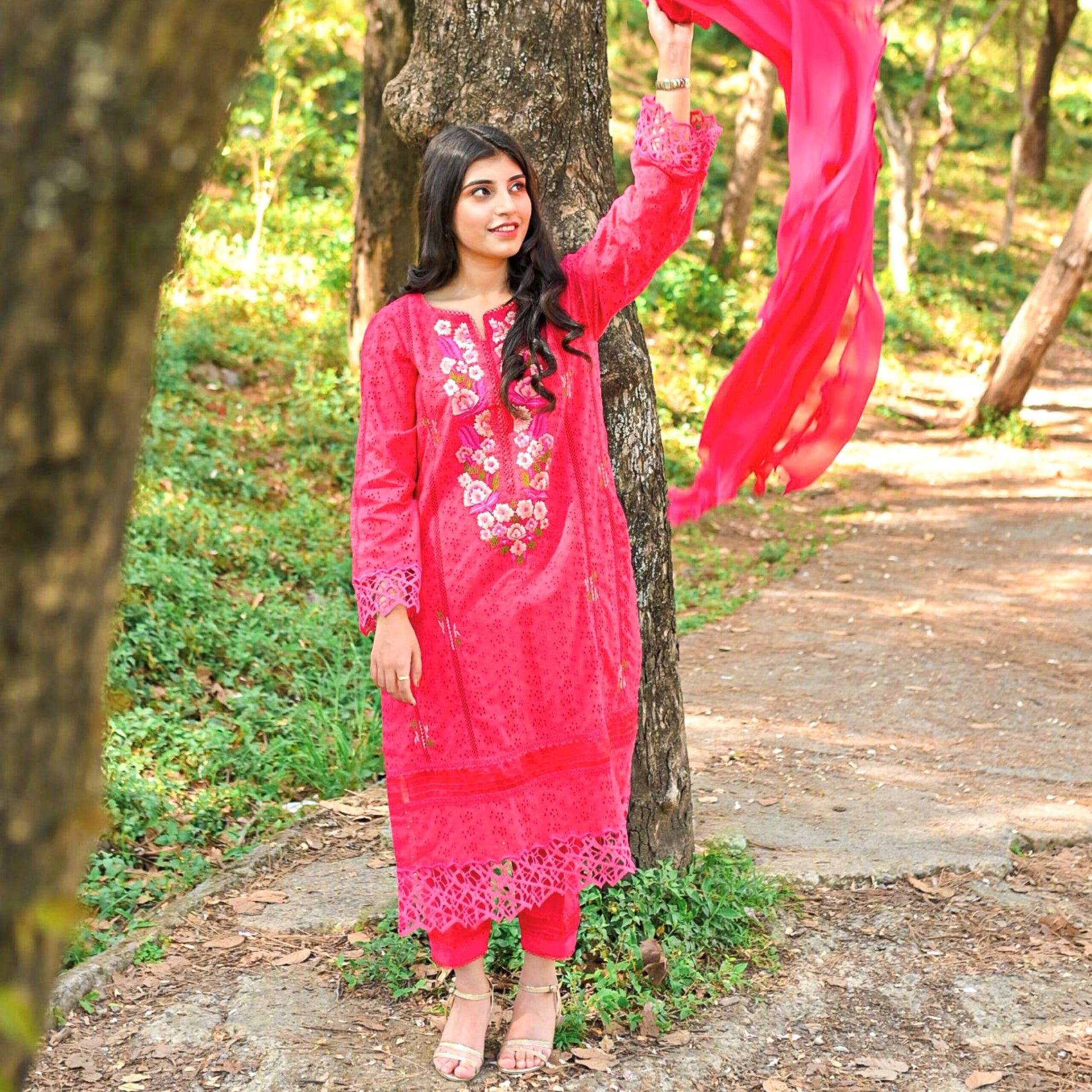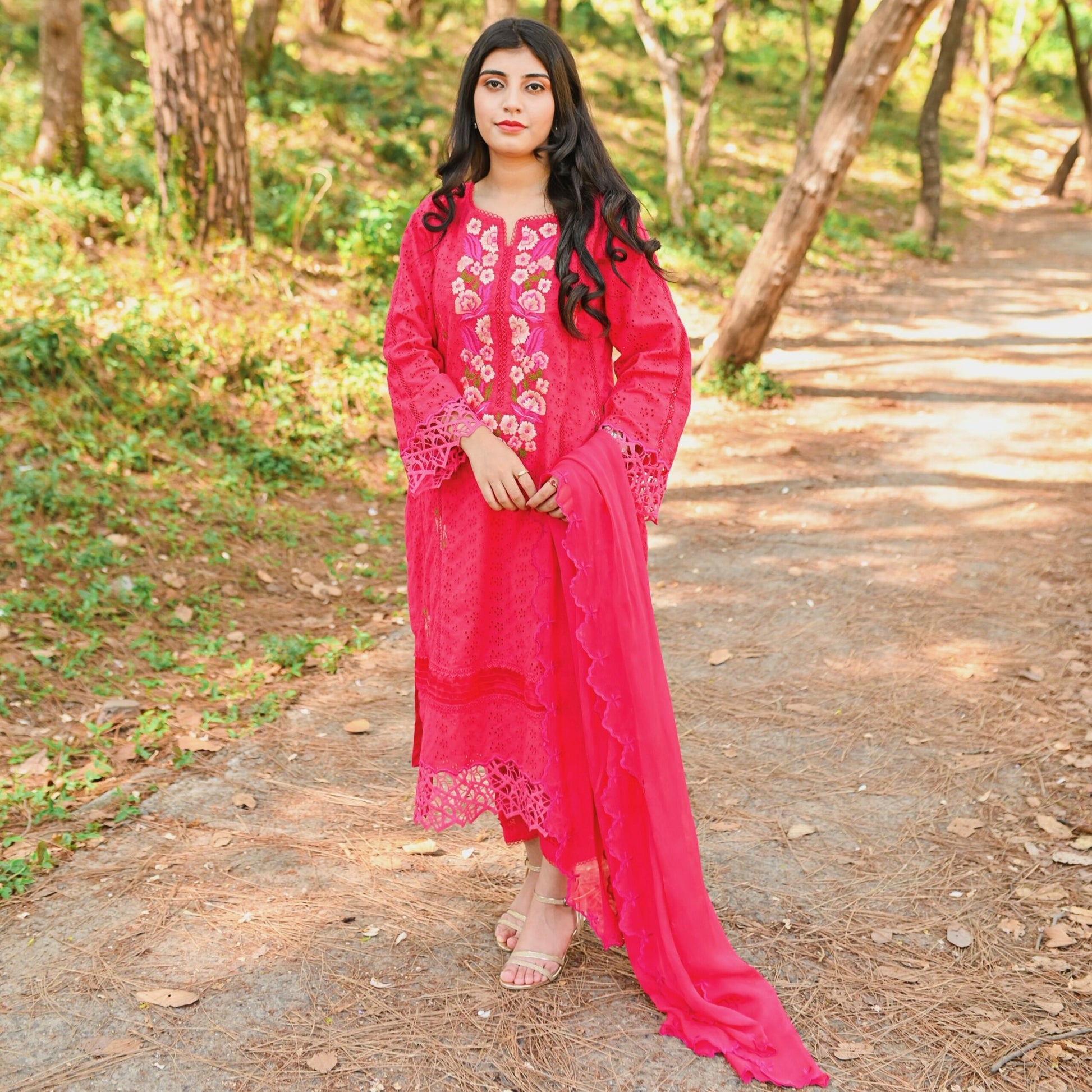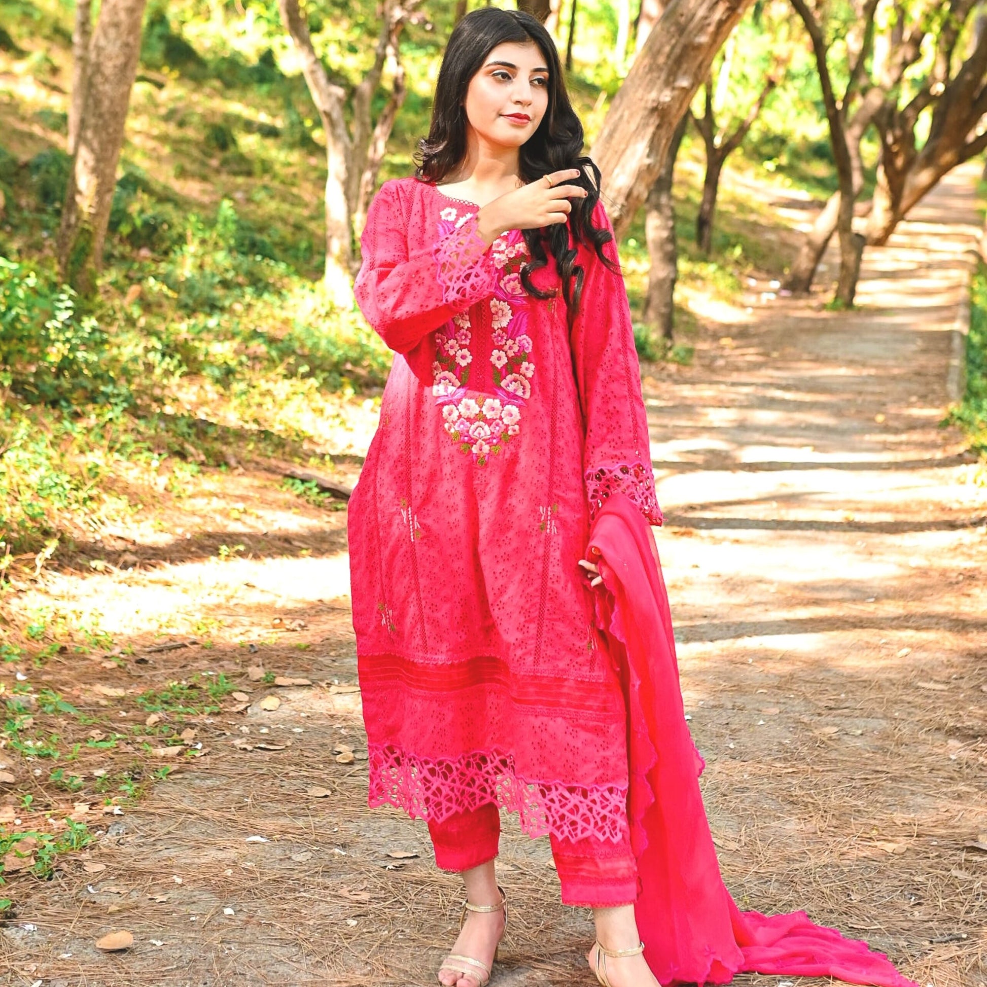 It features an elegant shirt with side panels beautifully adorned with floral embroidery at the front, sleeves and pants with lace and pearl detailing. Paired with a straight pants and a gracefully draped embroidered duppta.