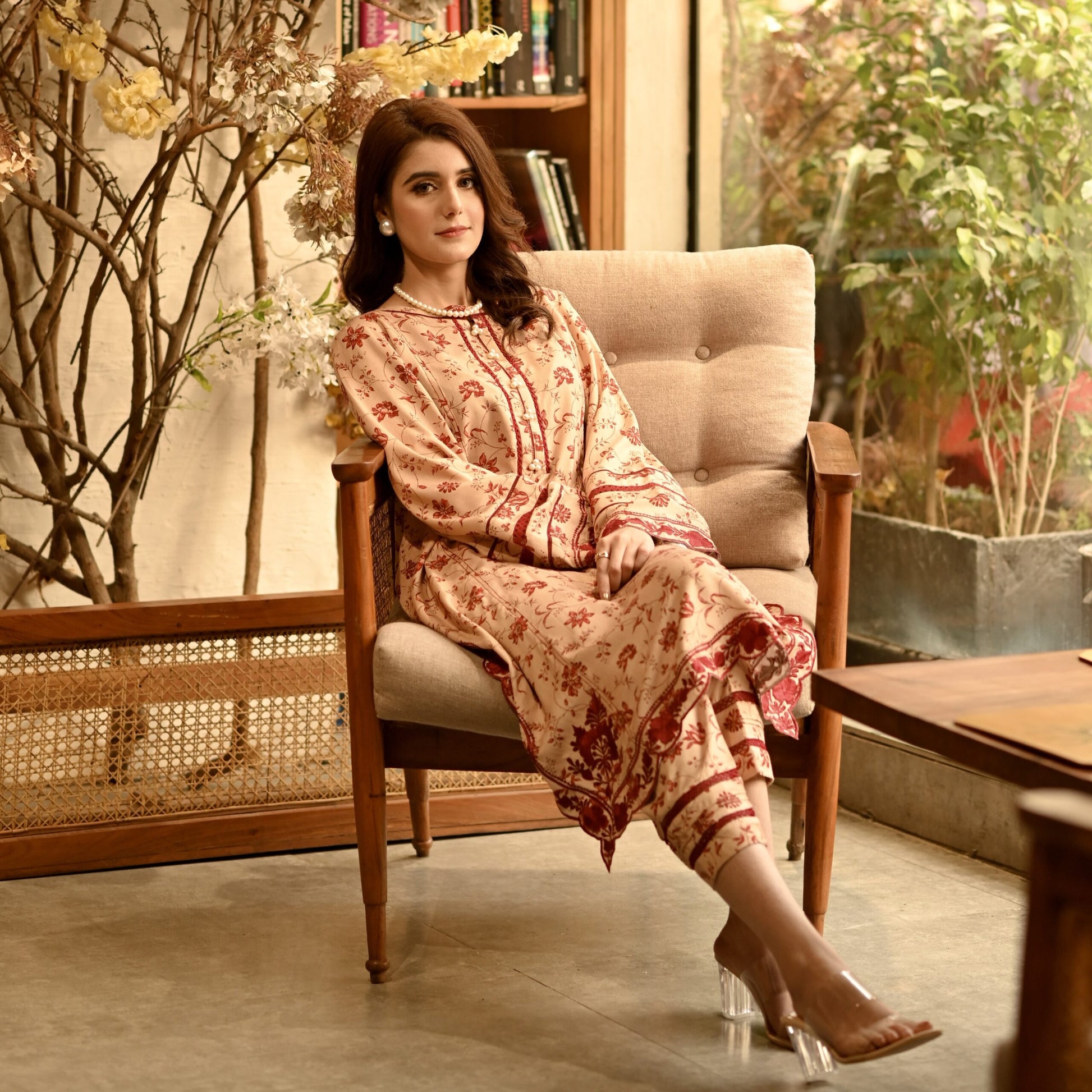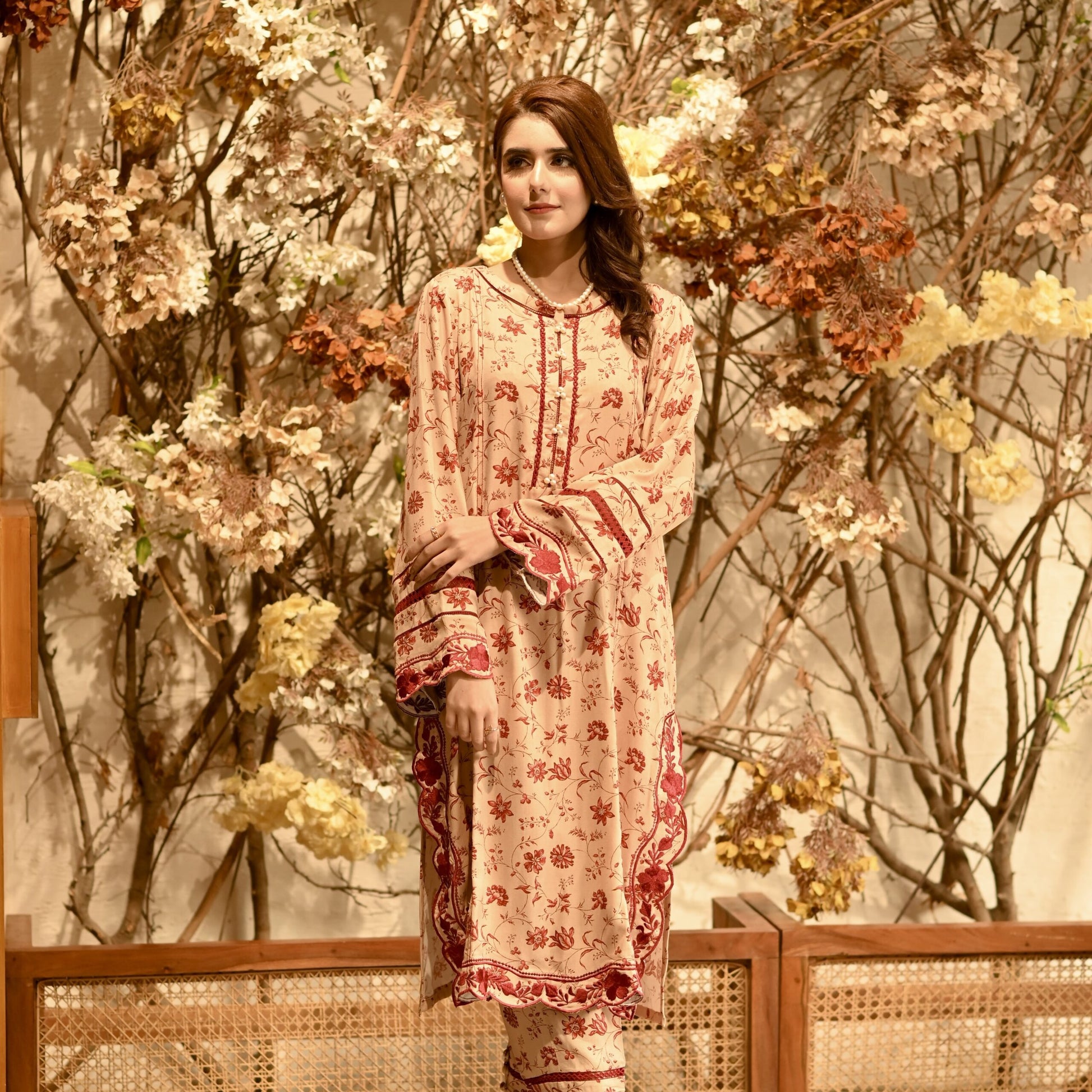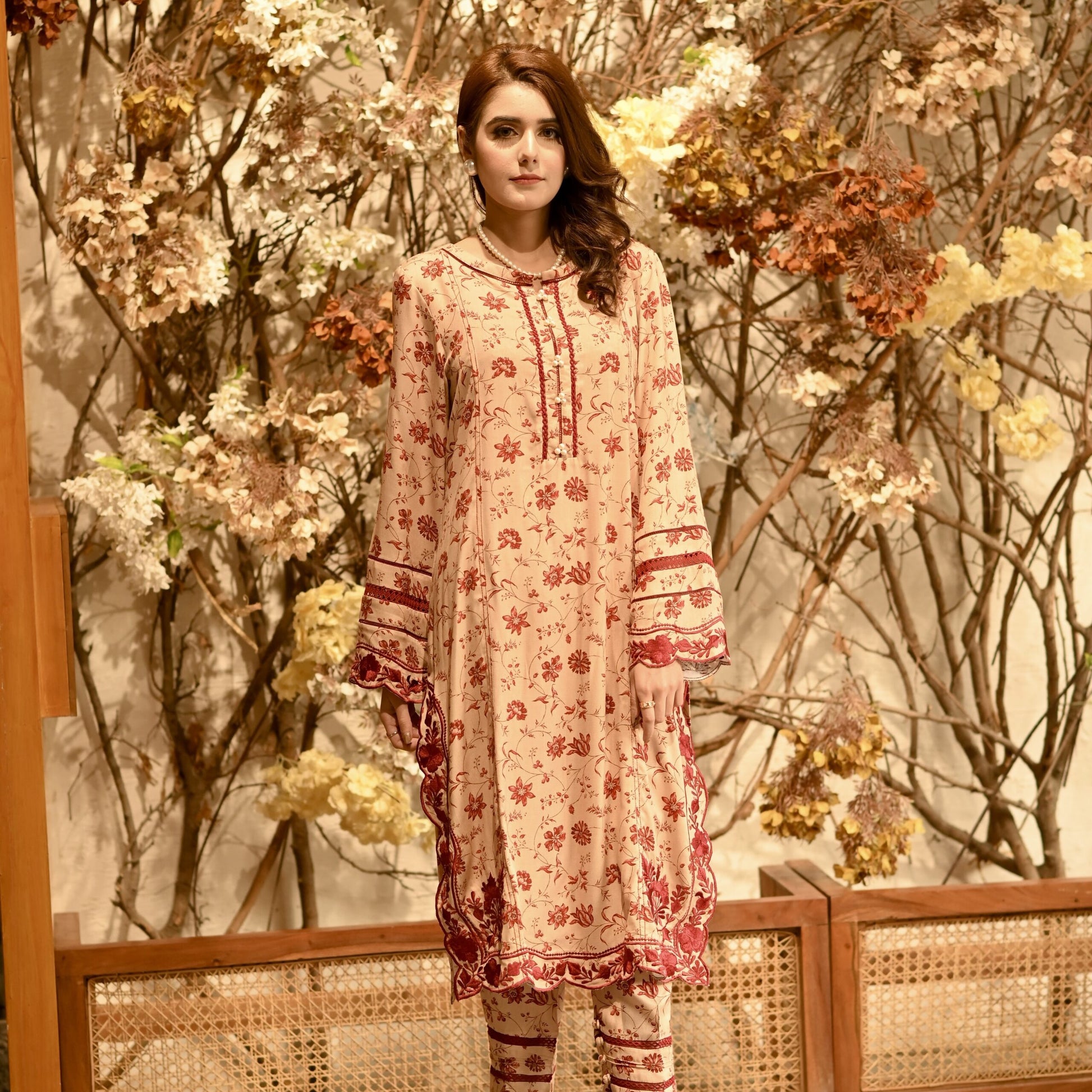 The enchanting interplay of colour in this ensemble form a truly captivating silhouette. The intricate floral and leafy patterns on a long shirt with embroidered straight pants showcasing meticulous embroidery on premium linen marina fabric which imparts a touch of elegance the overall look.