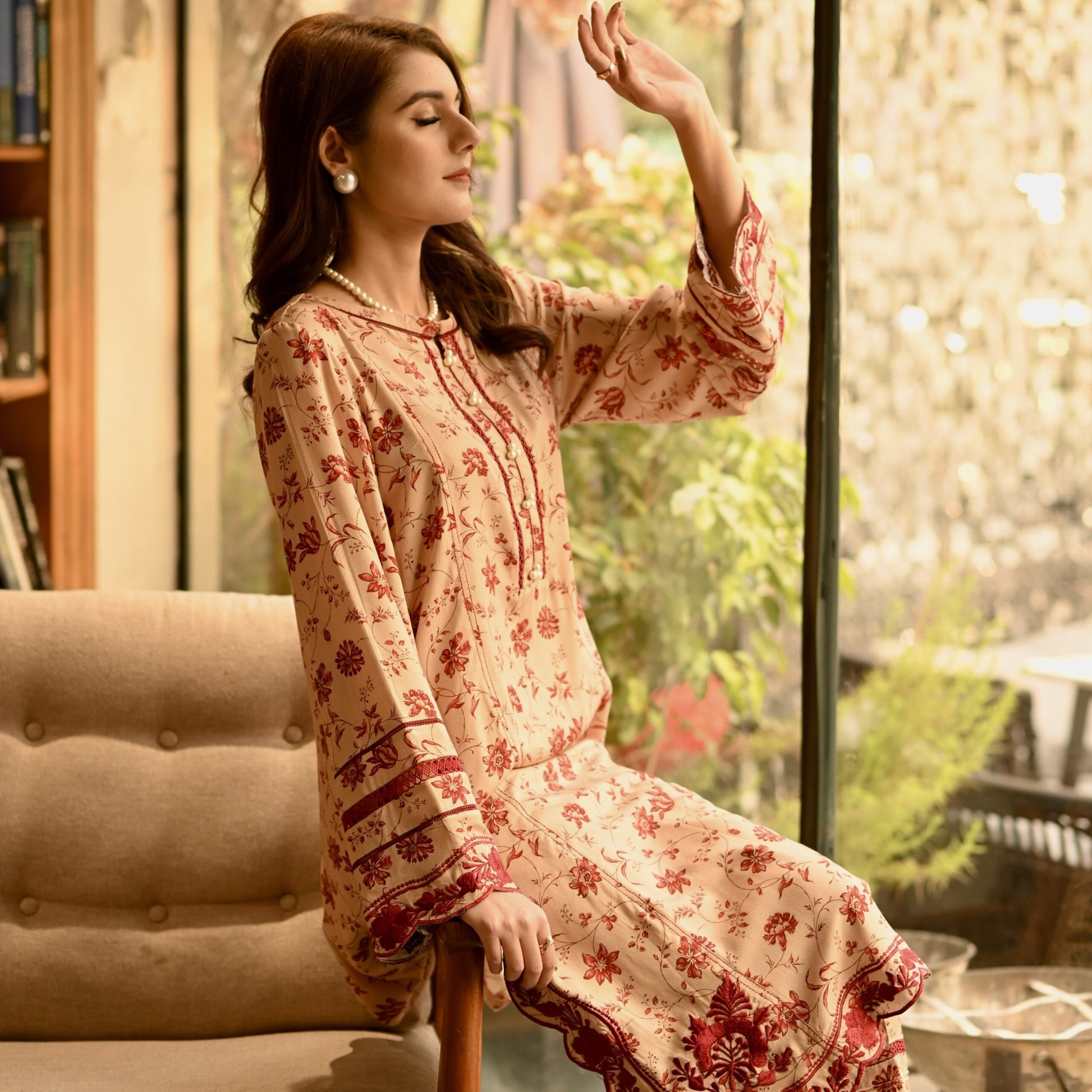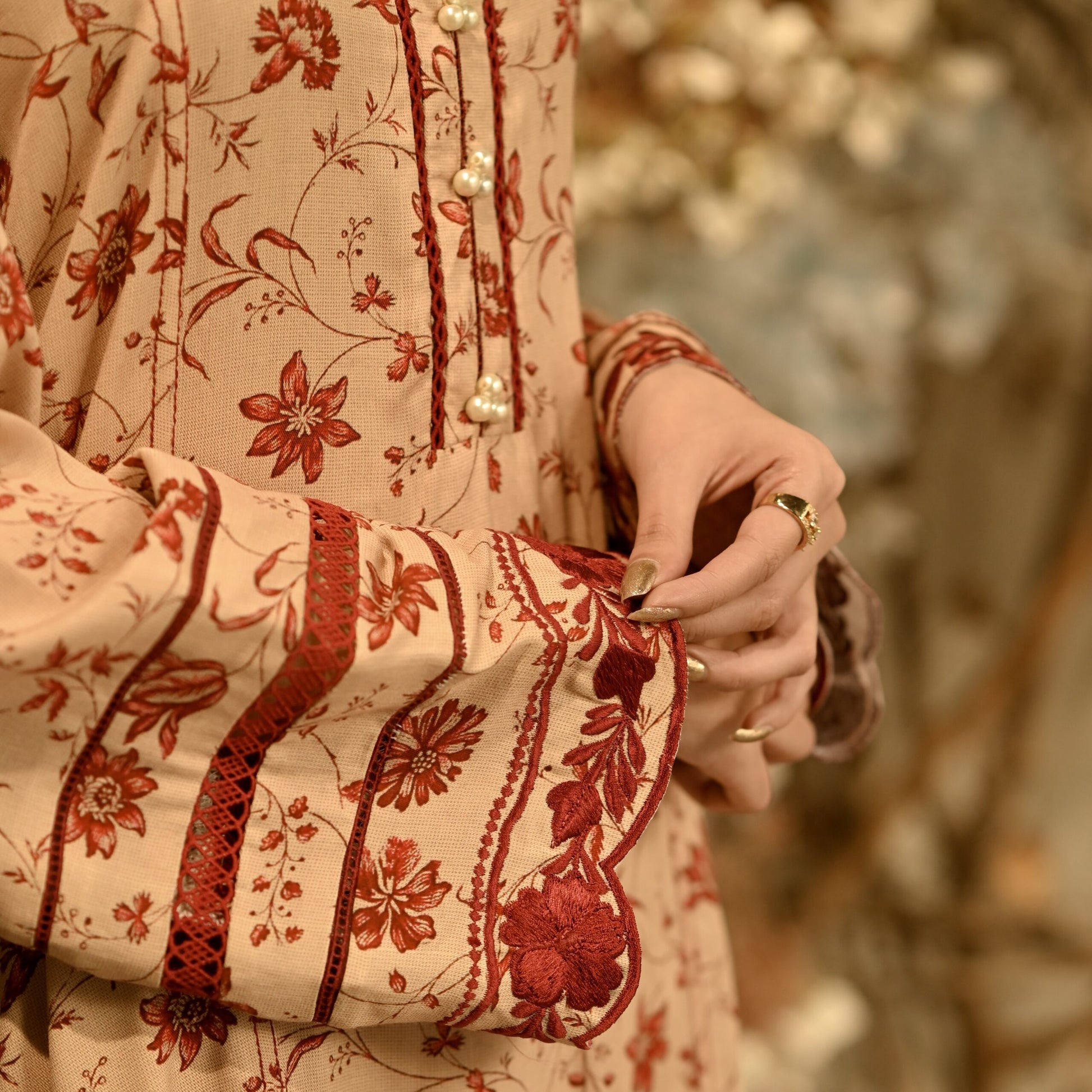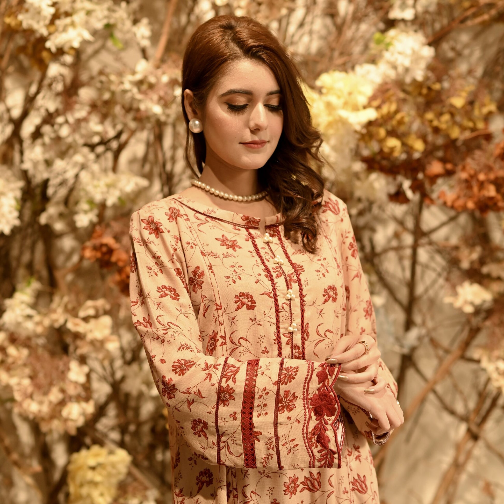 The enchanting interplay of colour in this ensemble form a truly captivating silhouette. The intricate floral and leafy patterns on a long shirt with embroidered straight pants showcasing meticulous embroidery on premium linen marina fabric which imparts a touch of elegance the overall look.