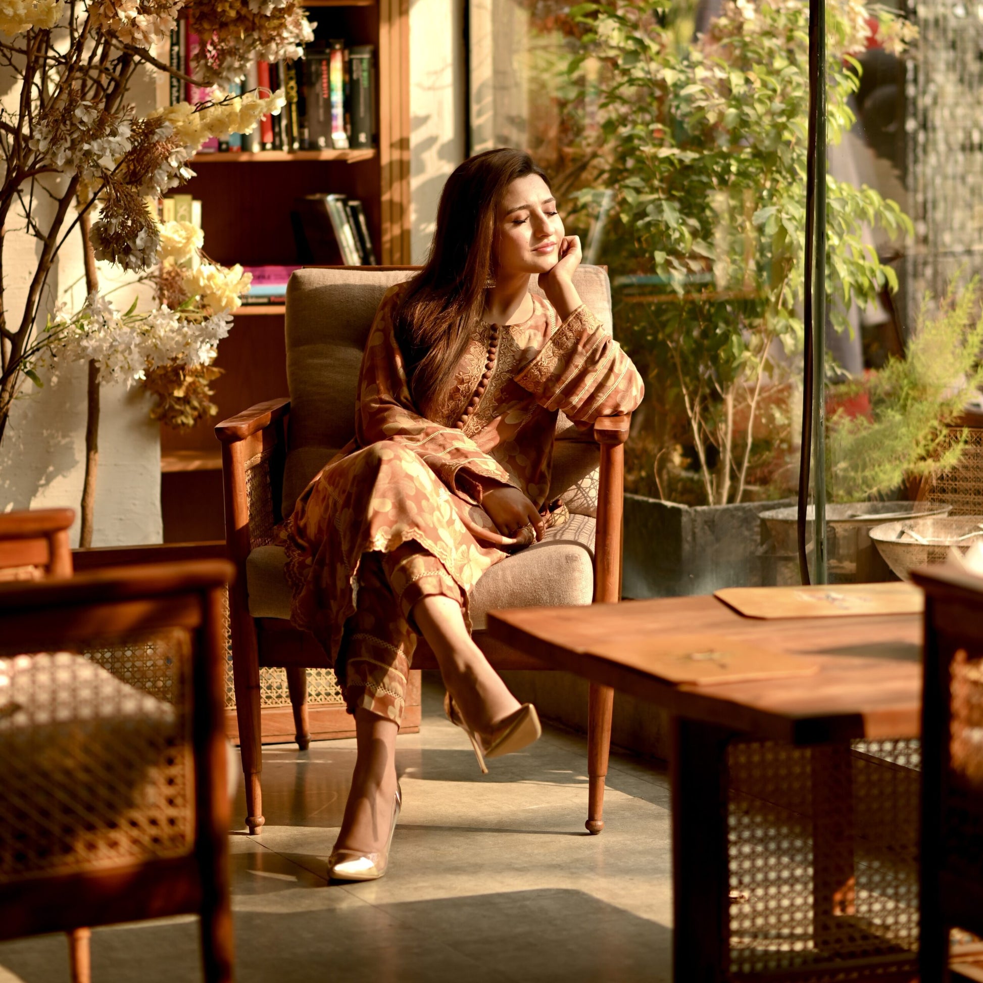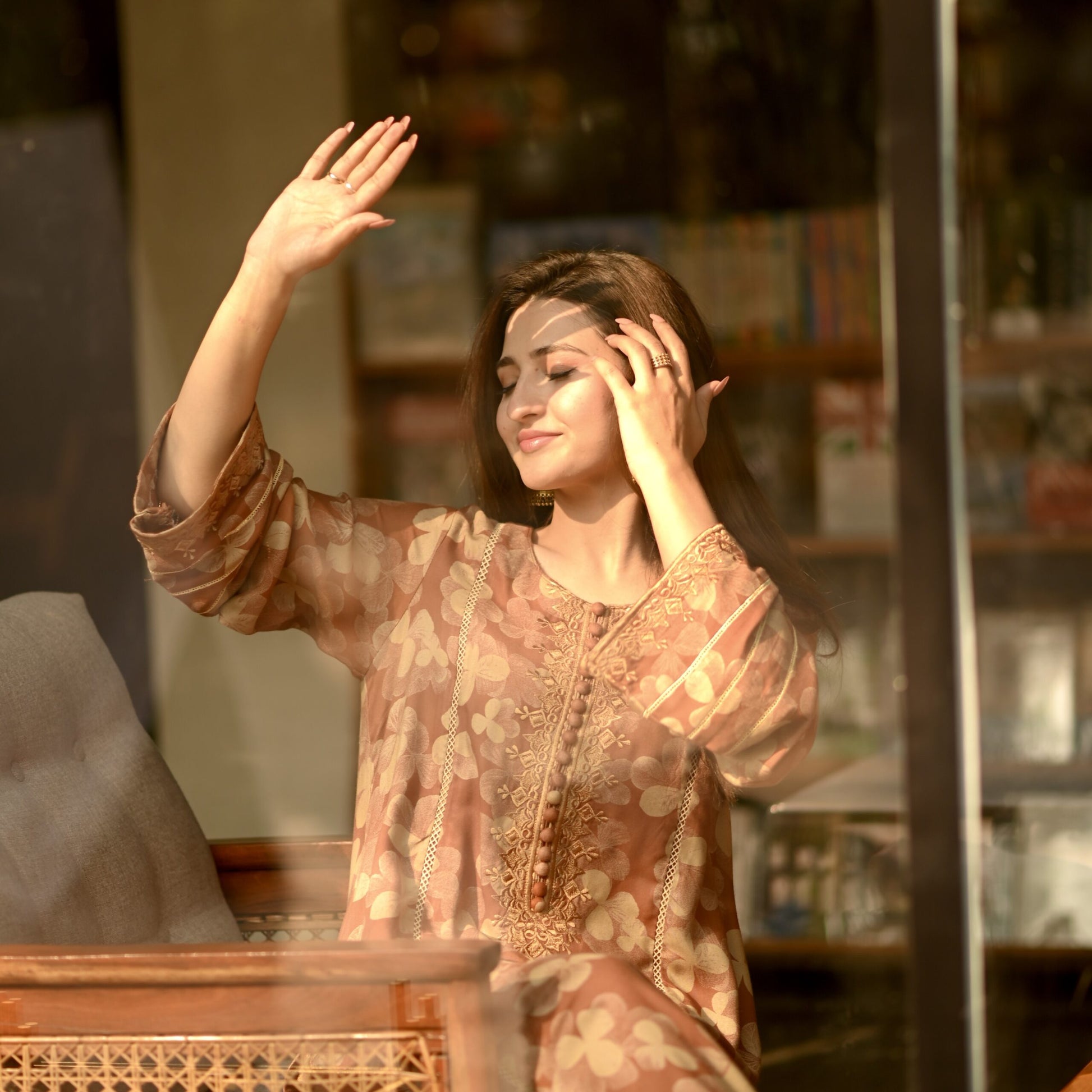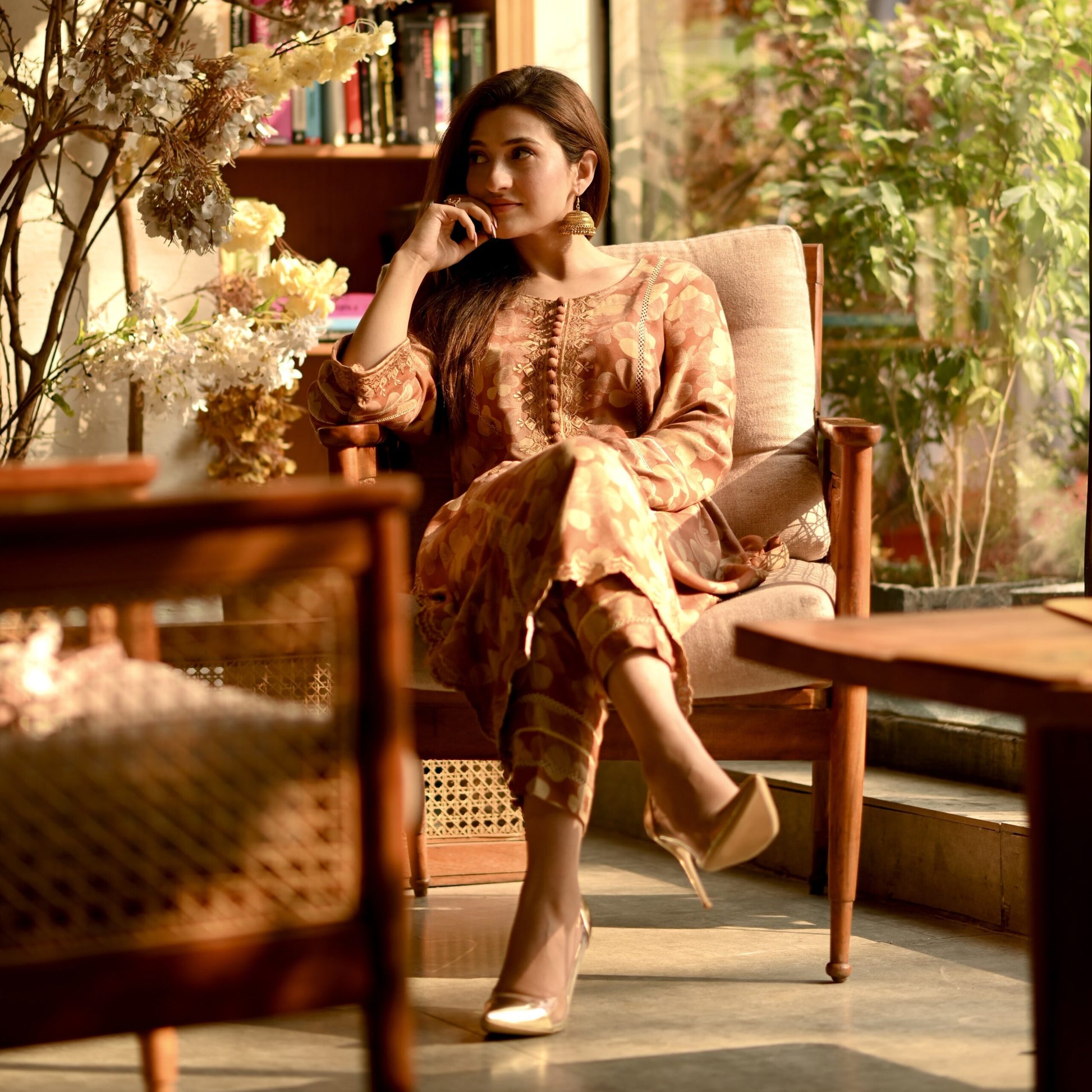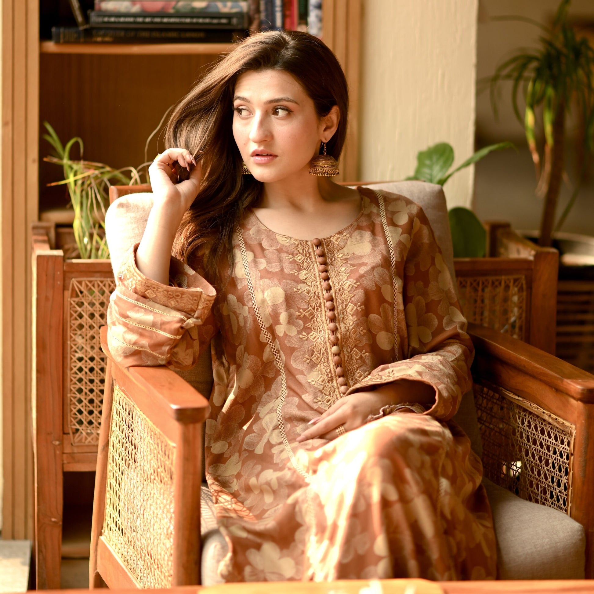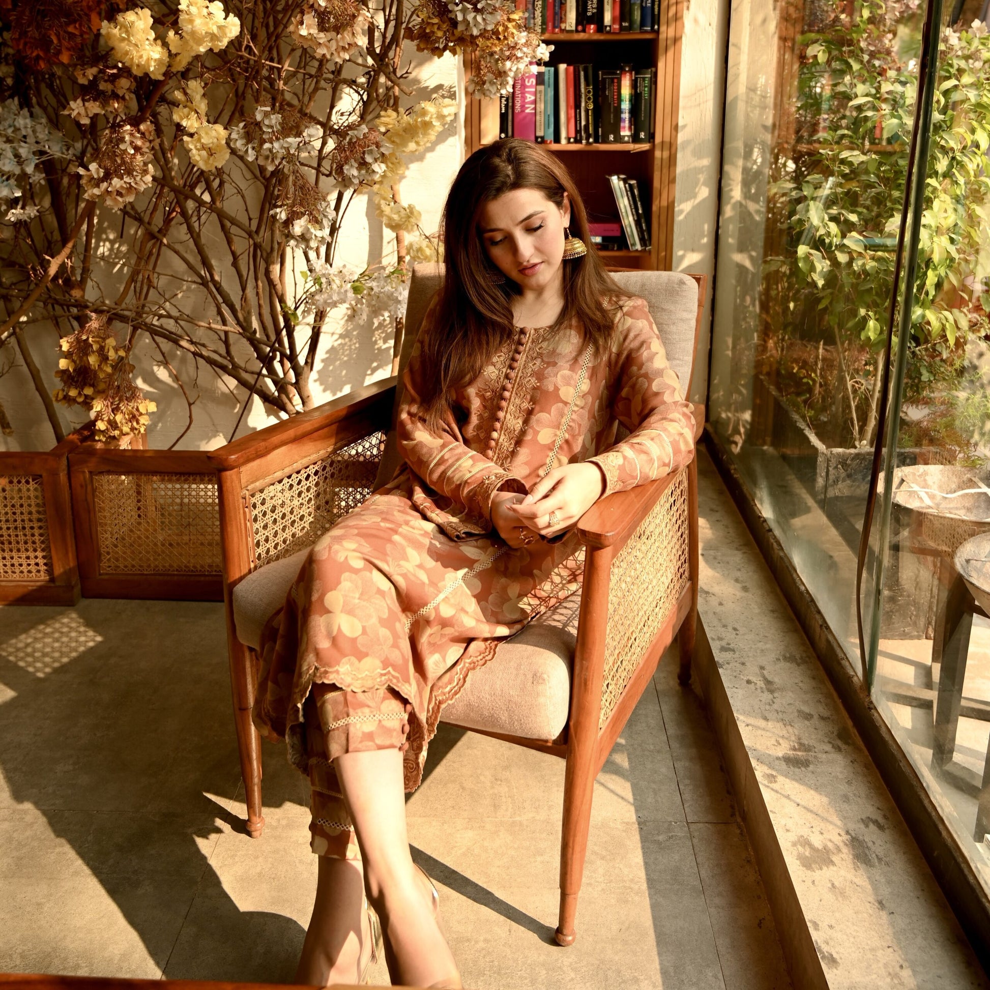 A panelled long shirt , decked in resplendent allure and graced by the presence of intricate floral embroidery on sleeves, neckline and hem elevate your ensemble, with straight fit pants which embrace the profound beauty of nature, meticulously interwoven into every meticulously crafted stitch.