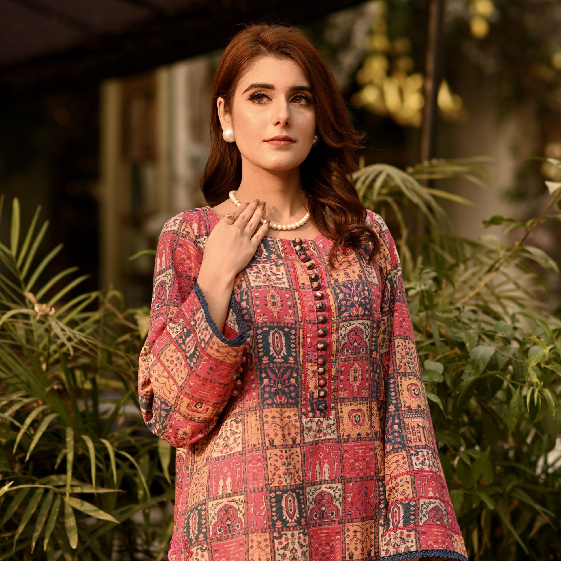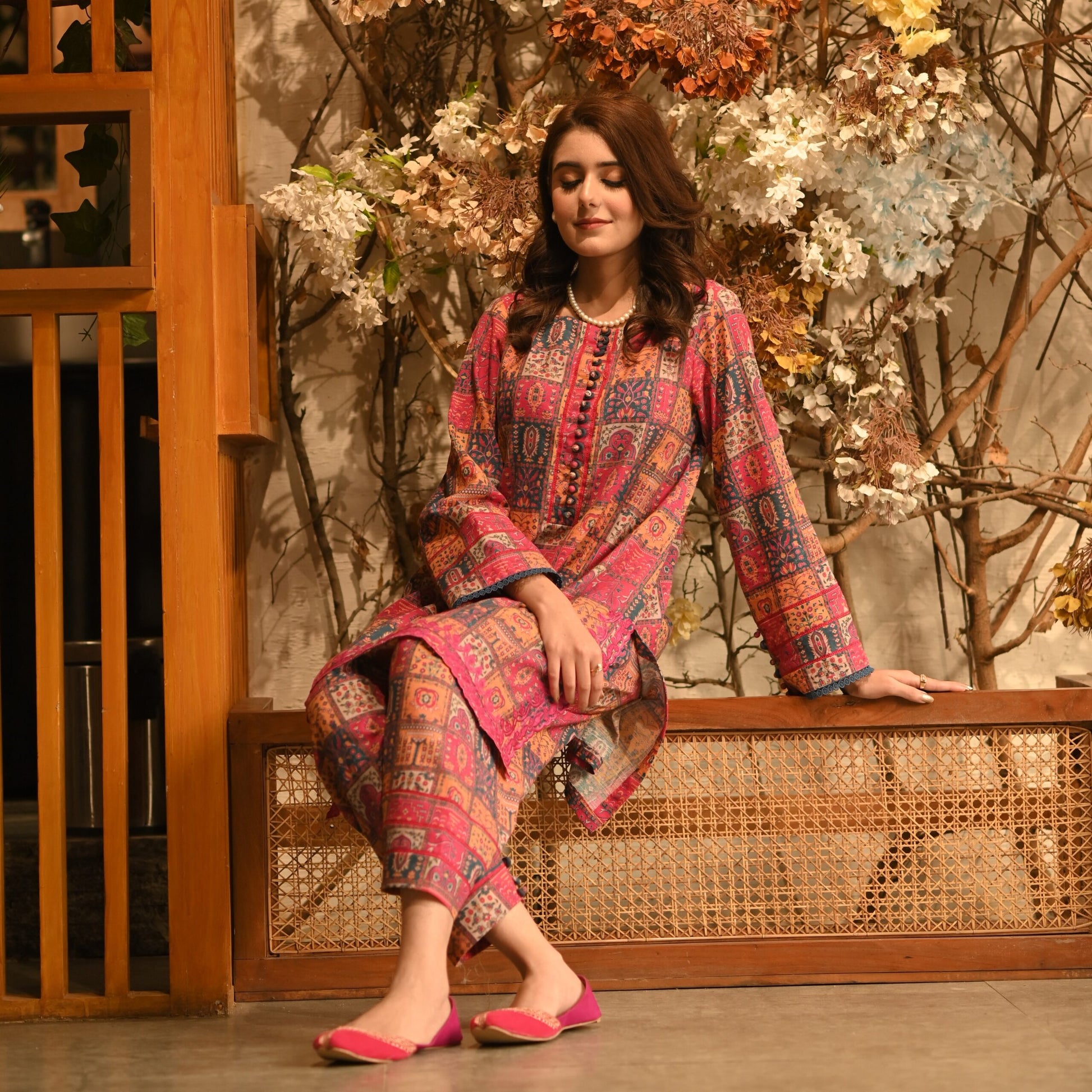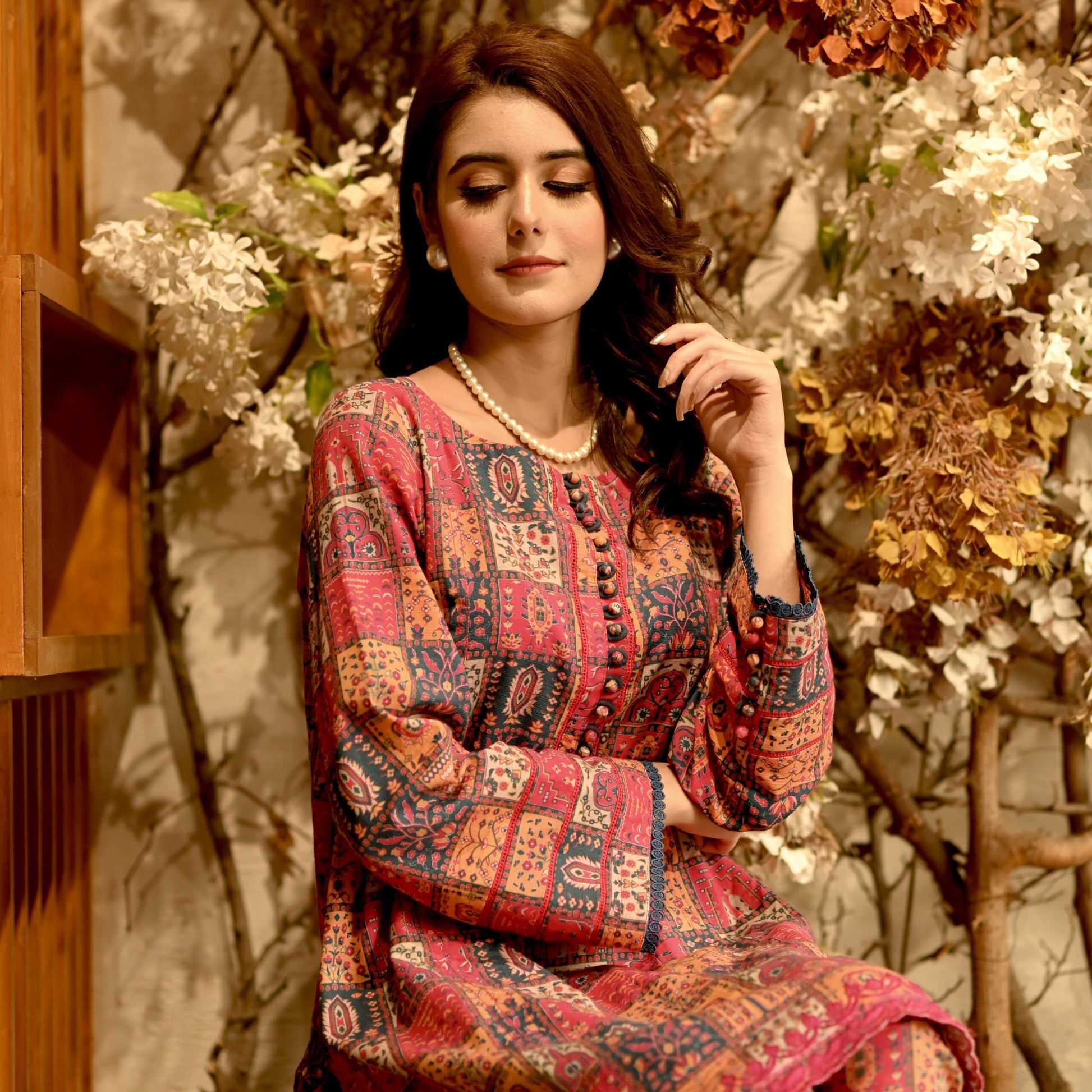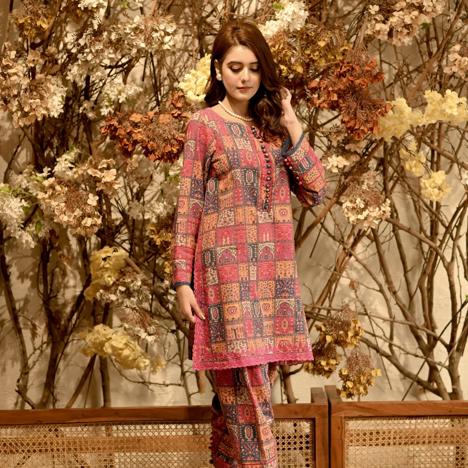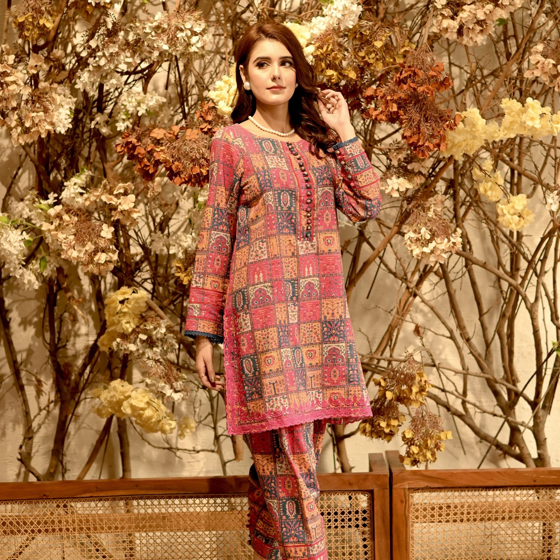 Immerse yourself in the soft allure of this multicoloured khaddar entirety, a canvas of delicate craftsmanship and understated elegance. The shirt unfolds in a symphony of French floral embroidery at the hem, contrasted by the lace details on neck and sleeves. Along with classic straight fit shalwar, complete this portrait of modern grace and timeless style.
