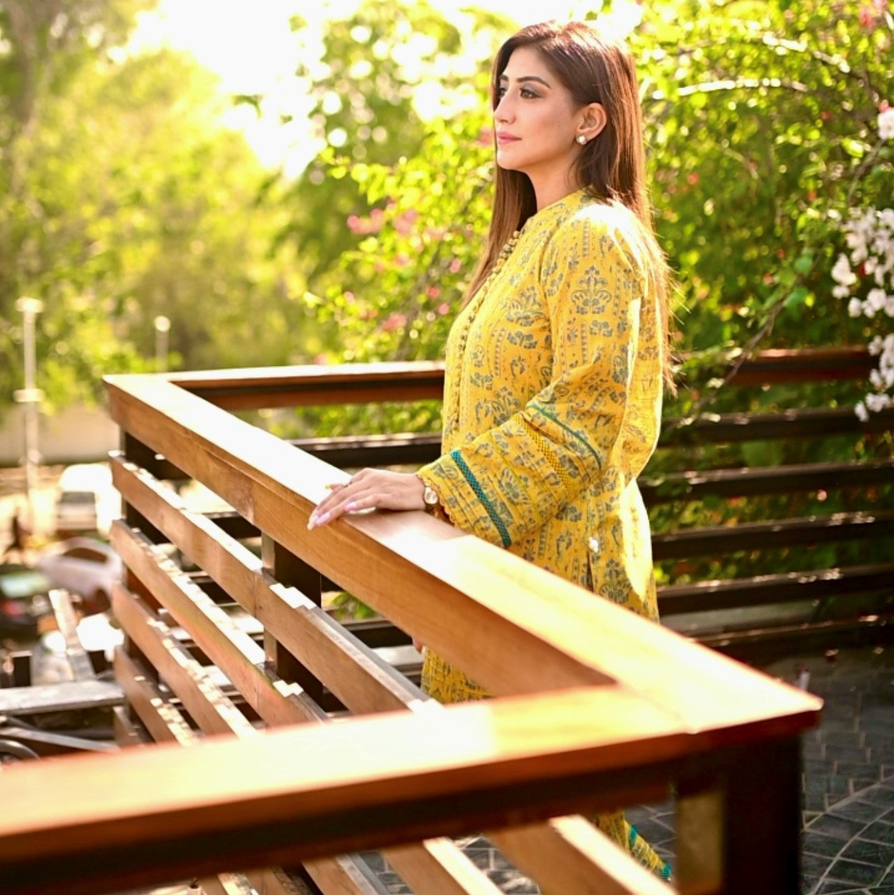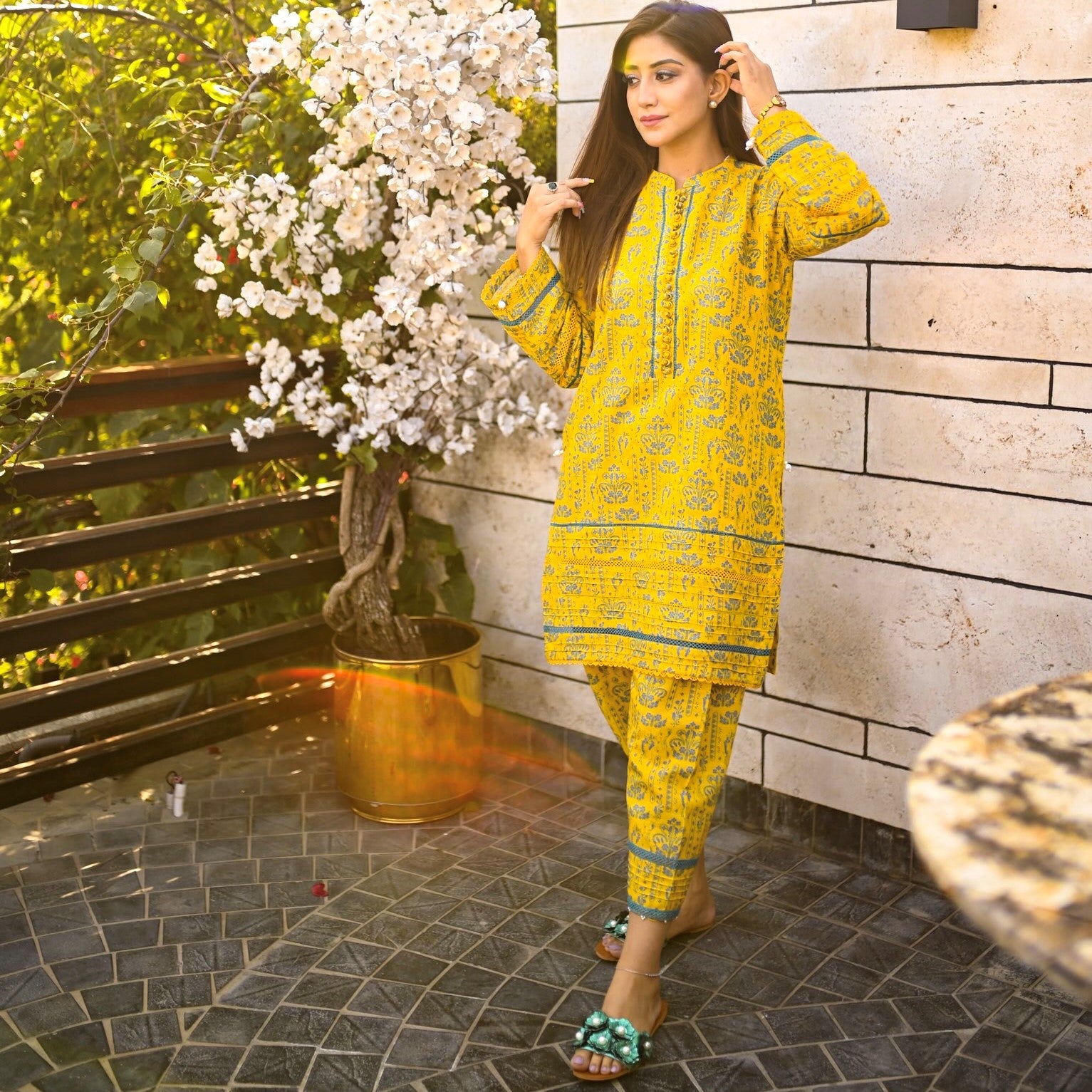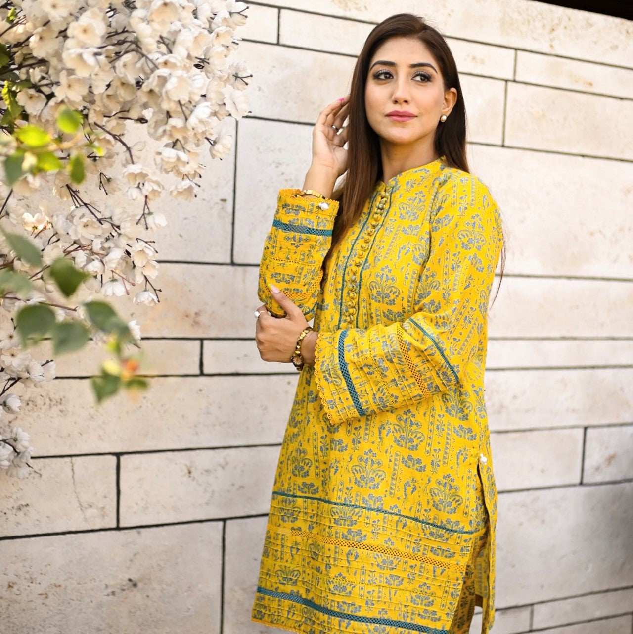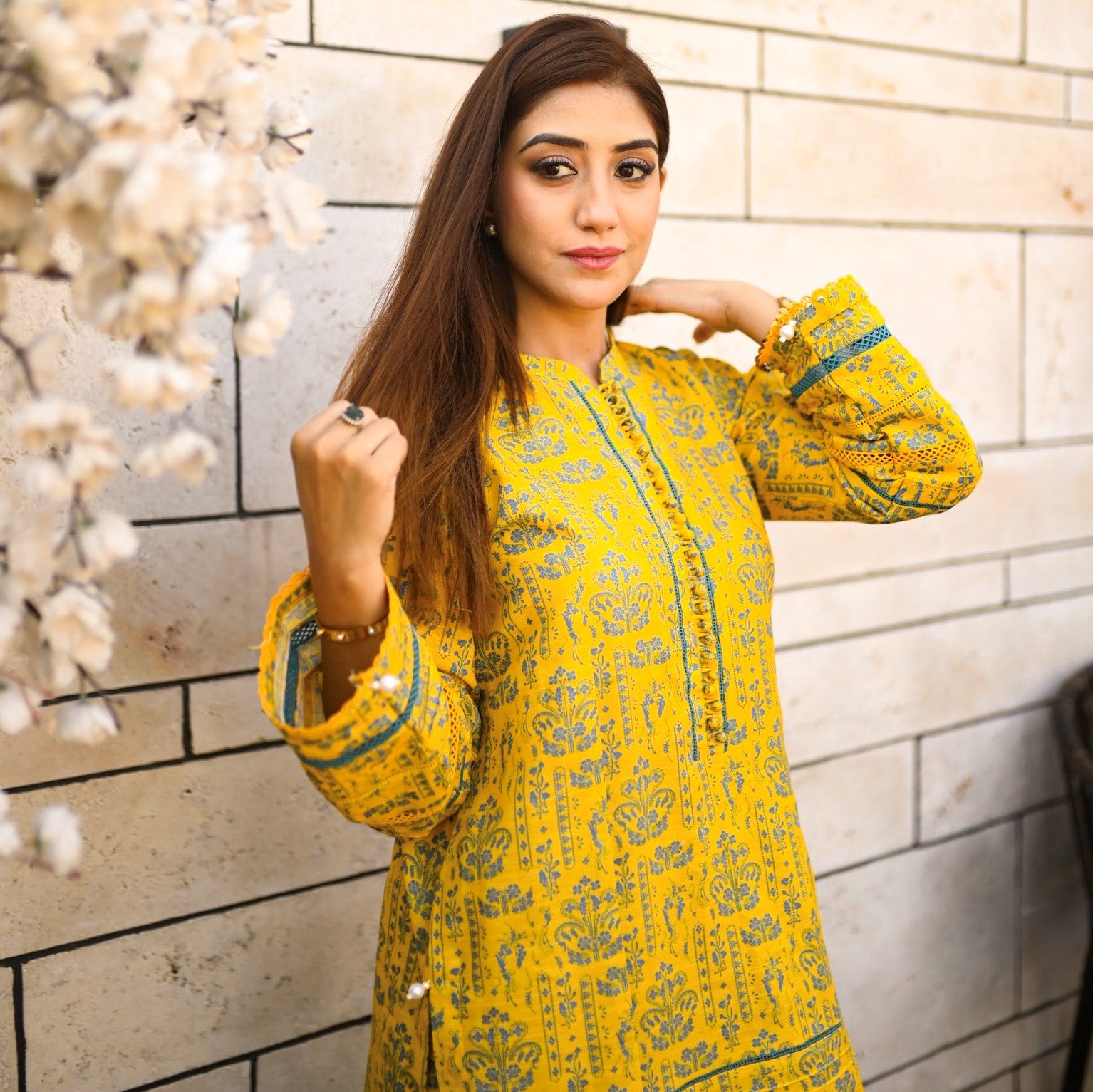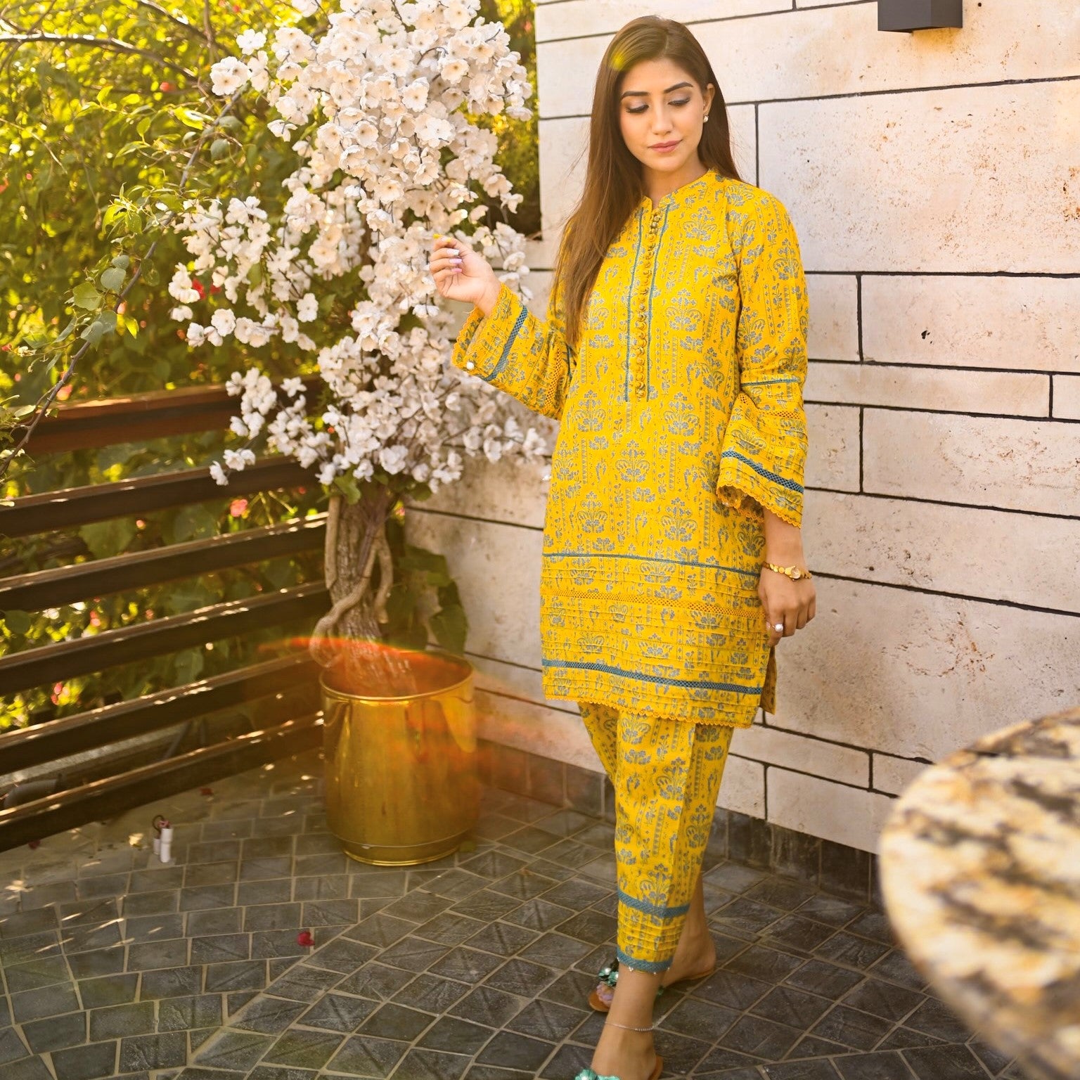 Printed cord features graceful shirts with laces and pearl detailing paired with straight shalwar.