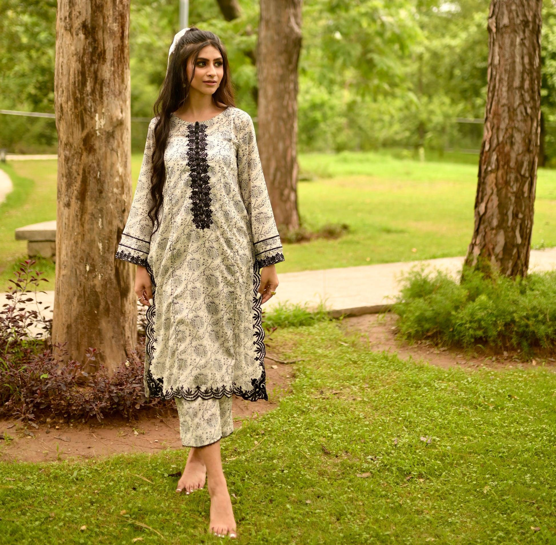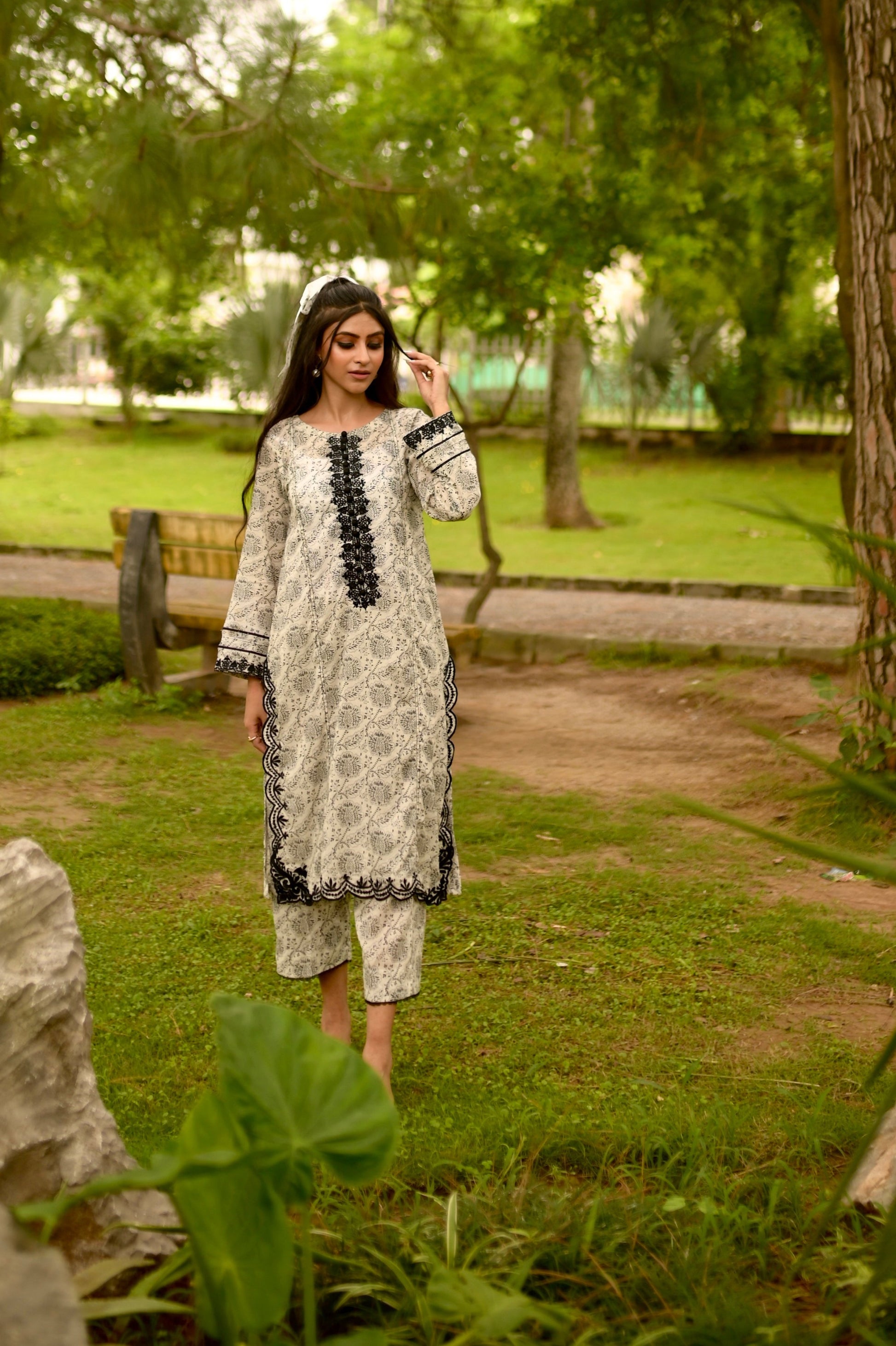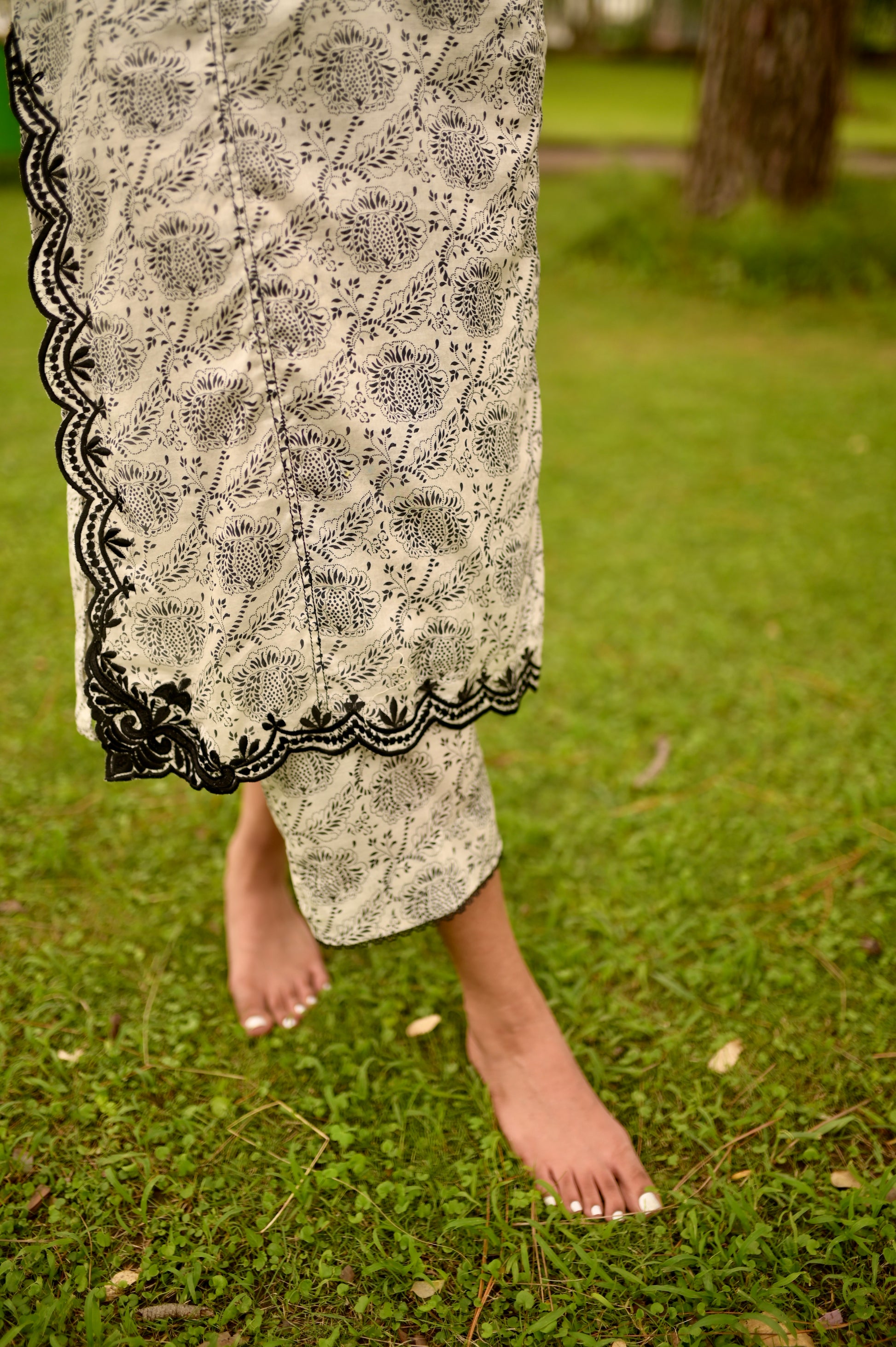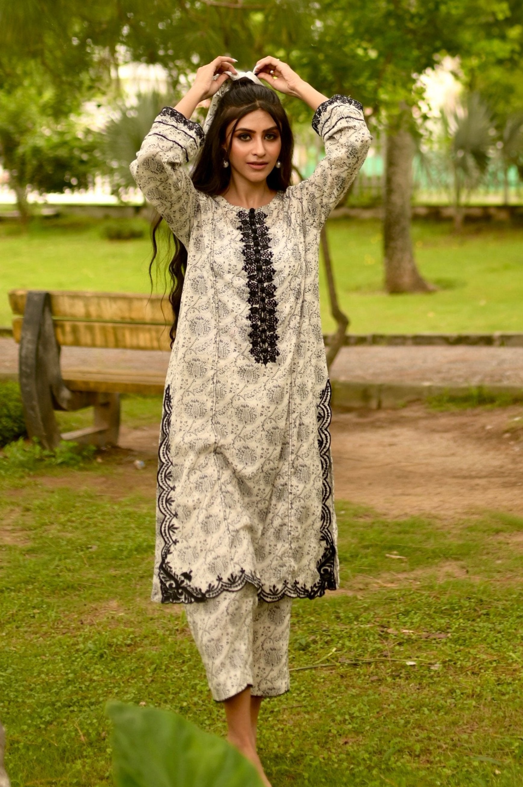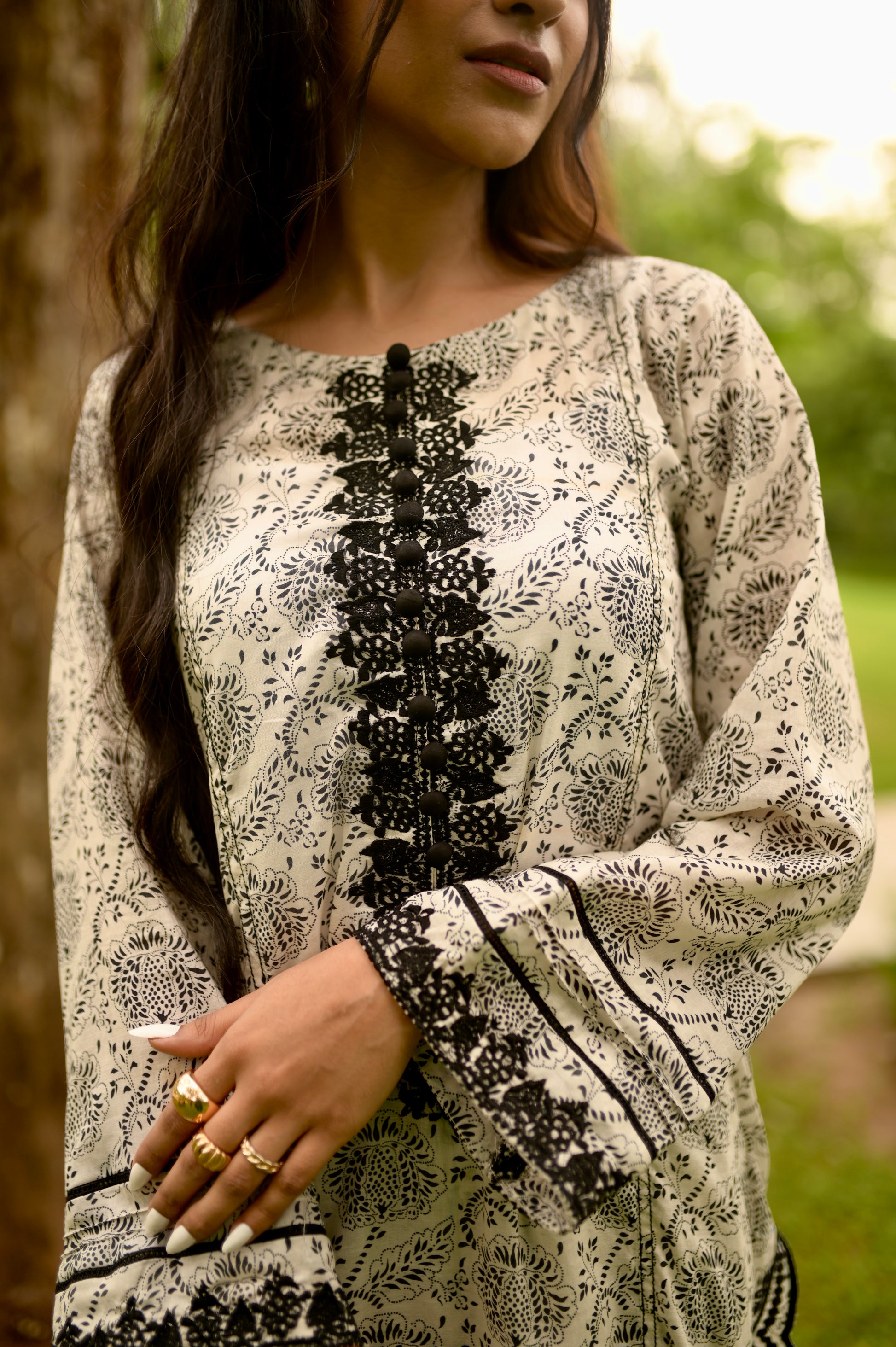 A panelled long shirt unfolds, decked in resplendent allure and graced by the presence of intricate embroidery elevate your ensemble, with culottes embroidered pants which embrace the profound beauty of nature, meticulously interwoven into every meticulously crafted stitch.