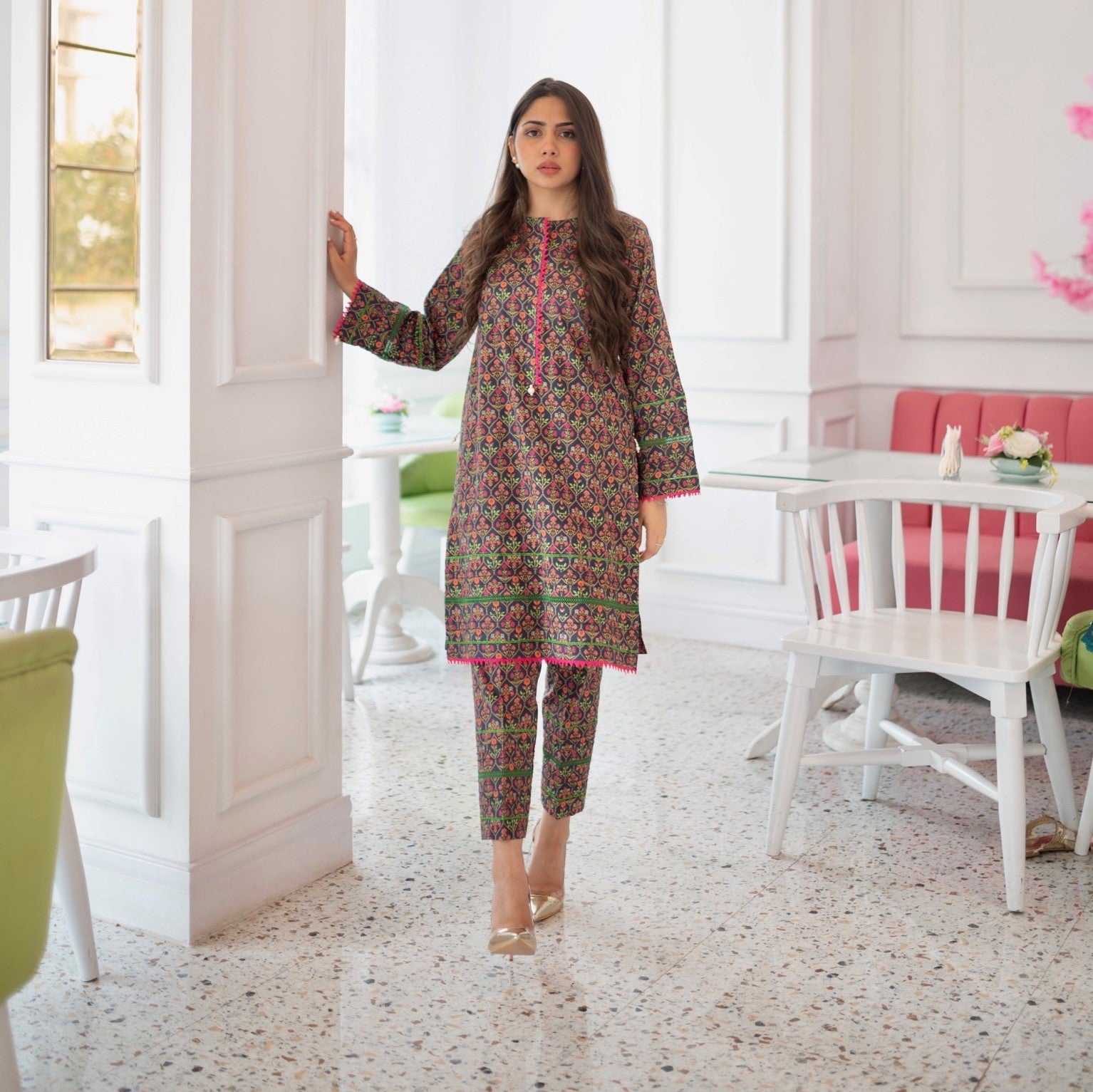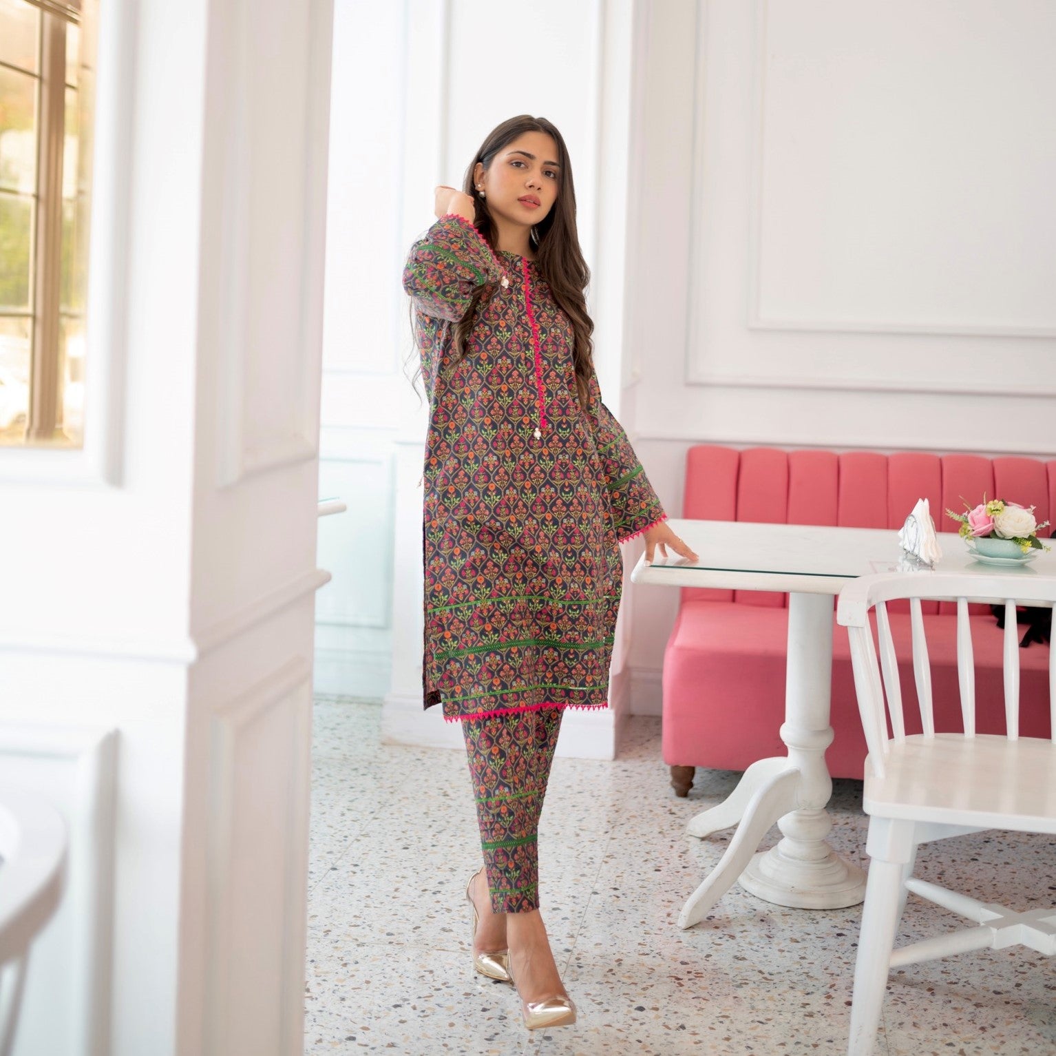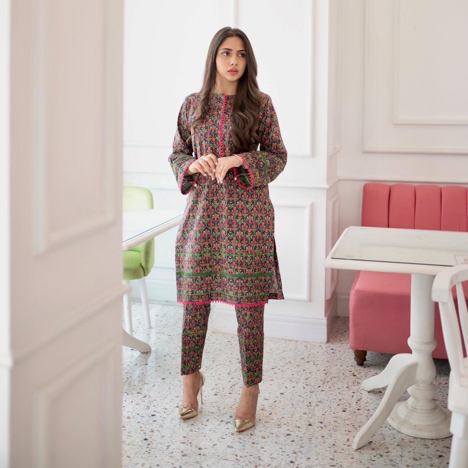Printed cords features graceful shirt with laces and pearl detailing paired with straight pants.