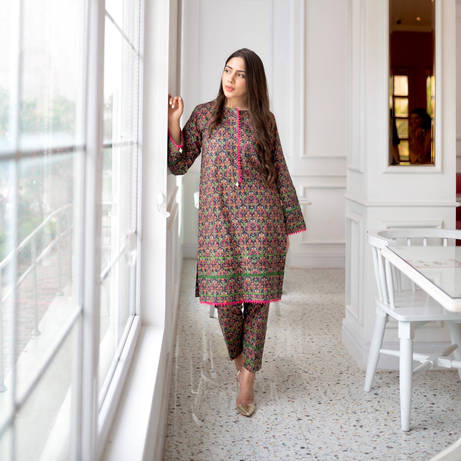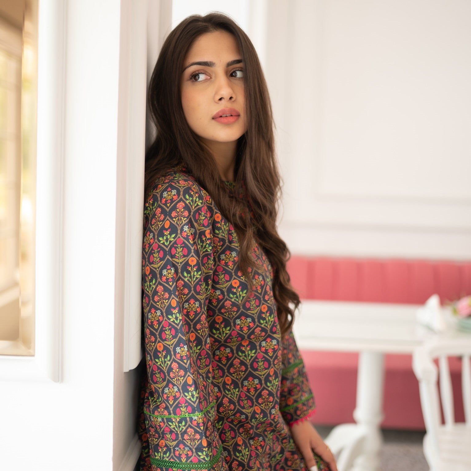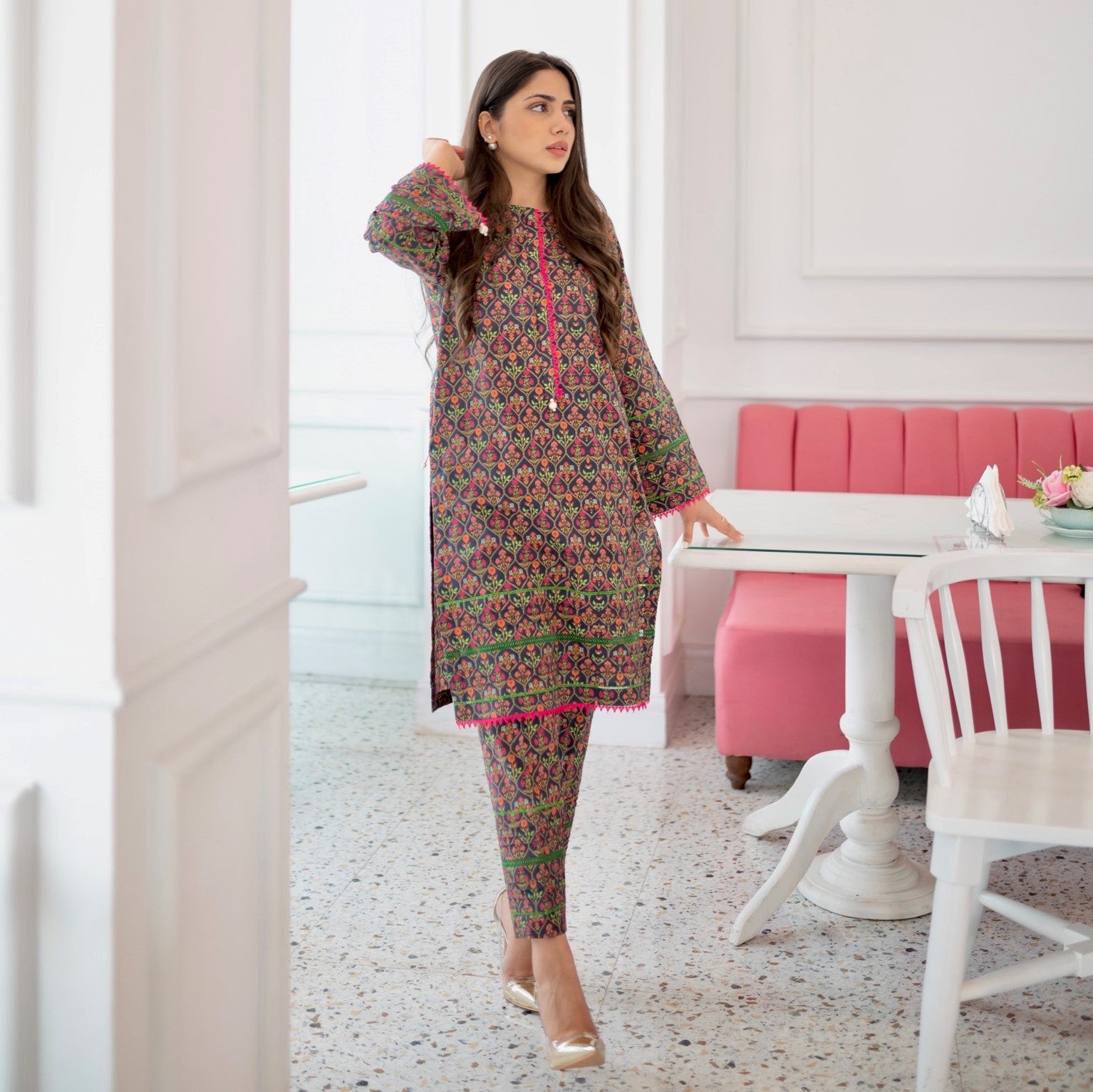 Printed cords features graceful shirt with laces and pearl detailing paired with straight pants.
