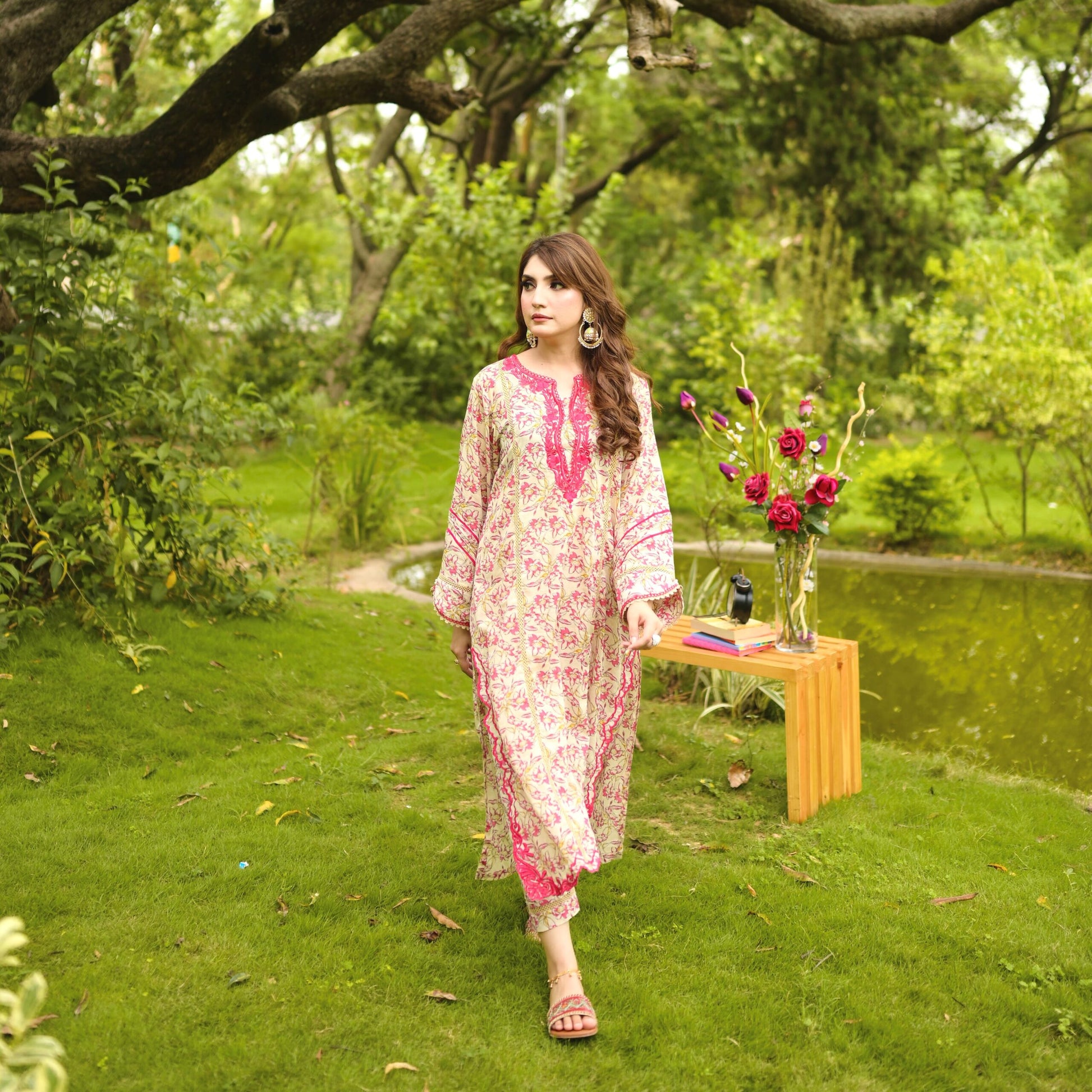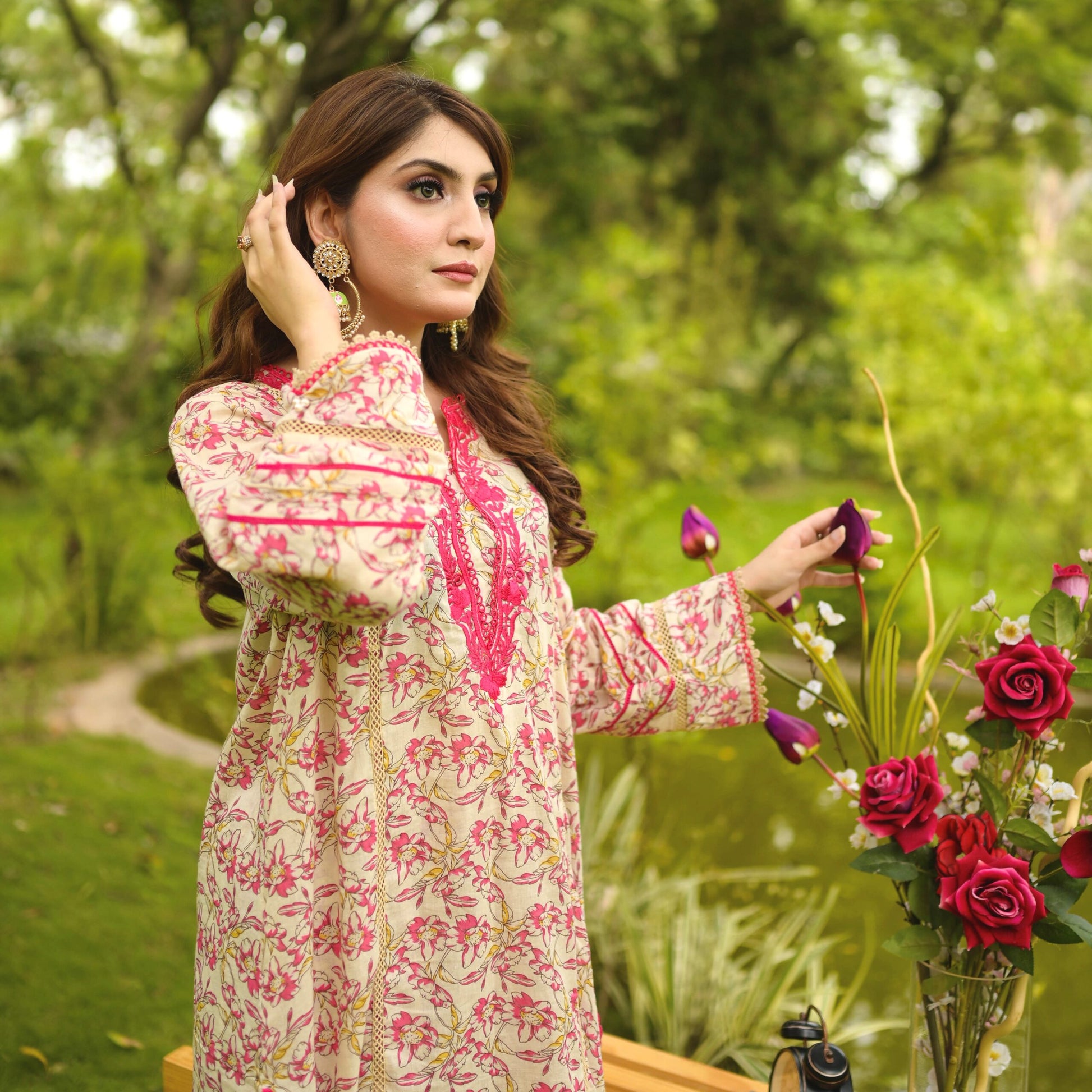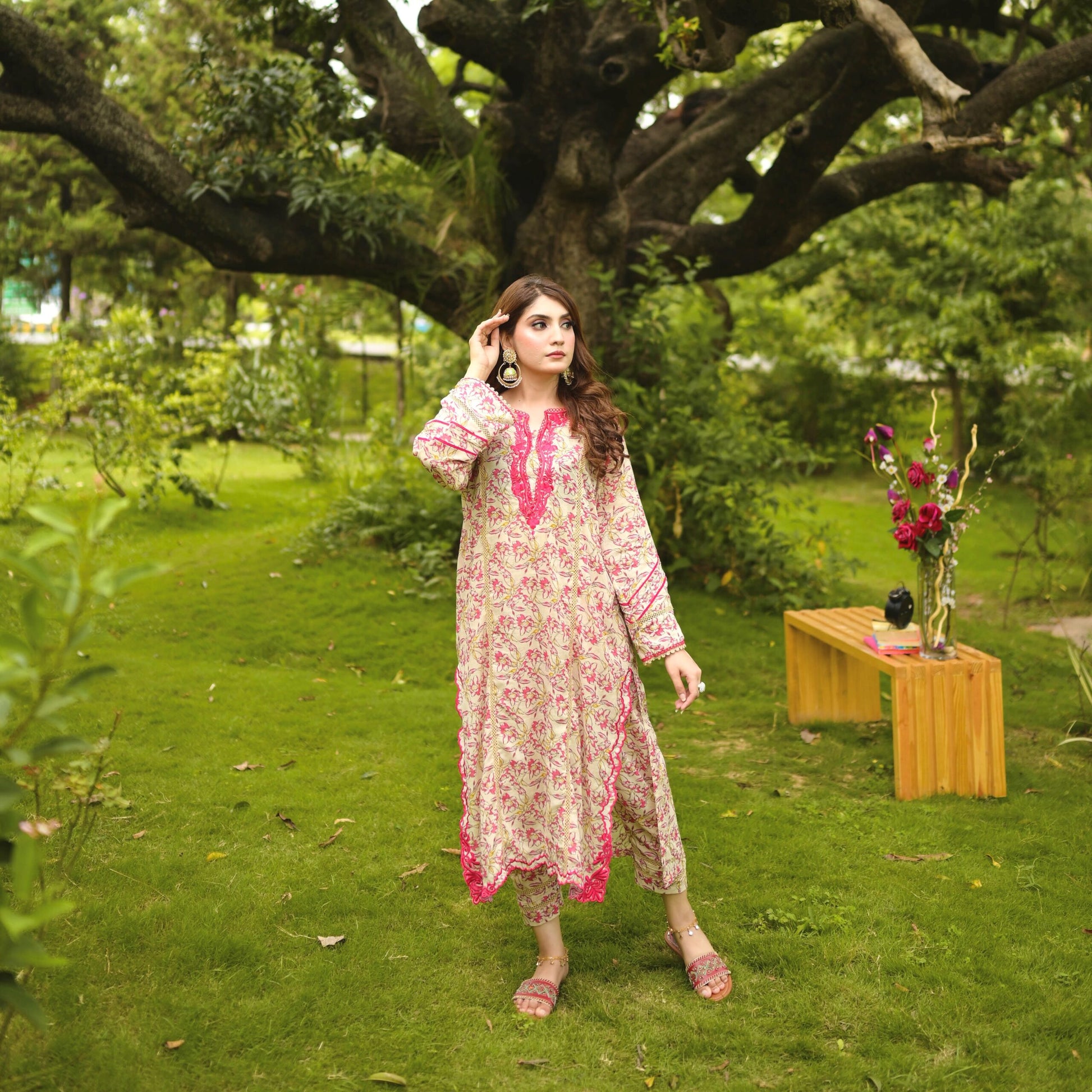 An elegant printed shirt with side panels beautifully adorned with floral embroidery at the front with laces and pearl detailing on neck and sleeves along with straight fit pants.