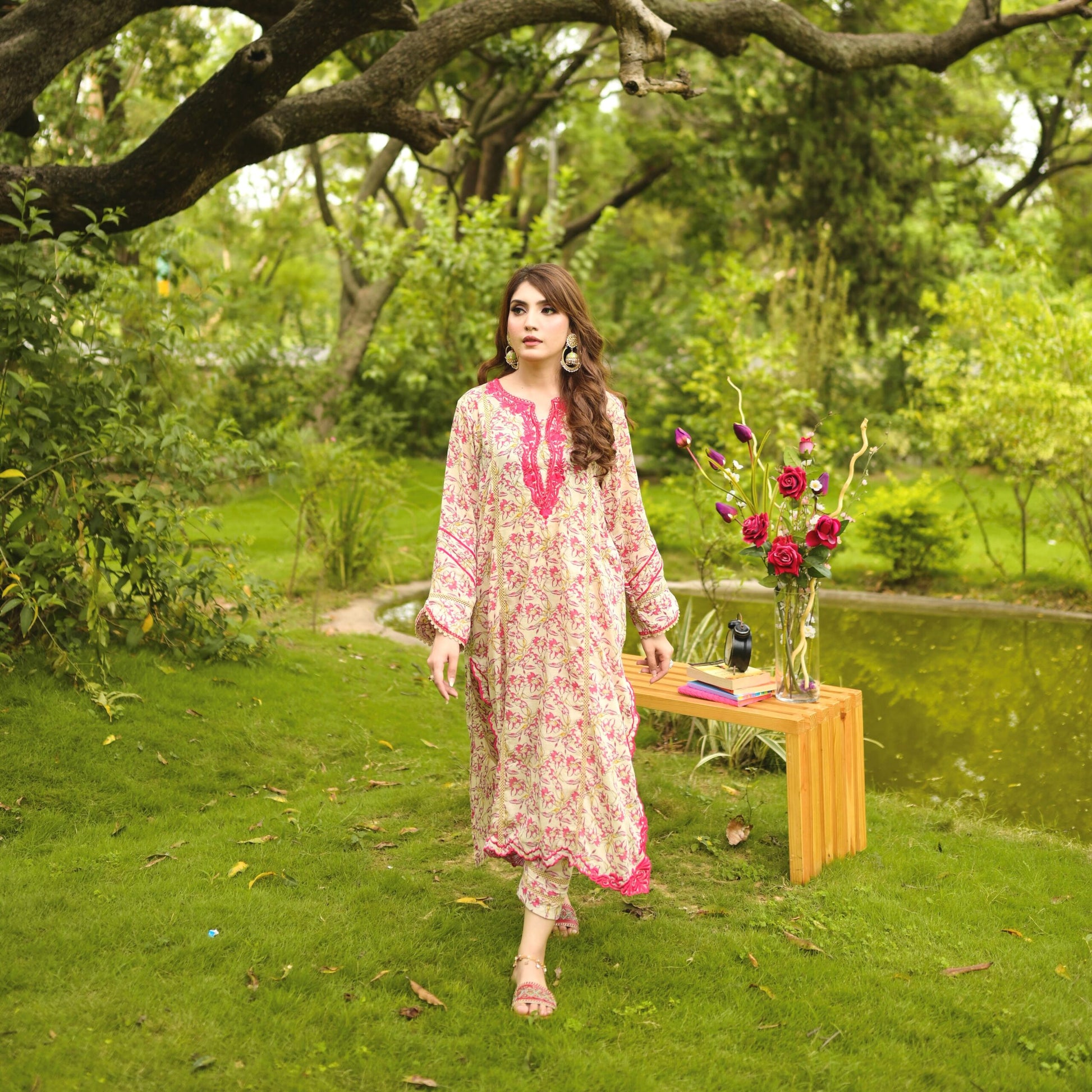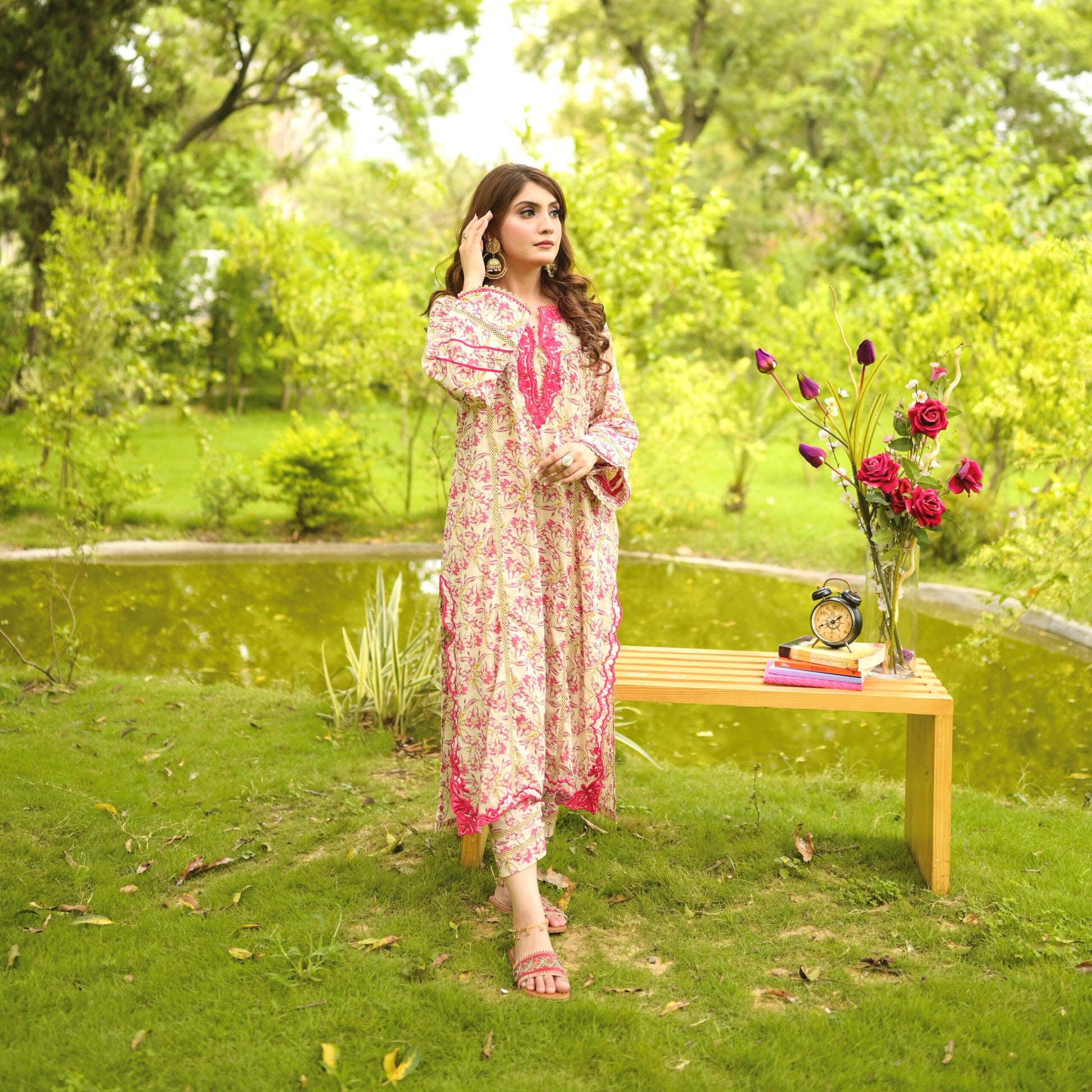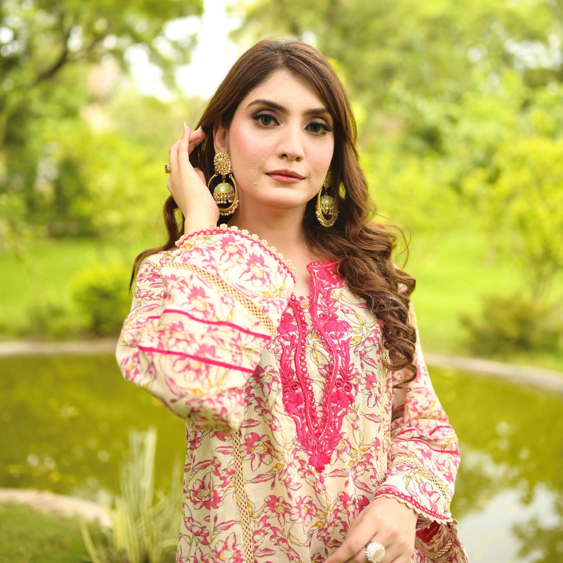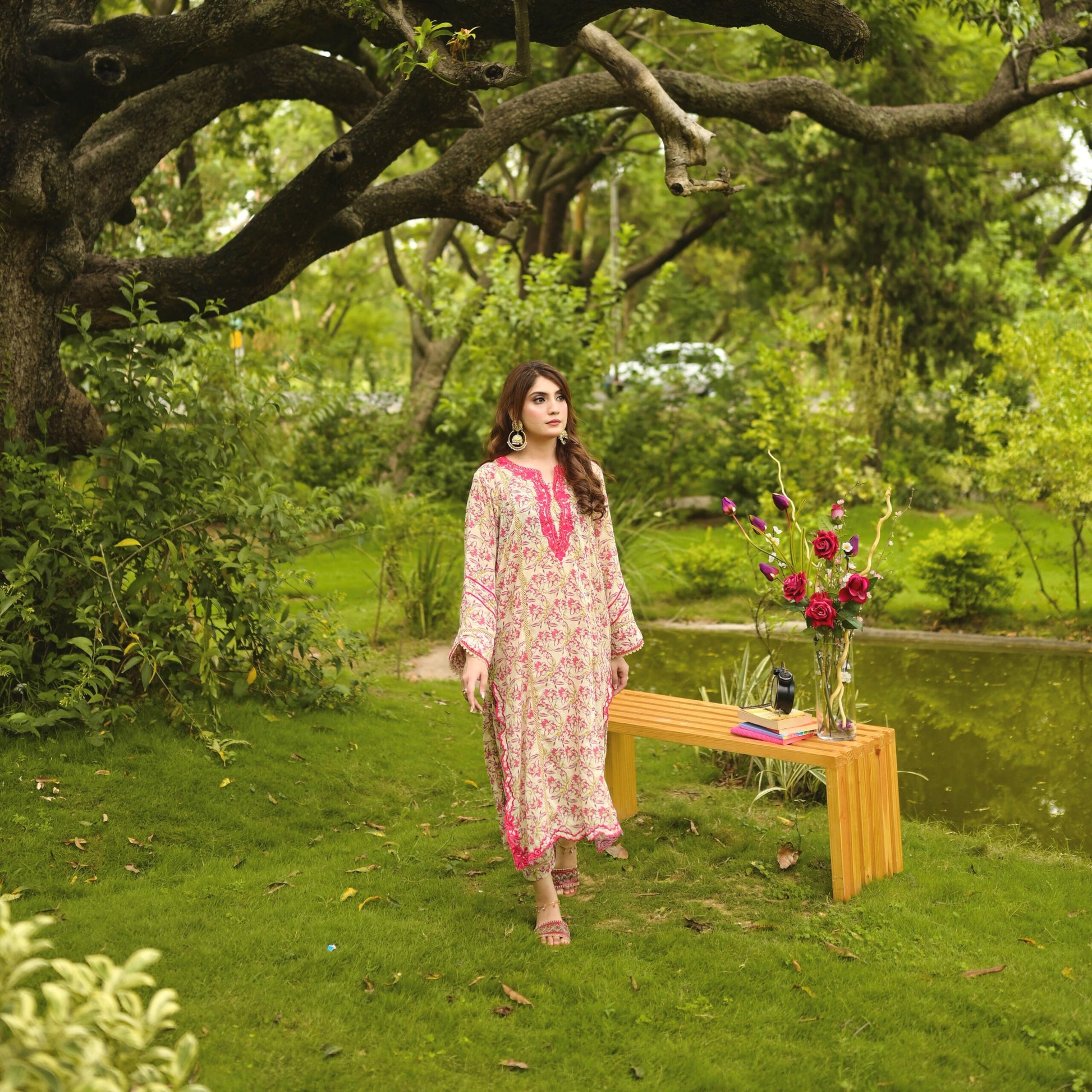 An elegant printed shirt with side panels beautifully adorned with floral embroidery at the front with laces and pearl detailing on neck and sleeves along with straight fit pants.