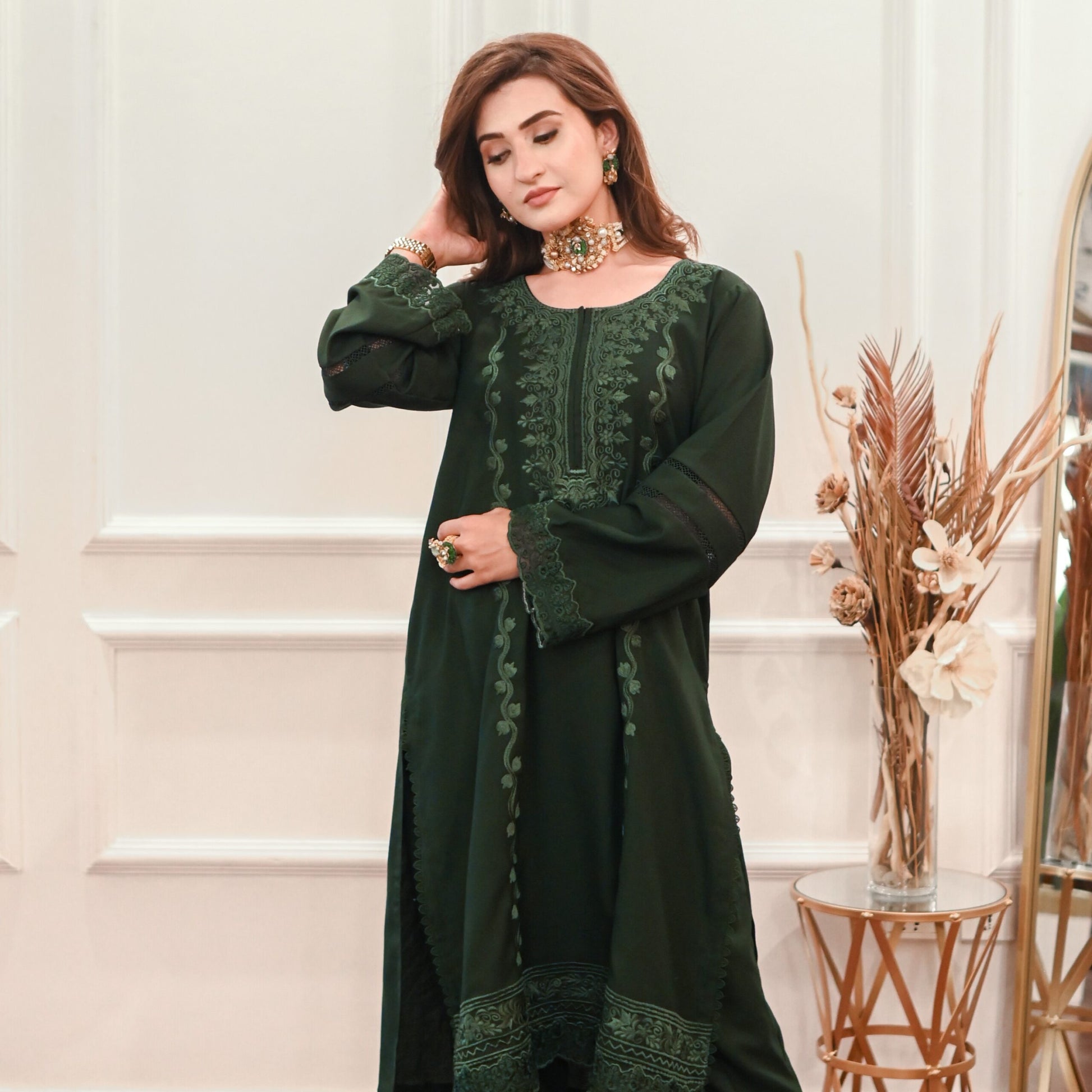 A panelled long shirt unfolds, decked in resplendent allure and graced by the presence of intricate floral embroidery to elevate your ensemble, with straight fit pants that embrace the profound beauty of nature, meticulously interwoven into every meticulously crafted stitch.