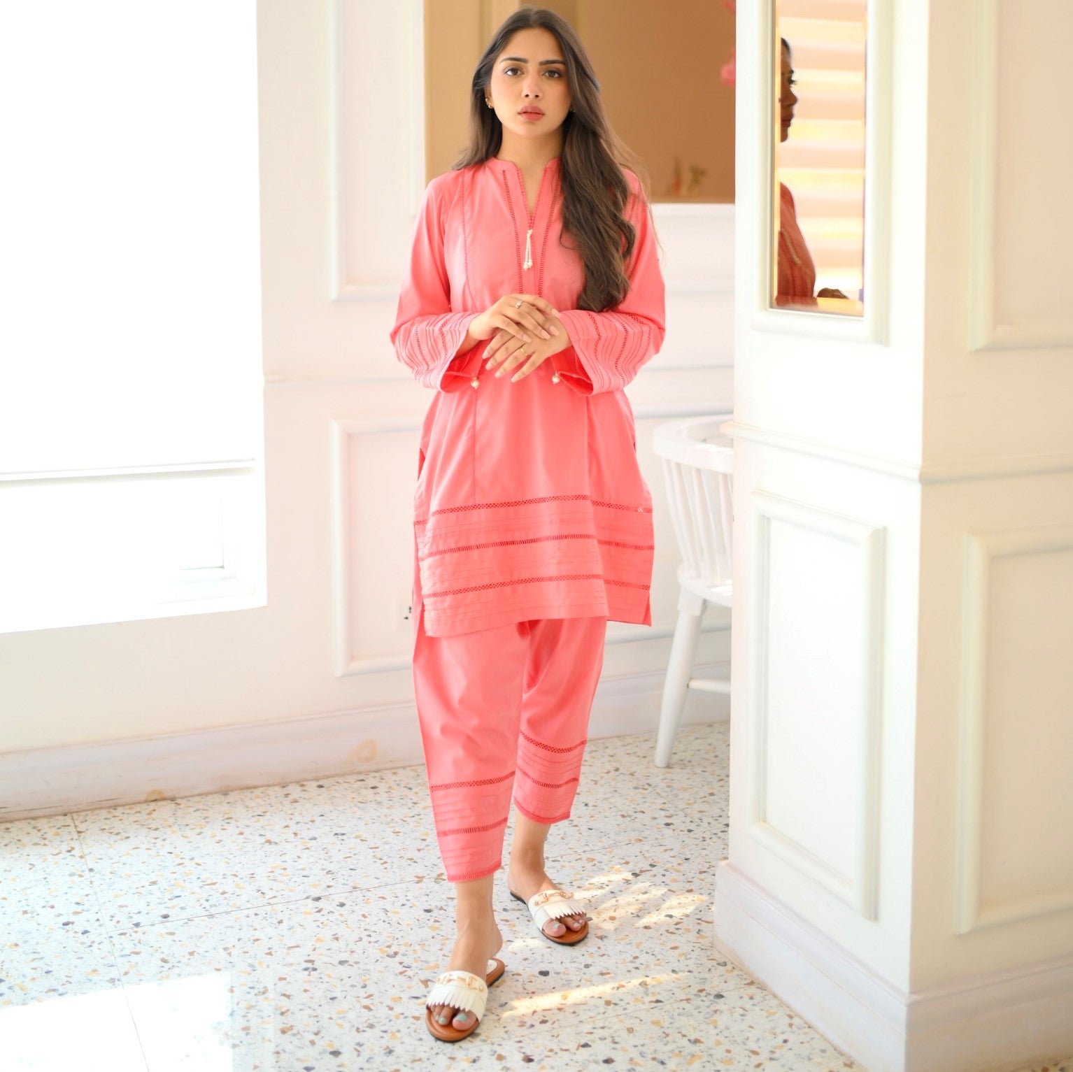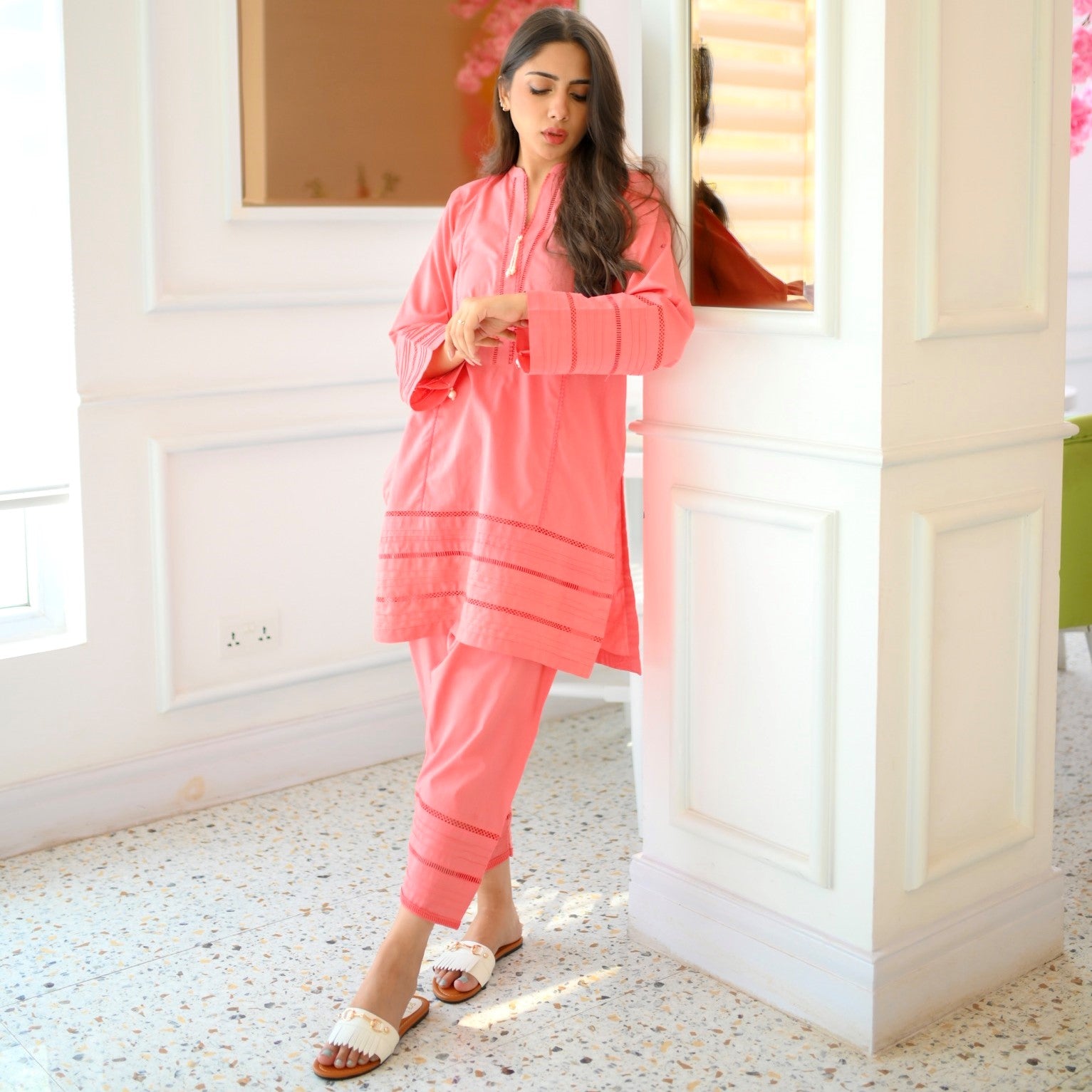 A solid cords crafted in a chic silhouette shirt with famine laces and pearl detailing on neckline and sleeves paired with straight shalwar.