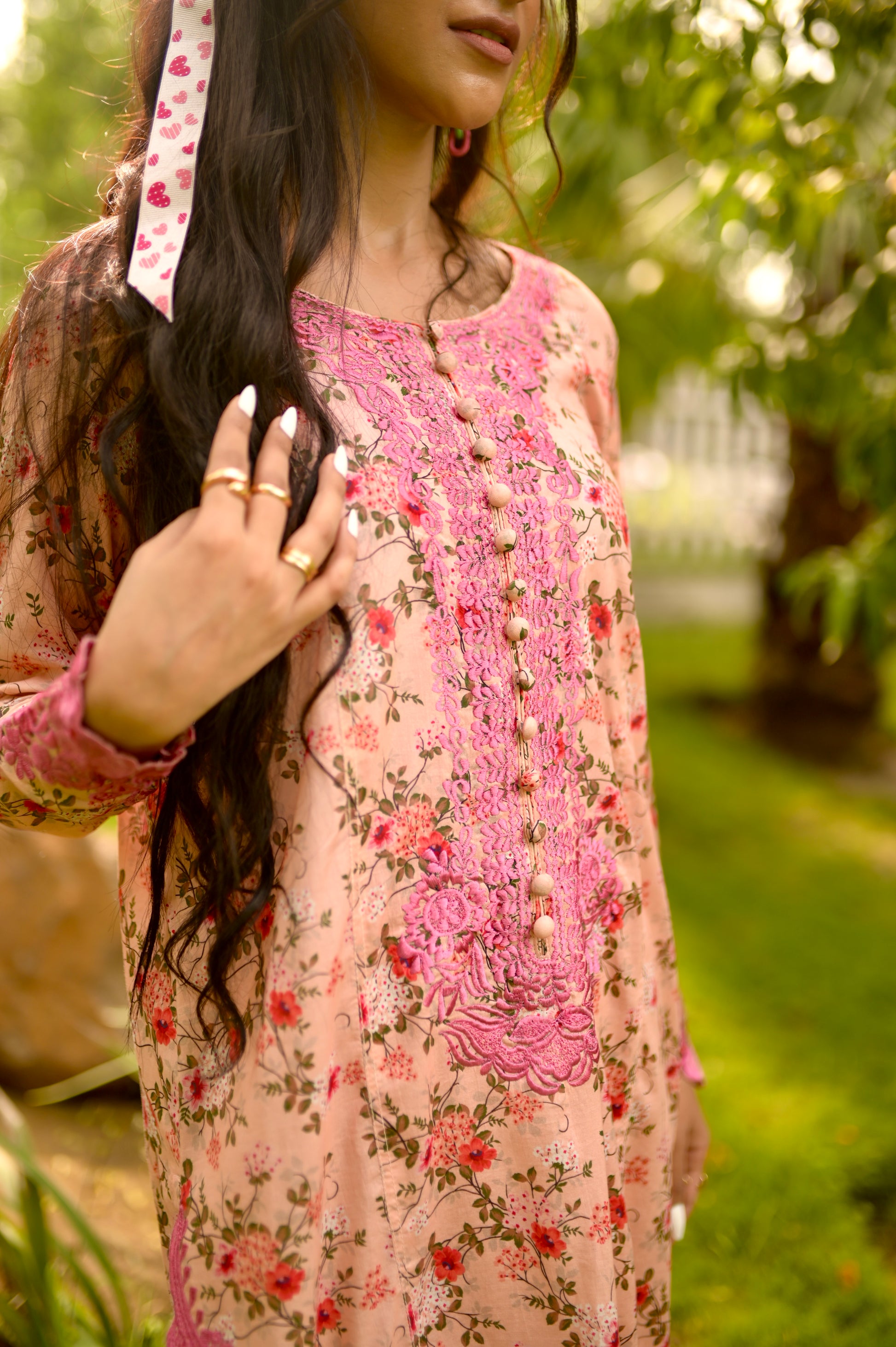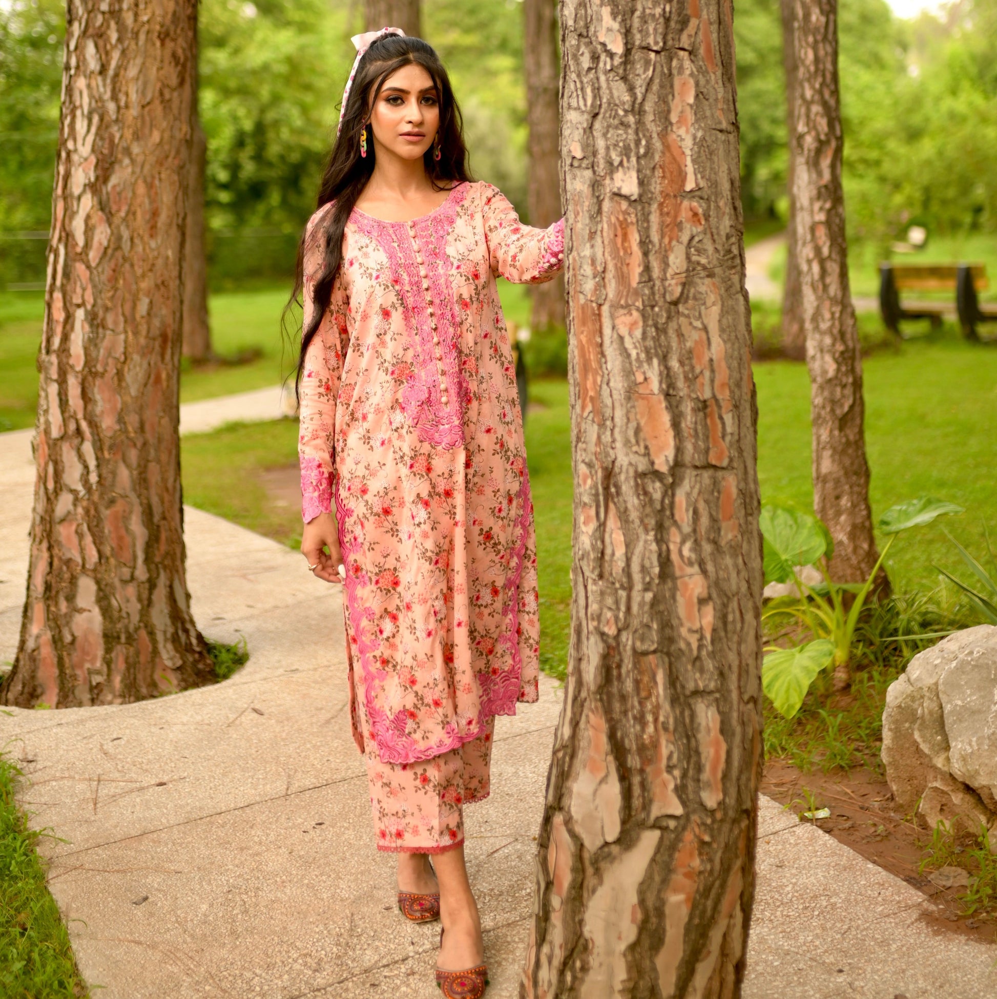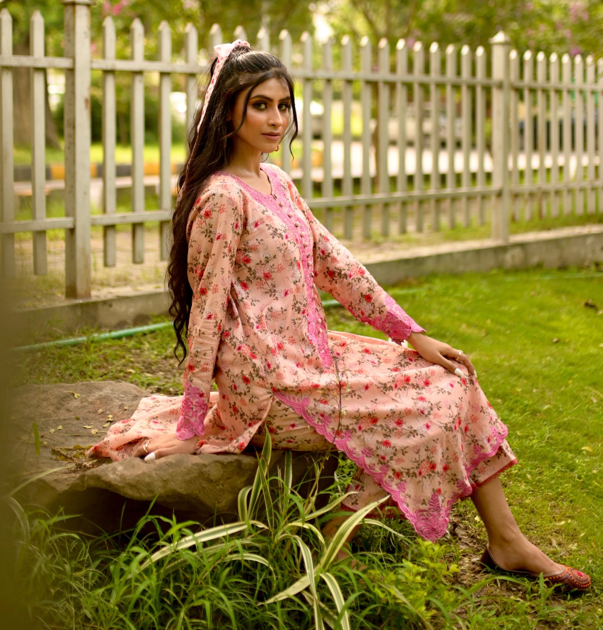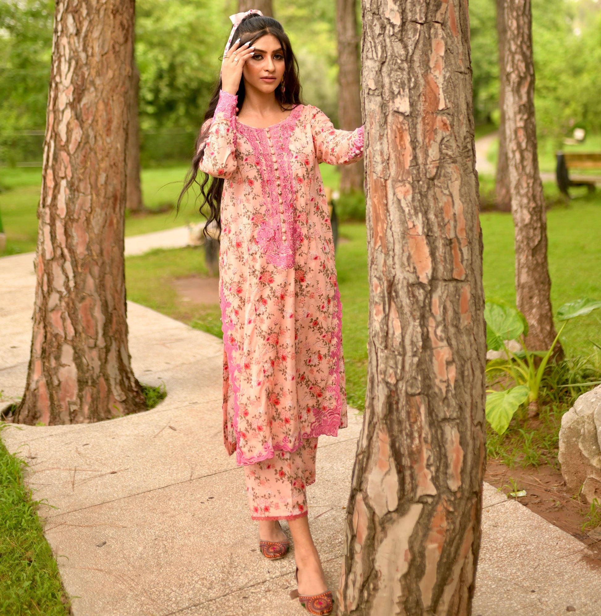 It’s a serene portrayal of pink's soft power, with free-floating flowers print on panelled shirt, the elegance extended by embroidery on neckline, sleeves and hem. Along with culottes lace finish pants.