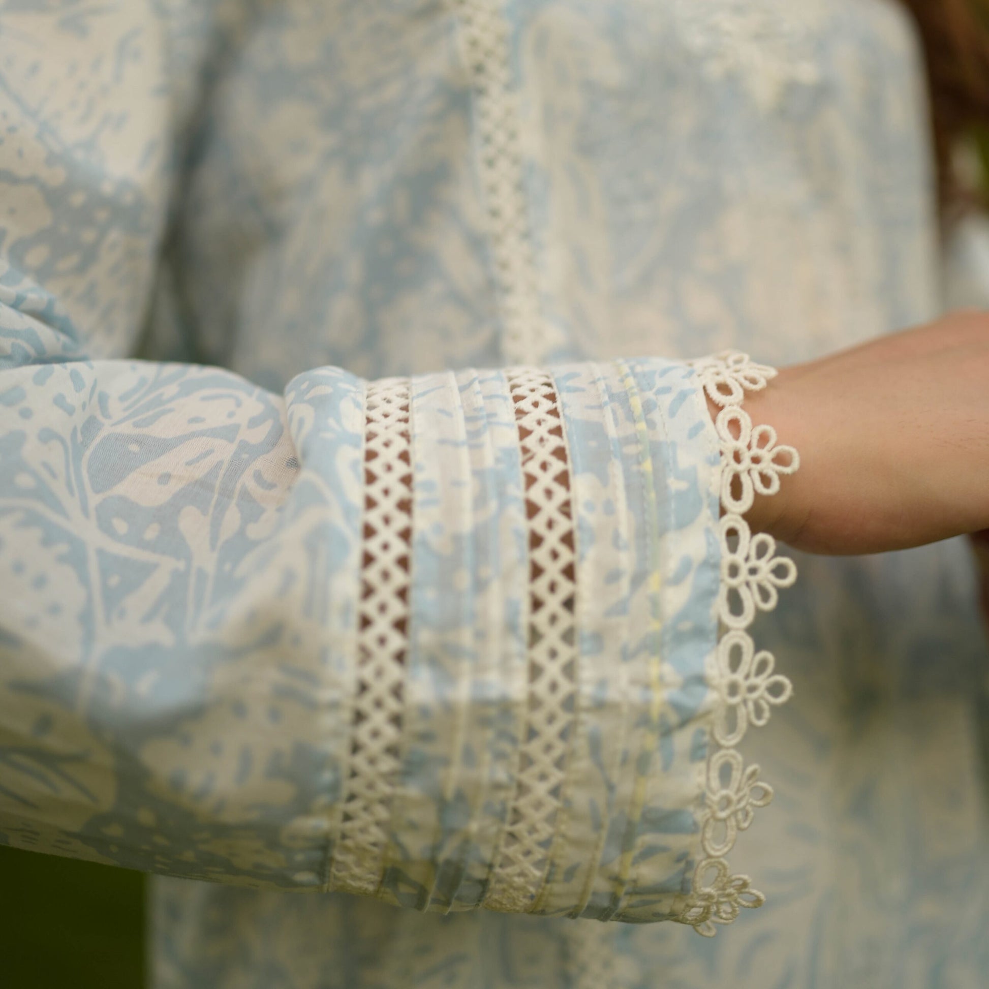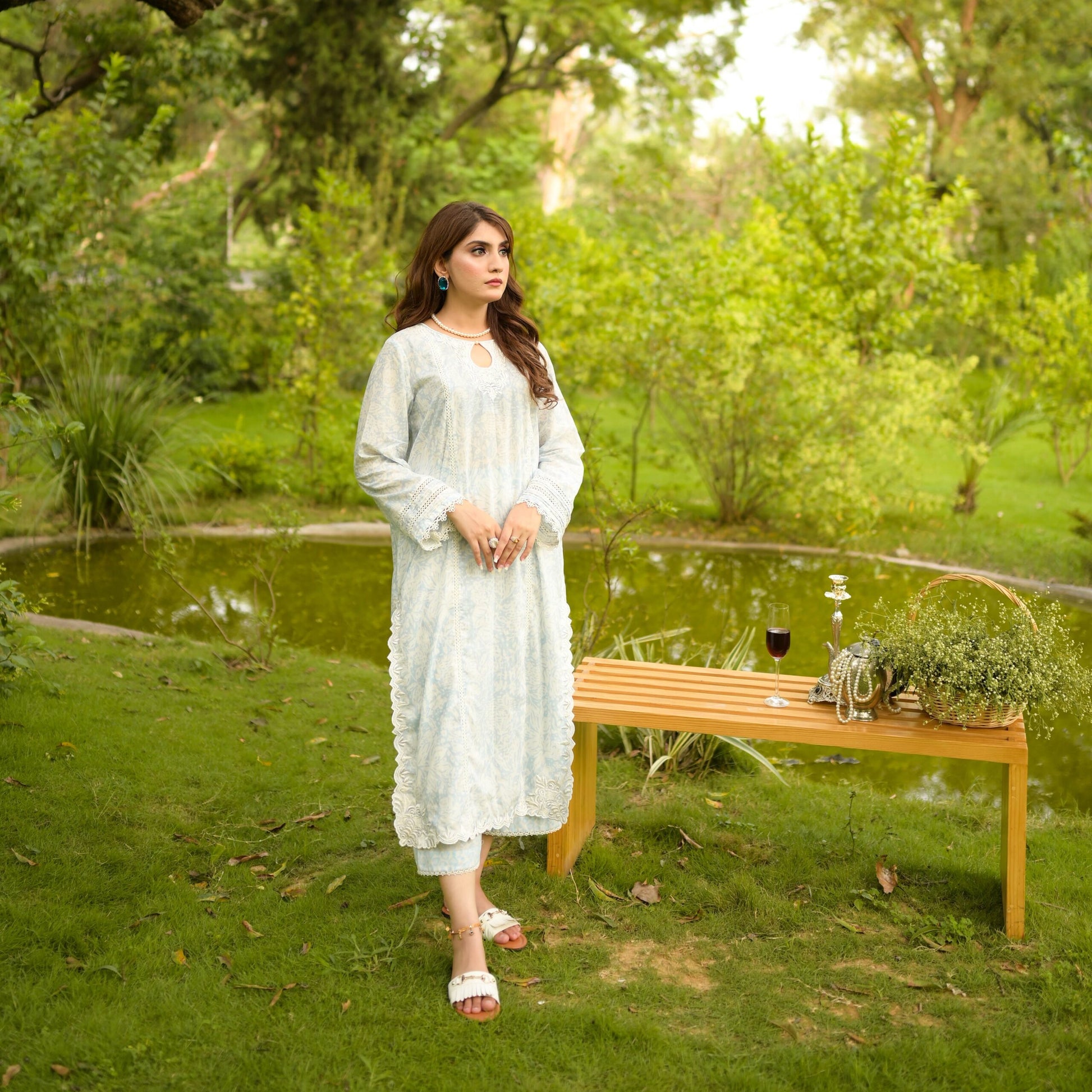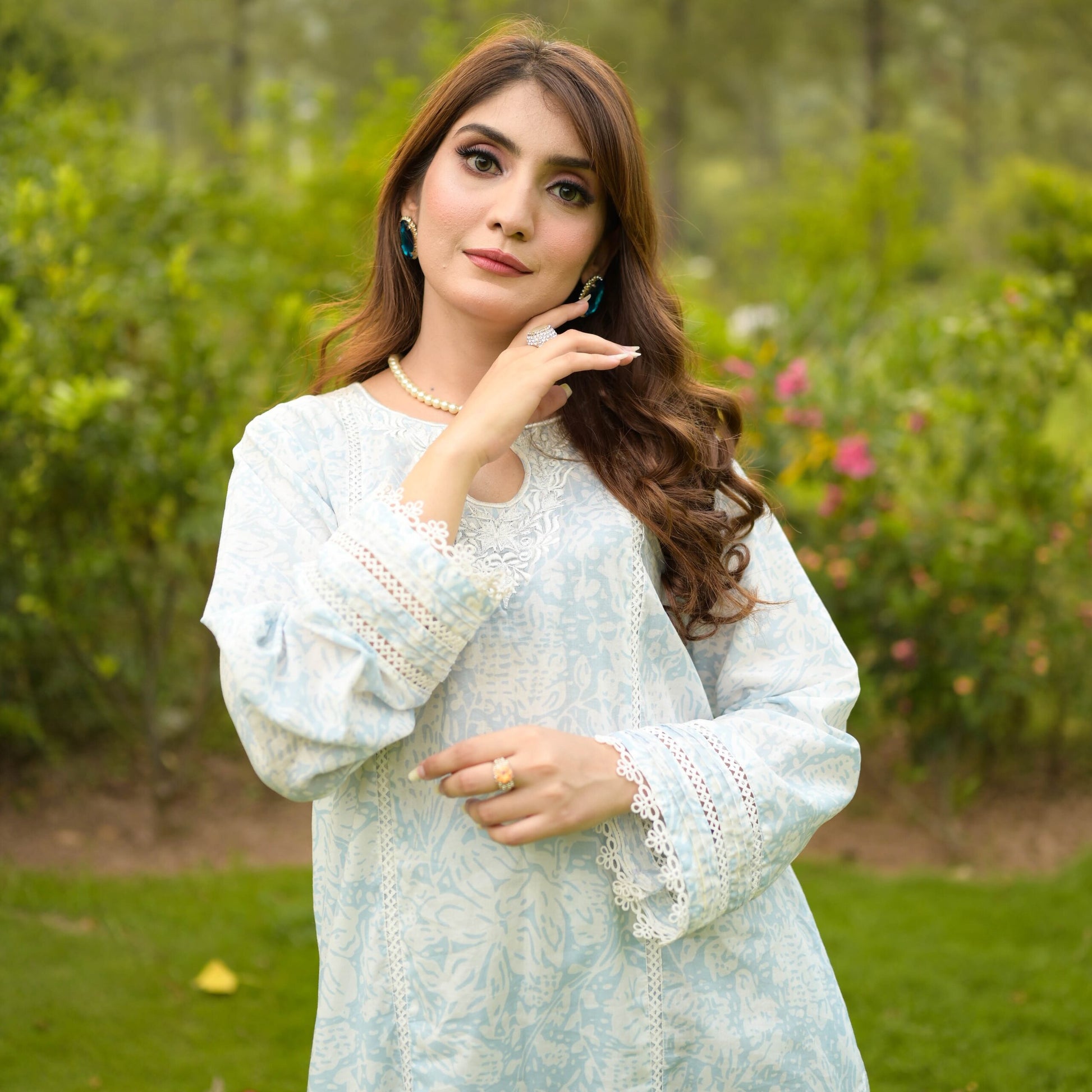An elegant printed shirt with side panels beautifully adorned with floral embroidery at the front with laces and pearl detailing on neck and sleeves along with straight fit pants.