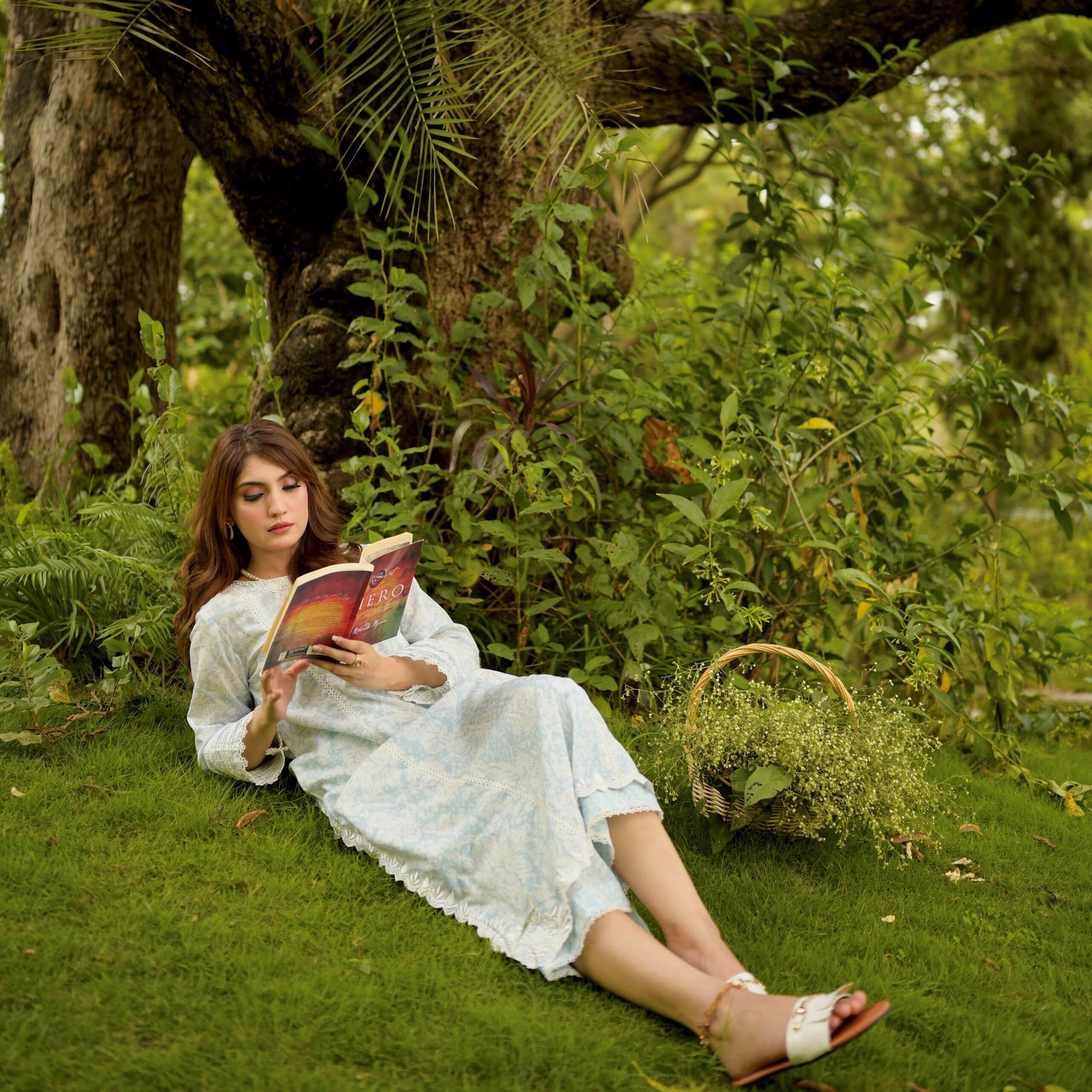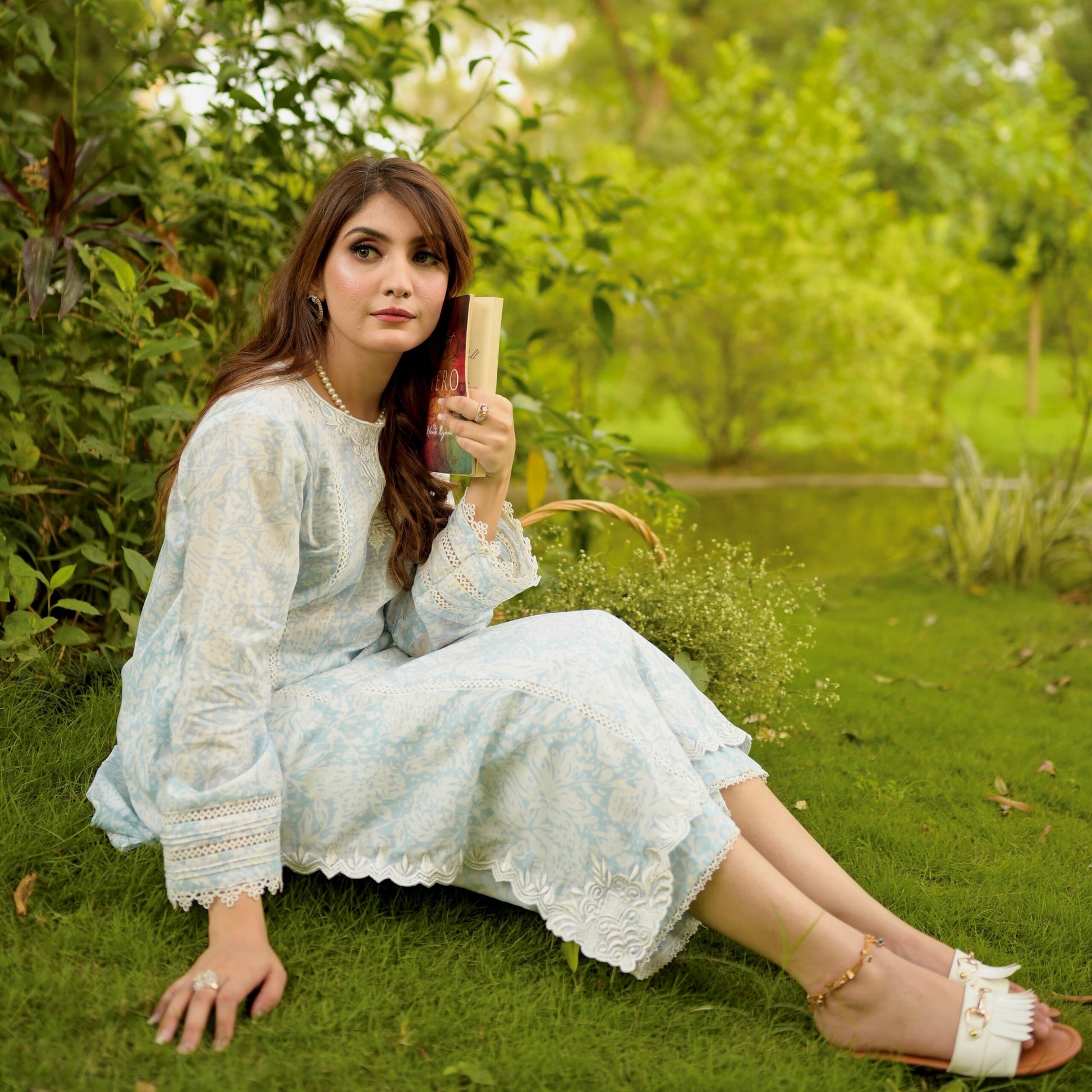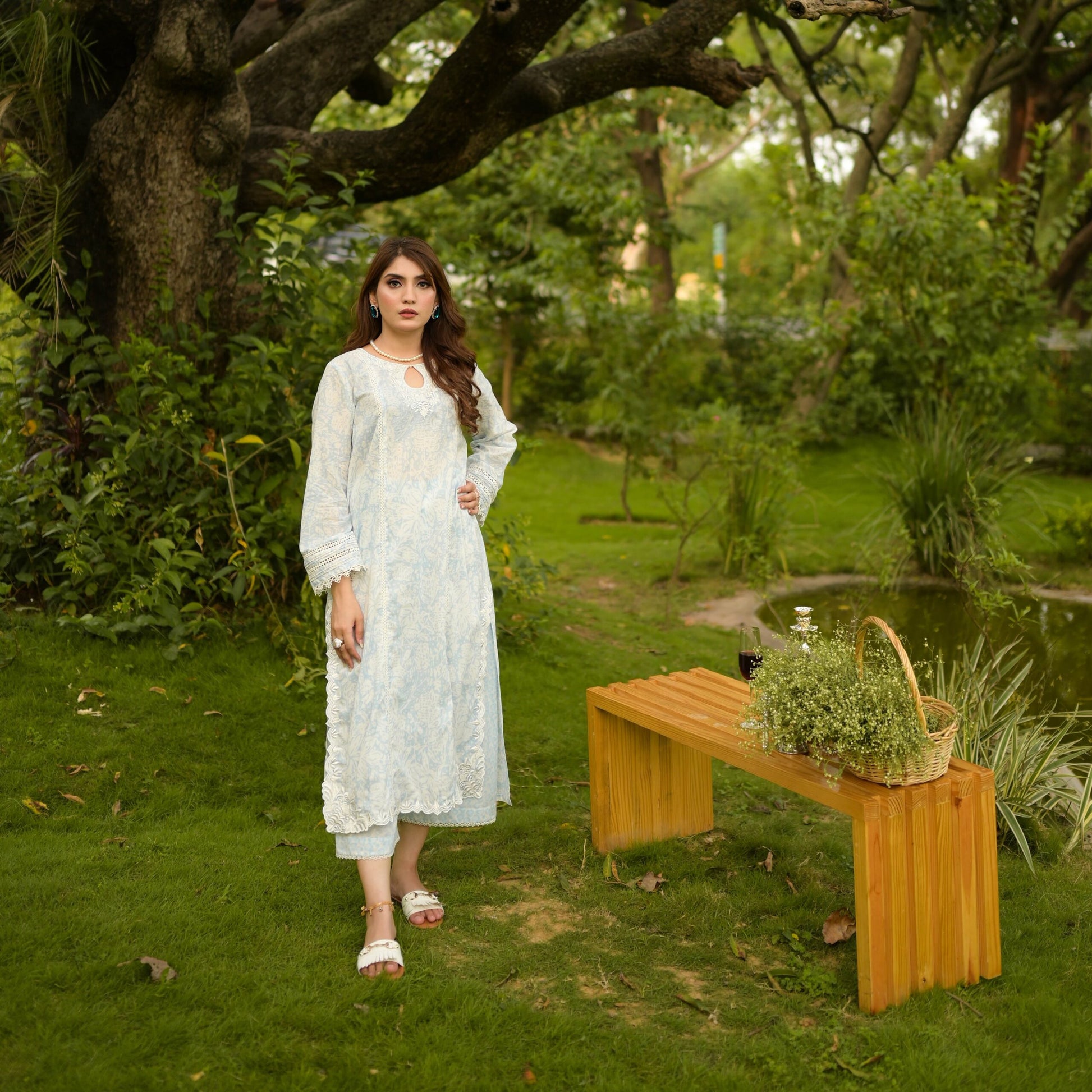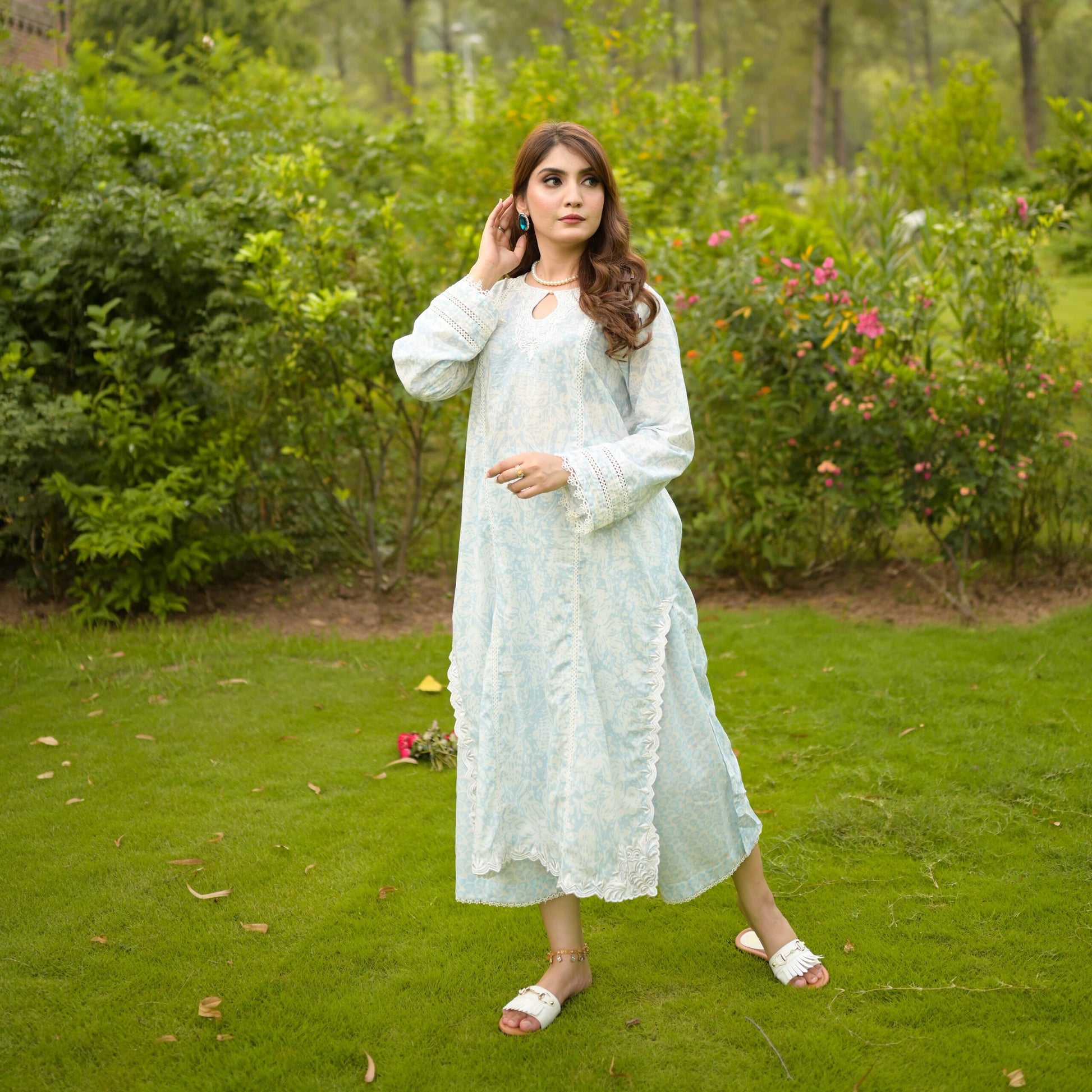 An elegant printed shirt with side panels beautifully adorned with floral embroidery at the front with laces and pearl detailing on neck and sleeves along with straight fit pants.