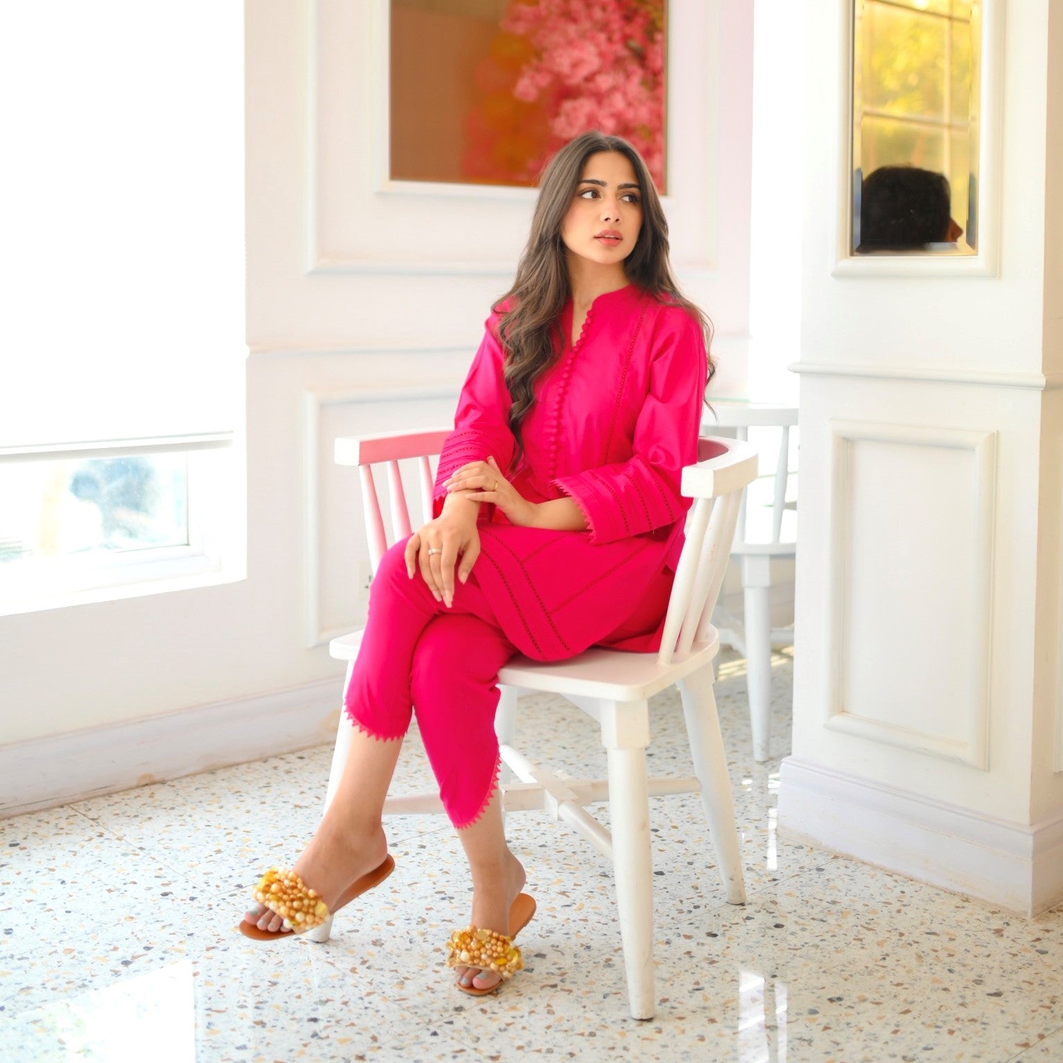 An elegant cords crafted in a chic silhouette shirt with famine lace details on neckline and sleeves paired with paan shalwar.