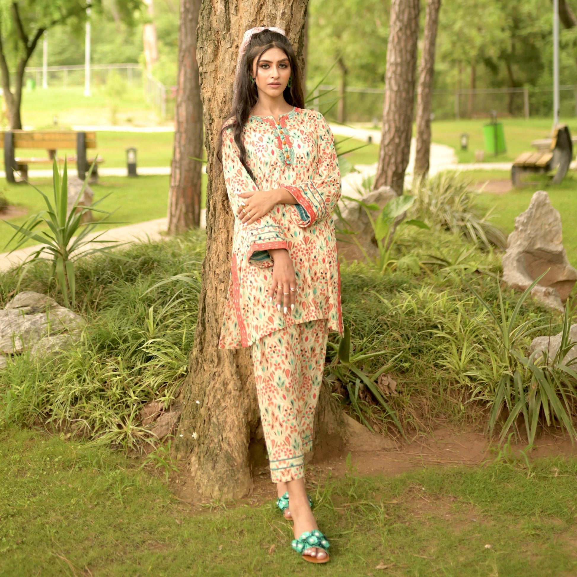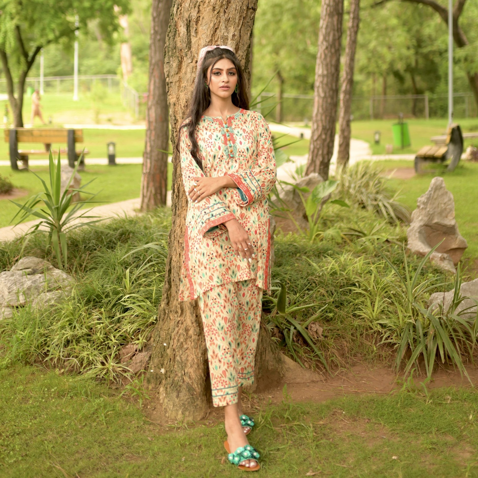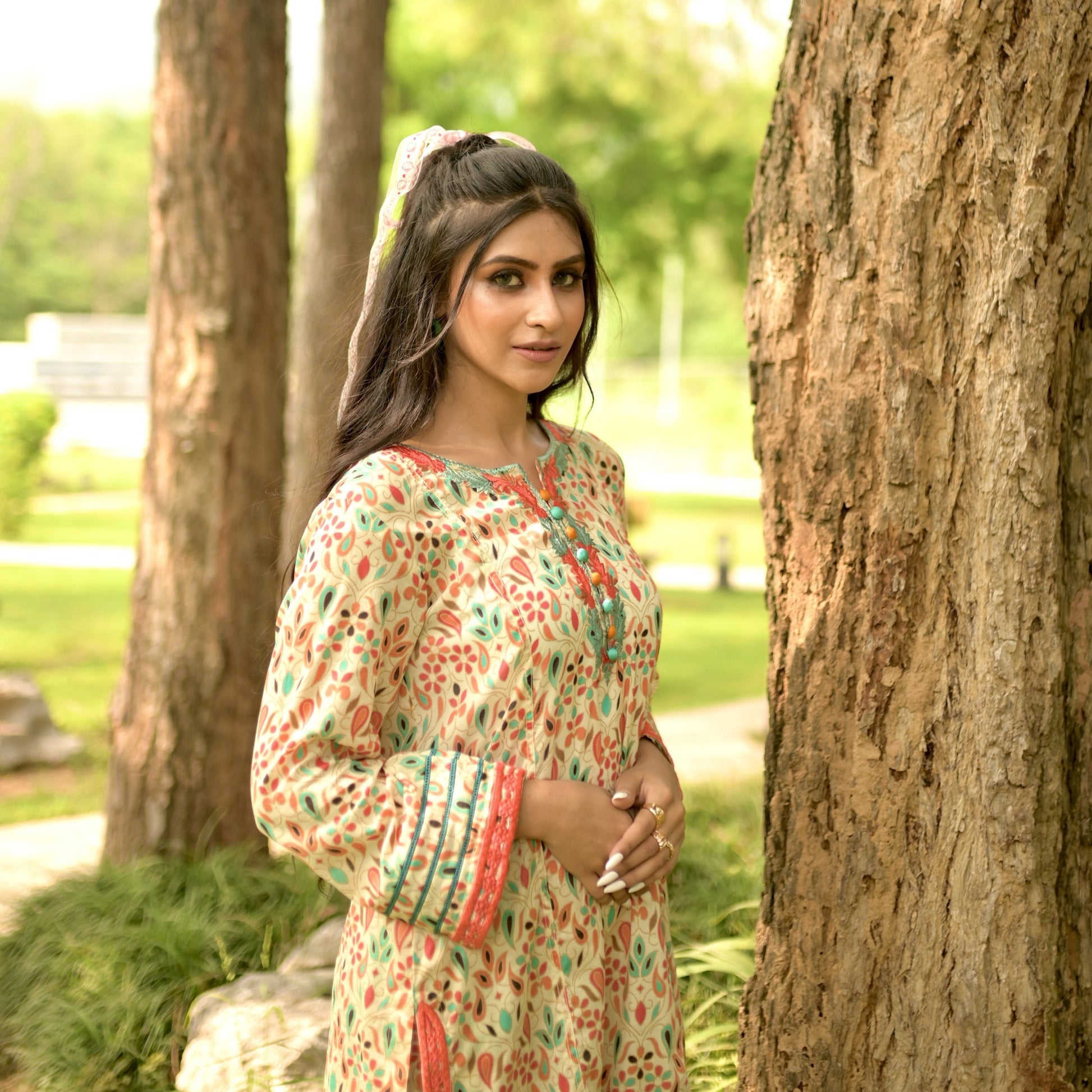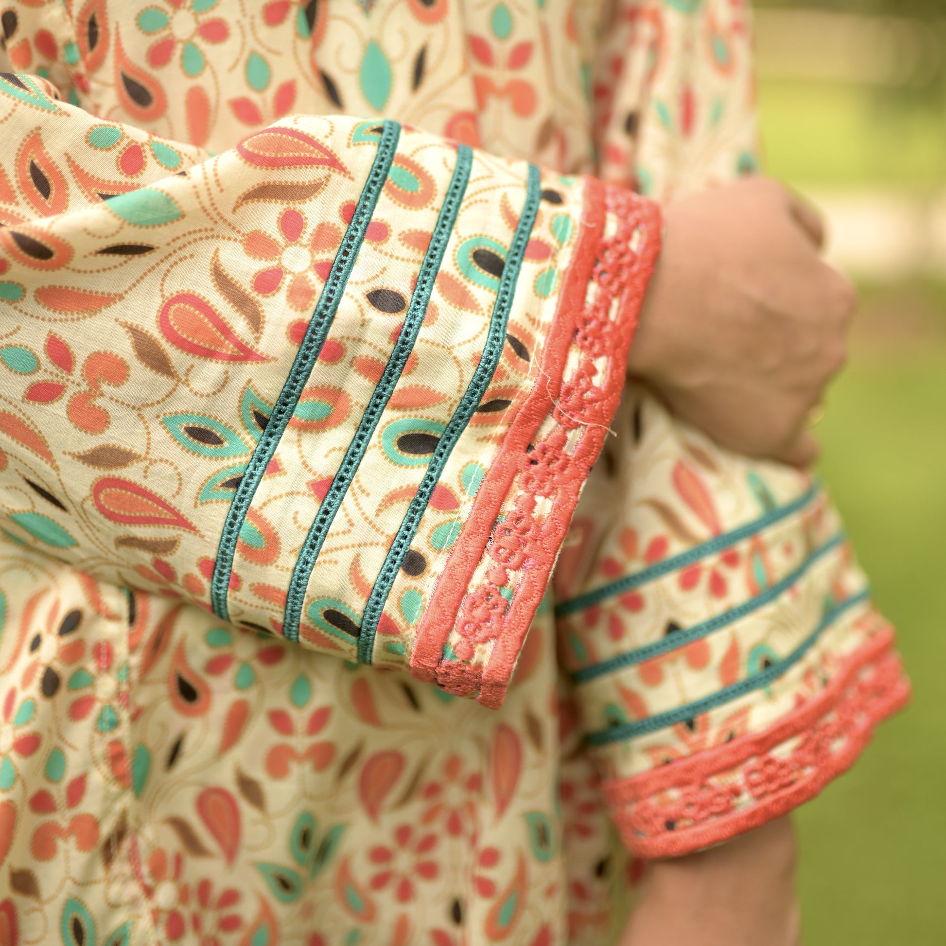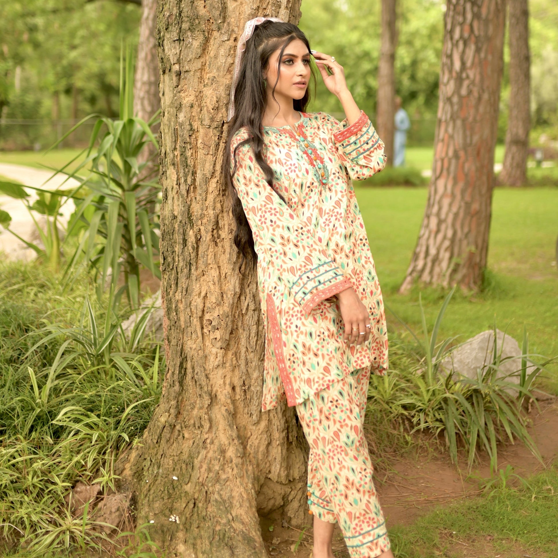 A panelled long shirt unfolds, decked in resplendent allure and graced by the presence of intricate printed hues of colours with embroidered neckline and hem. Sleeves are cuffed which elevate overall look, along with culottes printed pants which embrace the profound beauty of nature, meticulously interwoven into every meticulously crafted stitch.