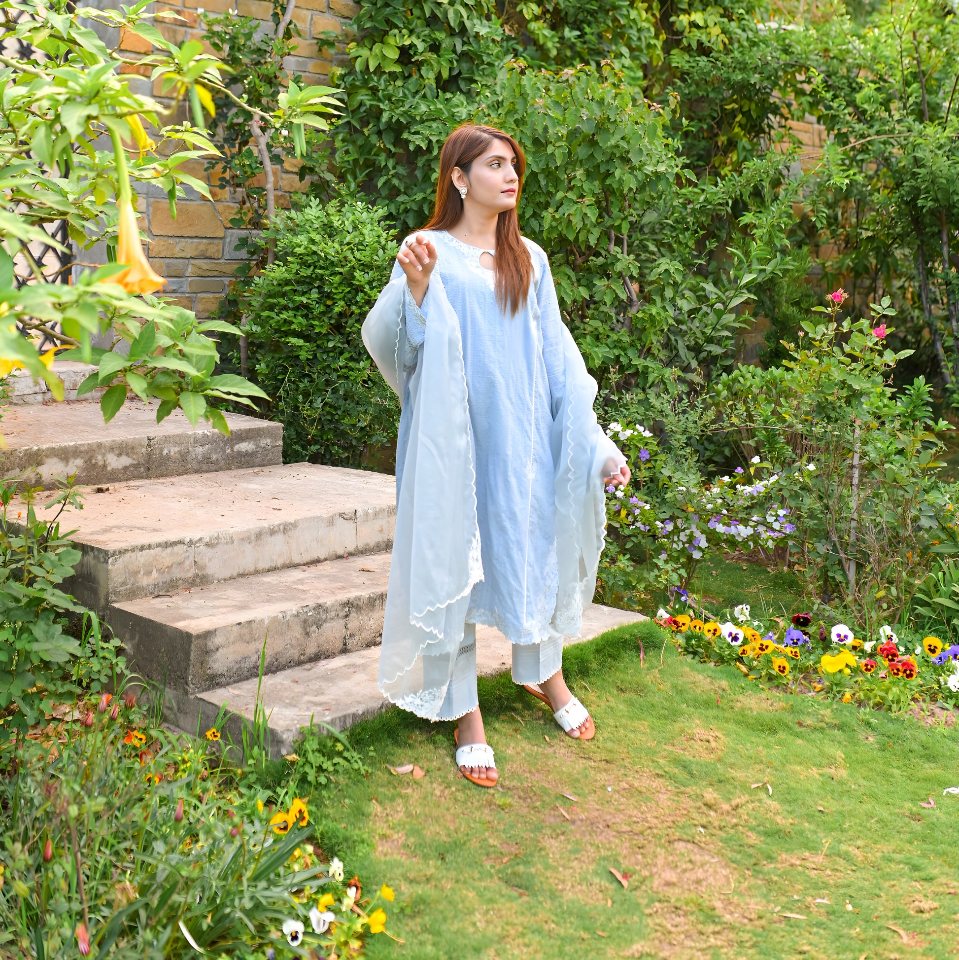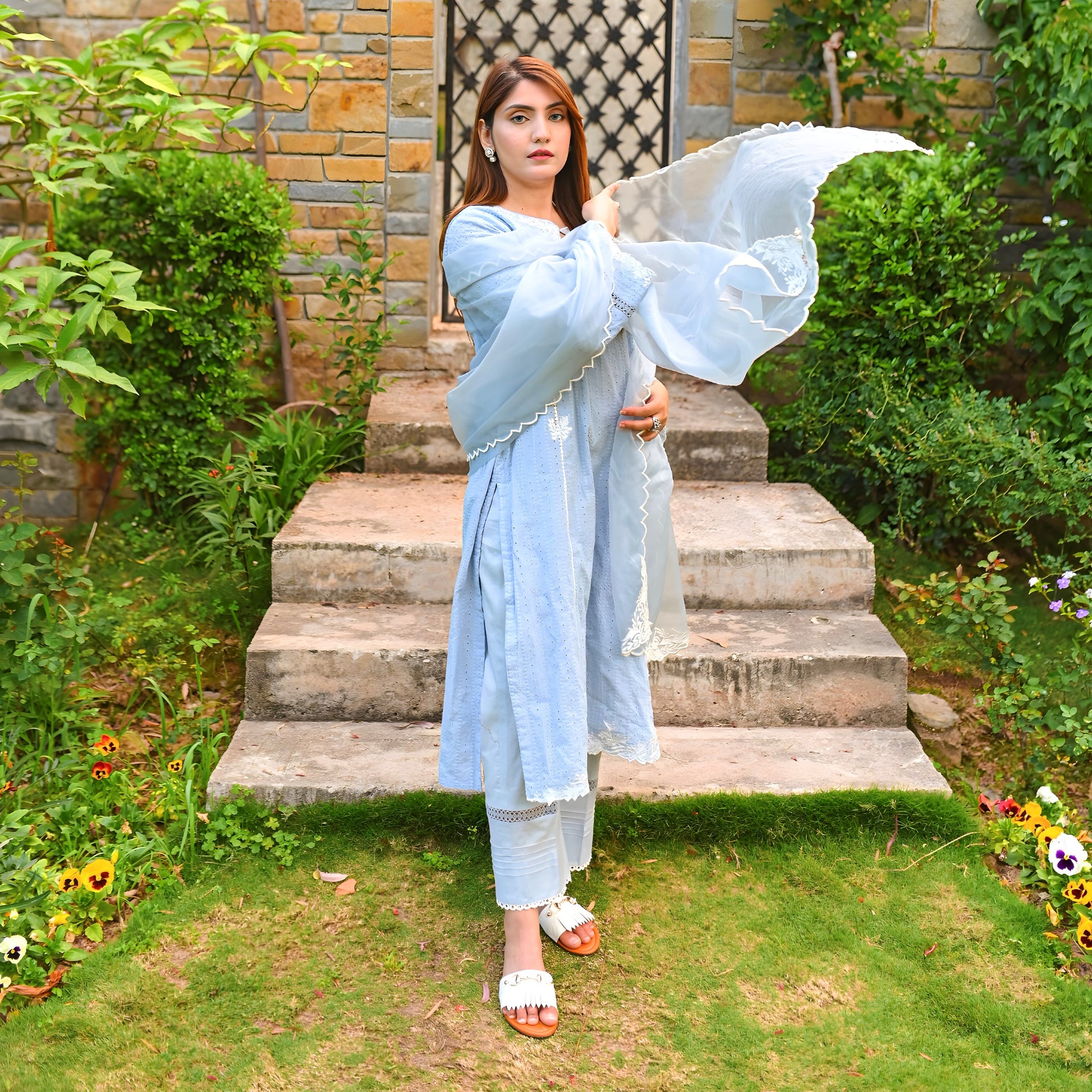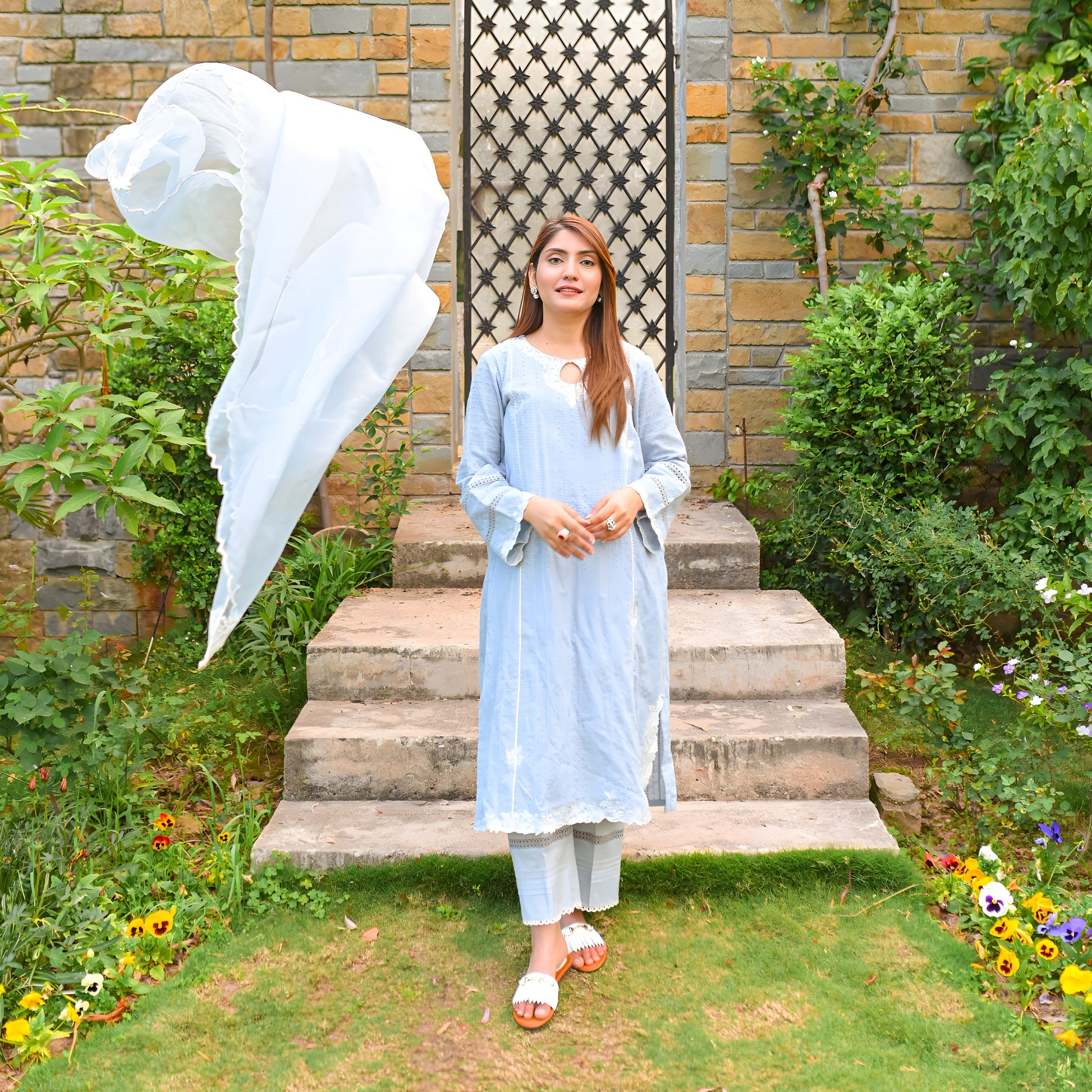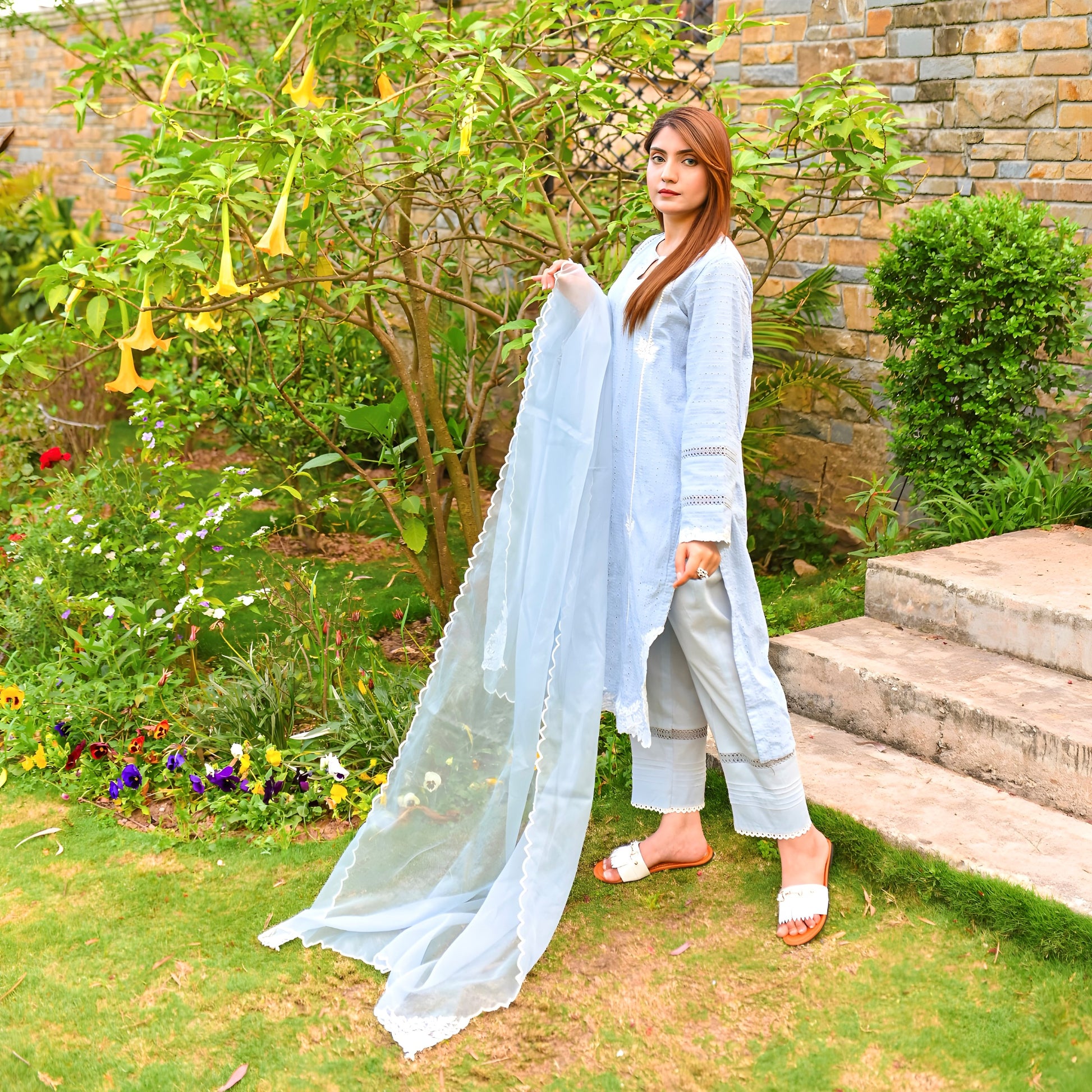 It features an elegant shirt with side panels beautifully adorned with floral embroidery at the front, sleeves and pants with lace and pearl detailing. Paired with a culottes and a gracefully draped embroidered duppta.