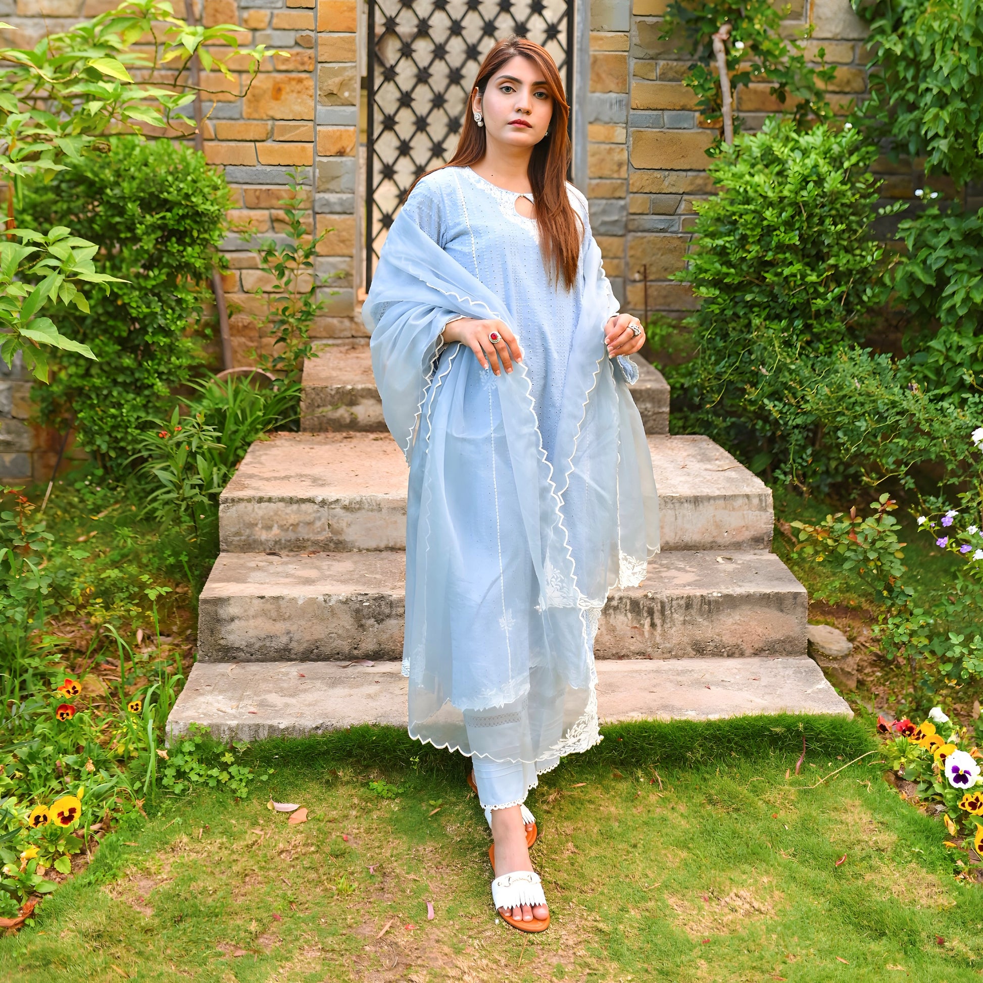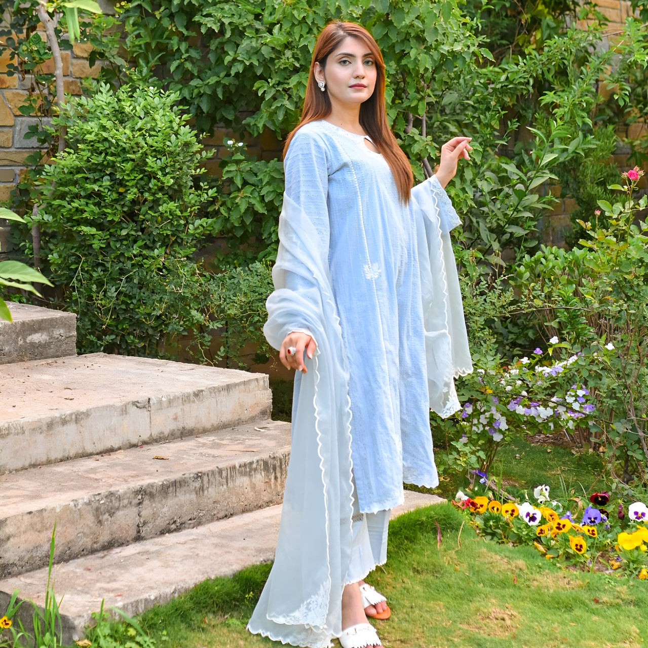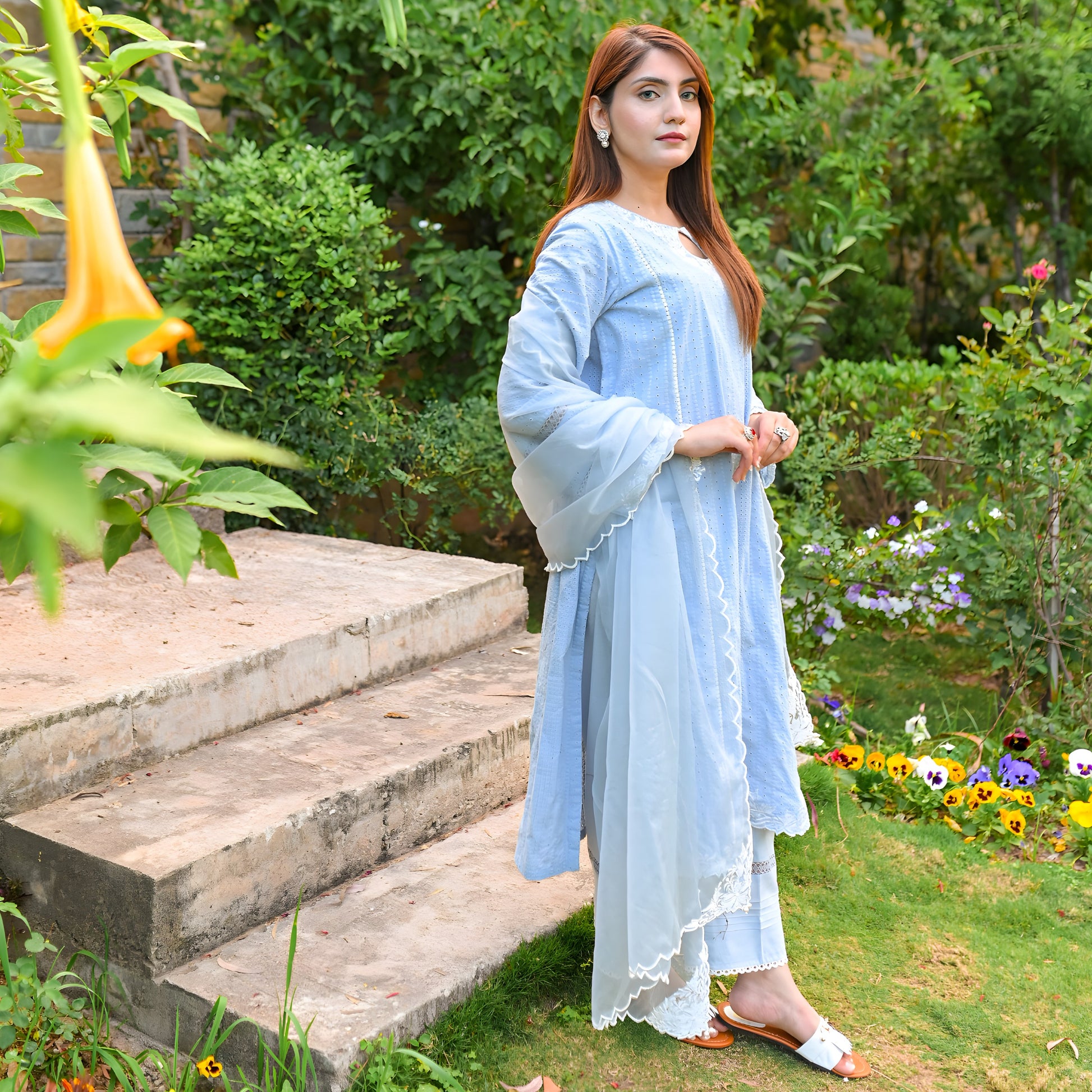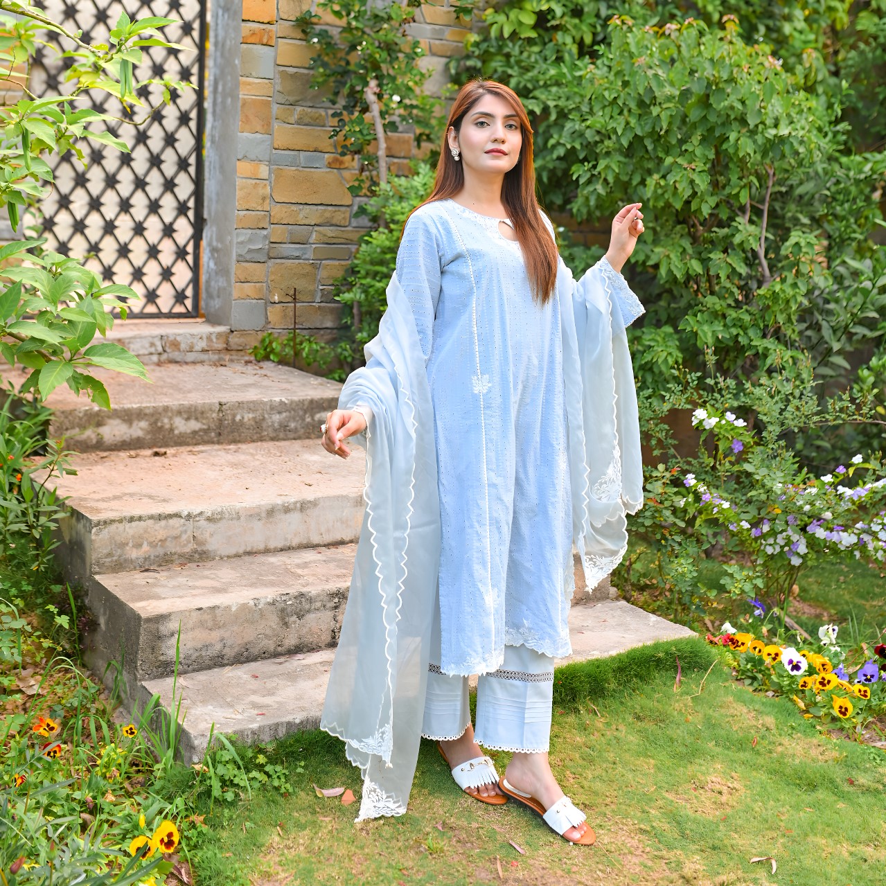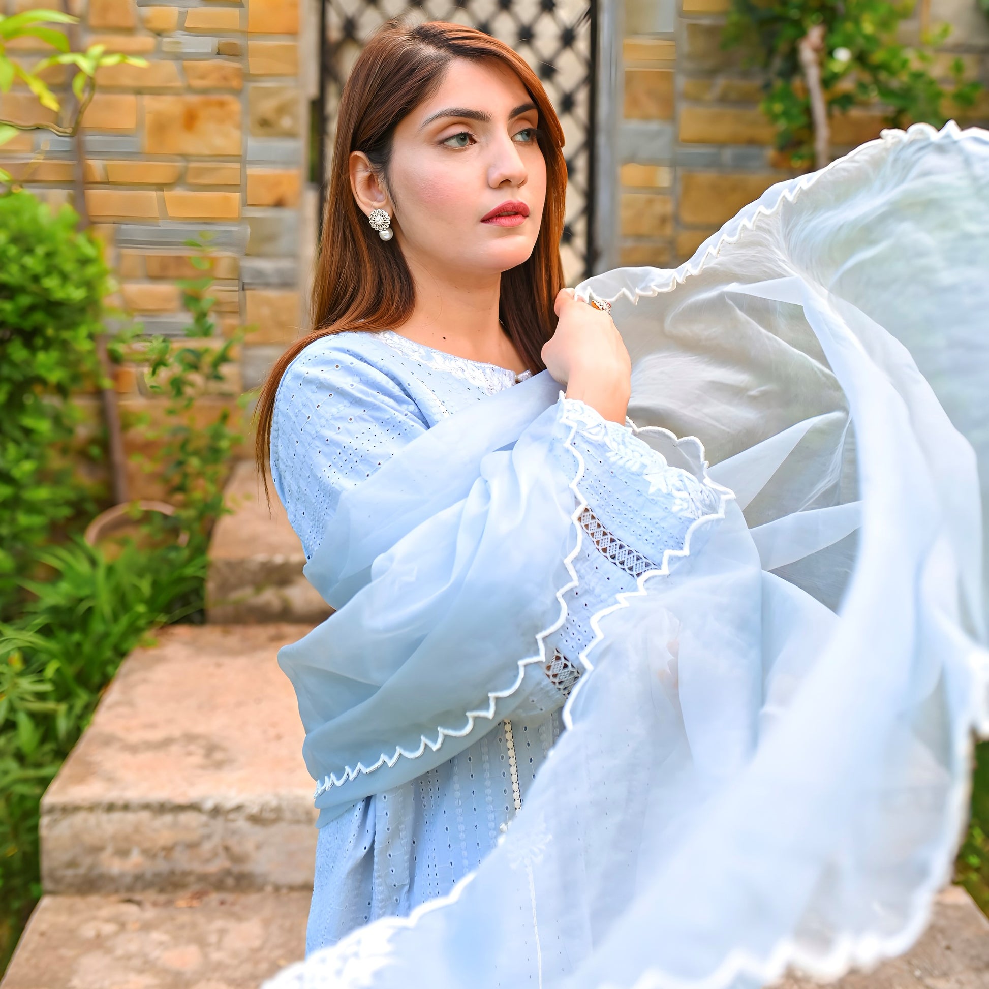 It features an elegant shirt with side panels beautifully adorned with floral embroidery at the front, sleeves and pants with lace and pearl detailing. Paired with a culottes and a gracefully draped embroidered duppta.