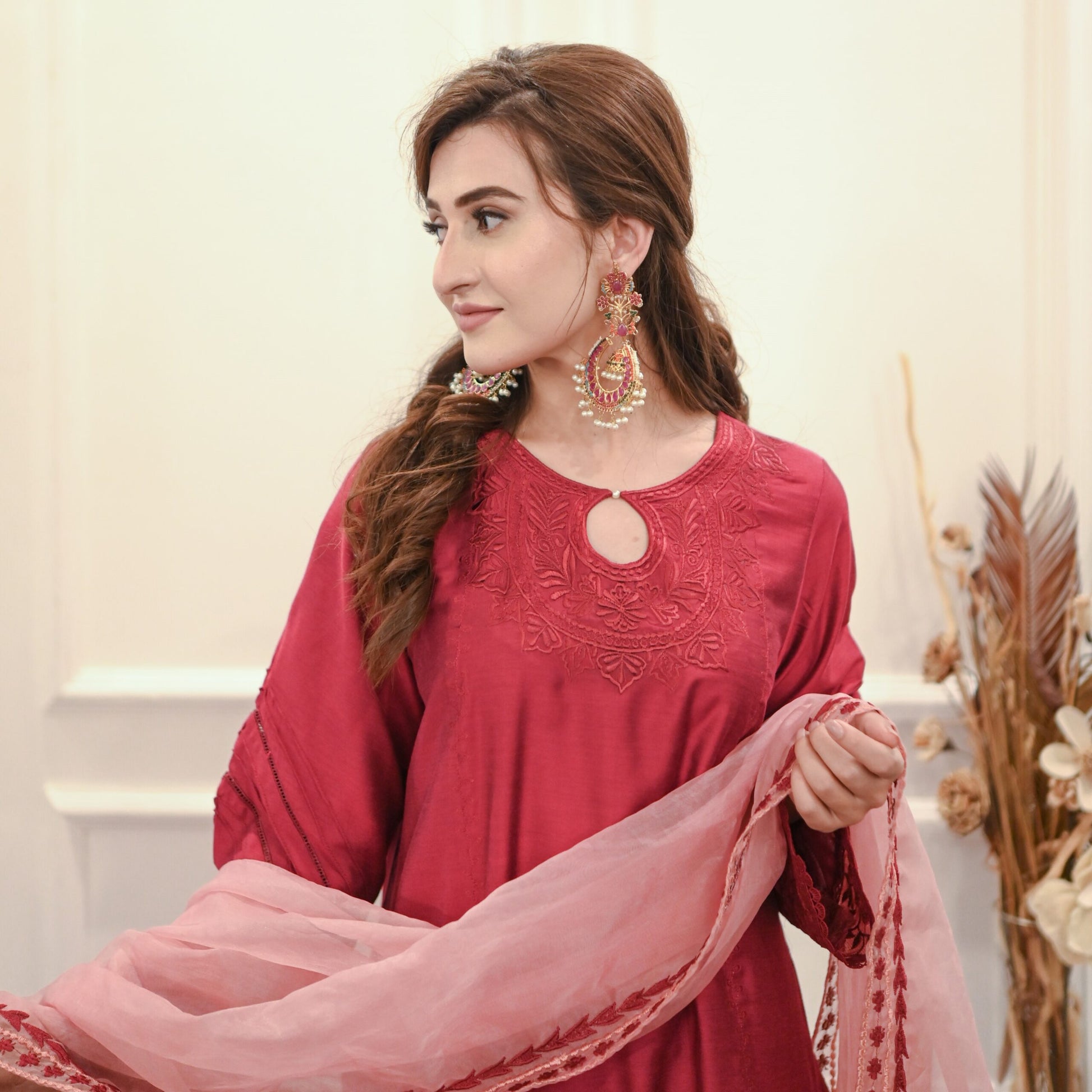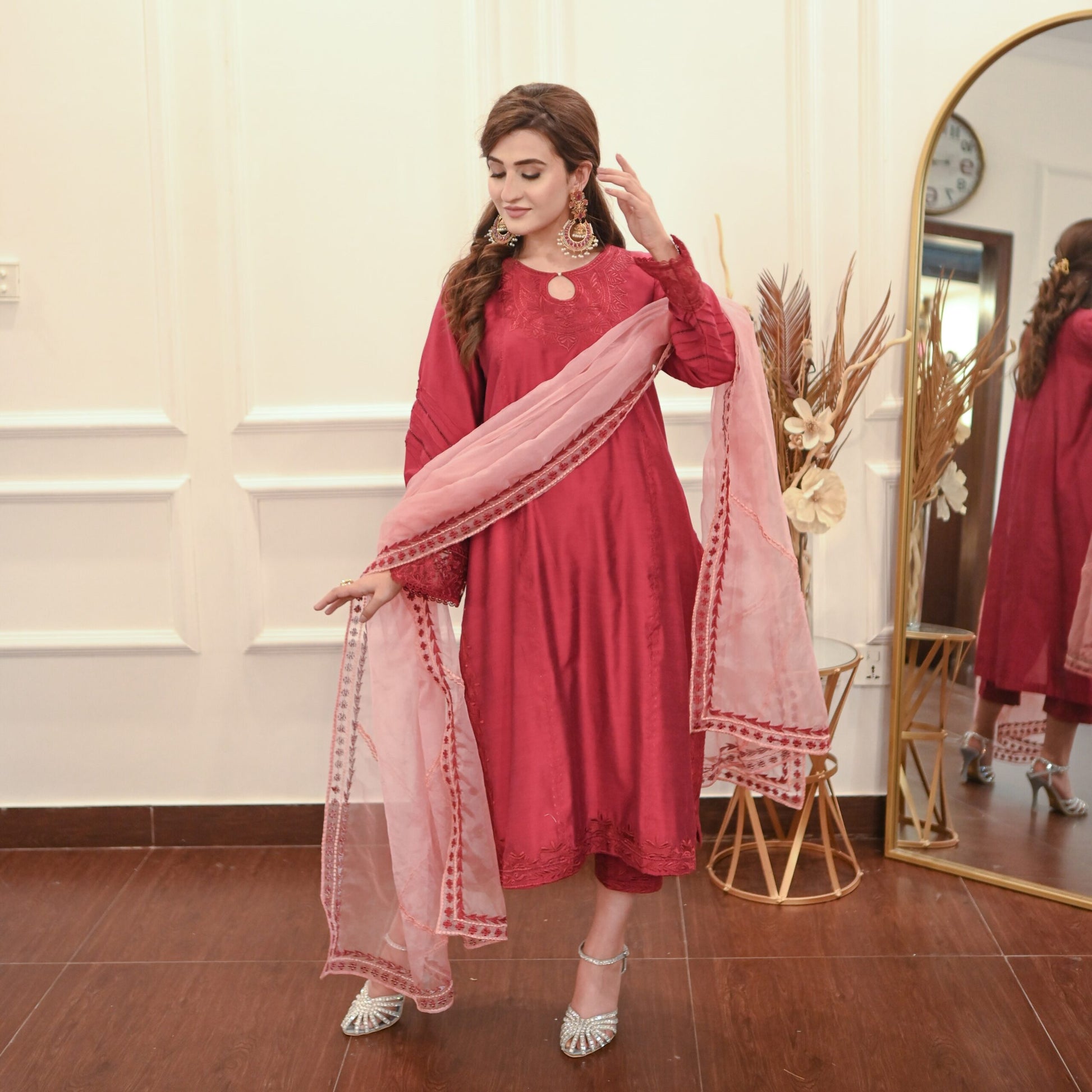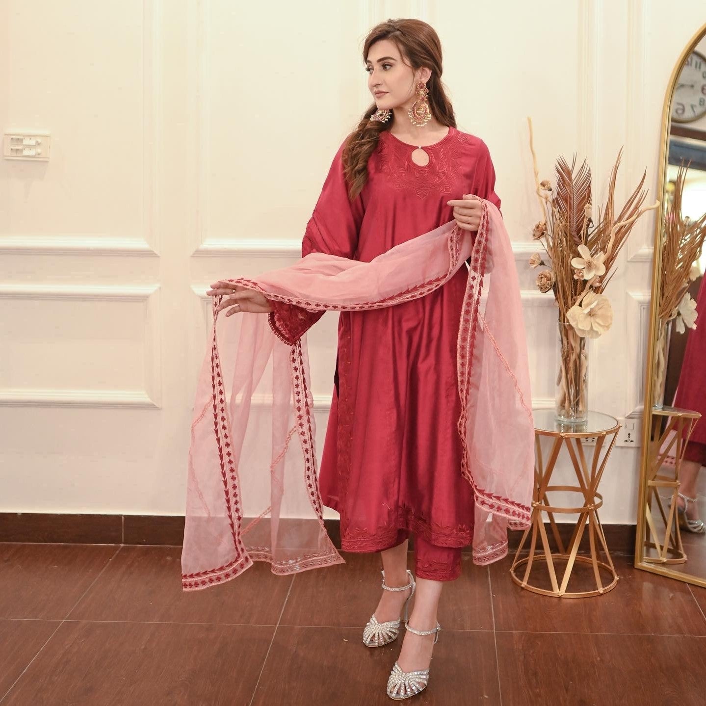 Expressing both intensity and opulence, this stunning viva magenta canvas portrays a fervent longing to indulge in a captivating floral embroidery design, enhanced with bold kantha stitches and a floral pattern along the hem, neck and sleeve. With culottes embroidery pants . The pure organza embroidered duppta, featuring satin stitches and Parsi Gara embroidered four sided borders with contrasting boxes on all both the sides, is a valuable and stylish addition to your wardrobe.