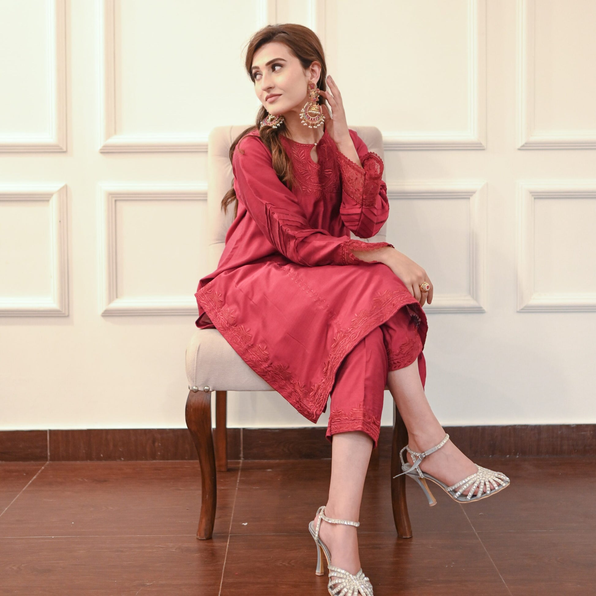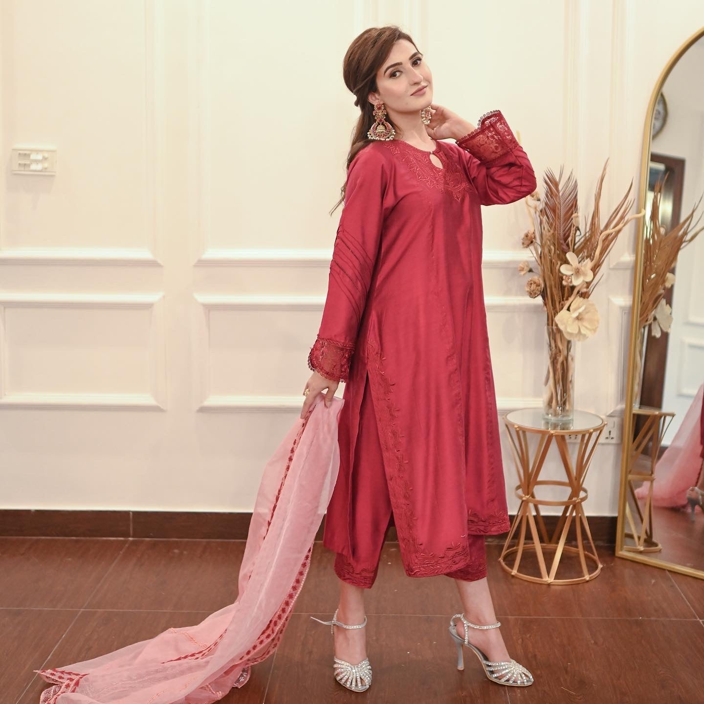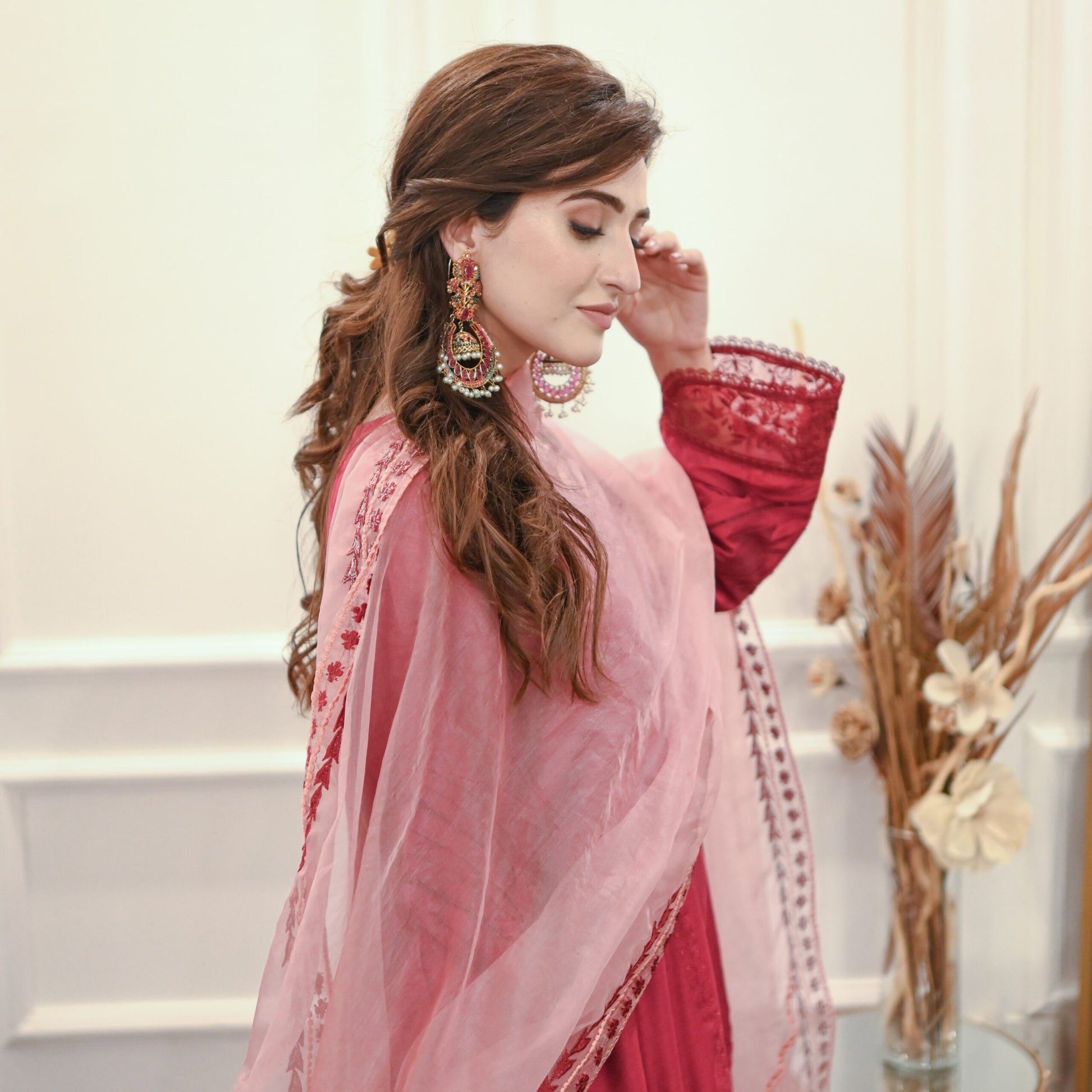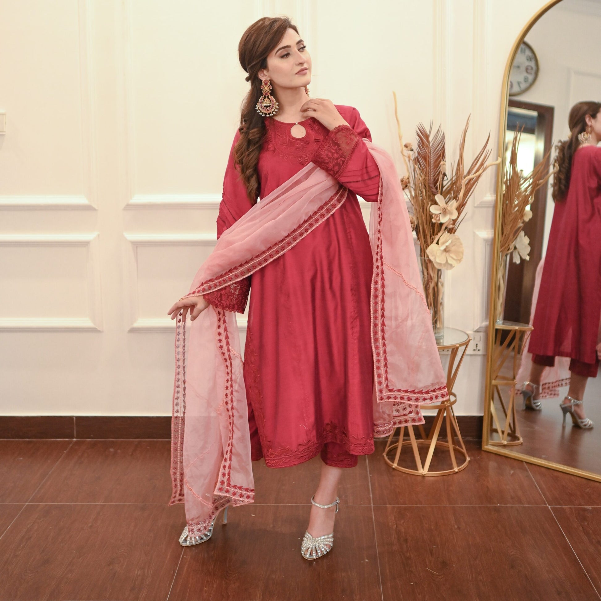 Expressing both intensity and opulence, this stunning viva magenta canvas portrays a fervent longing to indulge in a captivating floral embroidery design, enhanced with bold kantha stitches and a floral pattern along the hem, neck and sleeve. With culottes embroidery pants . The pure organza embroidered duppta, featuring satin stitches and Parsi Gara embroidered four sided borders with contrasting boxes on all both the sides, is a valuable and stylish addition to your wardrobe.