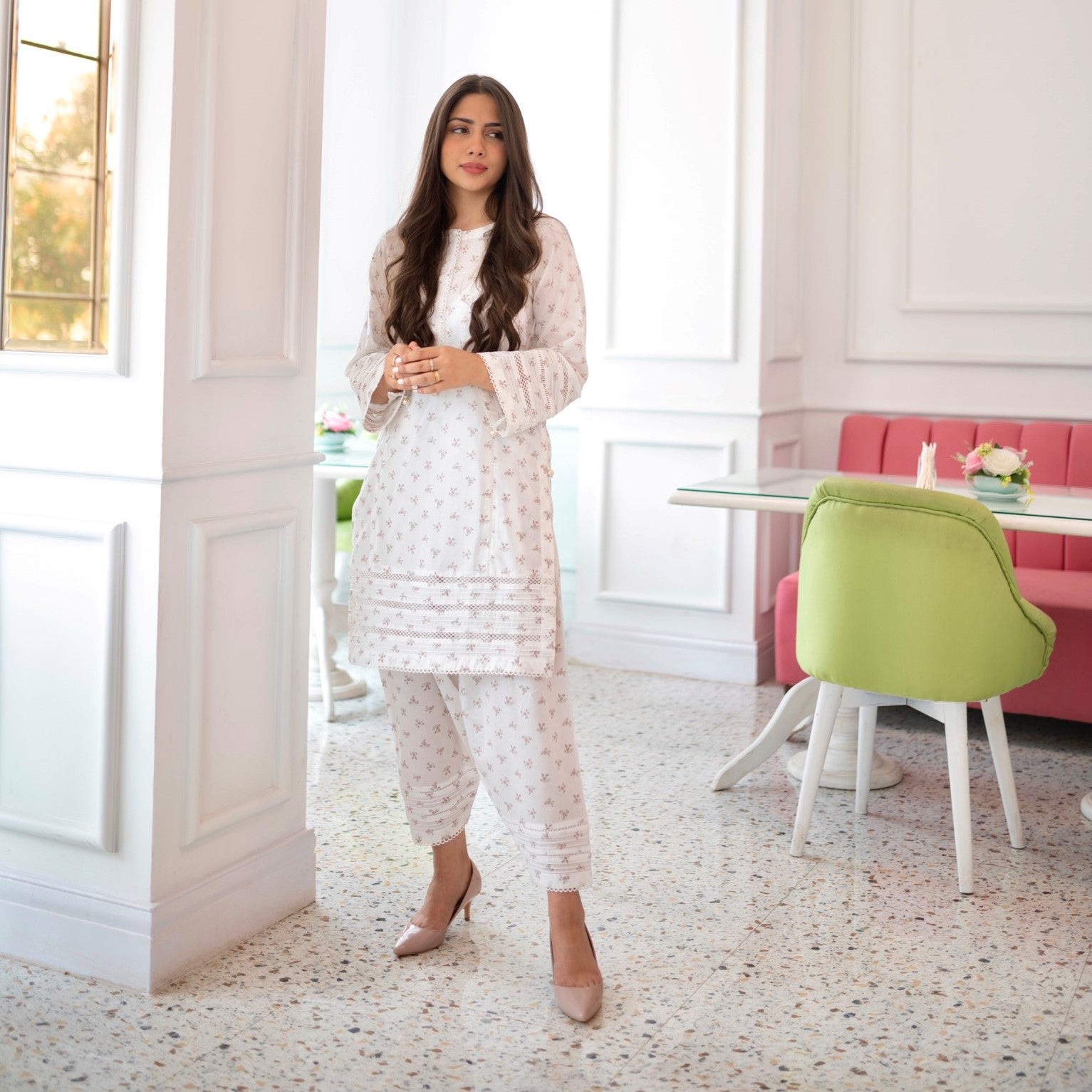 A graceful printed cords crafted in a chic silhouette shirt with famine laces and pearl detailing on neckline and sleeves paired with straight shalwar.