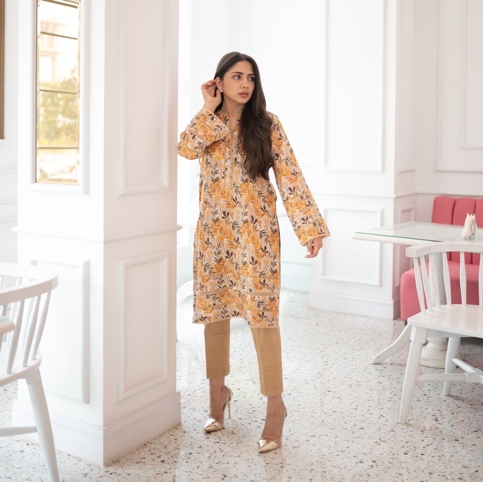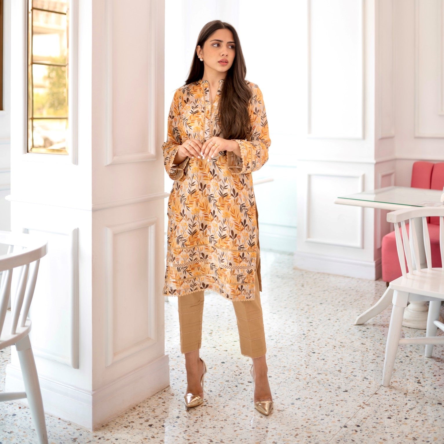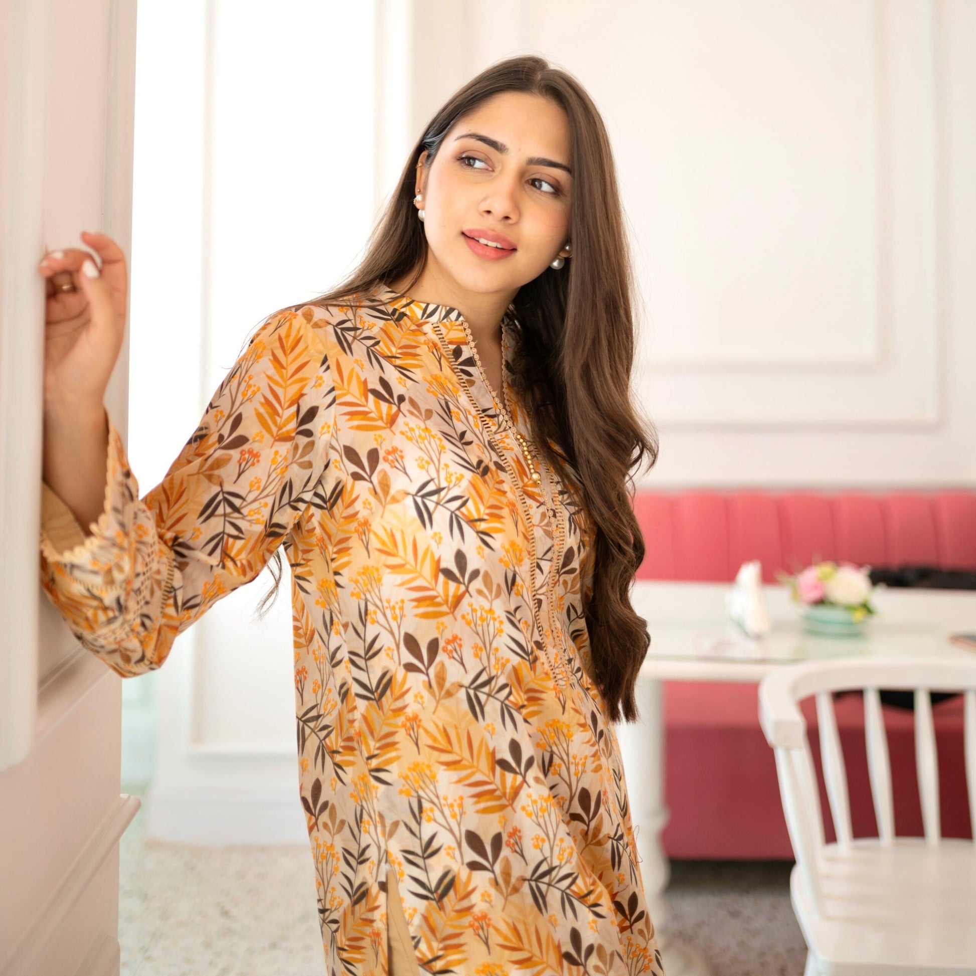 Printed chic silhouette shirt with famine laces and pearl detailing on neckline and sleeves paired with straight pants.