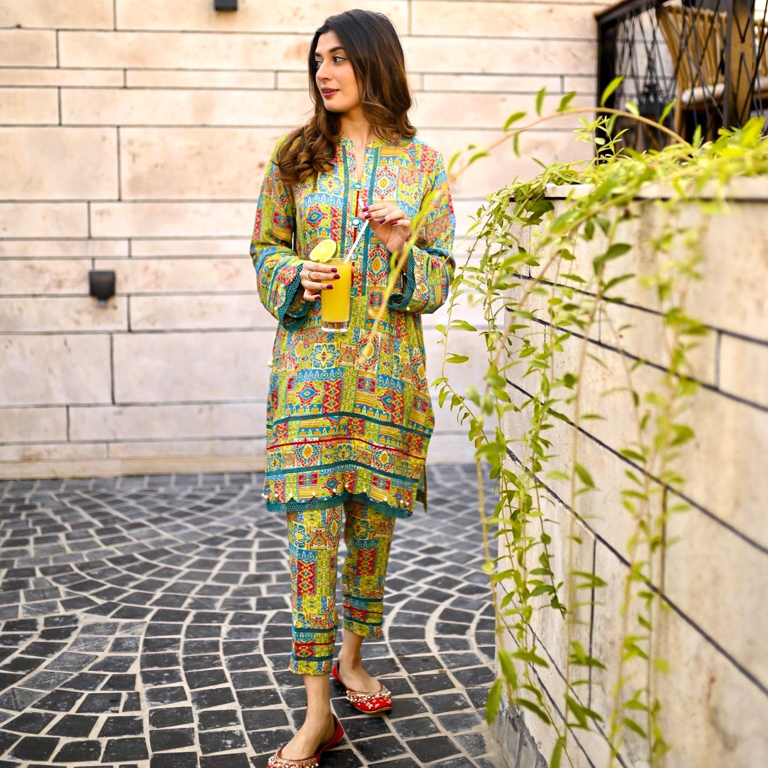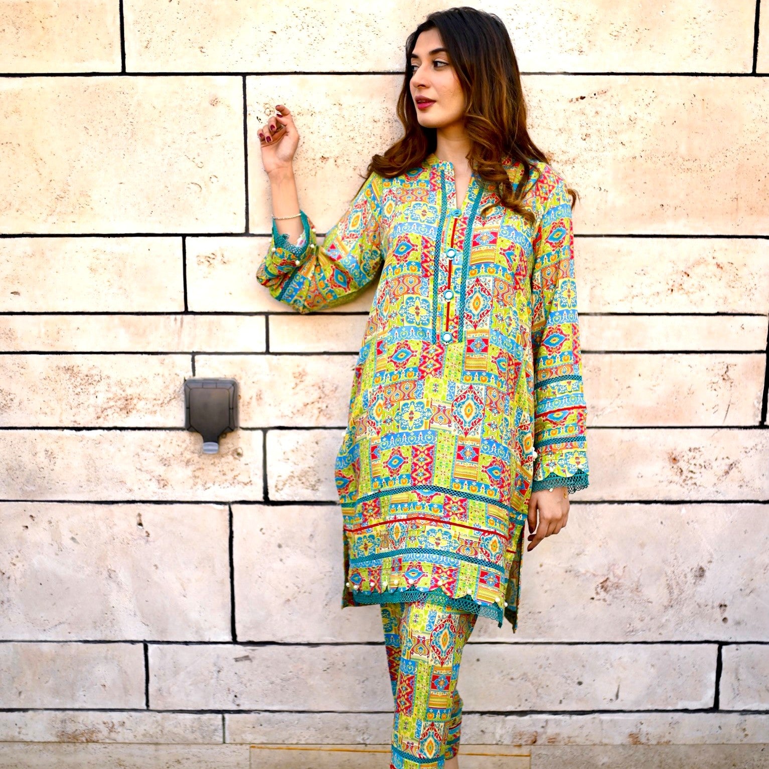 A beautiful printed cords crafted in a chic silhouette shirt with famine laces and mirror details on neckline and sleeves paired with straight pants.