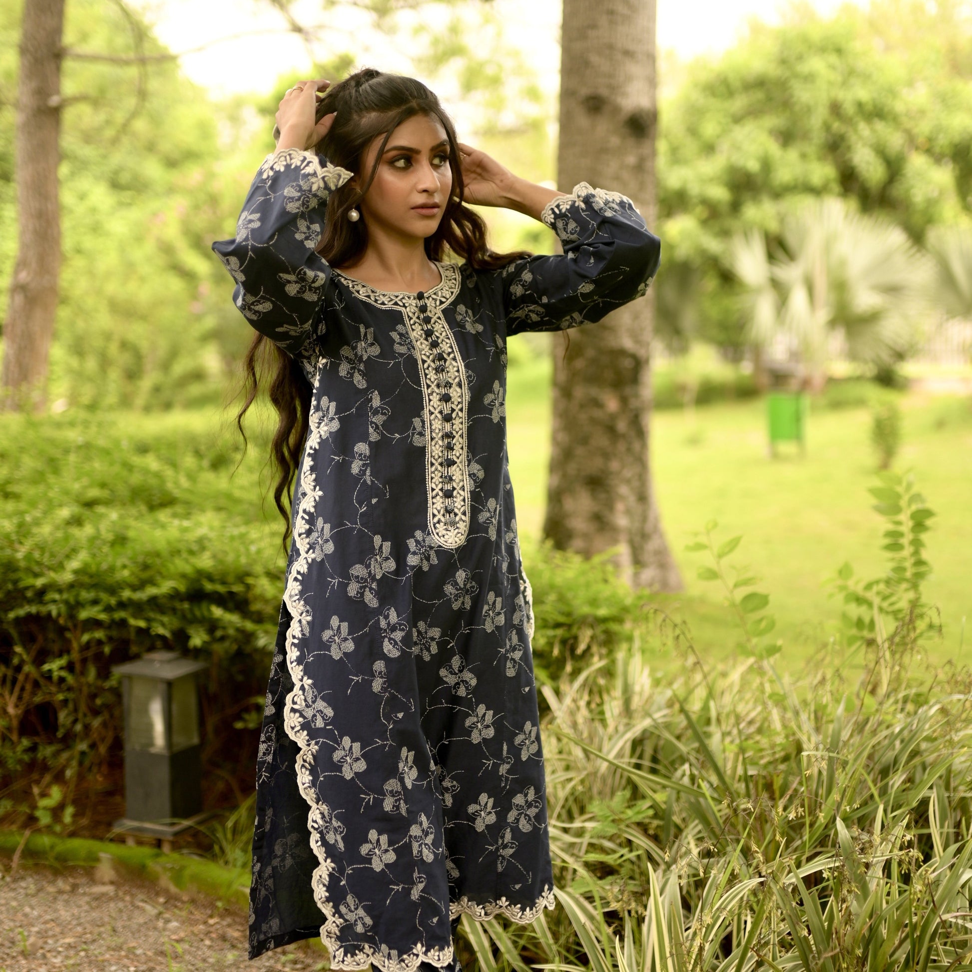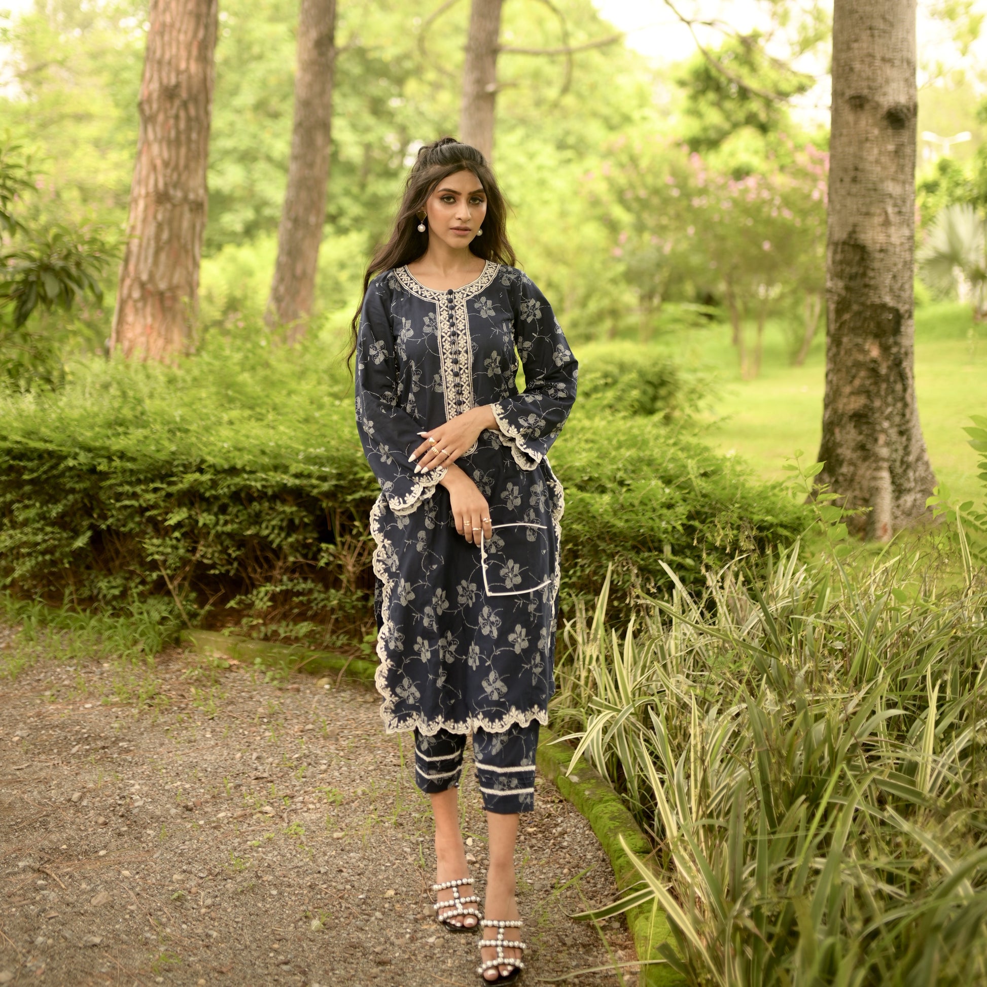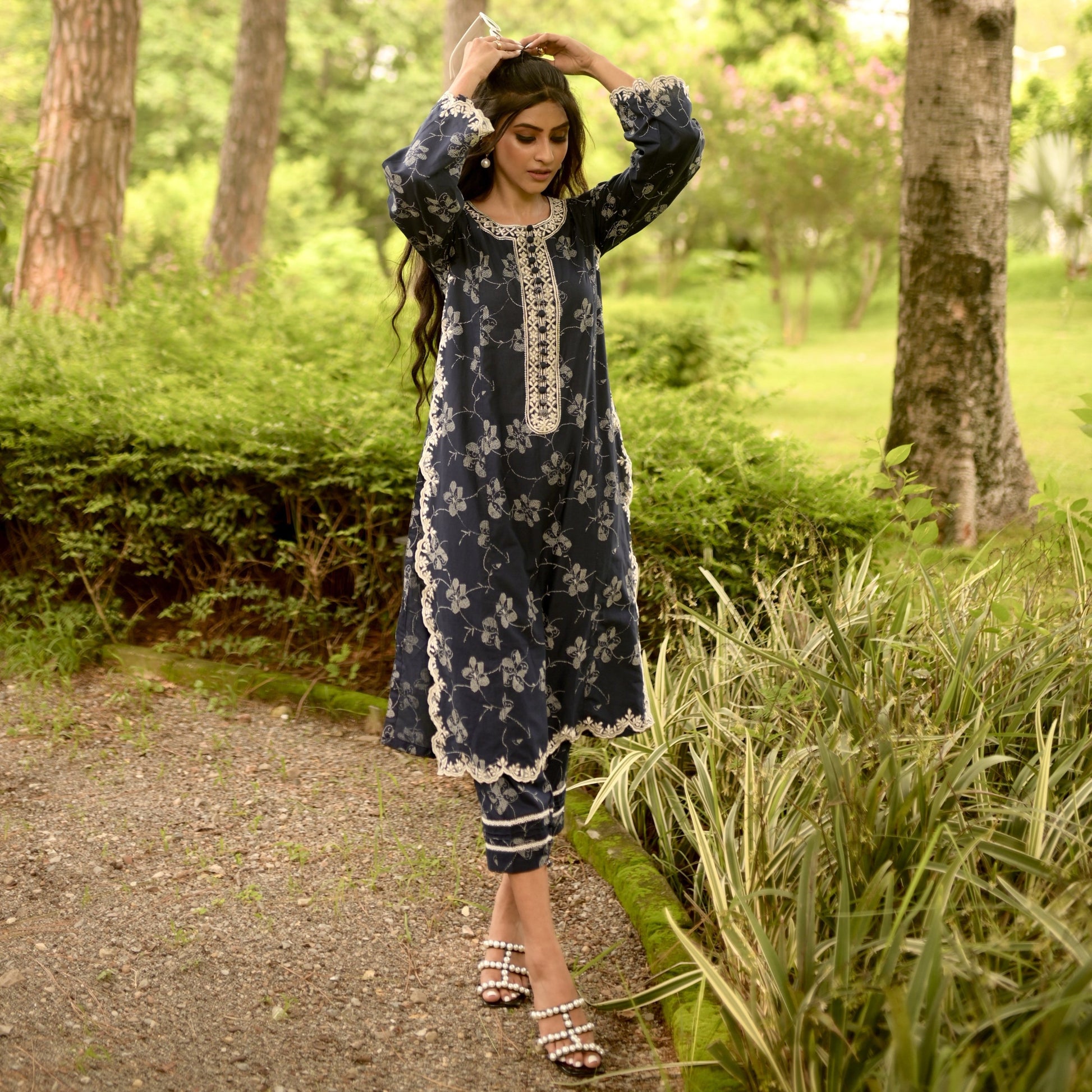 An elegant long printed shirt with side panels beautifully adorned with embroidery and laces. Elegant embroidery detailing on neck sleeves and hem. To complete the ensemble, a same colour straight fit pants is introduced, adding a touch of sophistication and refinement.