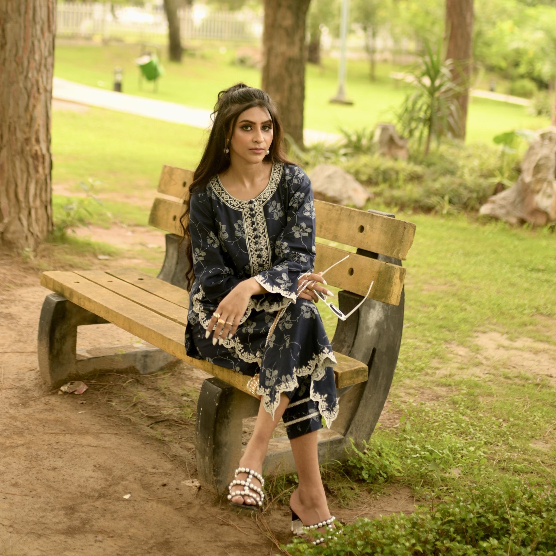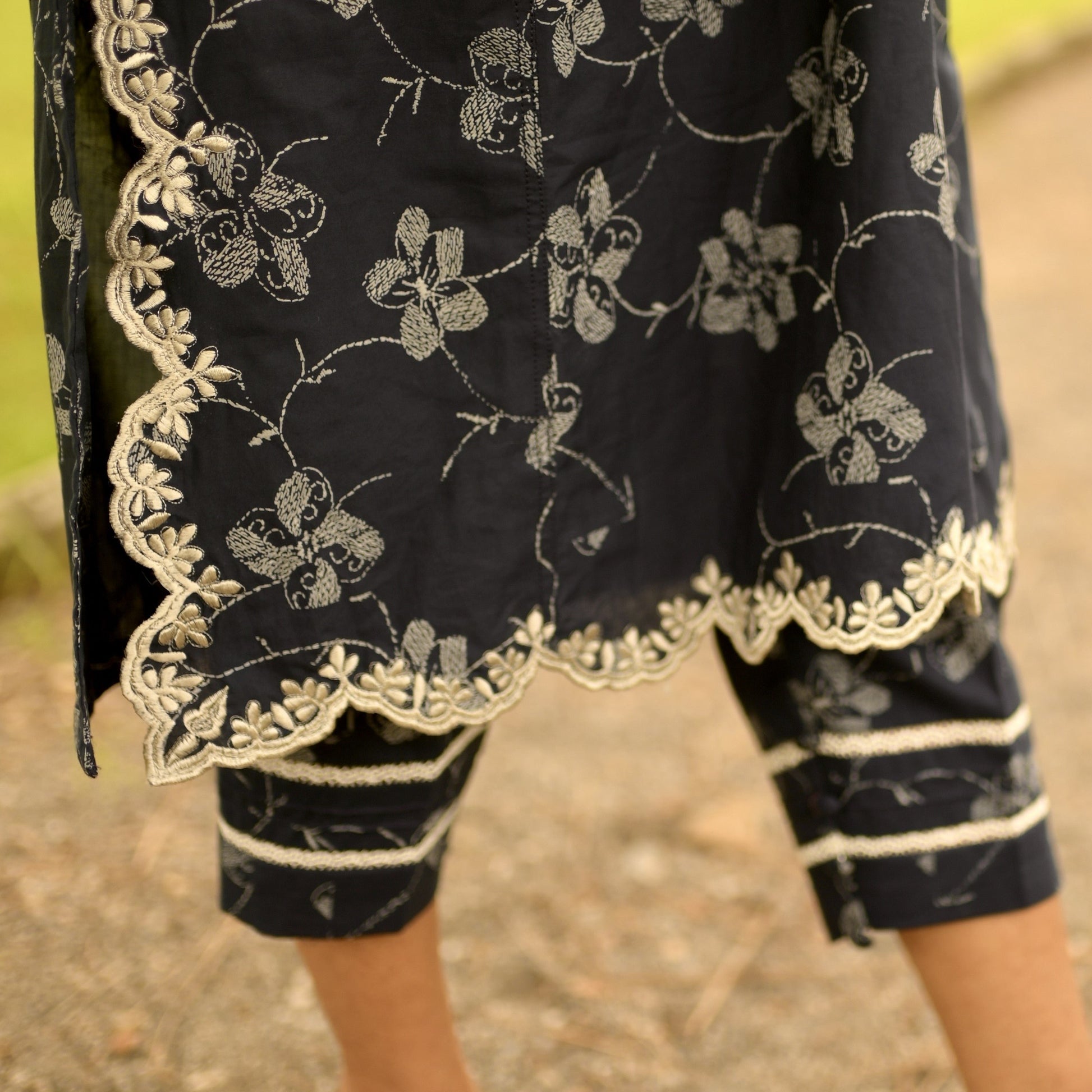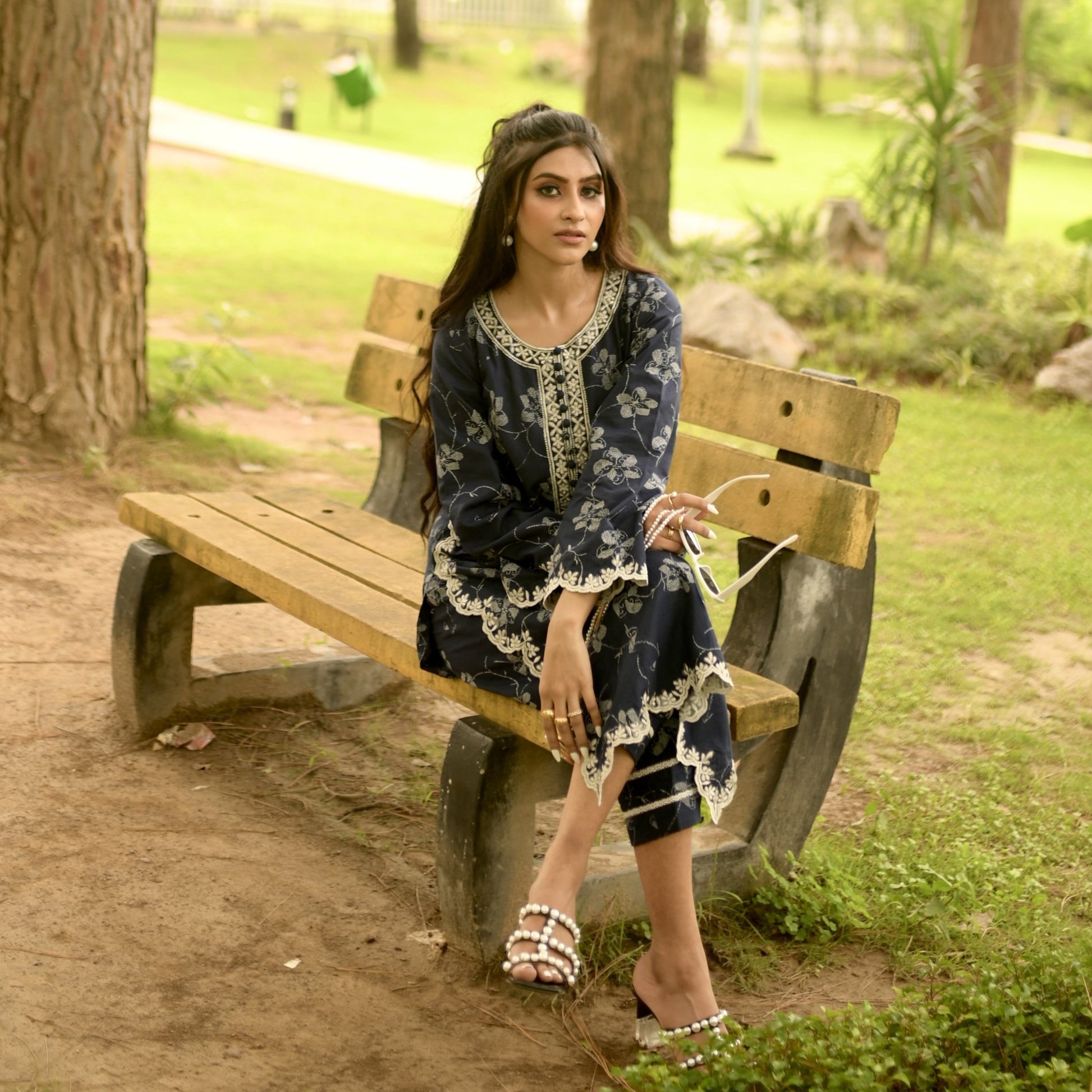 An elegant long printed shirt with side panels beautifully adorned with embroidery and laces. Elegant embroidery detailing on neck sleeves and hem. To complete the ensemble, a same colour straight fit pants is introduced, adding a touch of sophistication and refinement.
