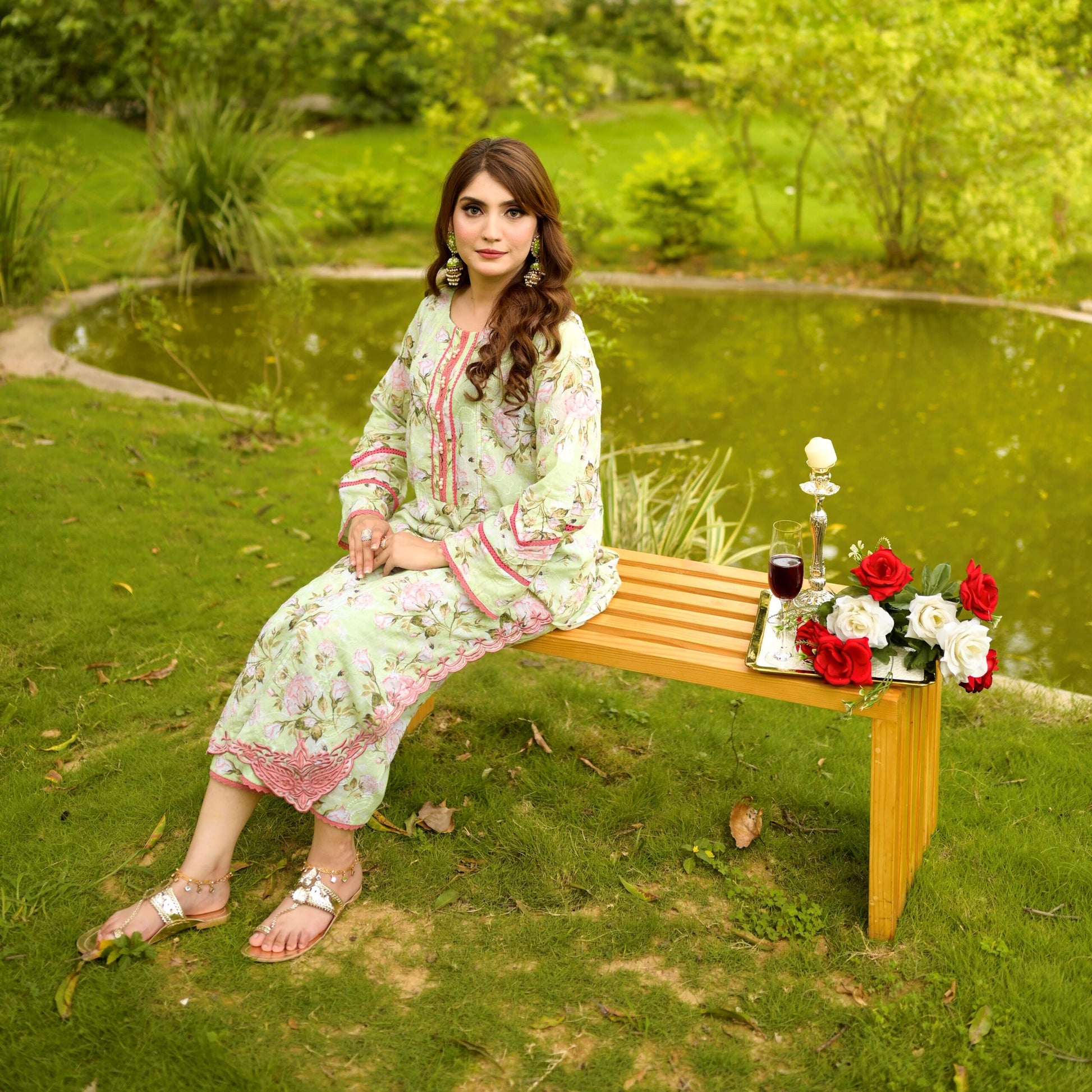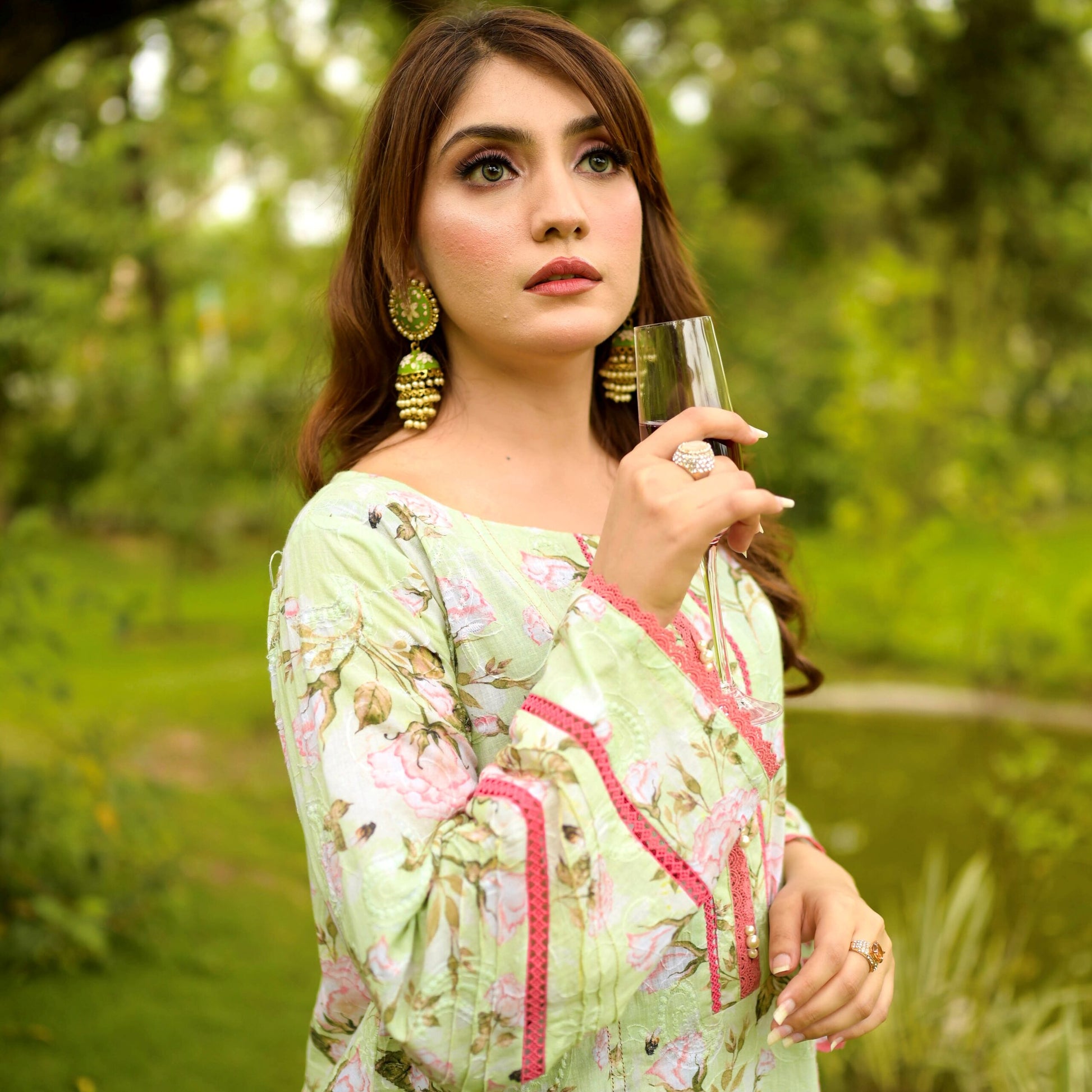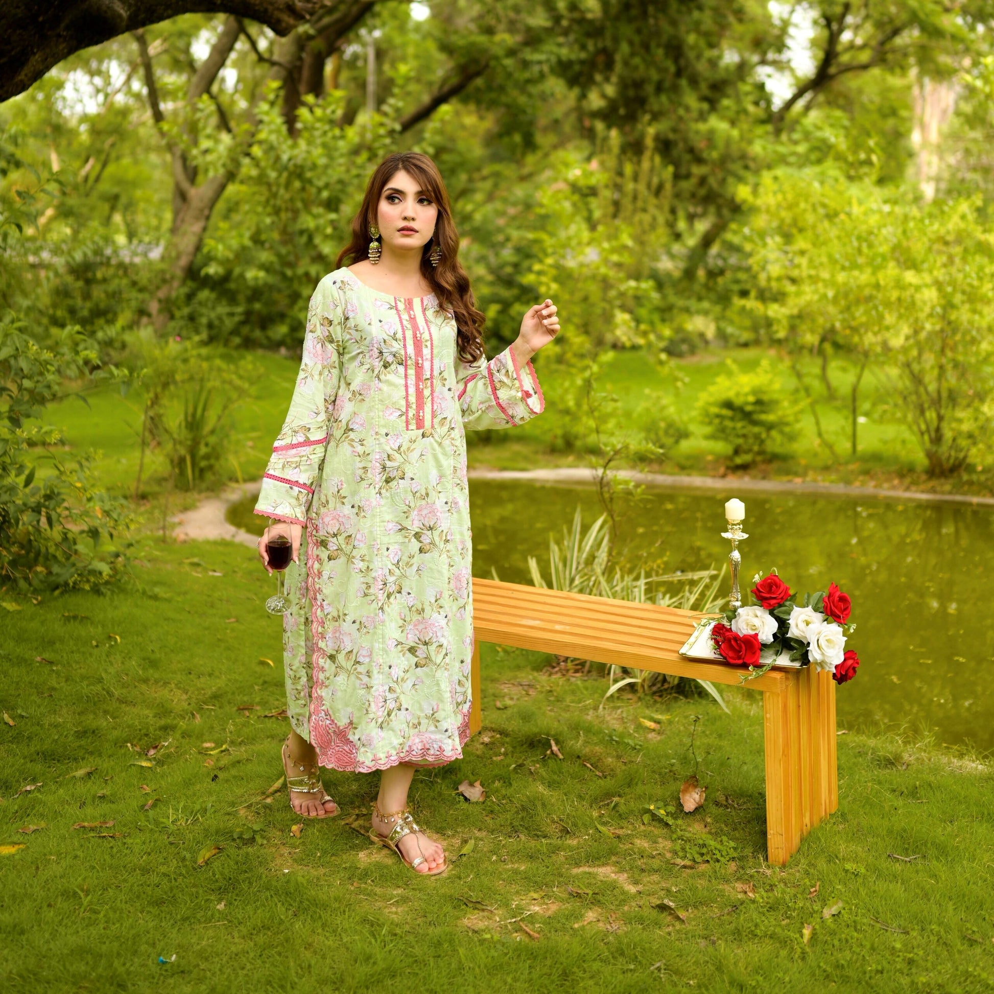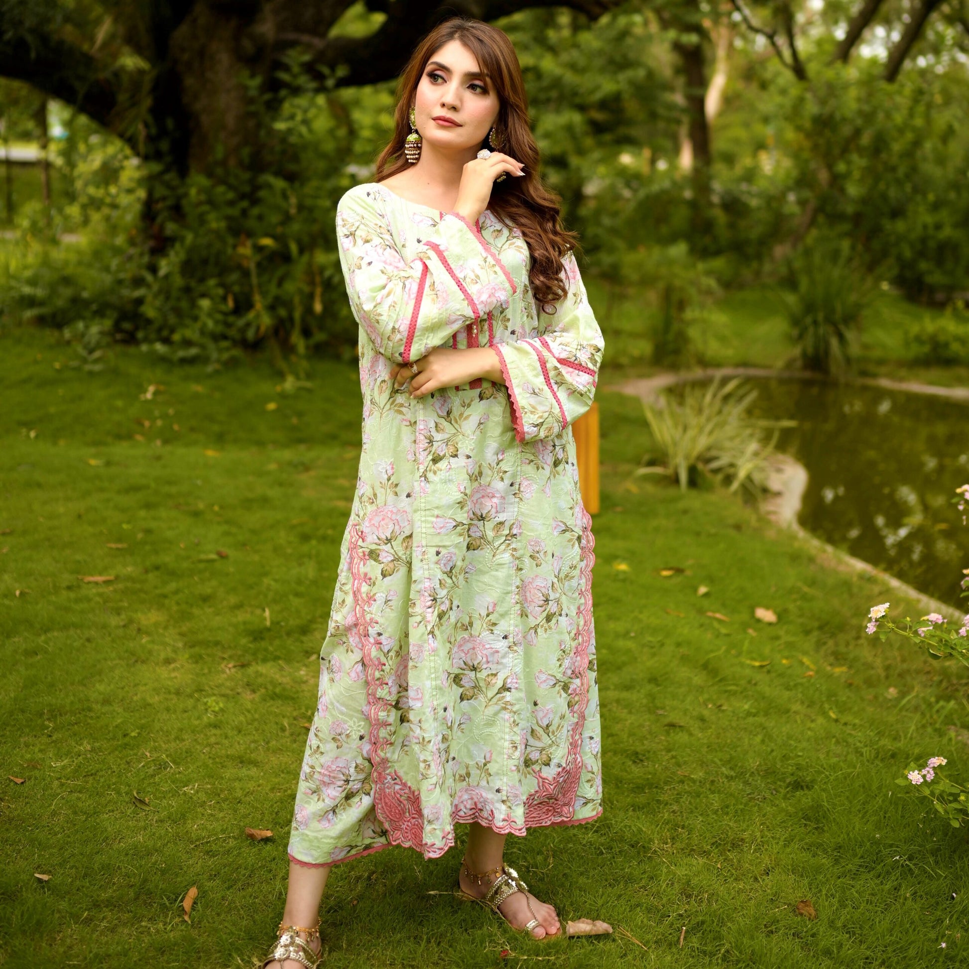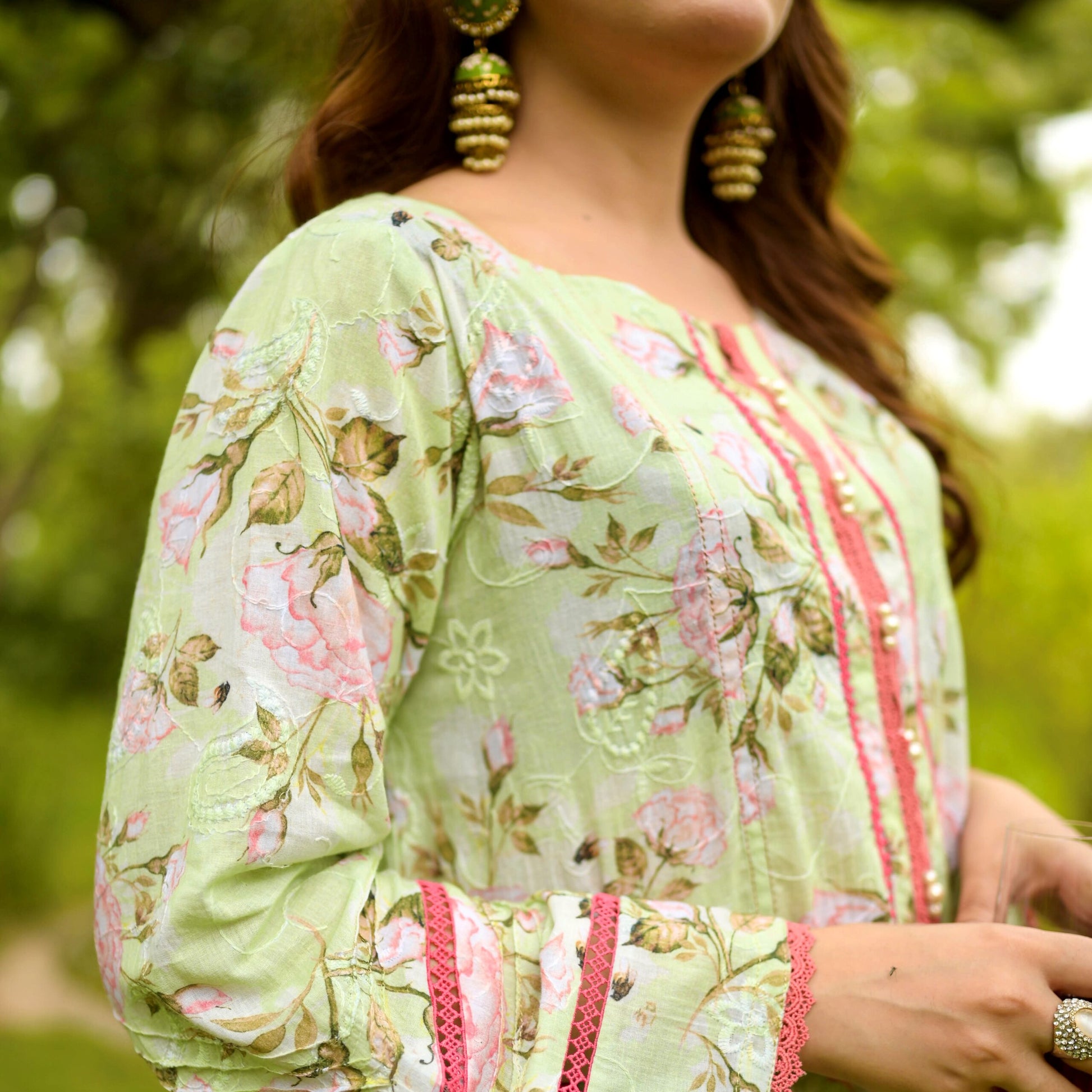 An elegant printed shirt with side panels beautifully adorned with floral embroidery at the front with laces and pearl detailing on neck and sleeves along with straight fit pants.