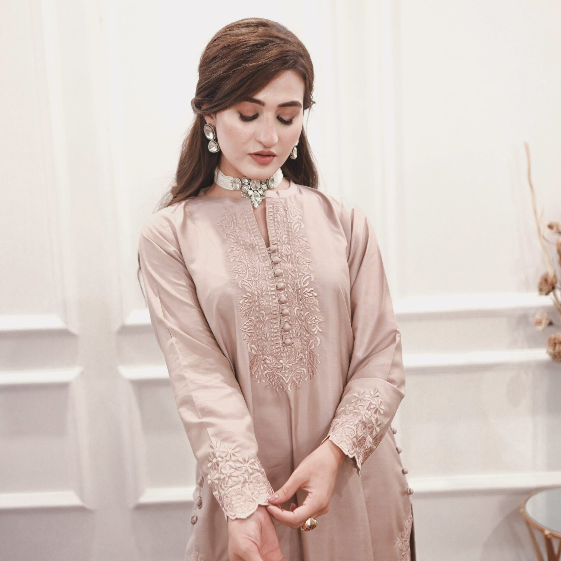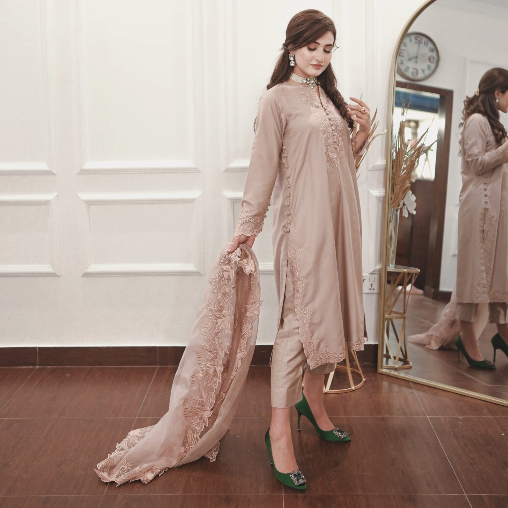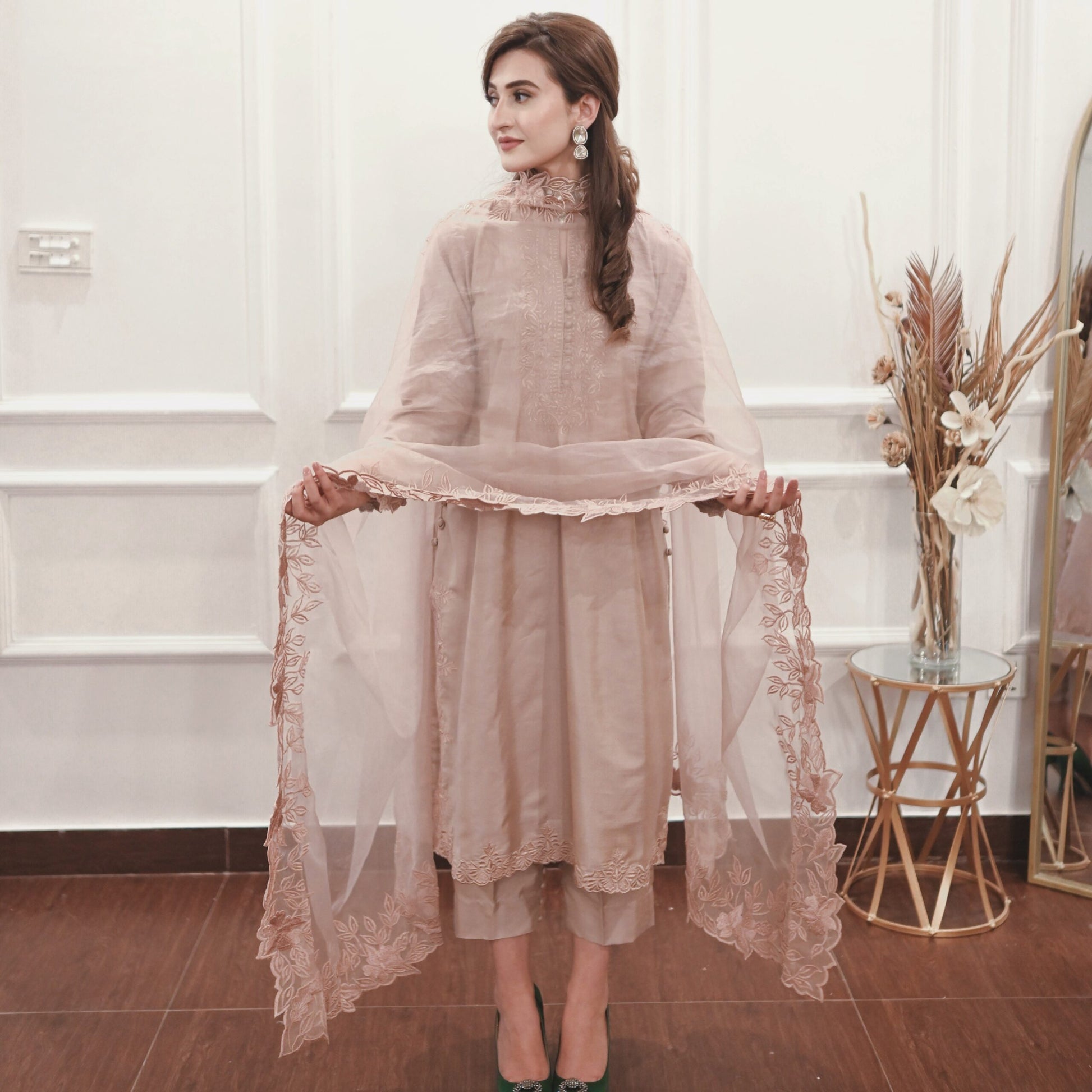 Indulge in the allure of the natural world with this breathtaking solid ensemble. Meticulously fashioned from opulent premium fabric, it boasts intricate floral details, culminating in a captivating long neckline, sleeves and hem of shirt along with straight fit pants. Elevate your ensemble with the addition of a pure organza dupptta, lavishly adorned with exquisite heavy embroidered border on all sides. Embrace the profound beauty of nature, meticulously interwoven into every meticulously crafted stitch.