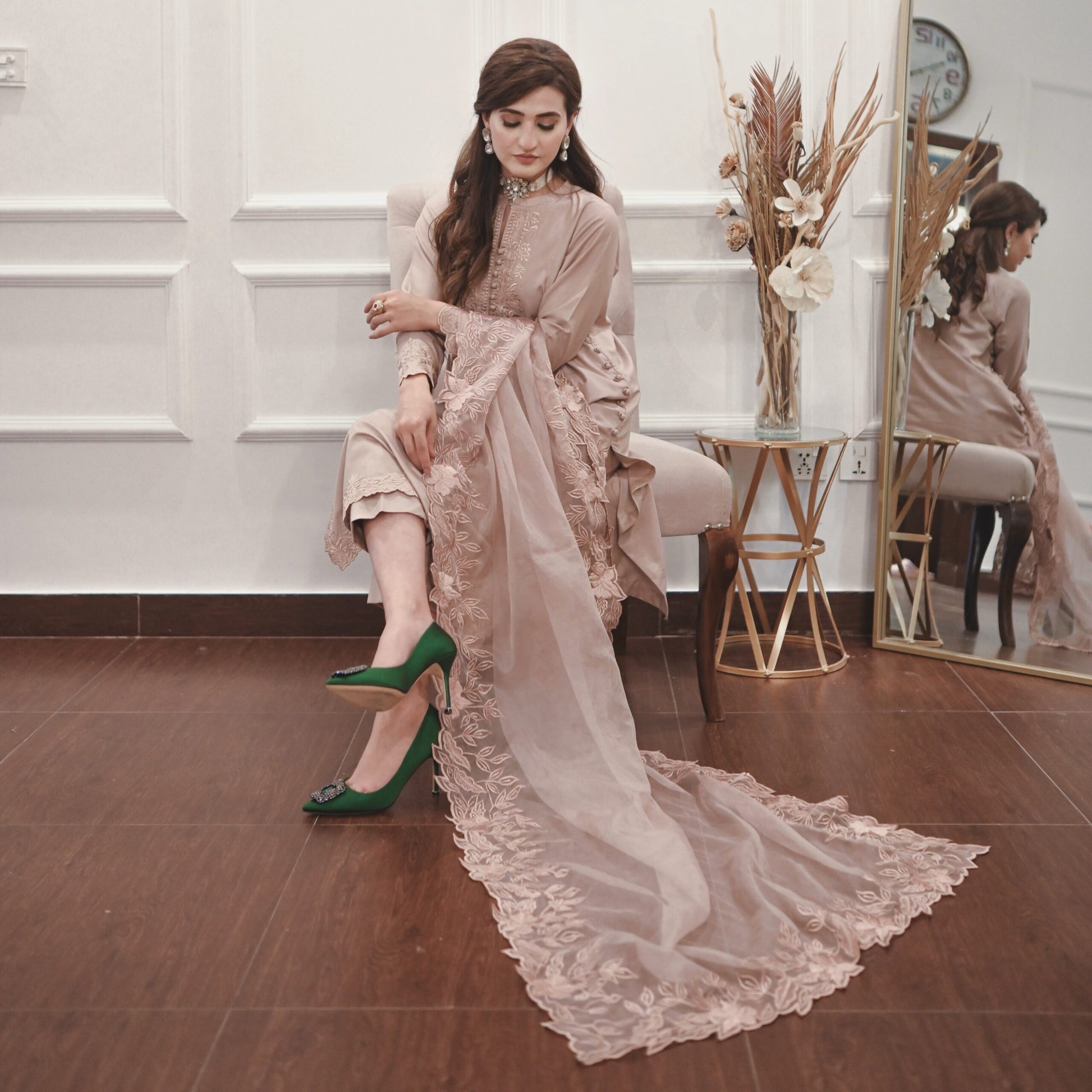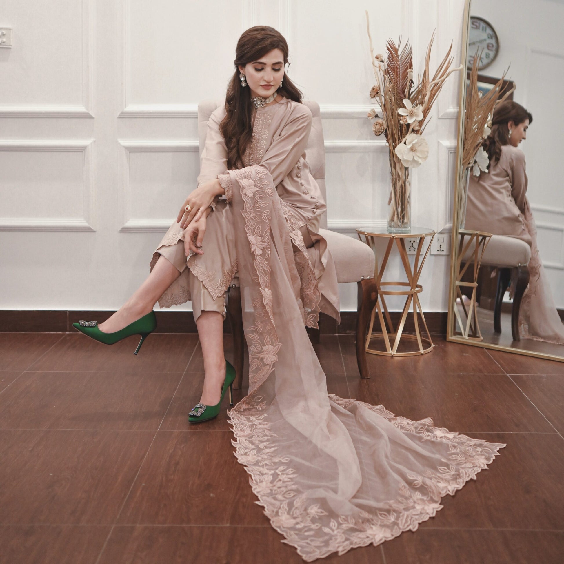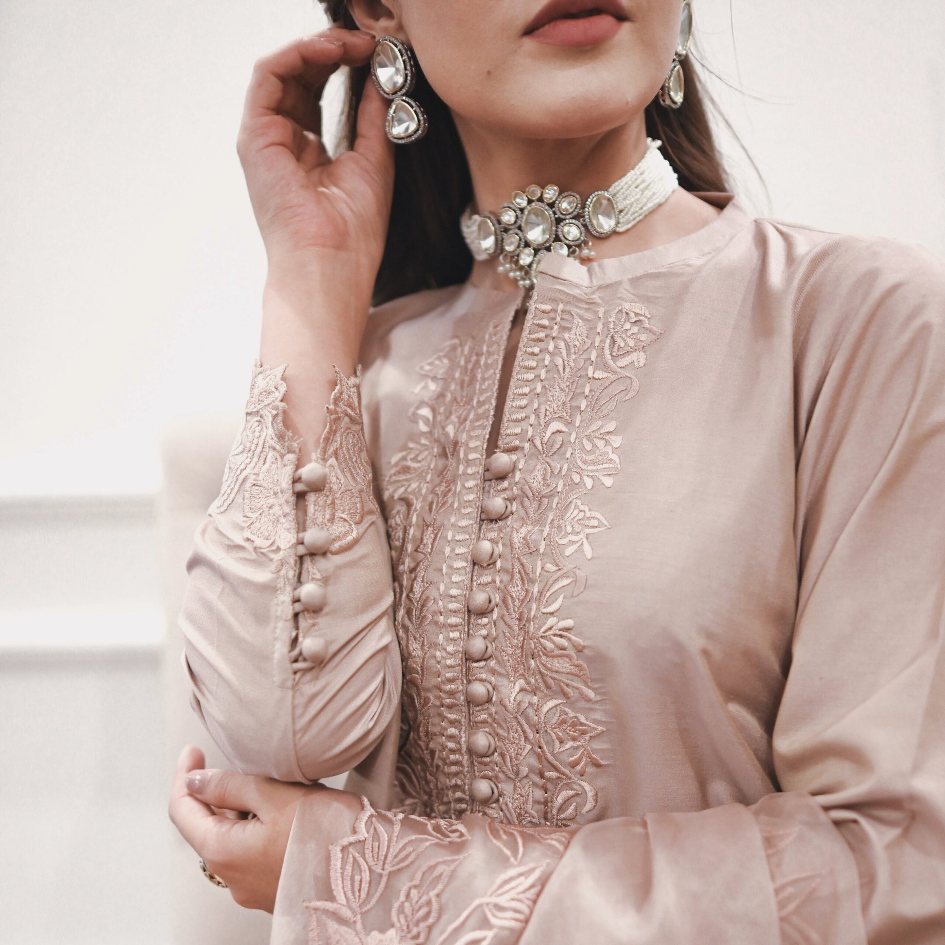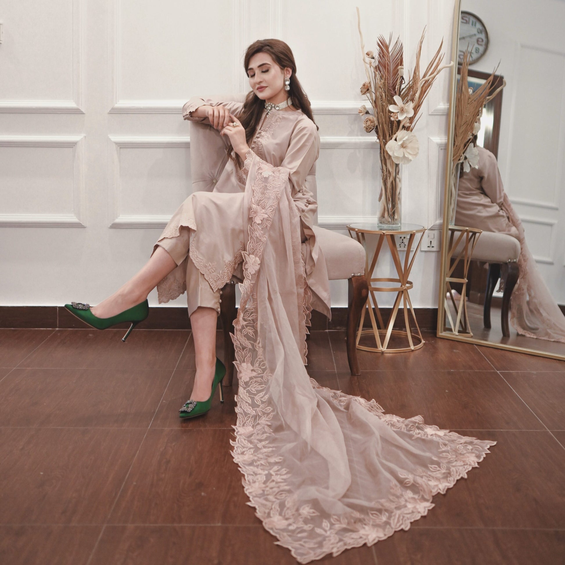 Indulge in the allure of the natural world with this breathtaking solid ensemble. Meticulously fashioned from opulent premium fabric, it boasts intricate floral details, culminating in a captivating long neckline, sleeves and hem of shirt along with straight fit pants. Elevate your ensemble with the addition of a pure organza dupptta, lavishly adorned with exquisite heavy embroidered border on all sides. Embrace the profound beauty of nature, meticulously interwoven into every meticulously crafted stitch.
