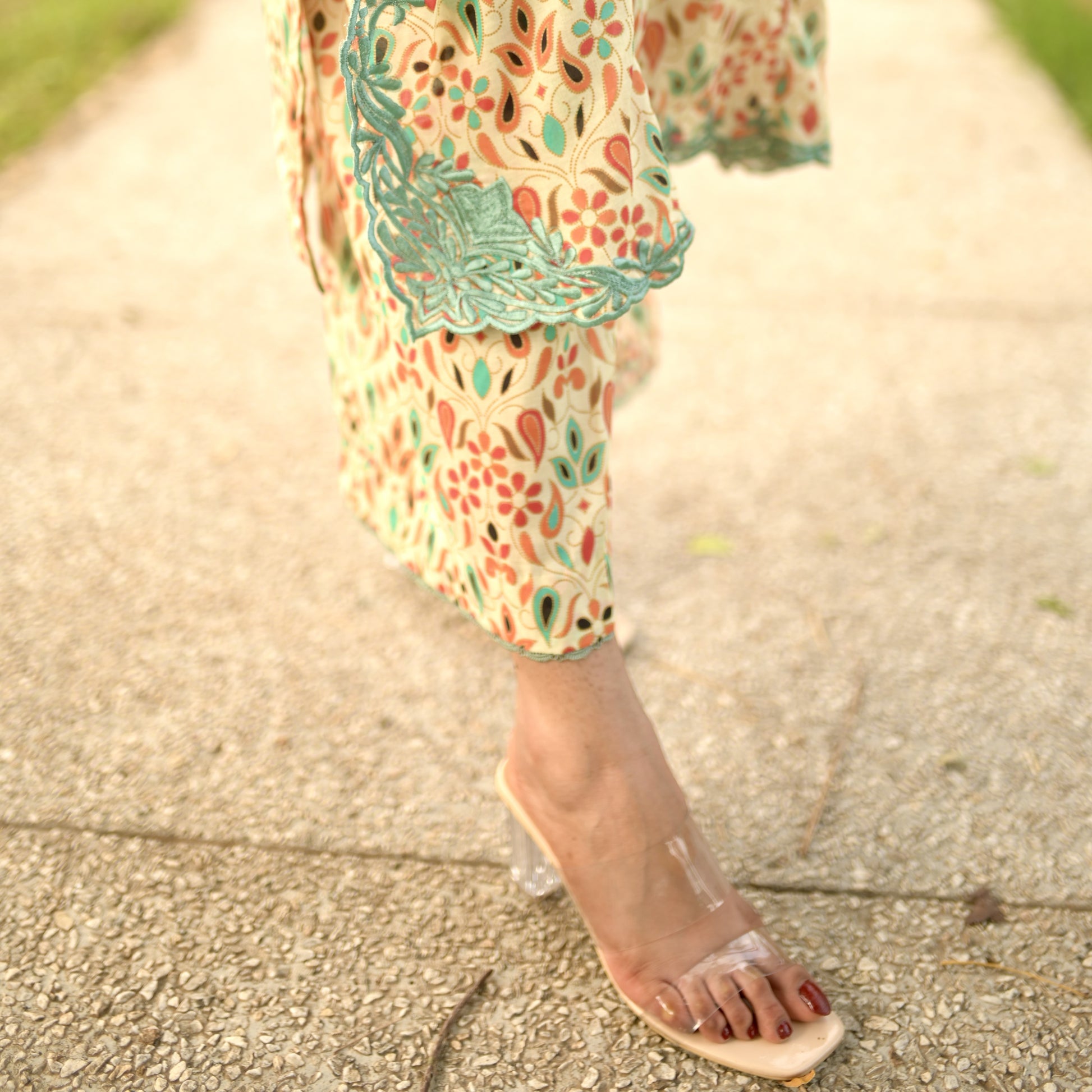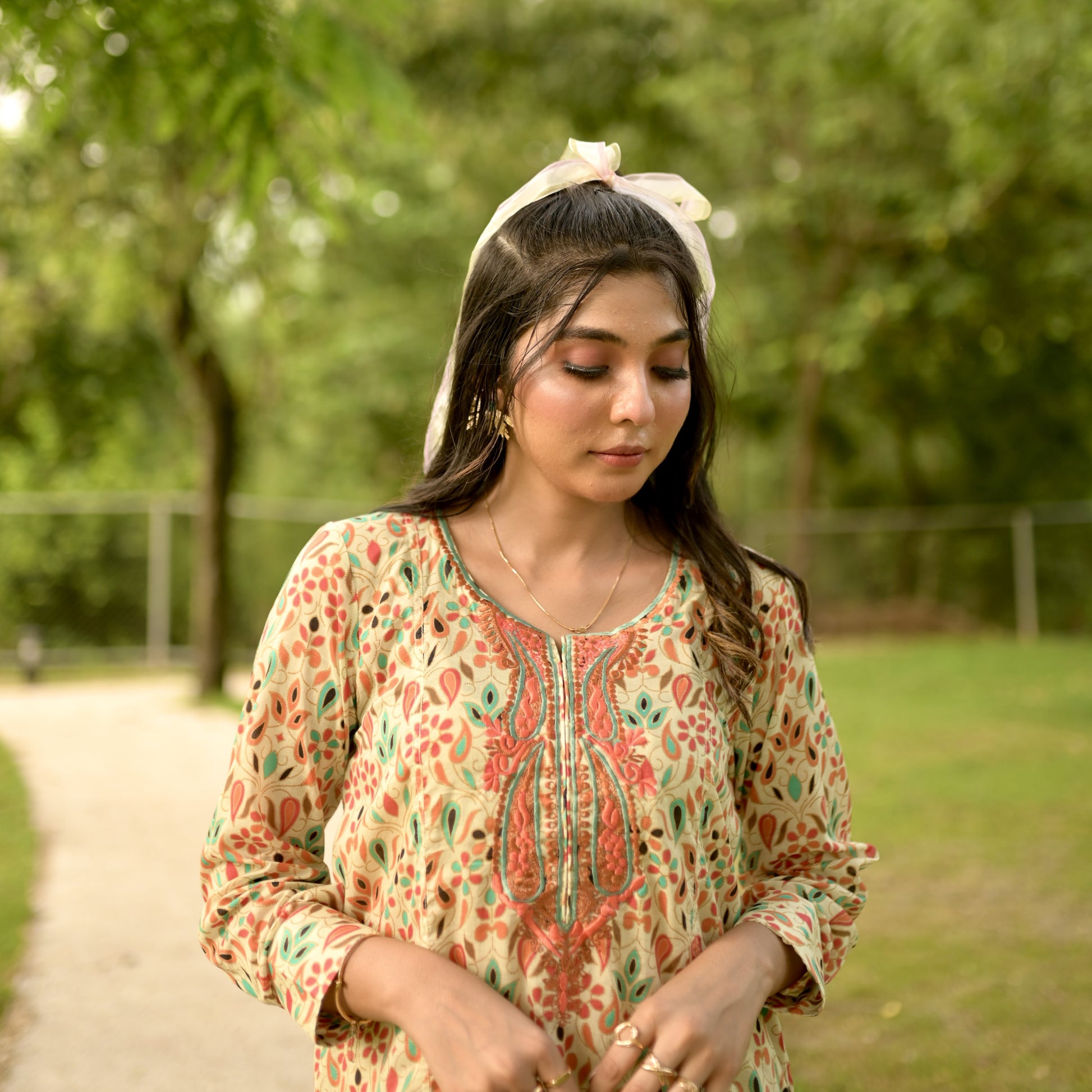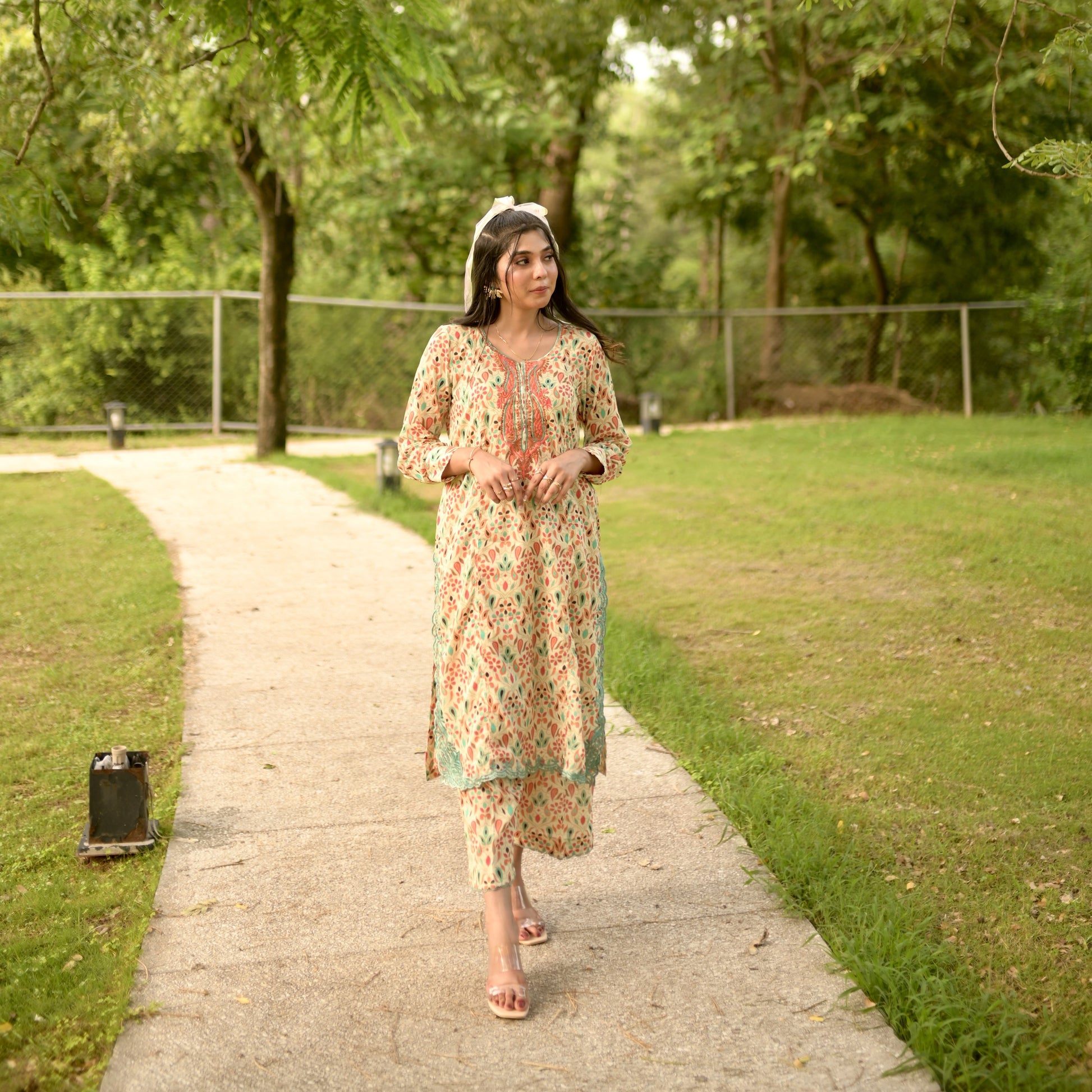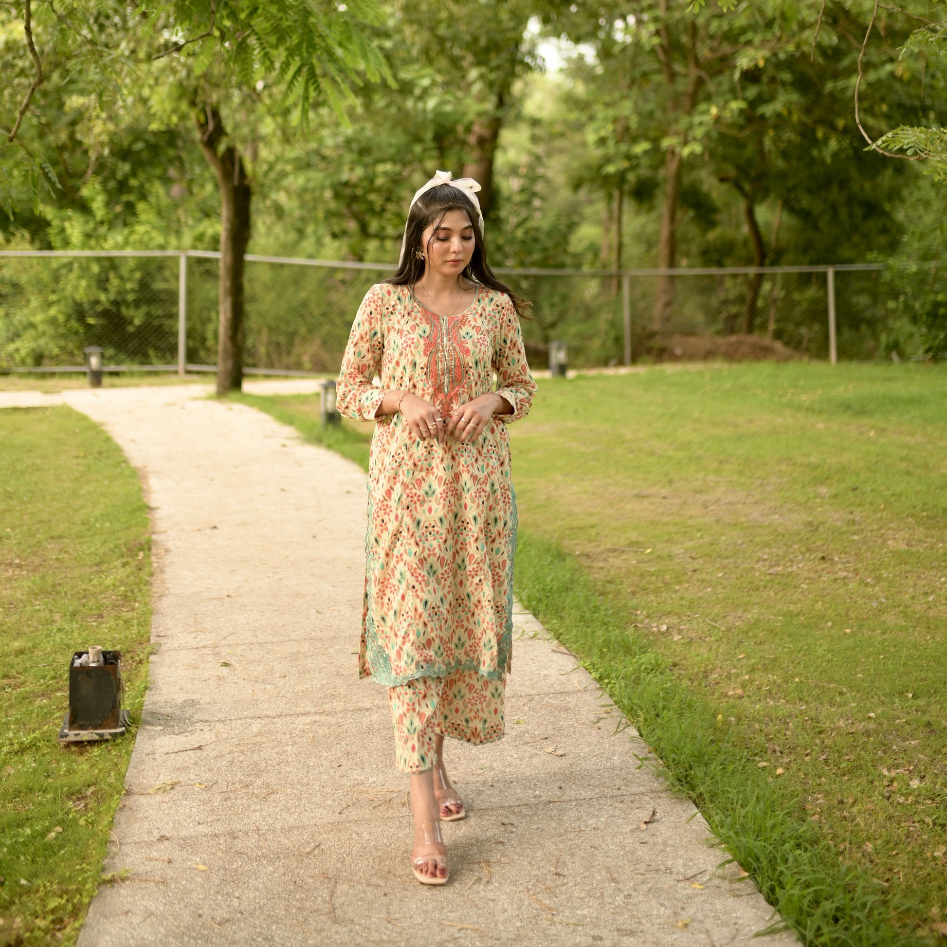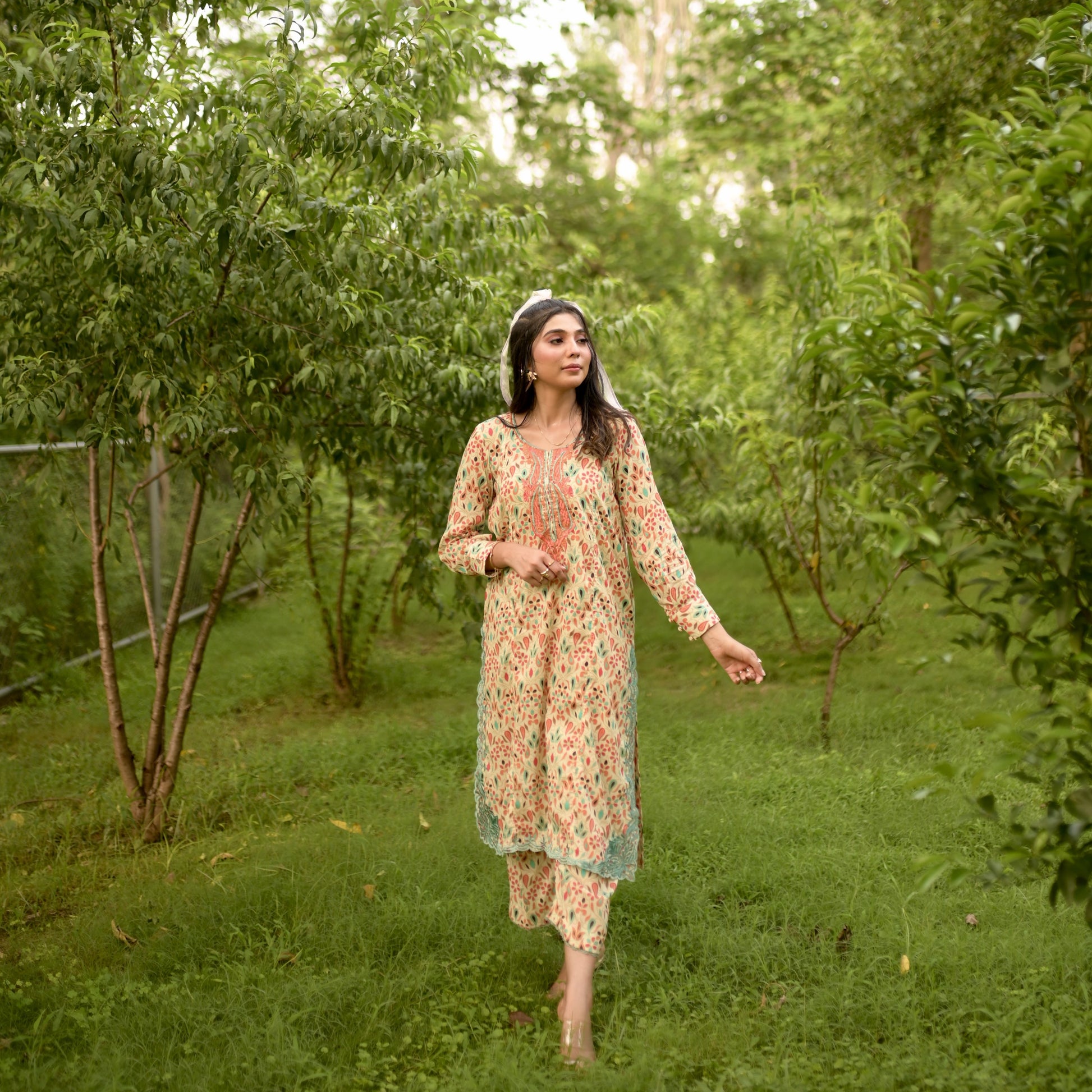The vibrant colours captivates with delicate embroidery, adding elegance and charm to the front. Its neckline, sleeves and sides of shirt highlights beautiful embroidery pattern lead sophisticated touch. Paired with straight fit shalwar with lace detailing. This dress embodies grace and femininity with its ethereal sophistication.