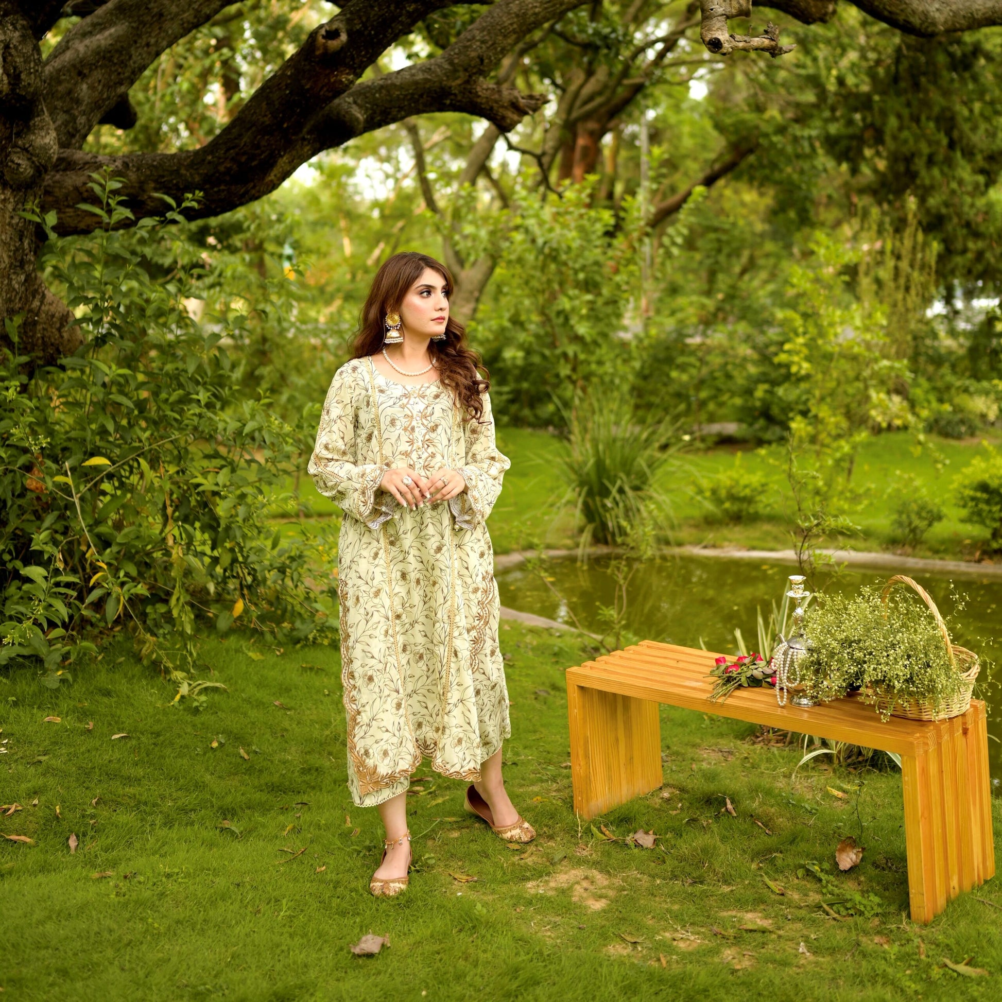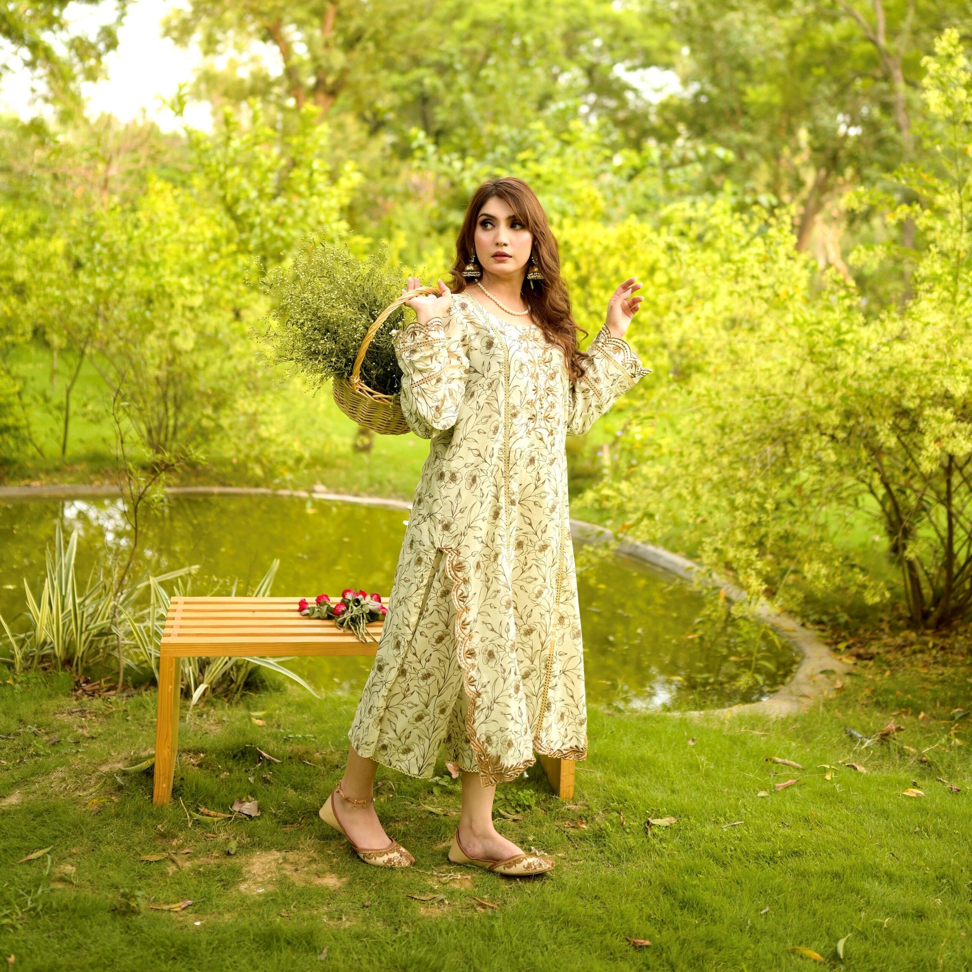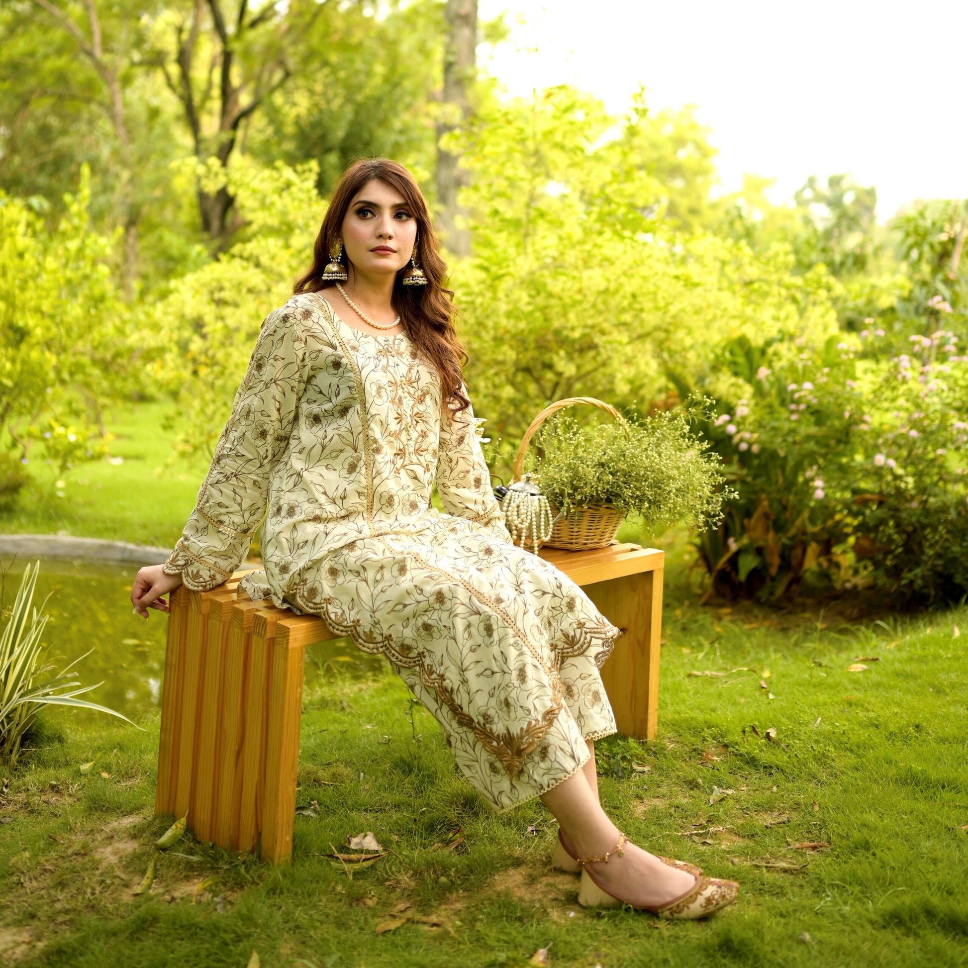 An elegant printed shirt with side panels beautifully adorned with floral embroidery at the front with laces and pearl detailing on neck and sleeves along with straight fit pants.