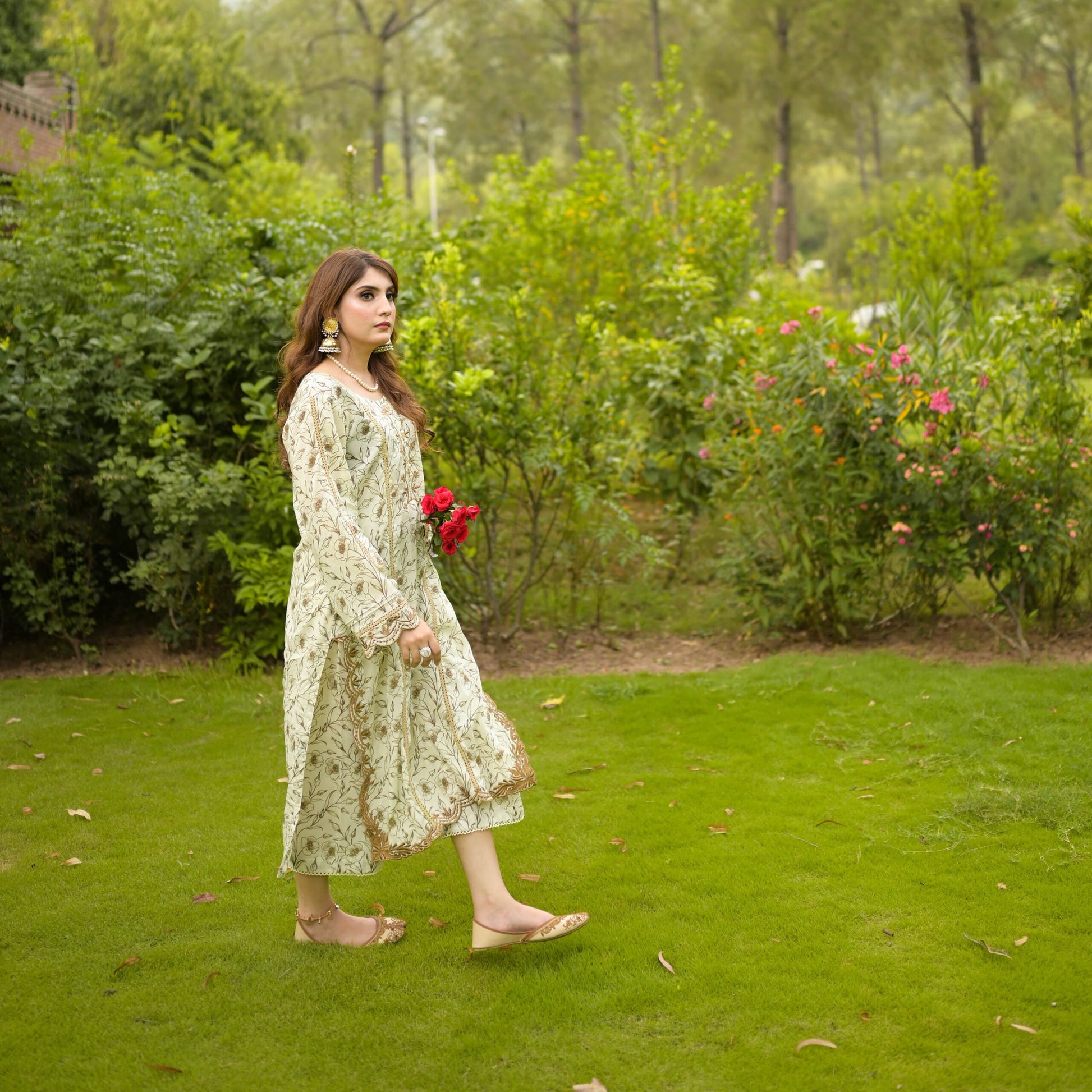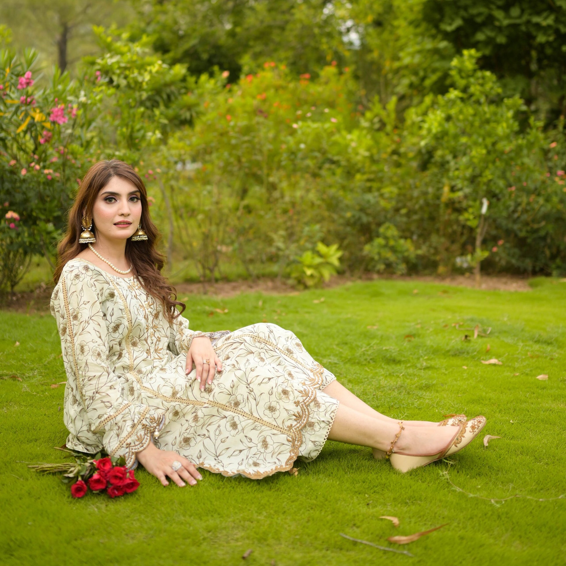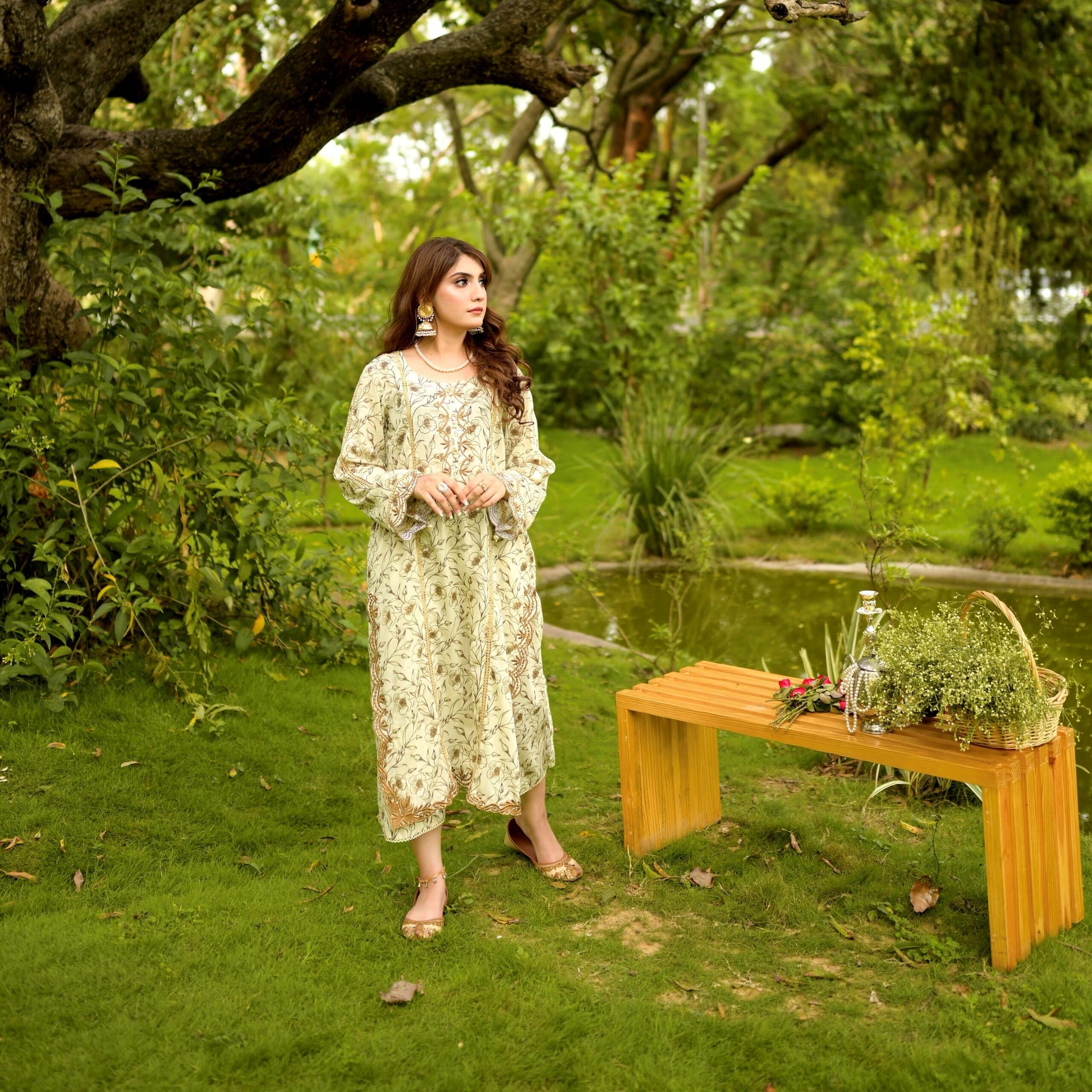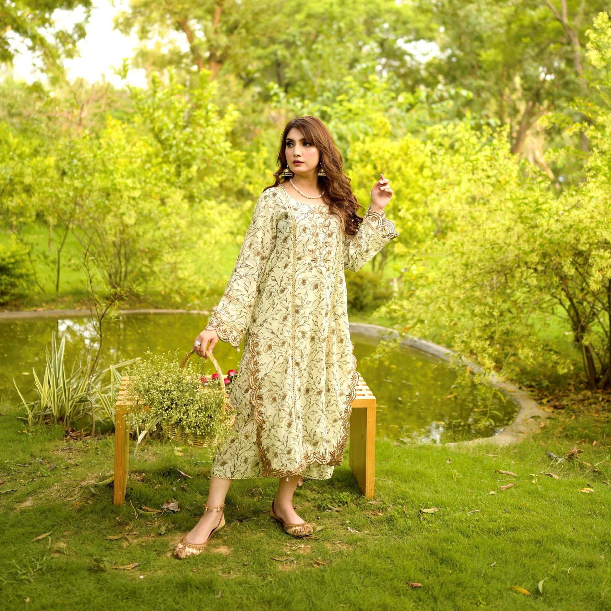 An elegant printed shirt with side panels beautifully adorned with floral embroidery at the front with laces and pearl detailing on neck and sleeves along with straight fit pants.