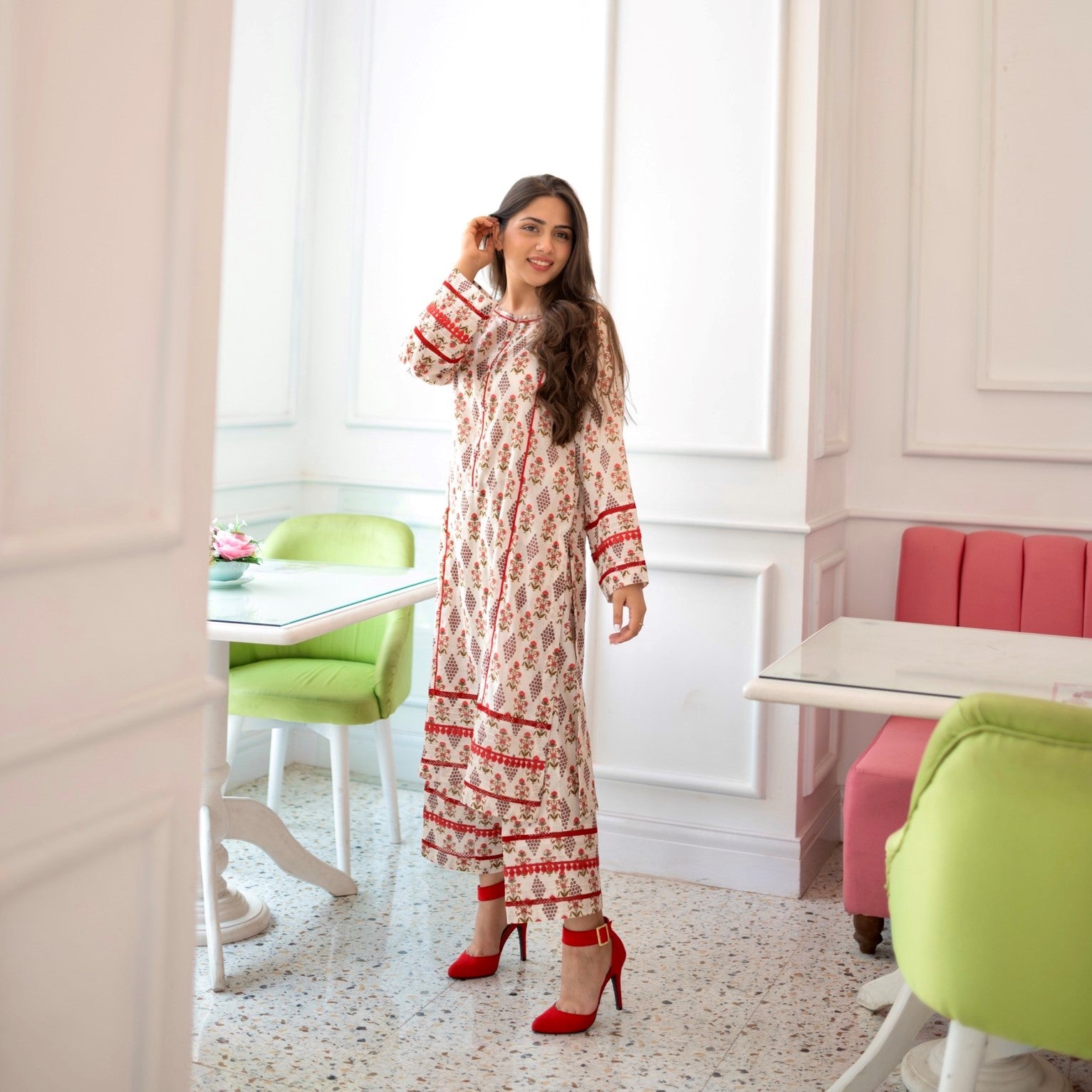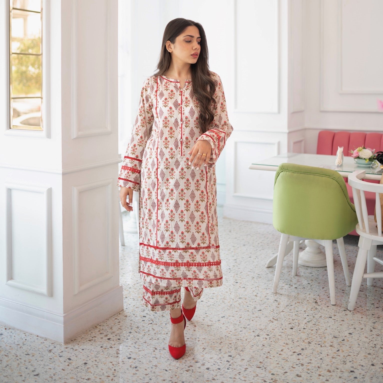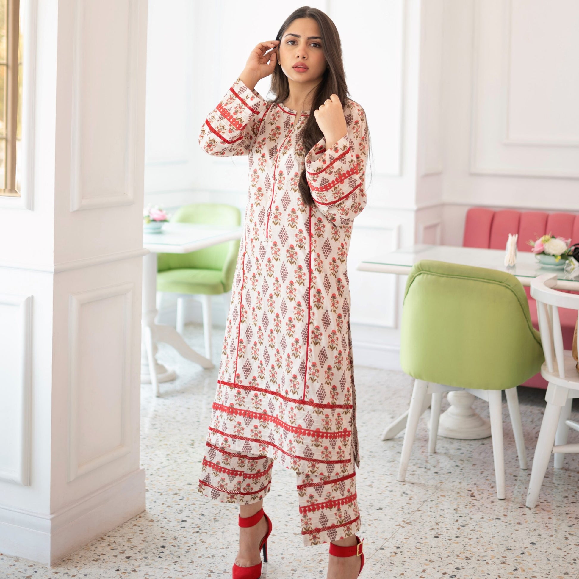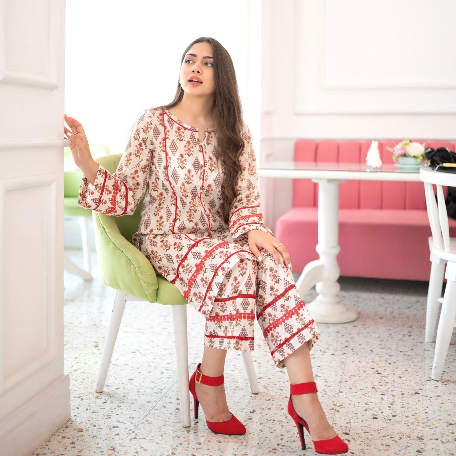 Printed cords features and elegant chic A-Line with beautiful laces in panels paired with culotte.