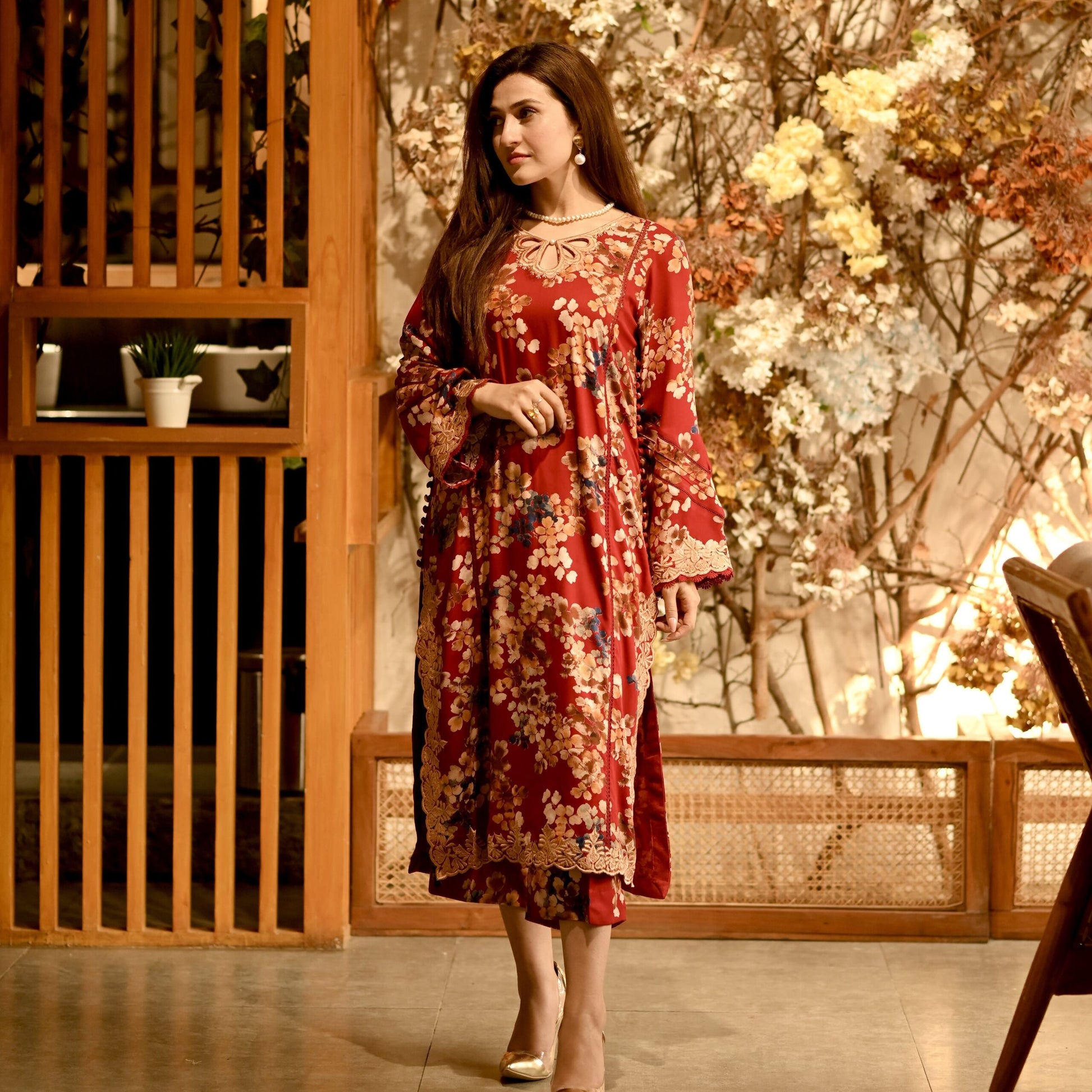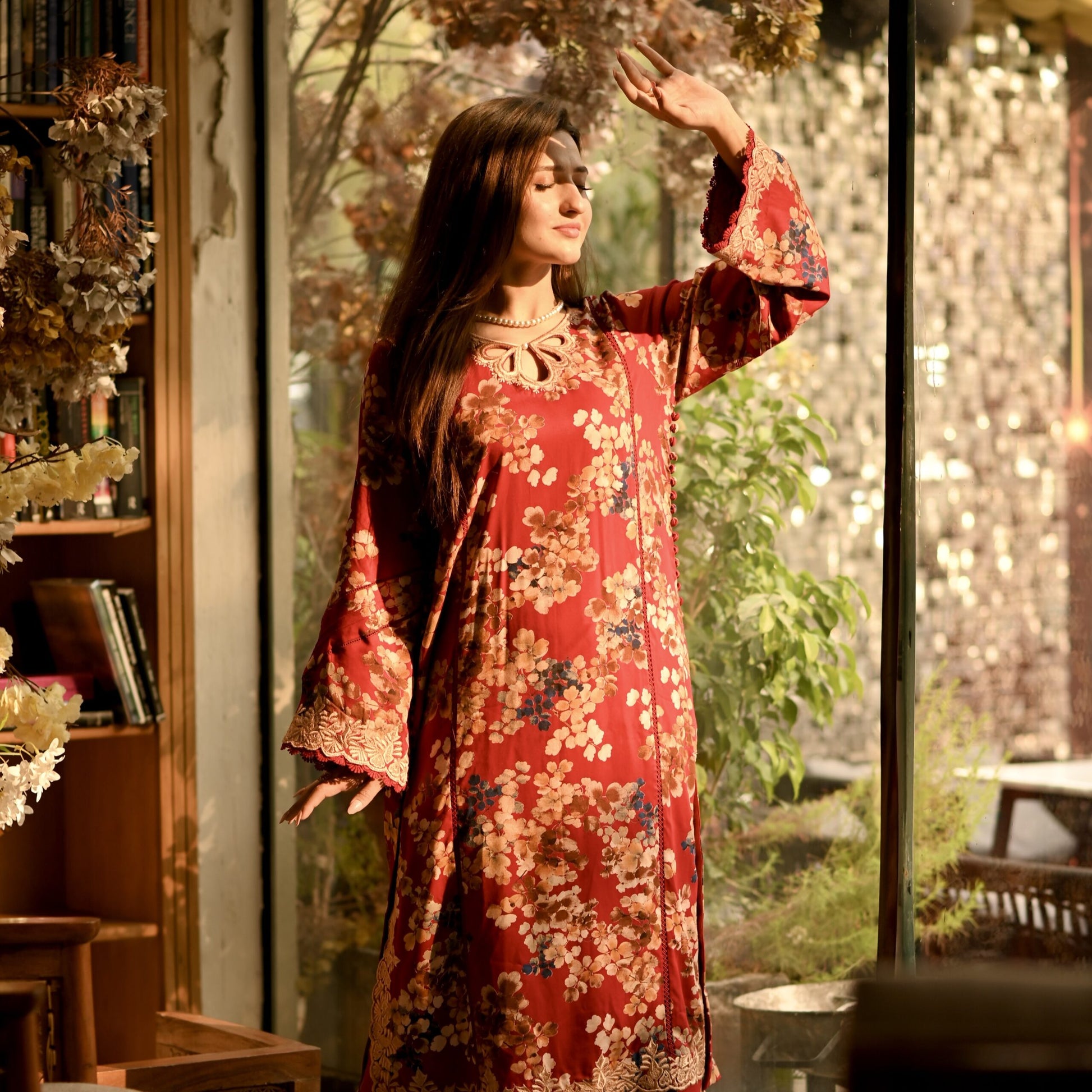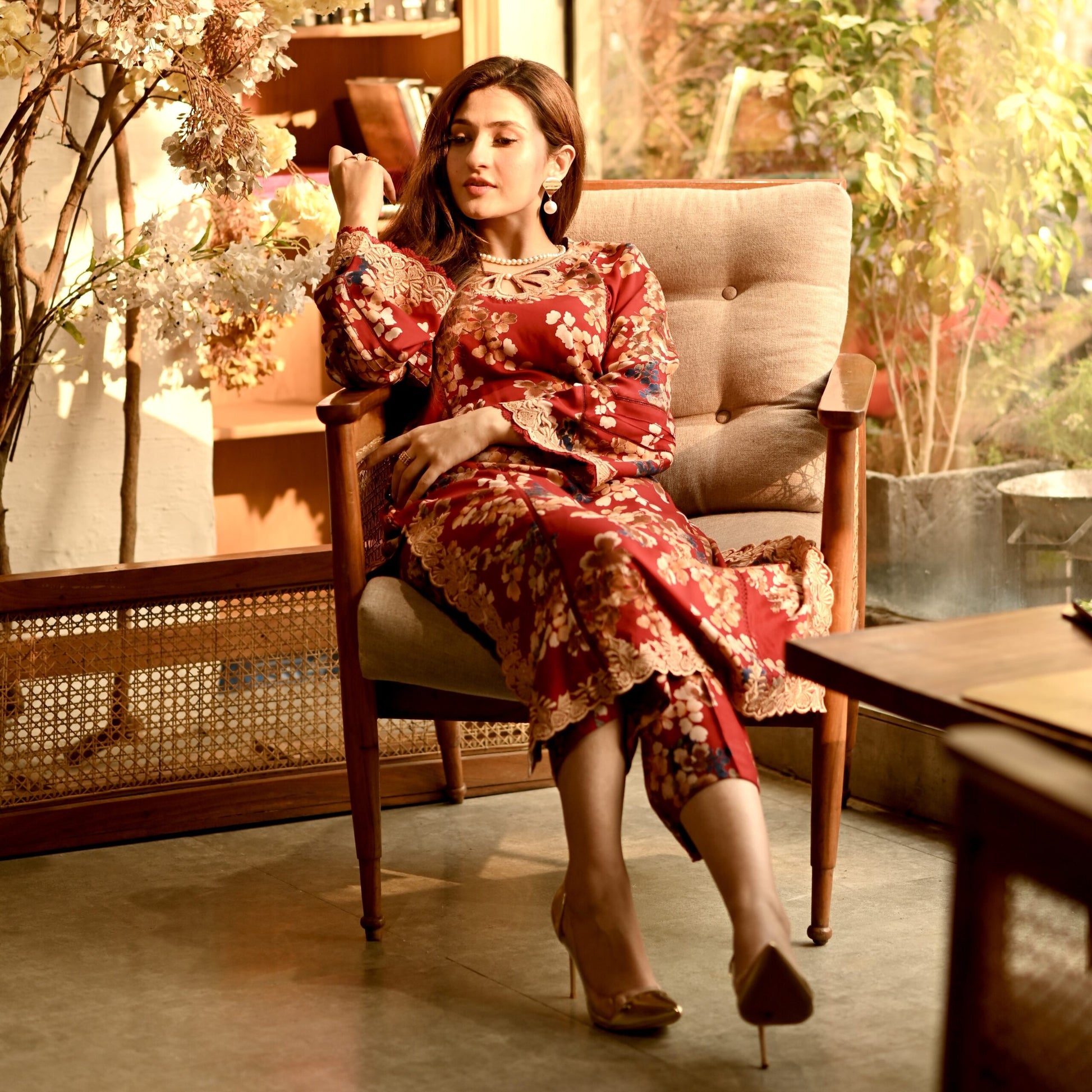 A paneled long shirt unfolds, decked in resplendent allure and graced by the presence of intricate floral embroidery on the hem, neckline, and sleeves. Elevate your ensemble, with culottes embroidered pants that embrace the profound beauty of nature, meticulously interwoven into every meticulously crafted stitch.