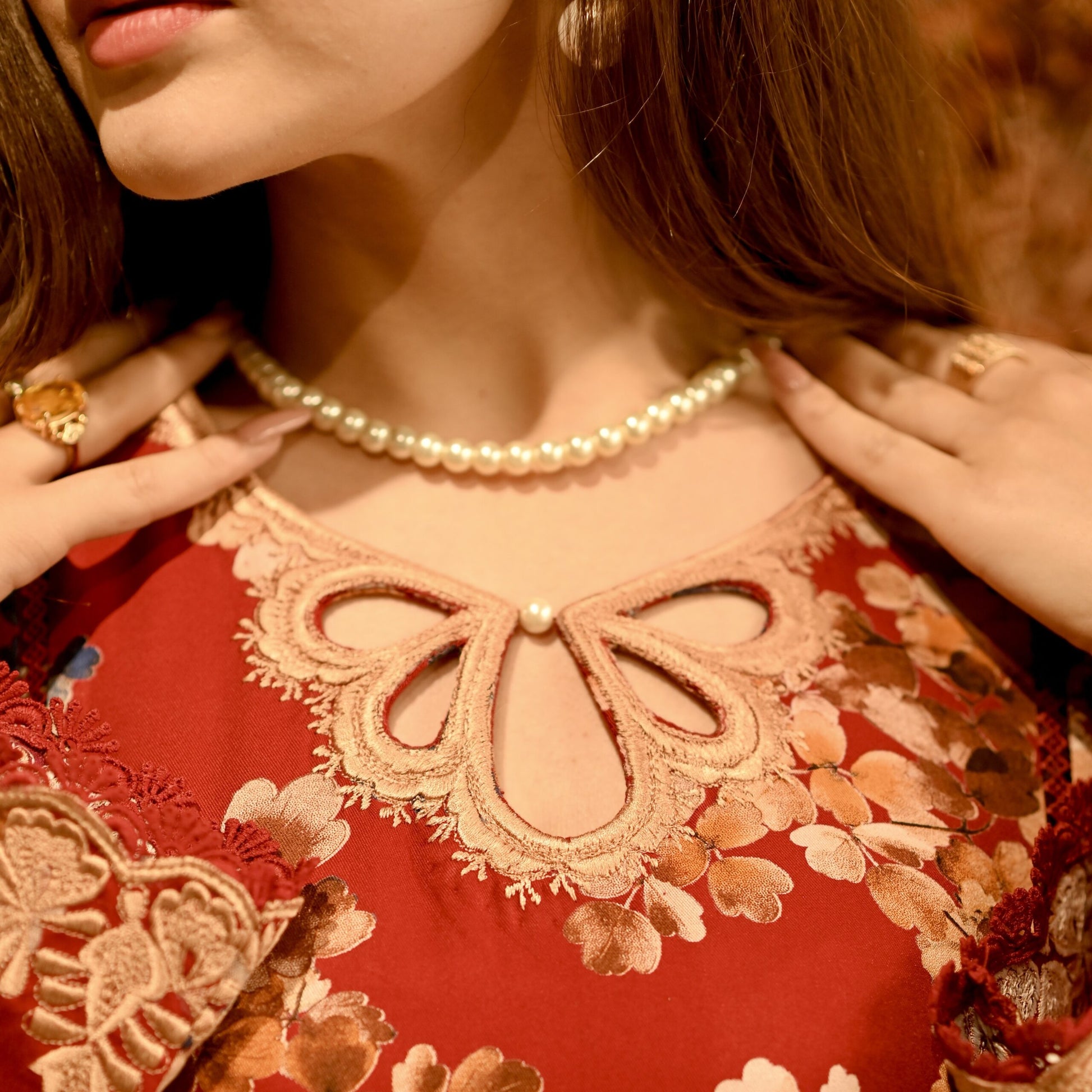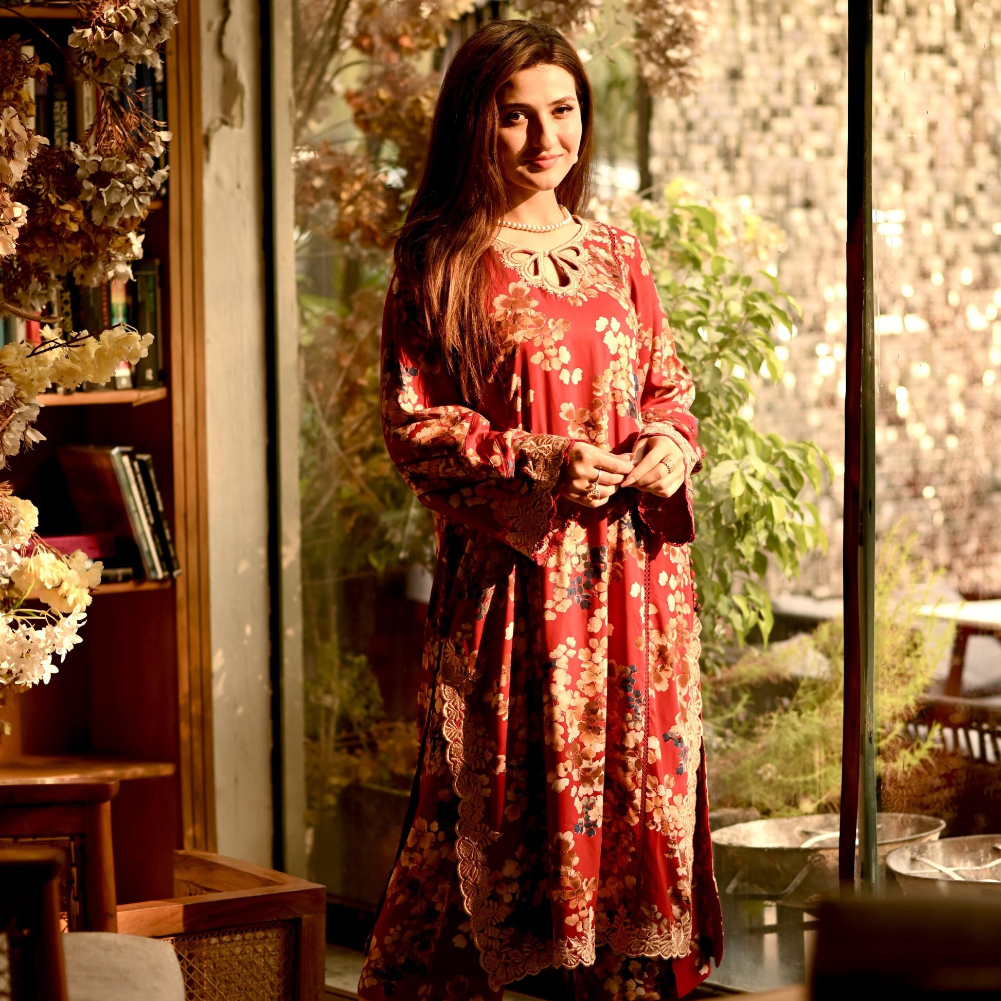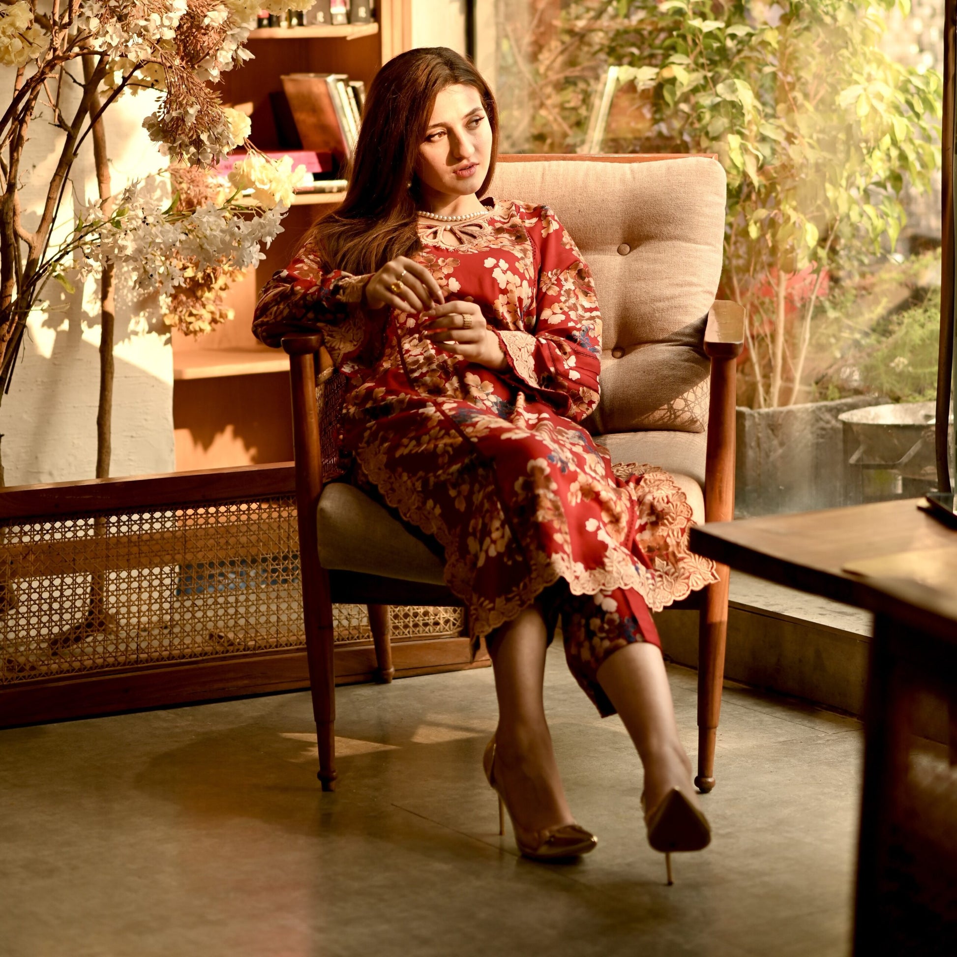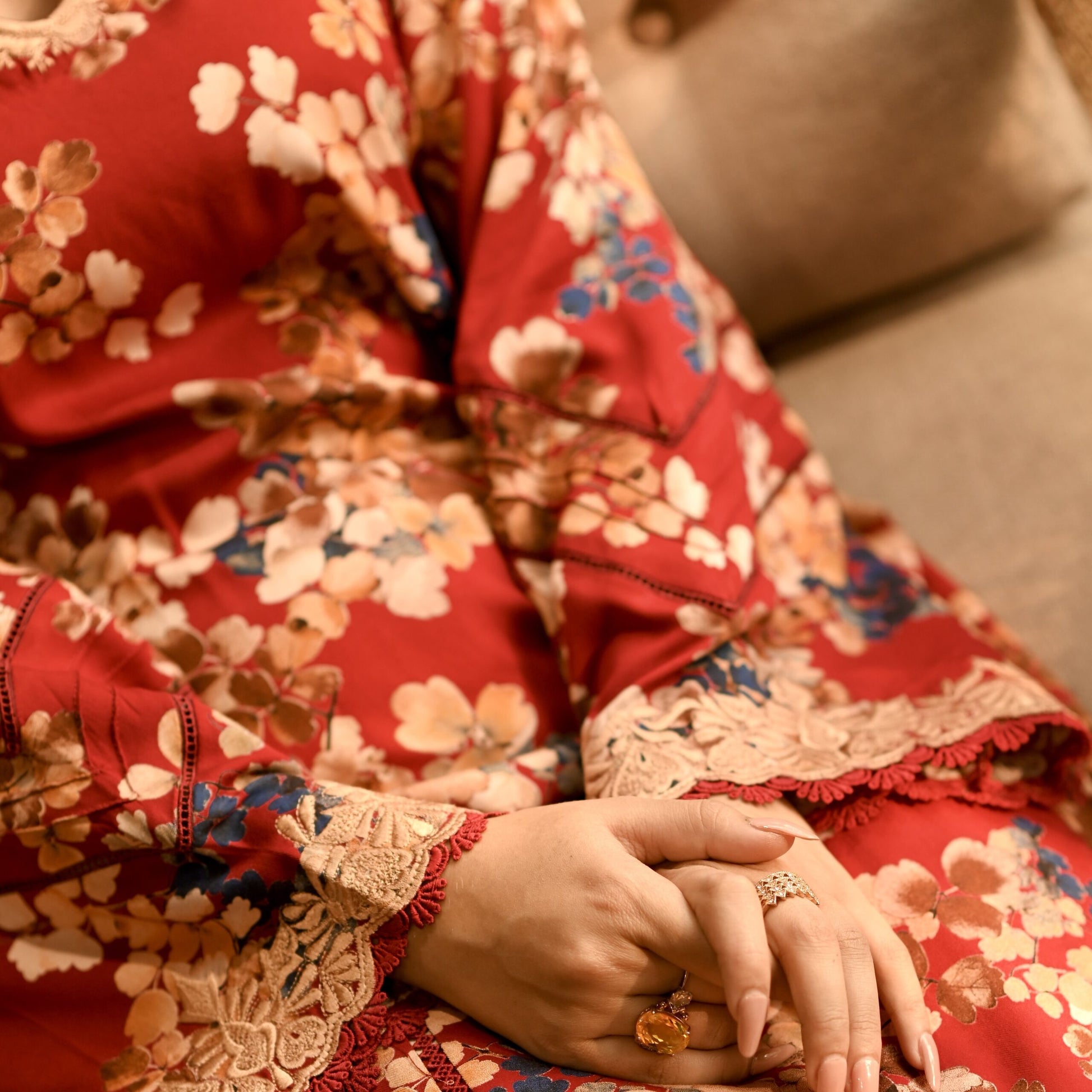 A paneled long shirt unfolds, decked in resplendent allure and graced by the presence of intricate floral embroidery on the hem, neckline, and sleeves. Elevate your ensemble, with culottes embroidered pants that embrace the profound beauty of nature, meticulously interwoven into every meticulously crafted stitch.