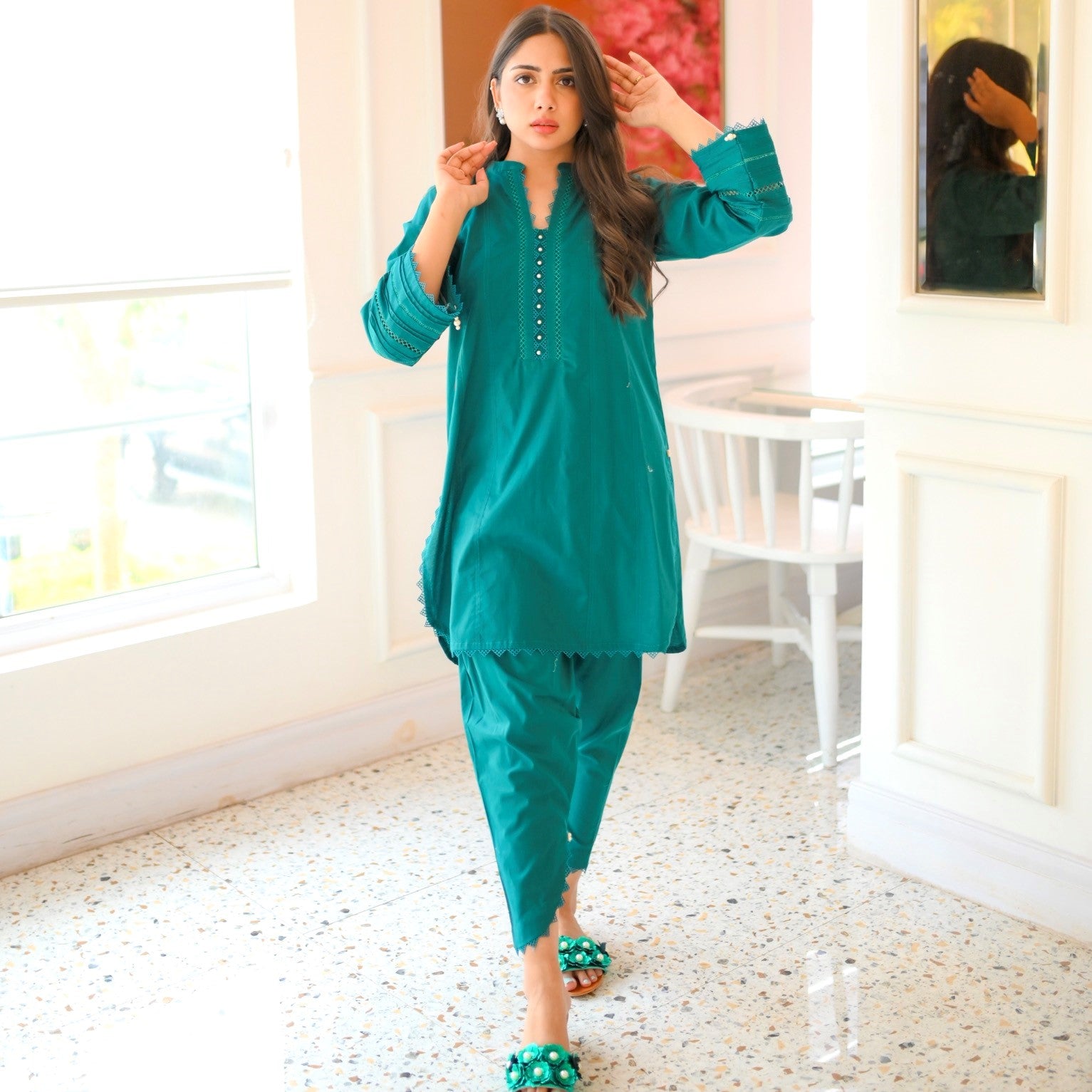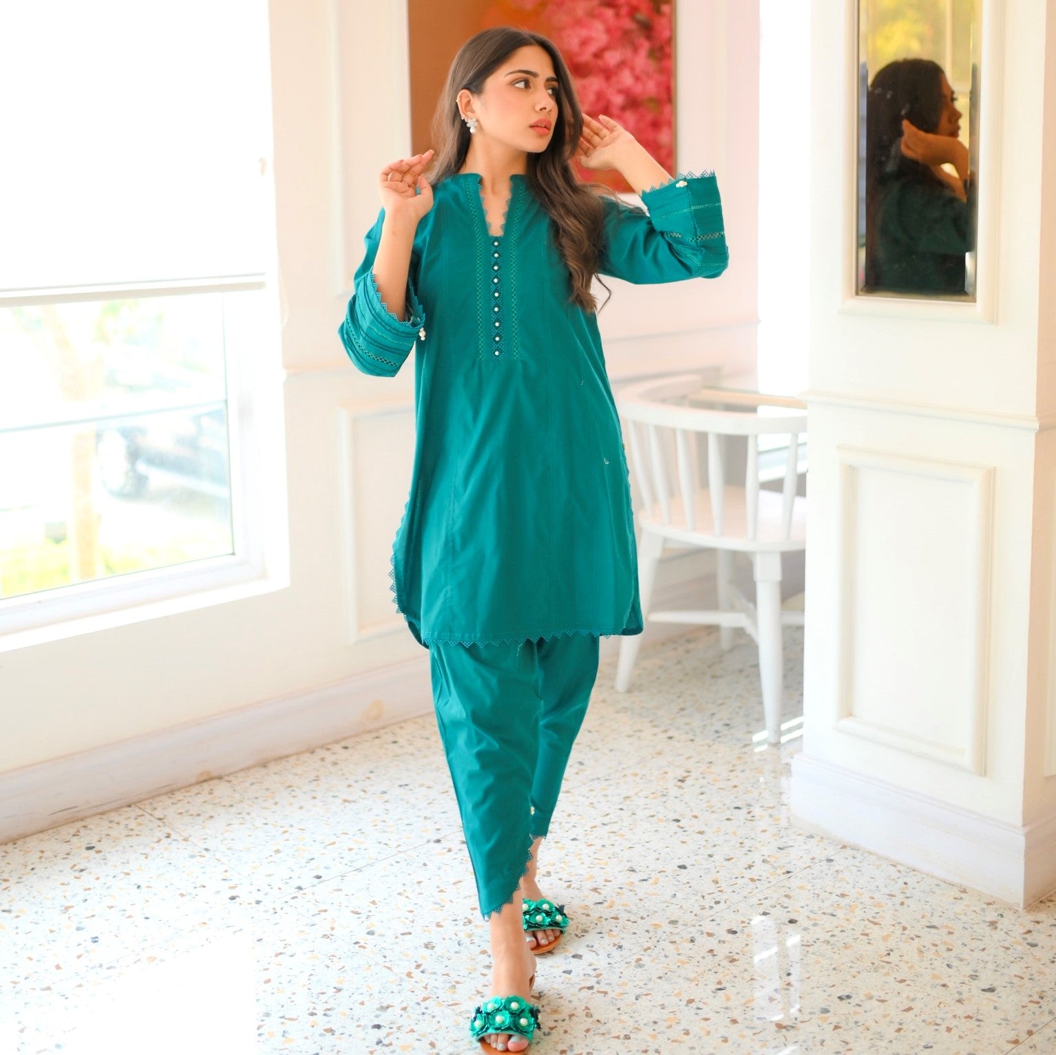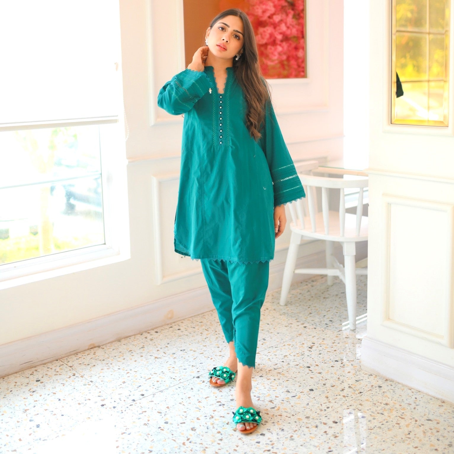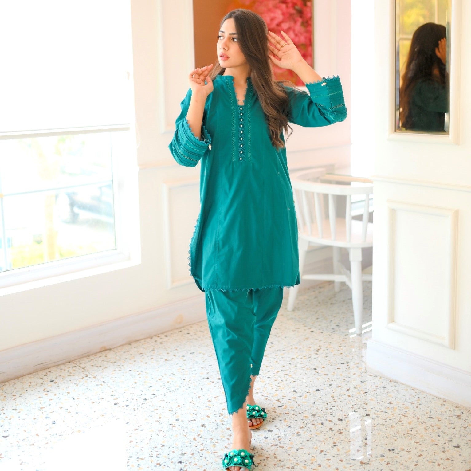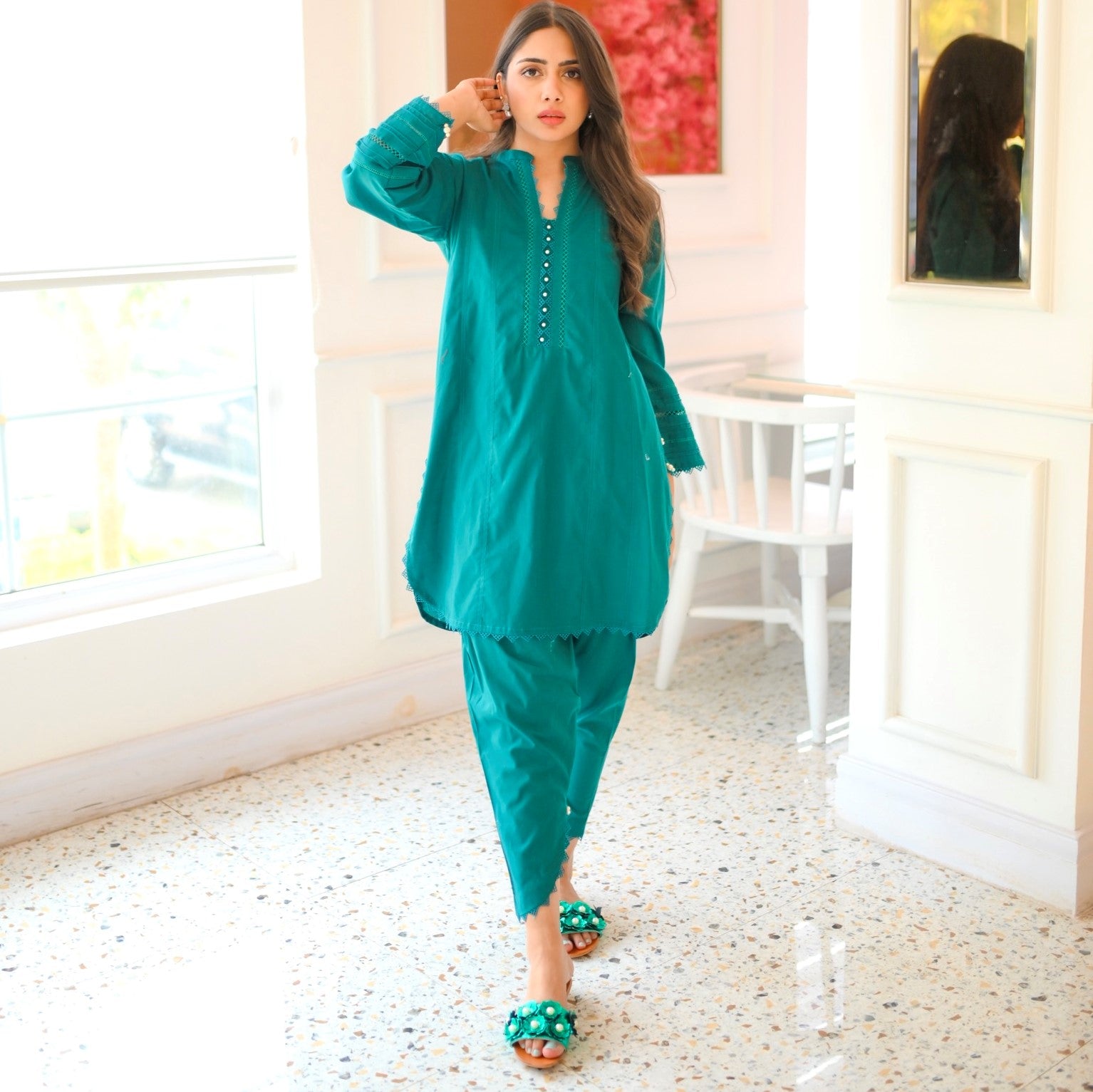 A solid cords crafted in a chic silhouette shirt with famine laces and pearl detailing on neckline and sleeves paired with paan shalwar.