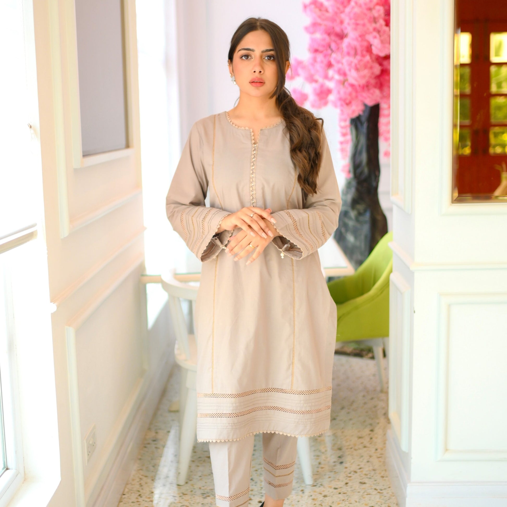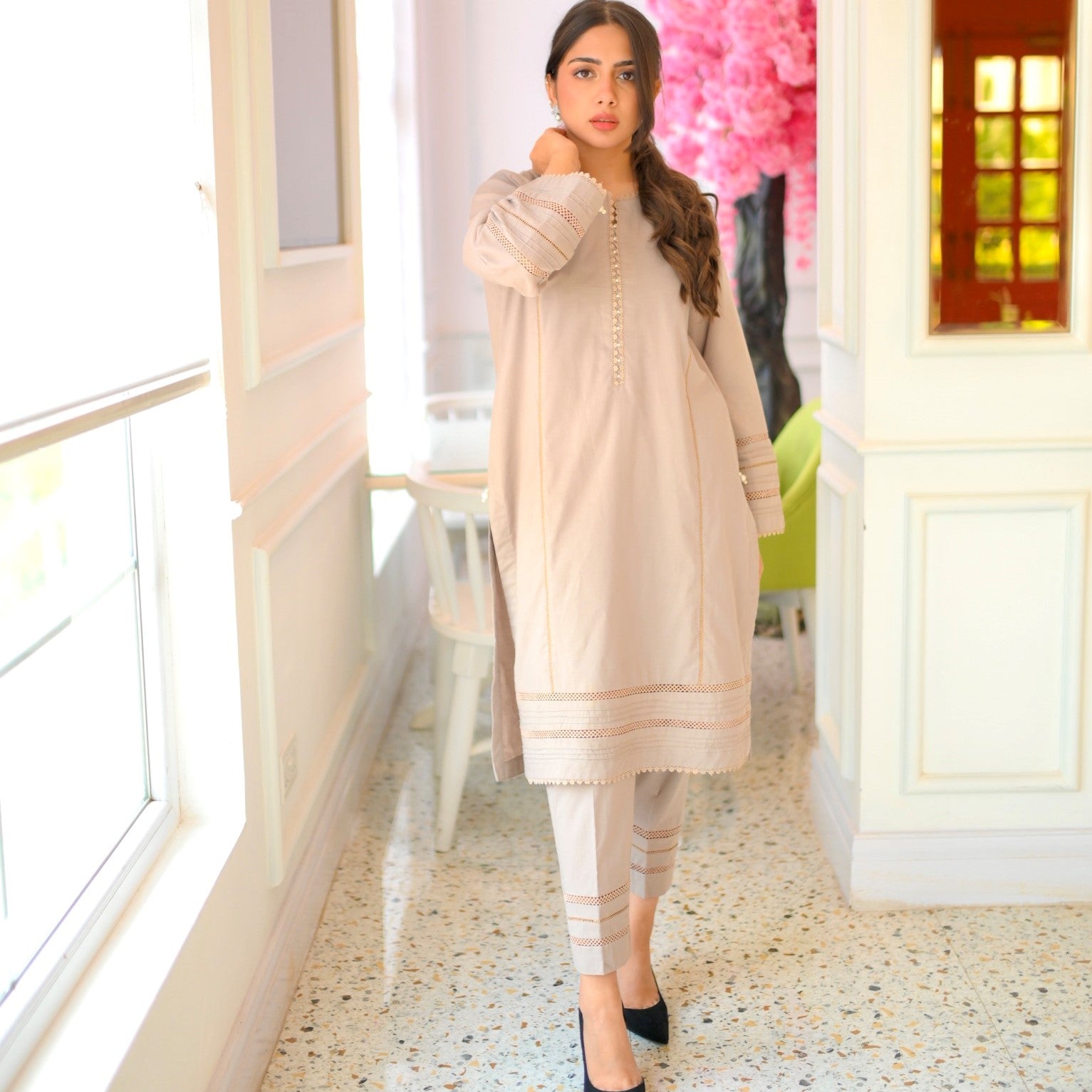 A graceful cords designed in a chic style shirt with famine laces and pearl embellishments on neckline and sleeves paired with straight fit pants.