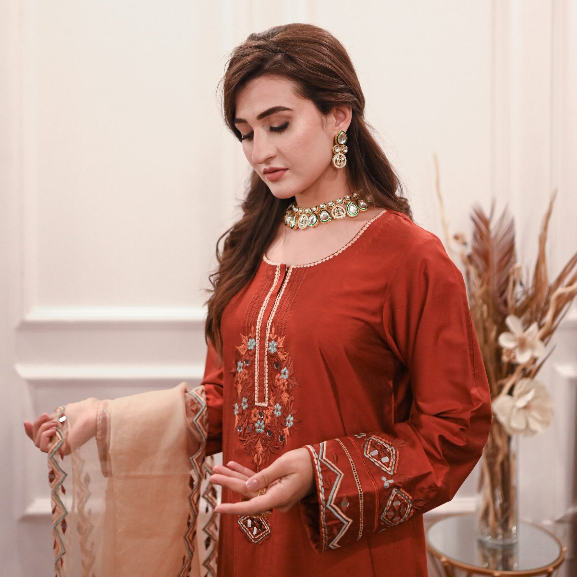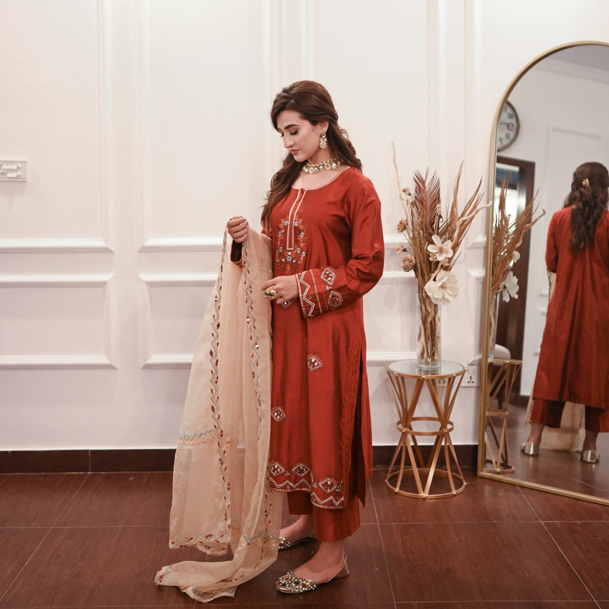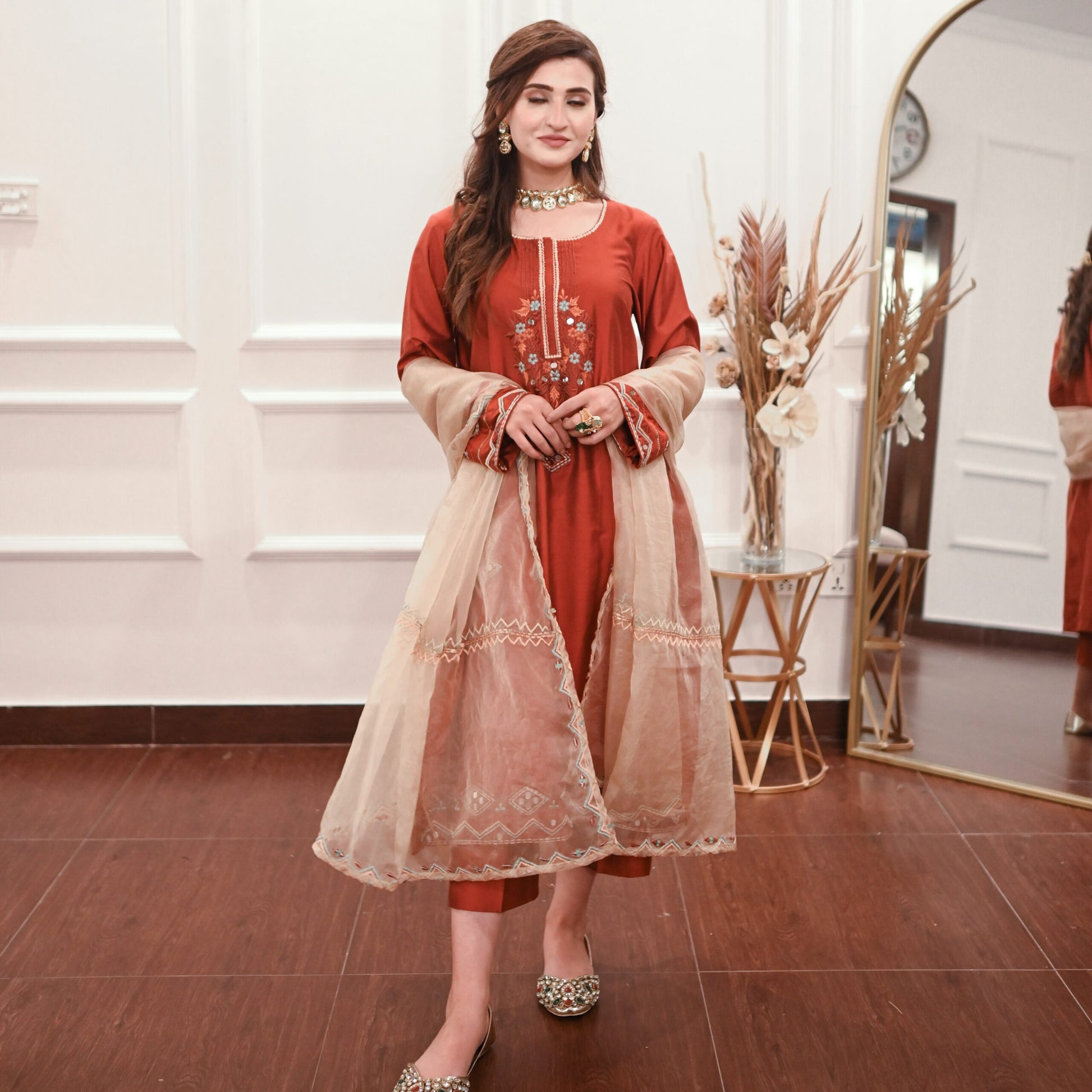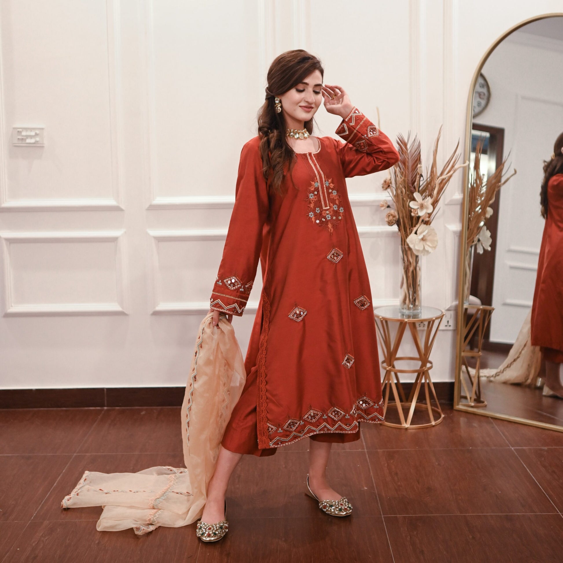 Crafted on luxurious canvas and adorned with embroidery, this piece reflects the distinctive style of ethnic wear. The garment showcases an intricately embroidered featuring with mirrors and thread’s embroidered details, resulting in a sparkling floral composition. The sleeves, neck and hem are radiating grace with embroidery. The outfit is paired with dupatta, boasting heavily embroidered borders with a four-sided mirror and thread work. This outfit is the perfect choice for the festive season, radiating grace and allure.