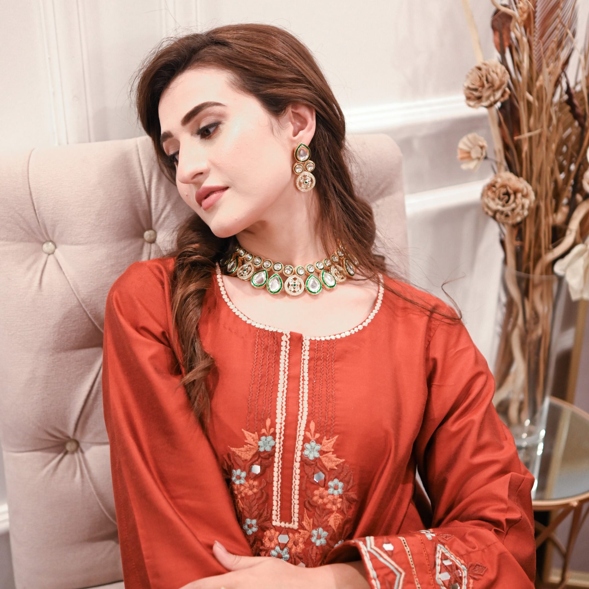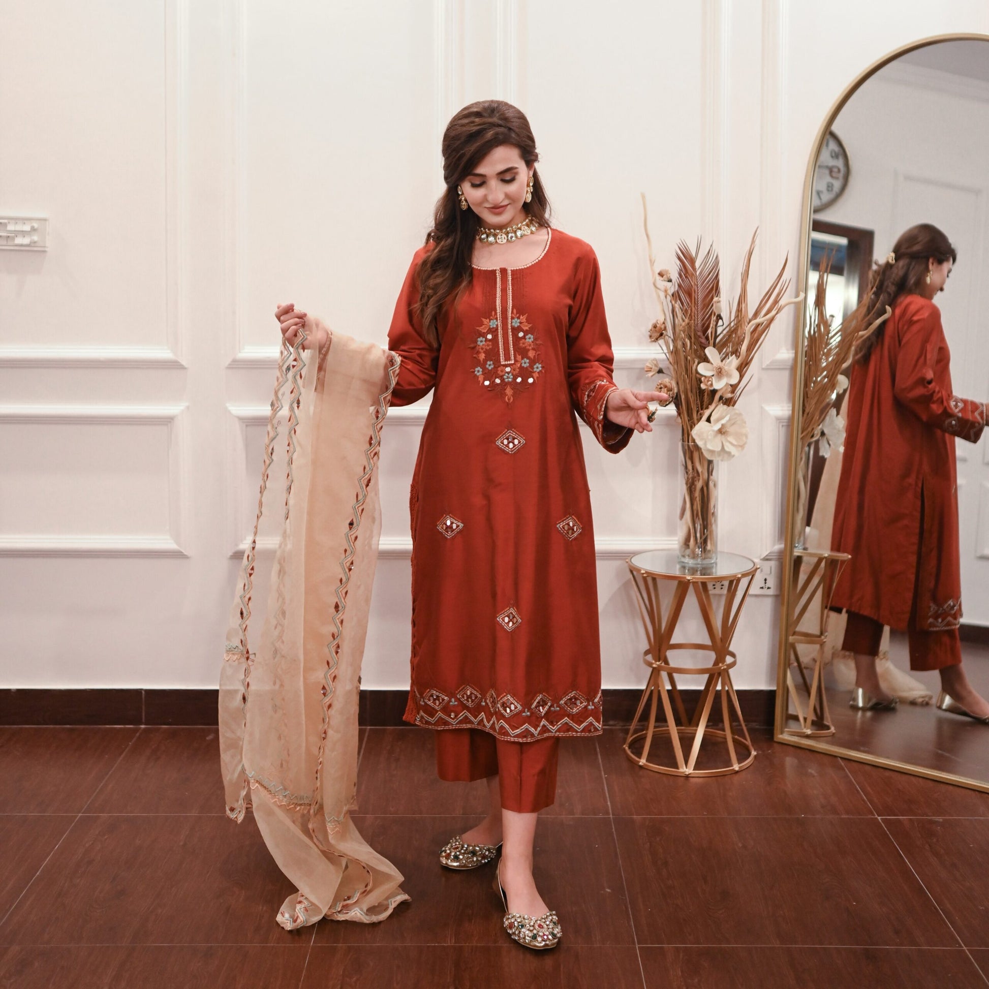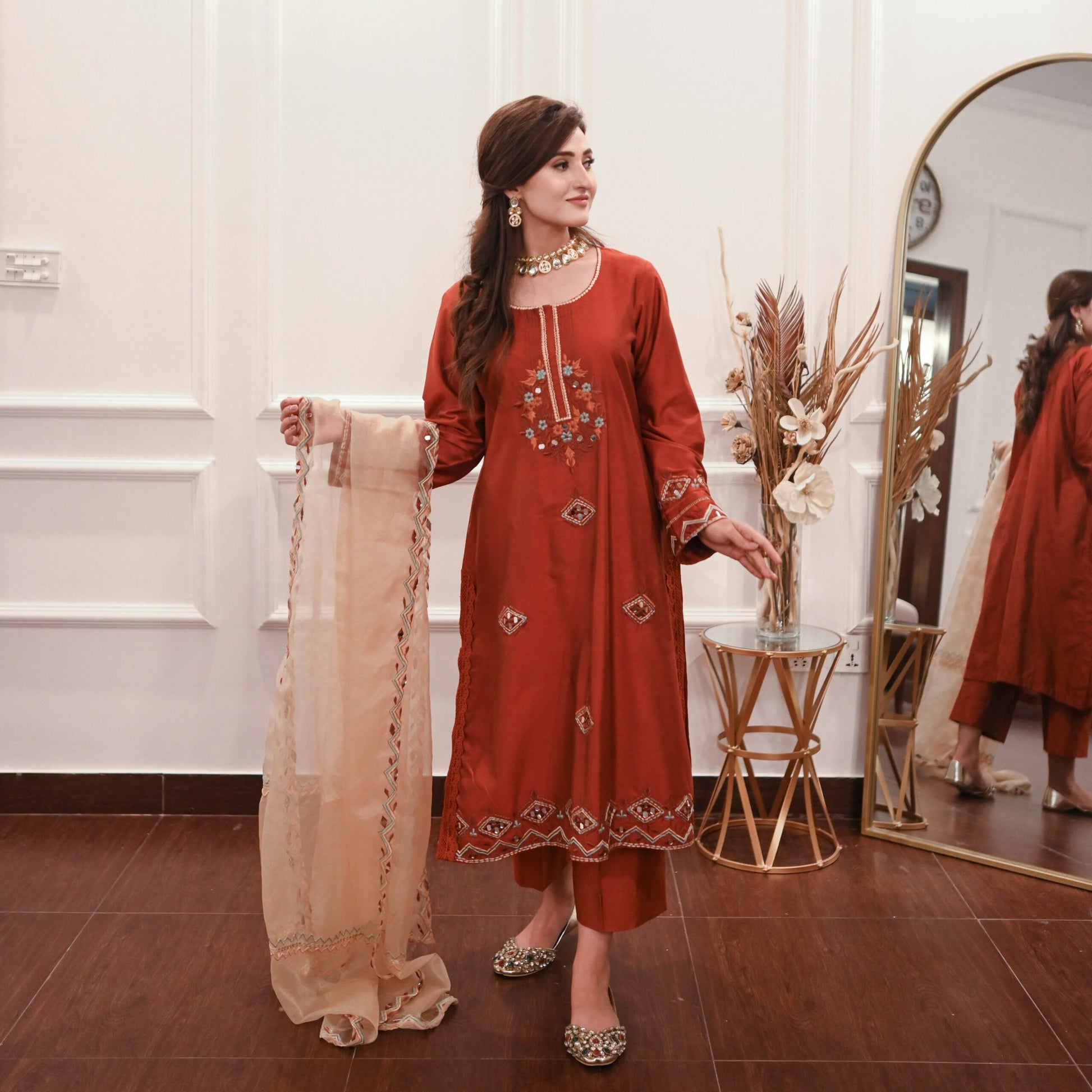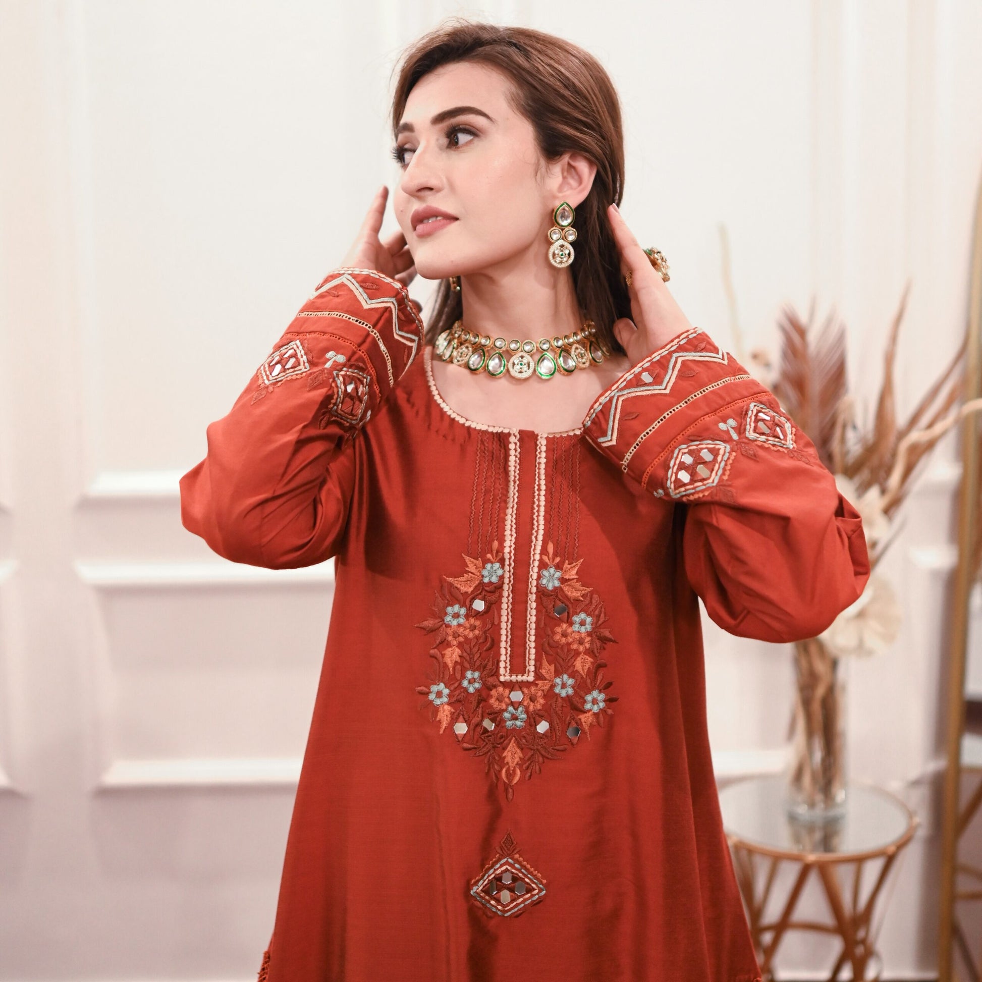 Crafted on luxurious canvas and adorned with embroidery, this piece reflects the distinctive style of ethnic wear. The garment showcases an intricately embroidered featuring with mirrors and thread’s embroidered details, resulting in a sparkling floral composition. The sleeves, neck and hem are radiating grace with embroidery. The outfit is paired with dupatta, boasting heavily embroidered borders with a four-sided mirror and thread work. This outfit is the perfect choice for the festive season, radiating grace and allure.