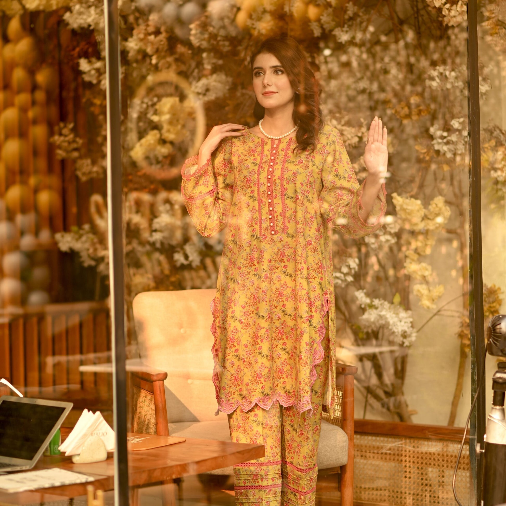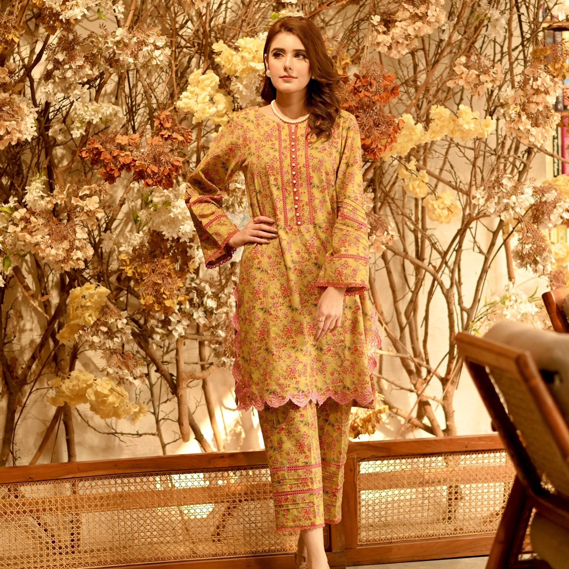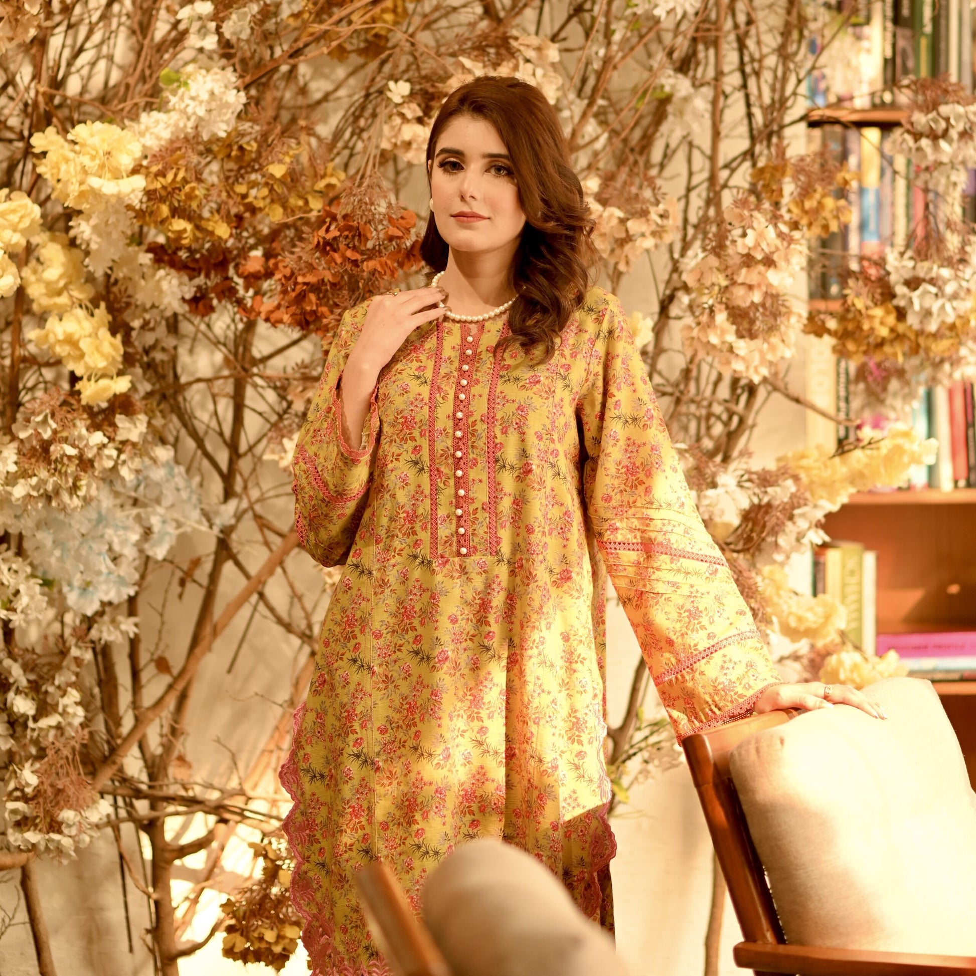 The enchanting interplay of colour in this ensemble form a truly captivating silhouette. The intricate floral patterns on a shirt with culottes pants showcasing meticulous embroidery on premium soft khaddar fabric which imparts a touch of elegance the overall look.