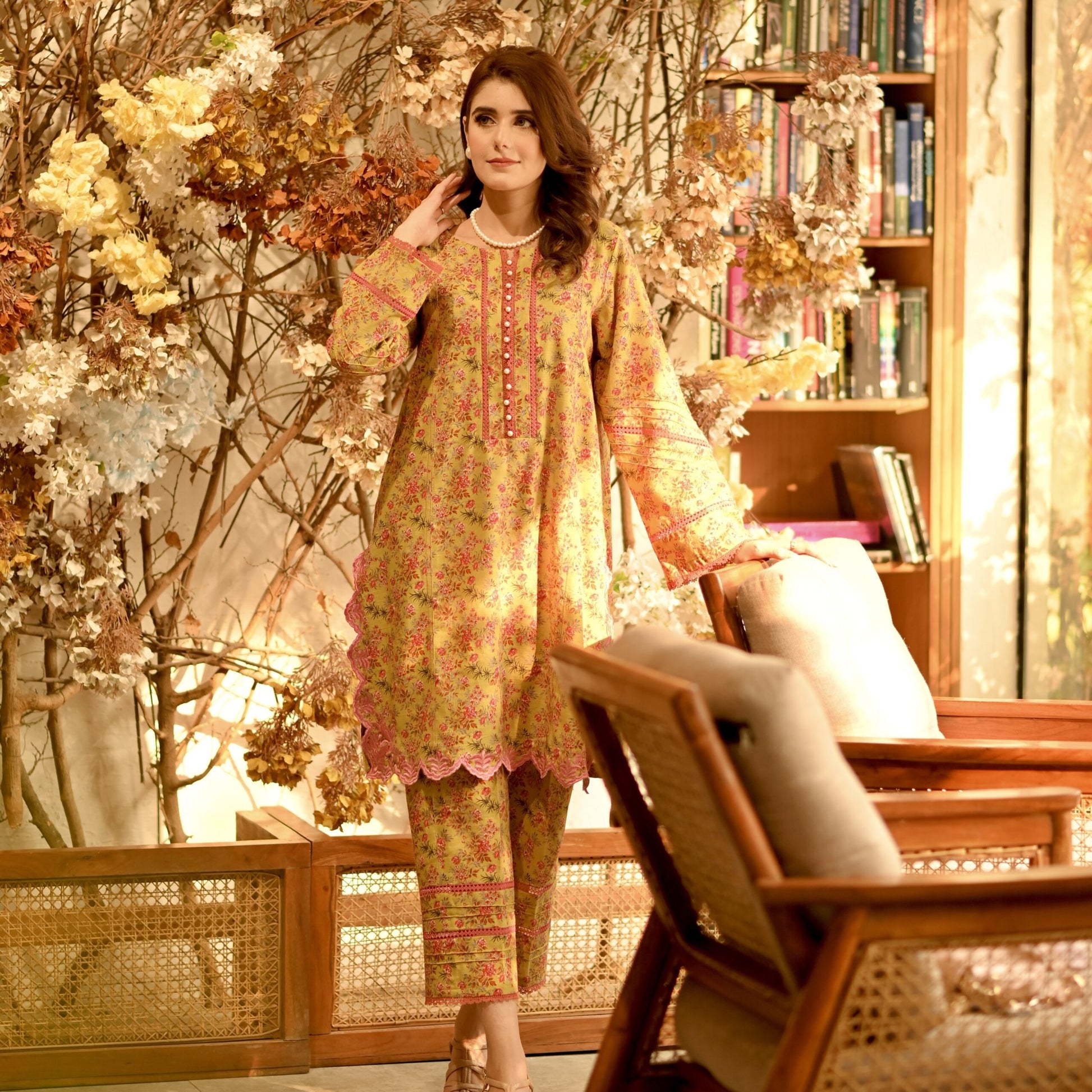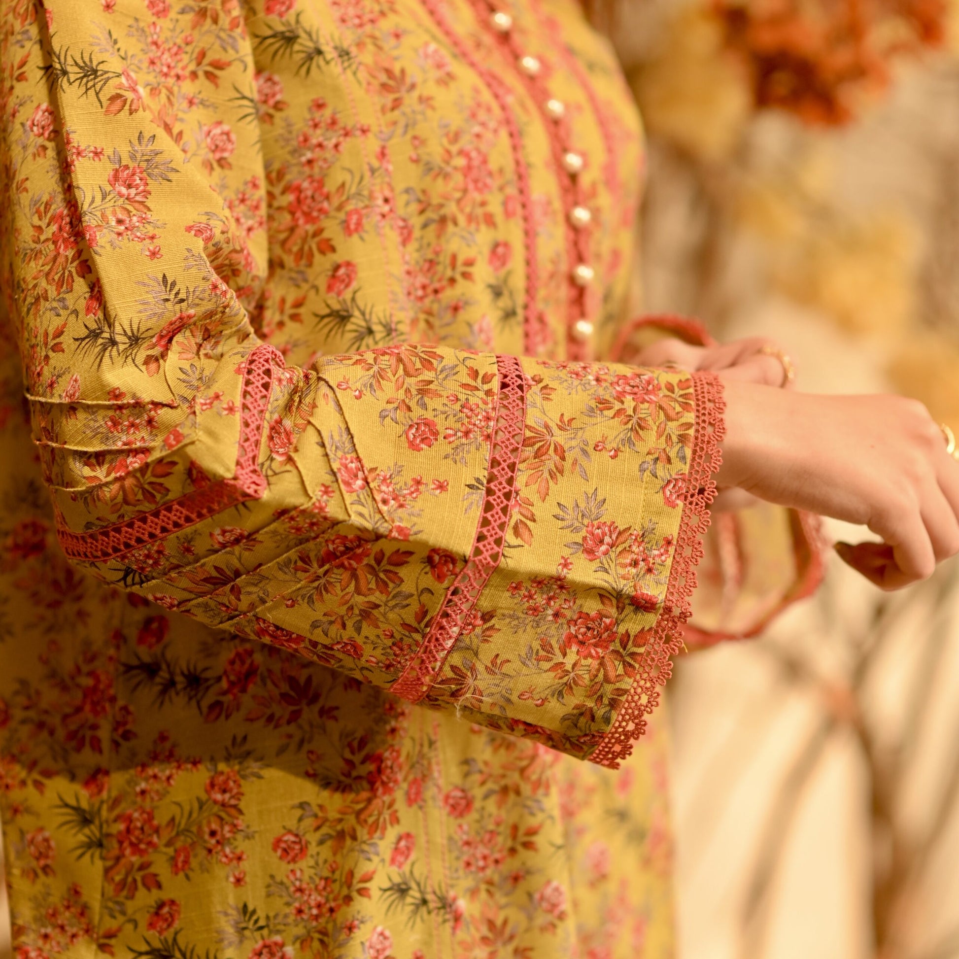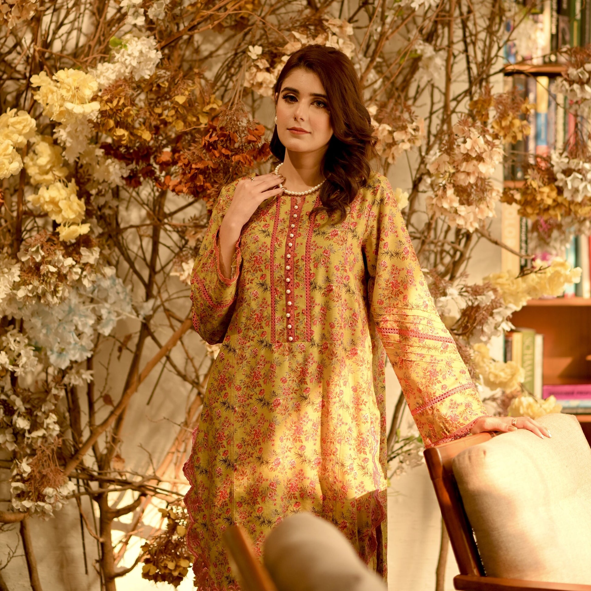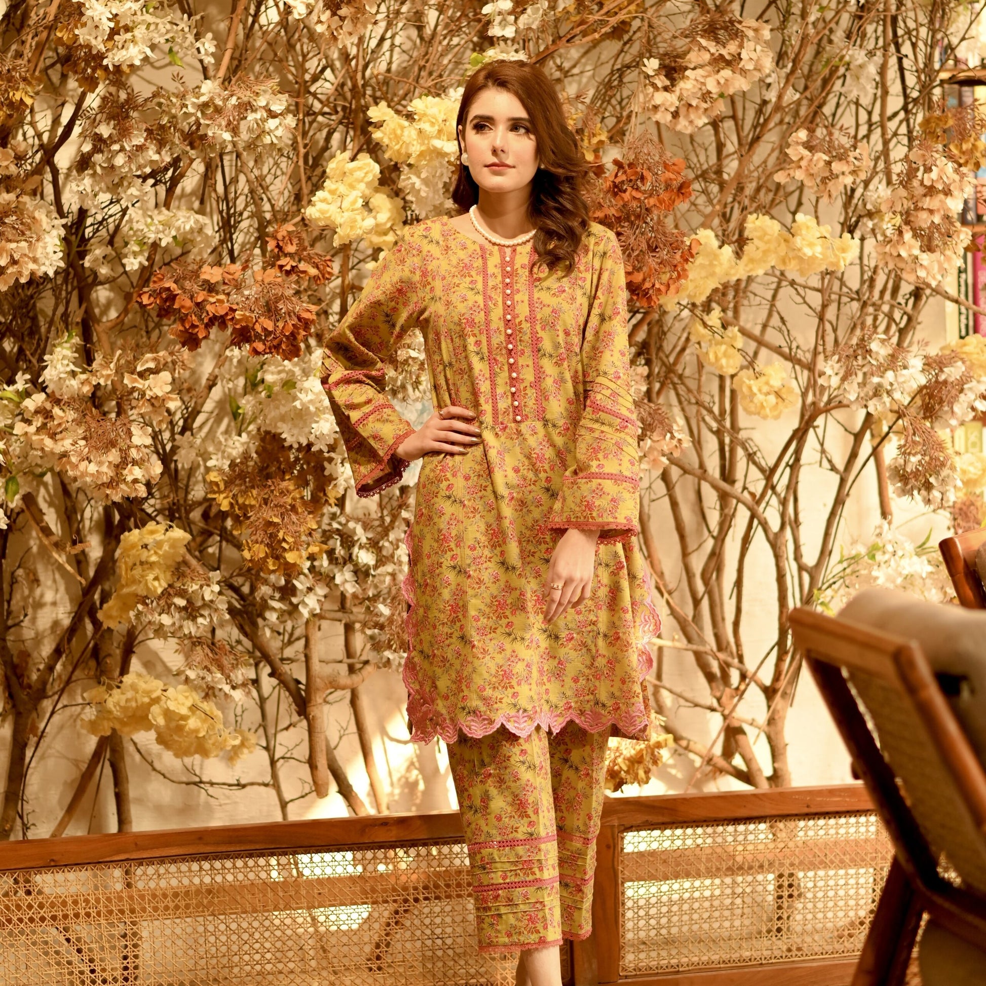 The enchanting interplay of colour in this ensemble form a truly captivating silhouette. The intricate floral patterns on a shirt with culottes pants showcasing meticulous embroidery on premium soft khaddar fabric which imparts a touch of elegance the overall look.