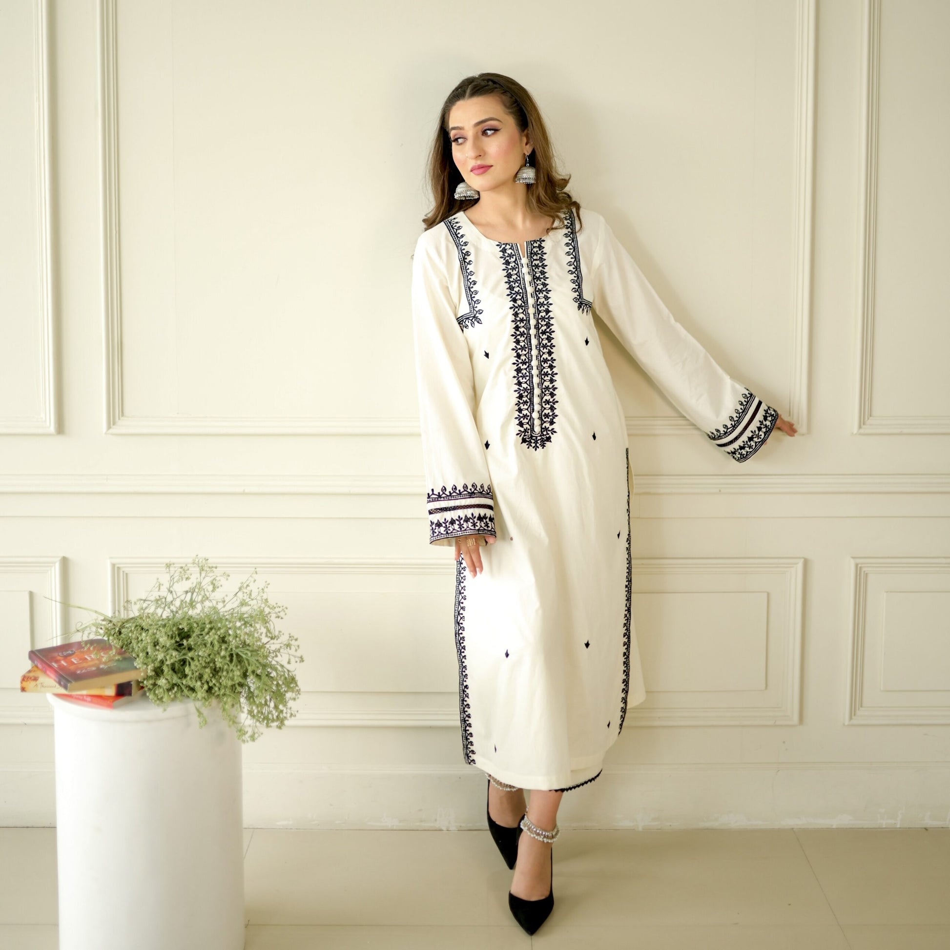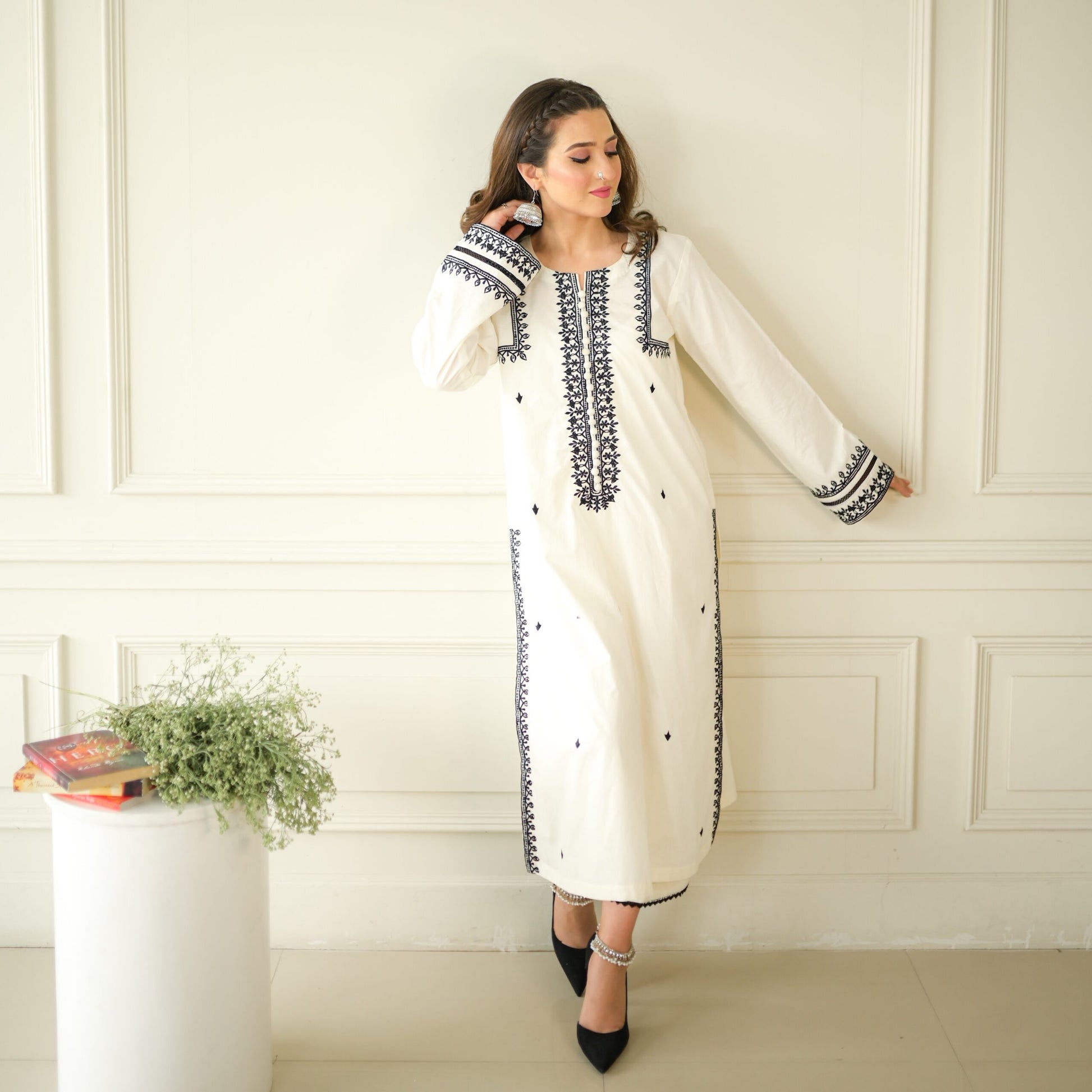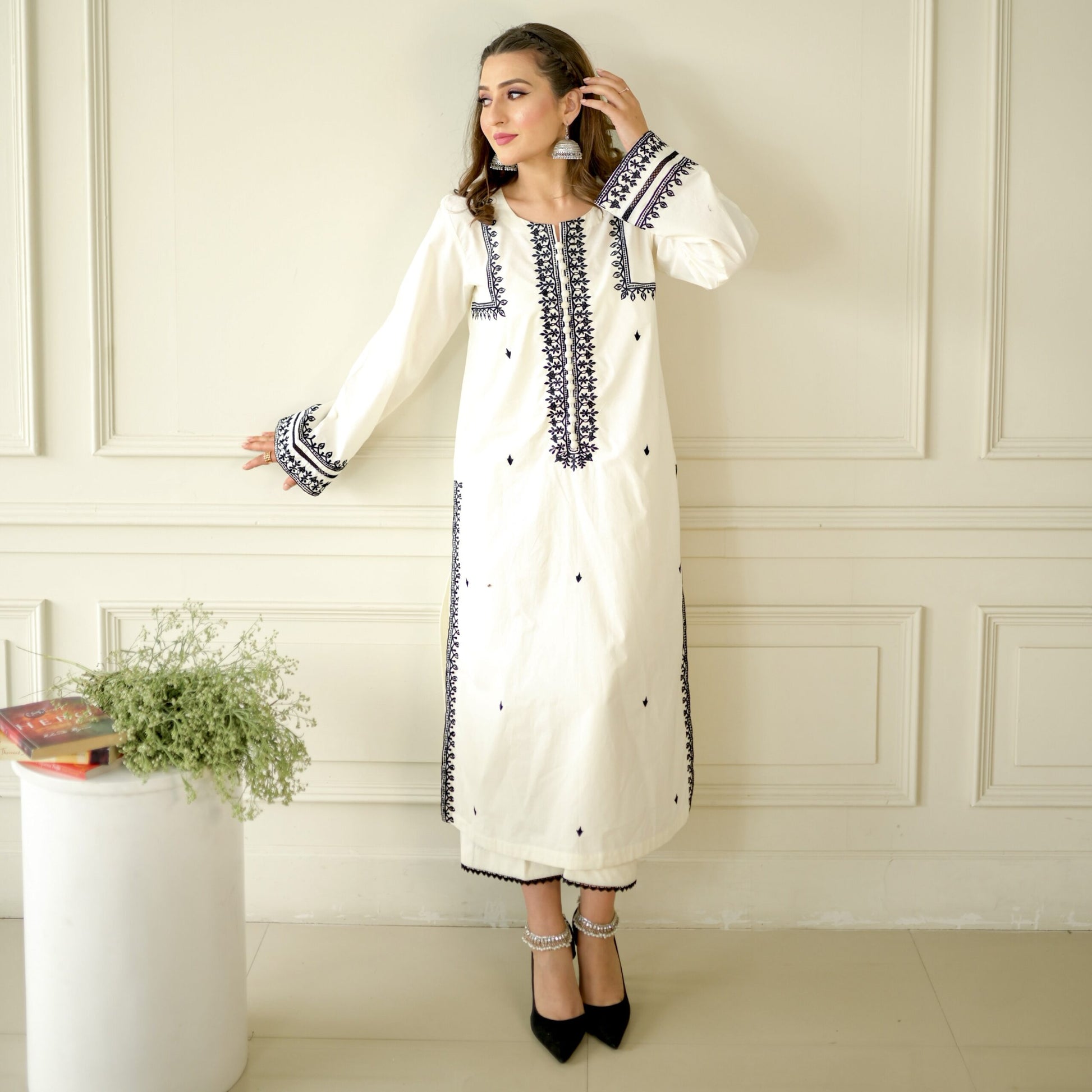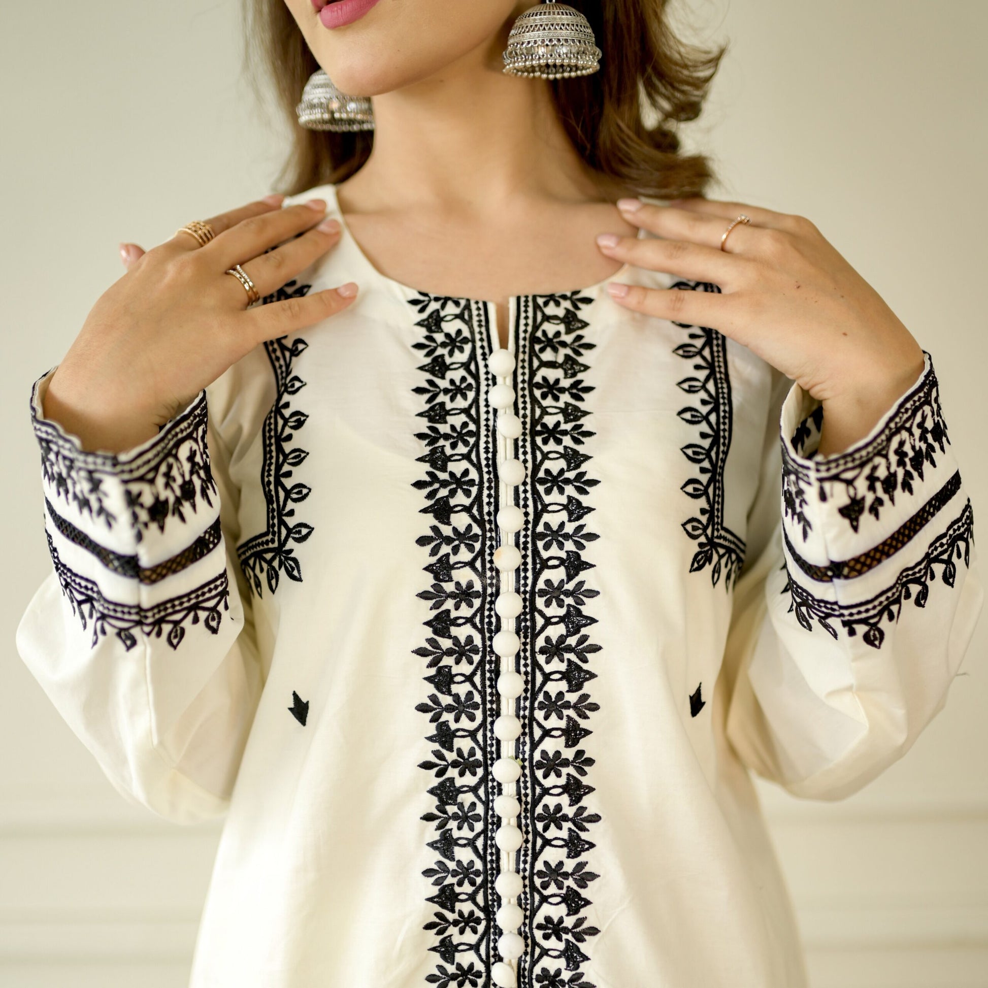 This ensemble is completed by sophisticated floral patterns. Delicate broderie and French embroidery on neck, sleeves and hem enhance the lawn shirt paired with culottes pants.