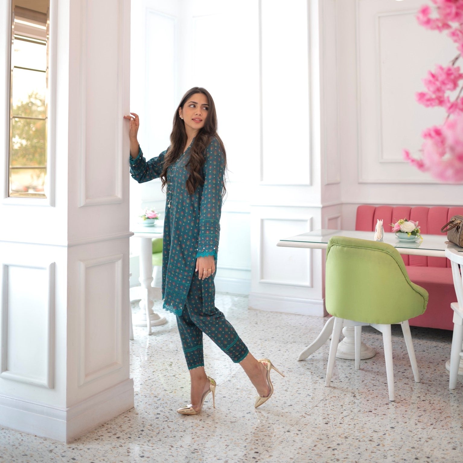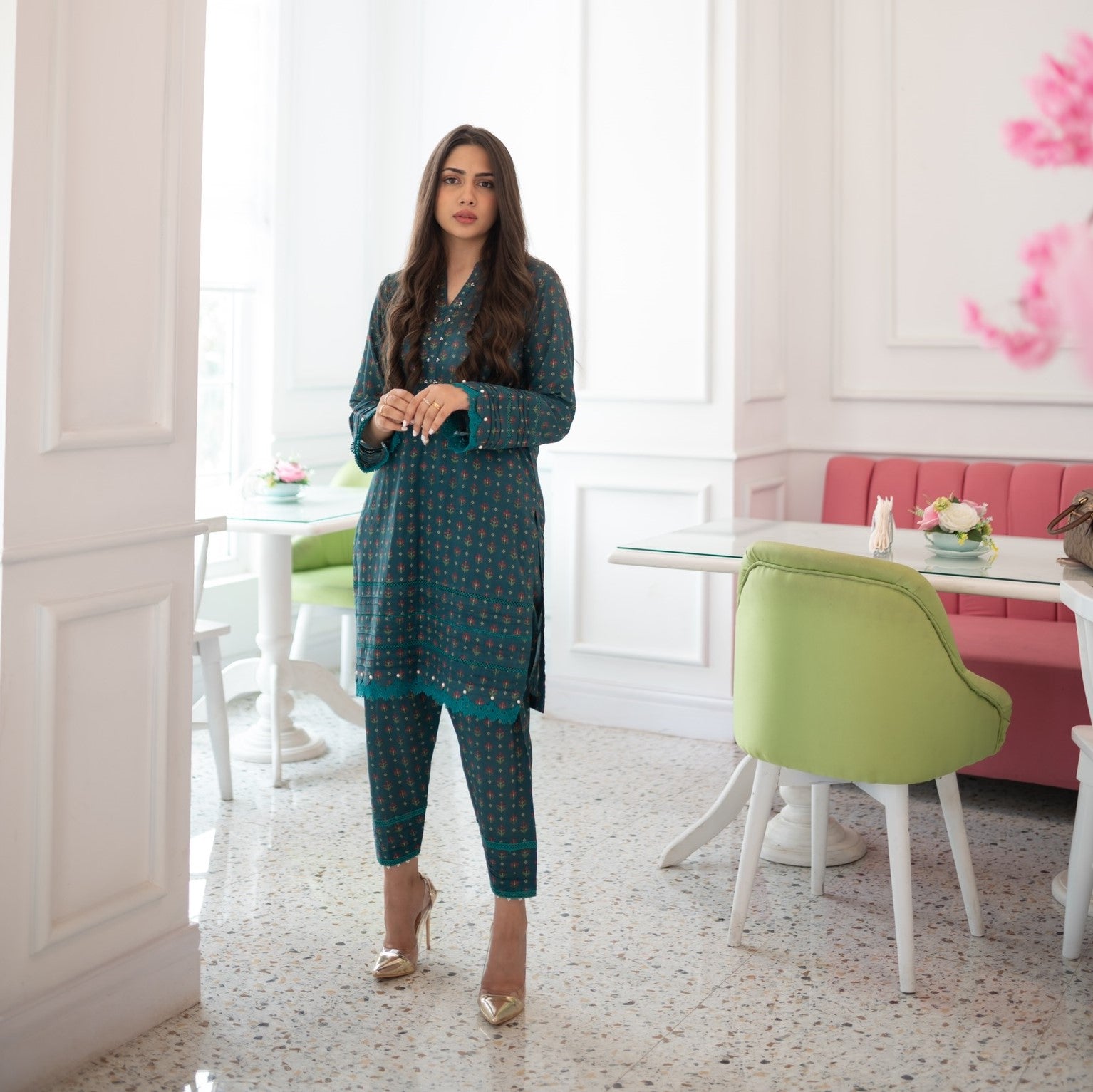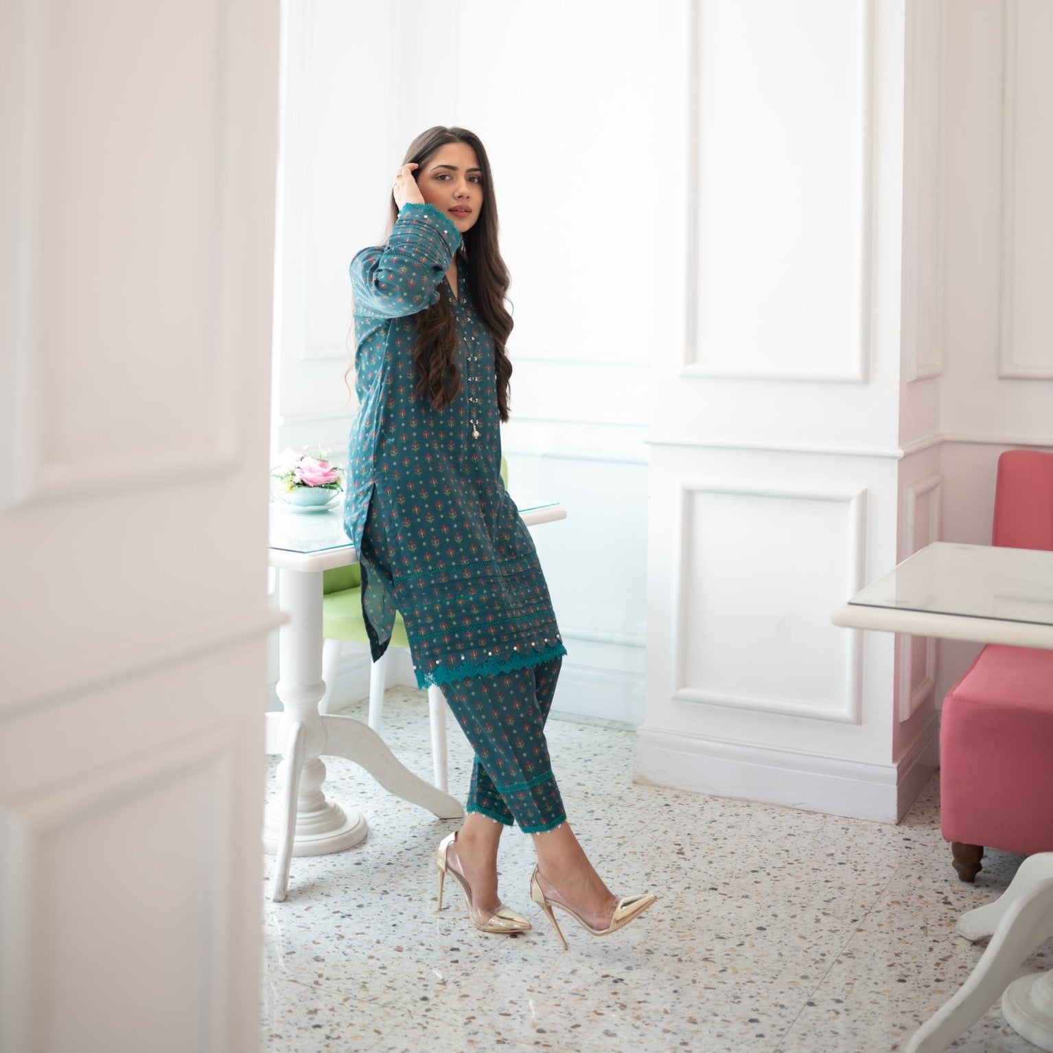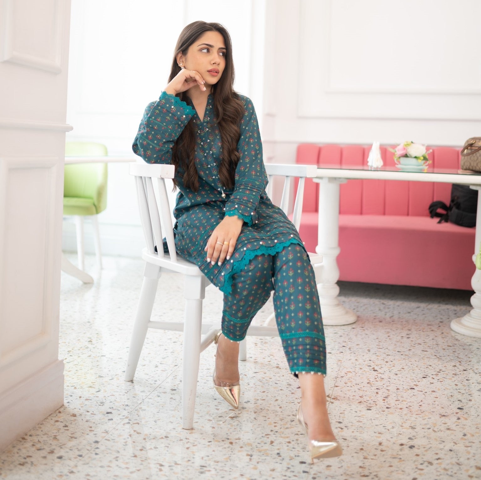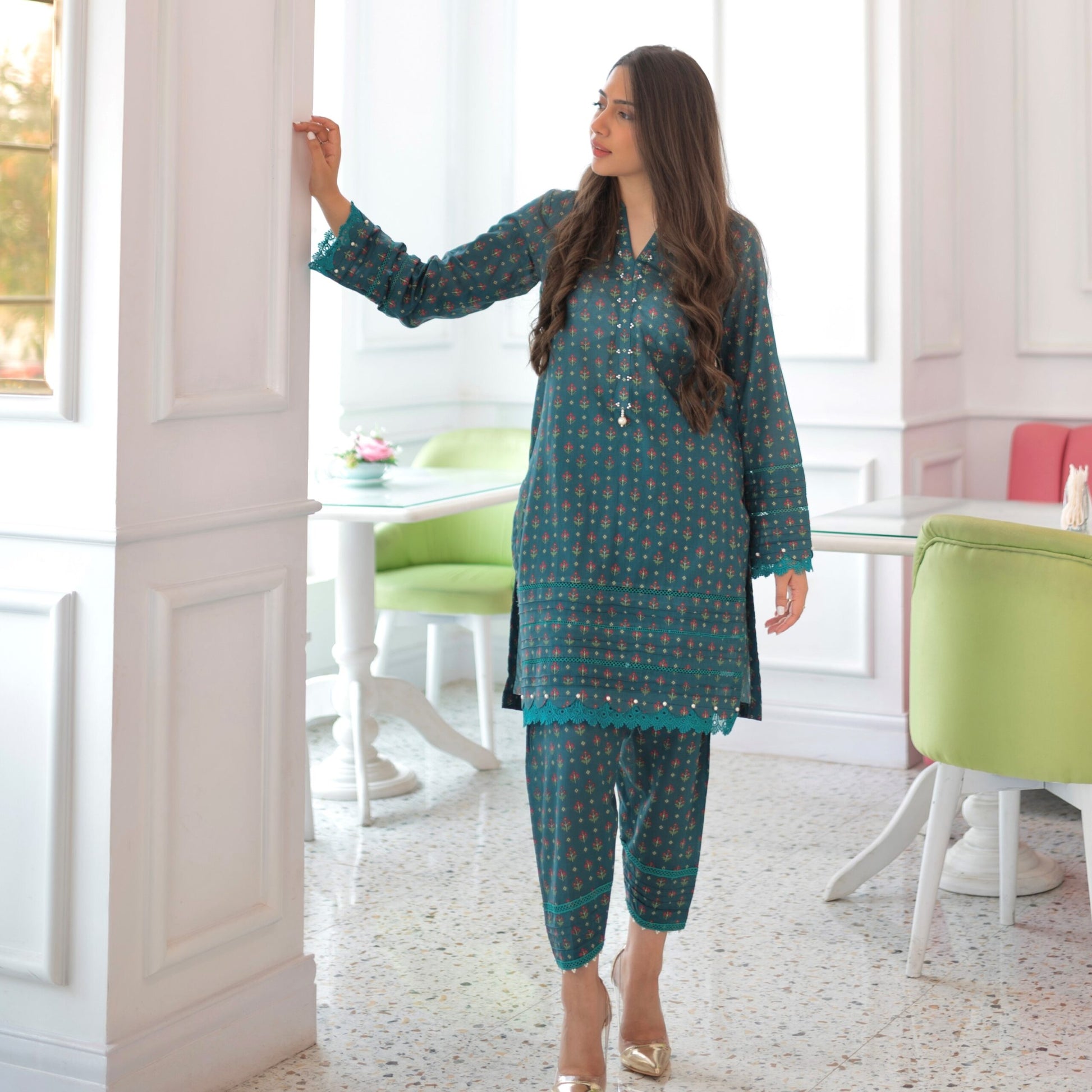 Printed cords features graceful shirt with laces and pearl detailing paired with skinny shalwar.