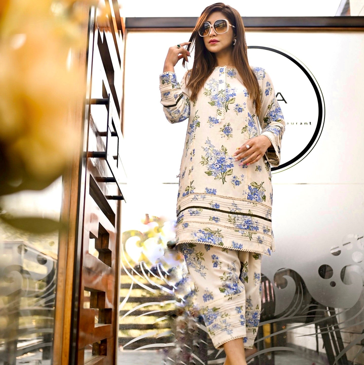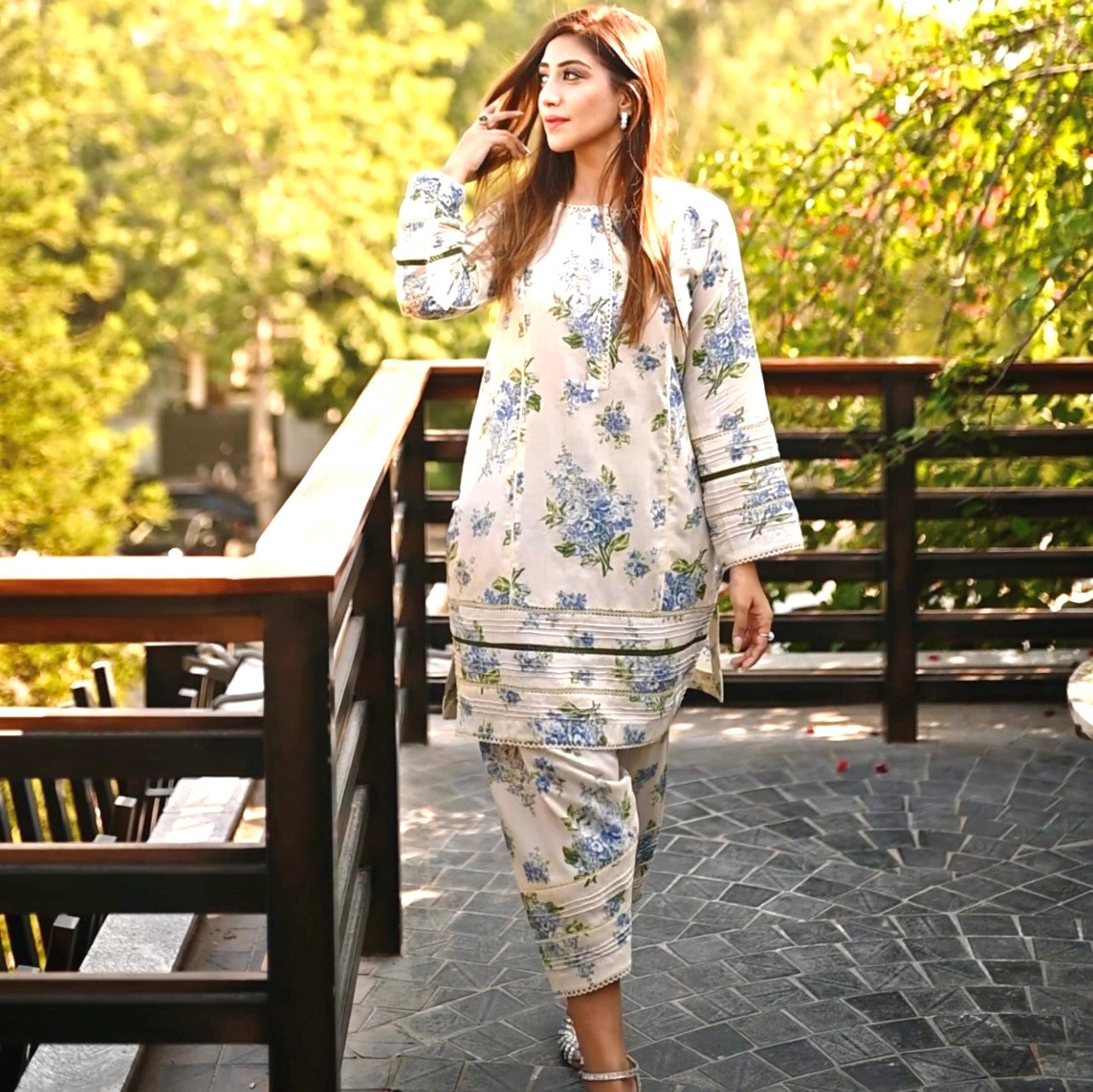 Printed chic silhouette shirt with famine laces and pearl detailing on neckline and sleeves paired with straight shalwar.