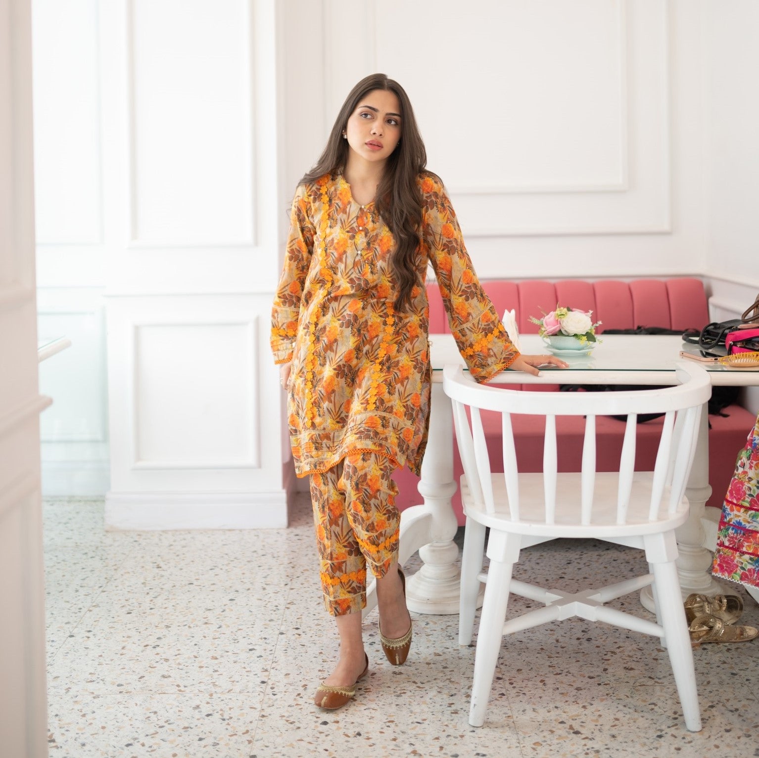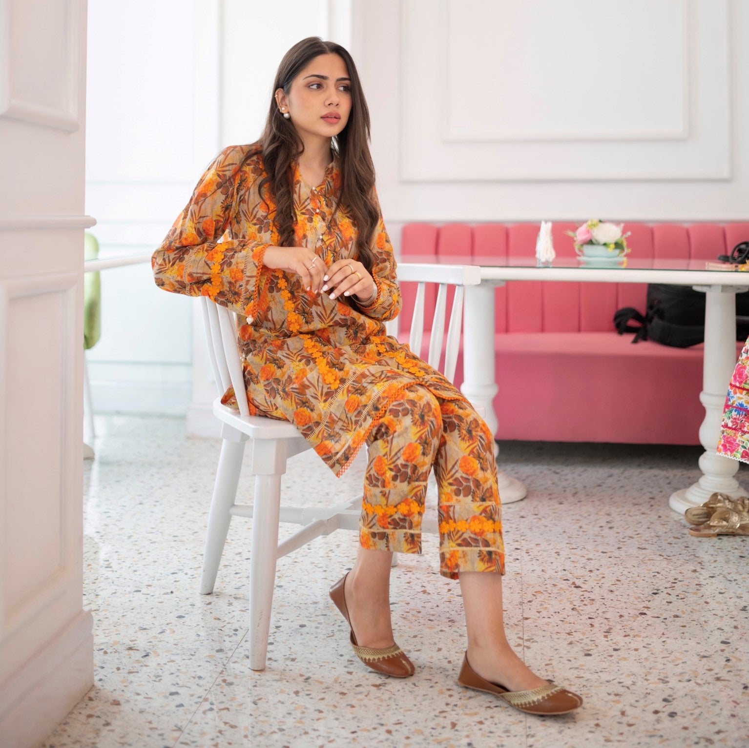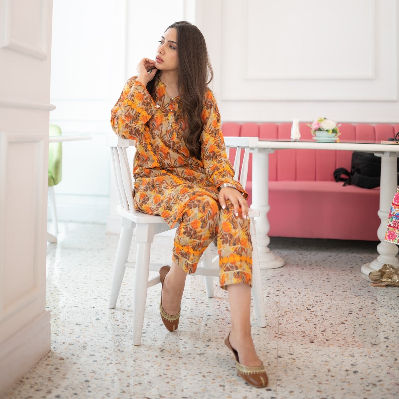 Printed cords gracefully crafted in a chic style shirt with famine laces and pearl embellishment on neckline and sleeves paired with straight pants.