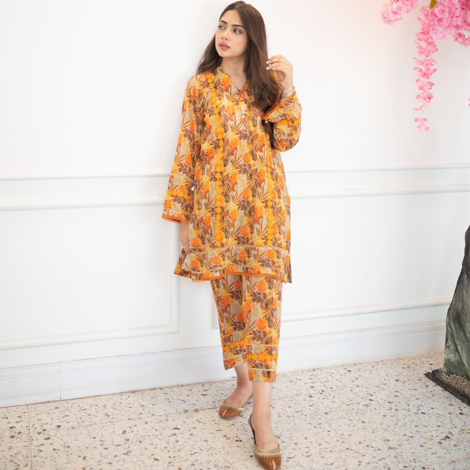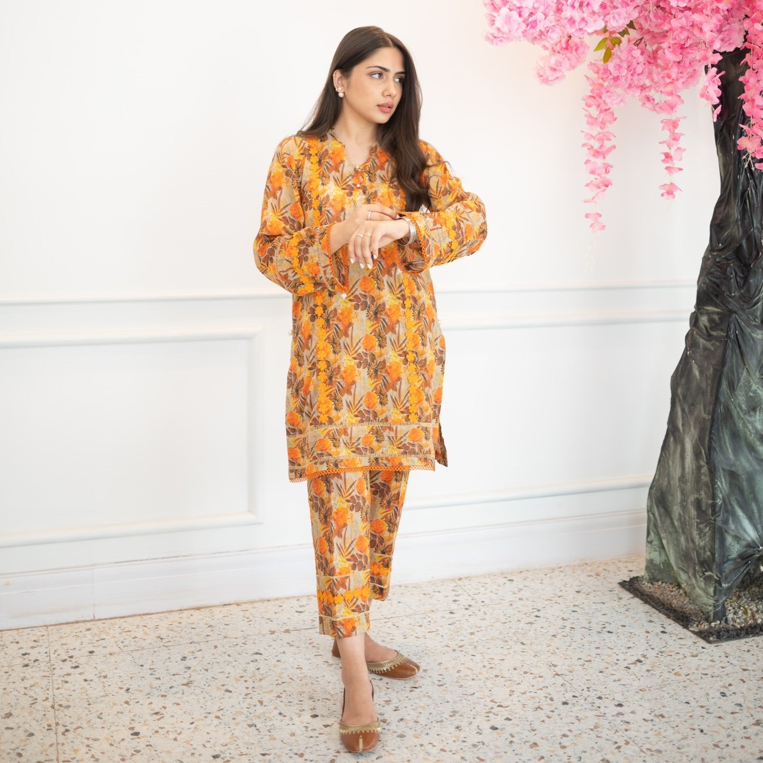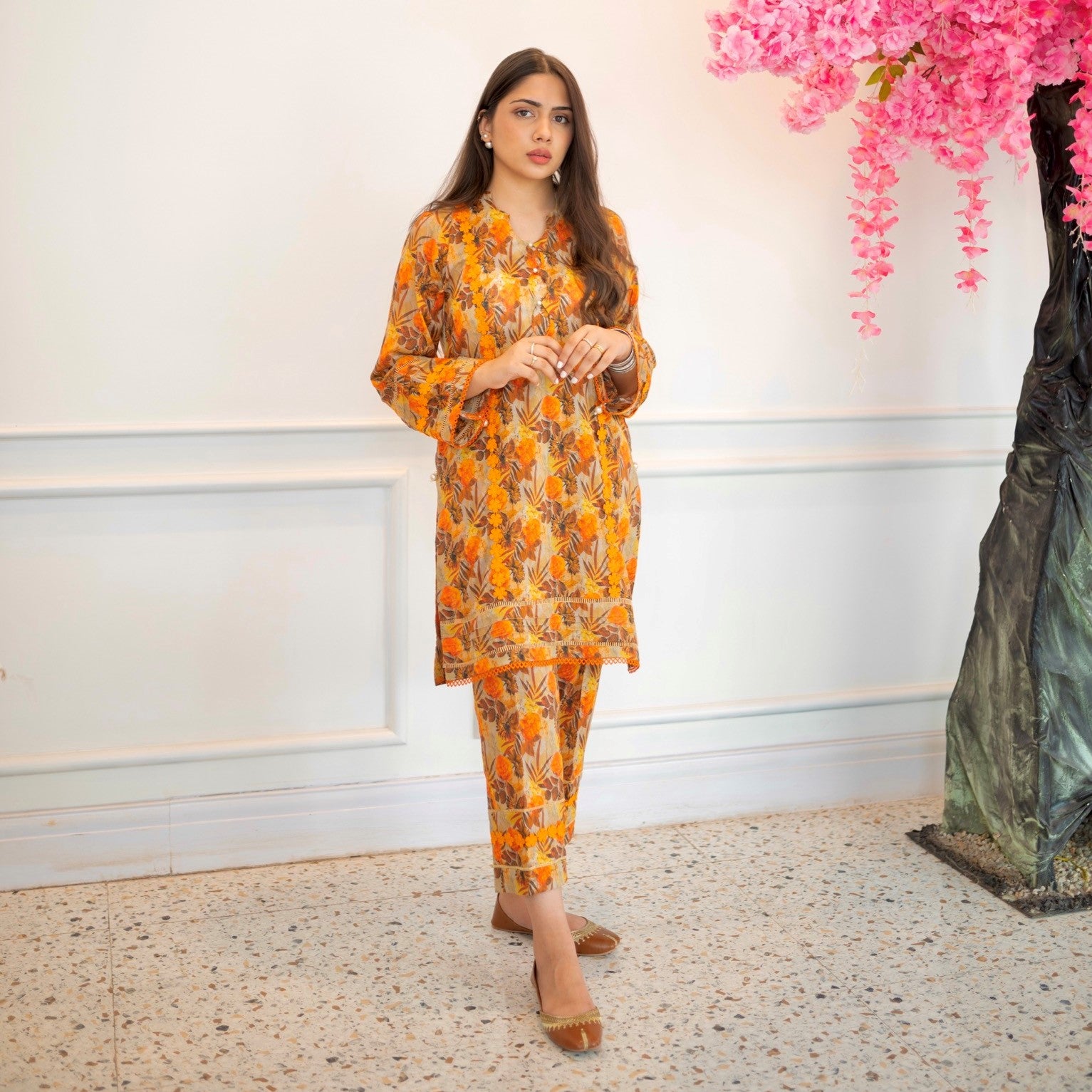 Printed cords gracefully crafted in a chic style shirt with famine laces and pearl embellishment on neckline and sleeves paired with straight pants.